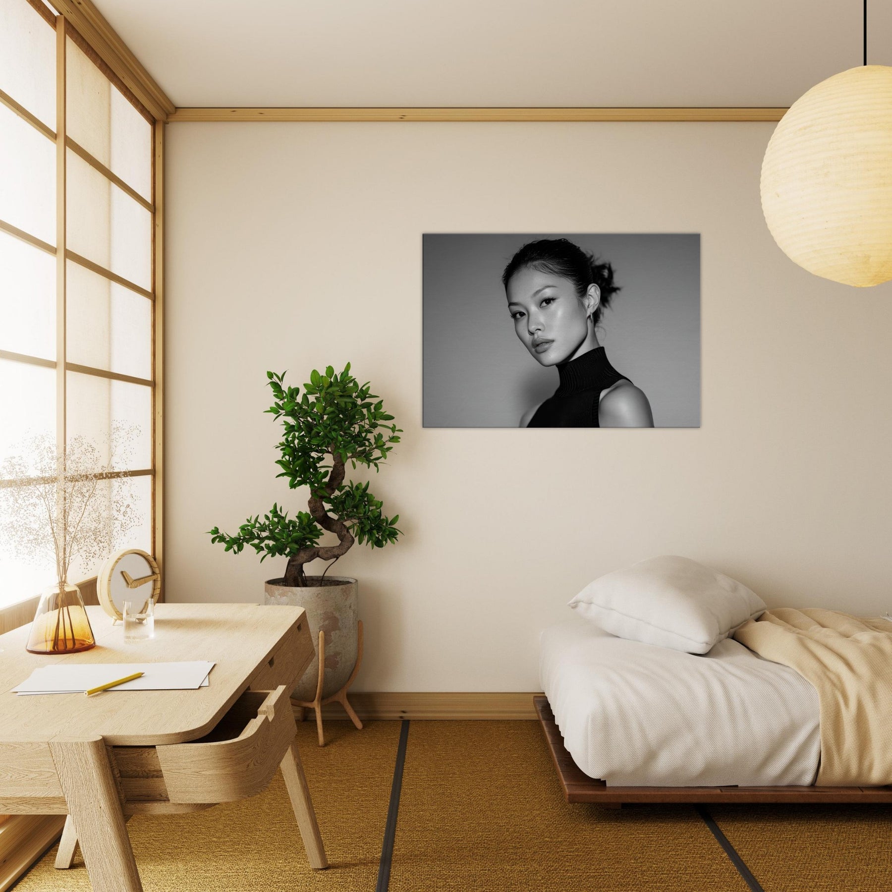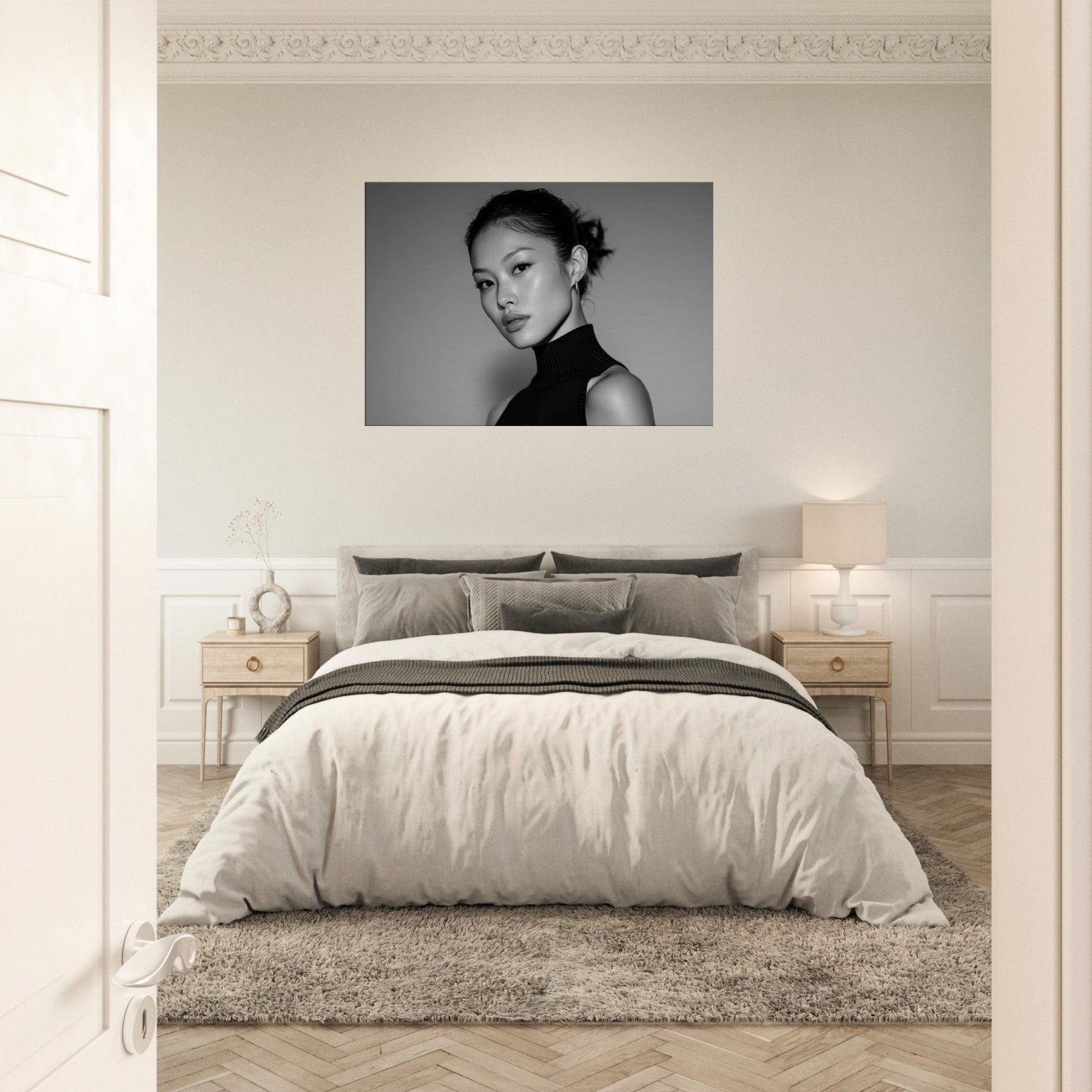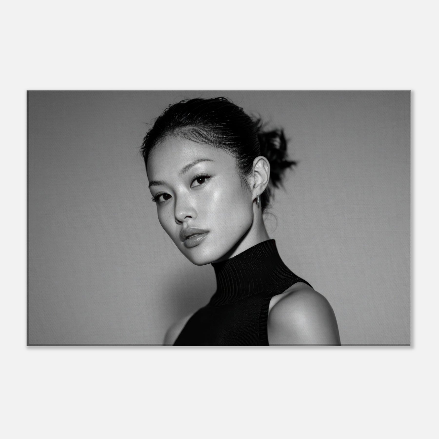 This composition centers the Asian Woman in a hush of shadow and light, a quiet dialogue between desire and restraint. The monochrome tones sculpt her features into a timeless contour, where every pore of skin seems to catch a subtle glow and the collar’s ribbed texture adds tactile rhythm.