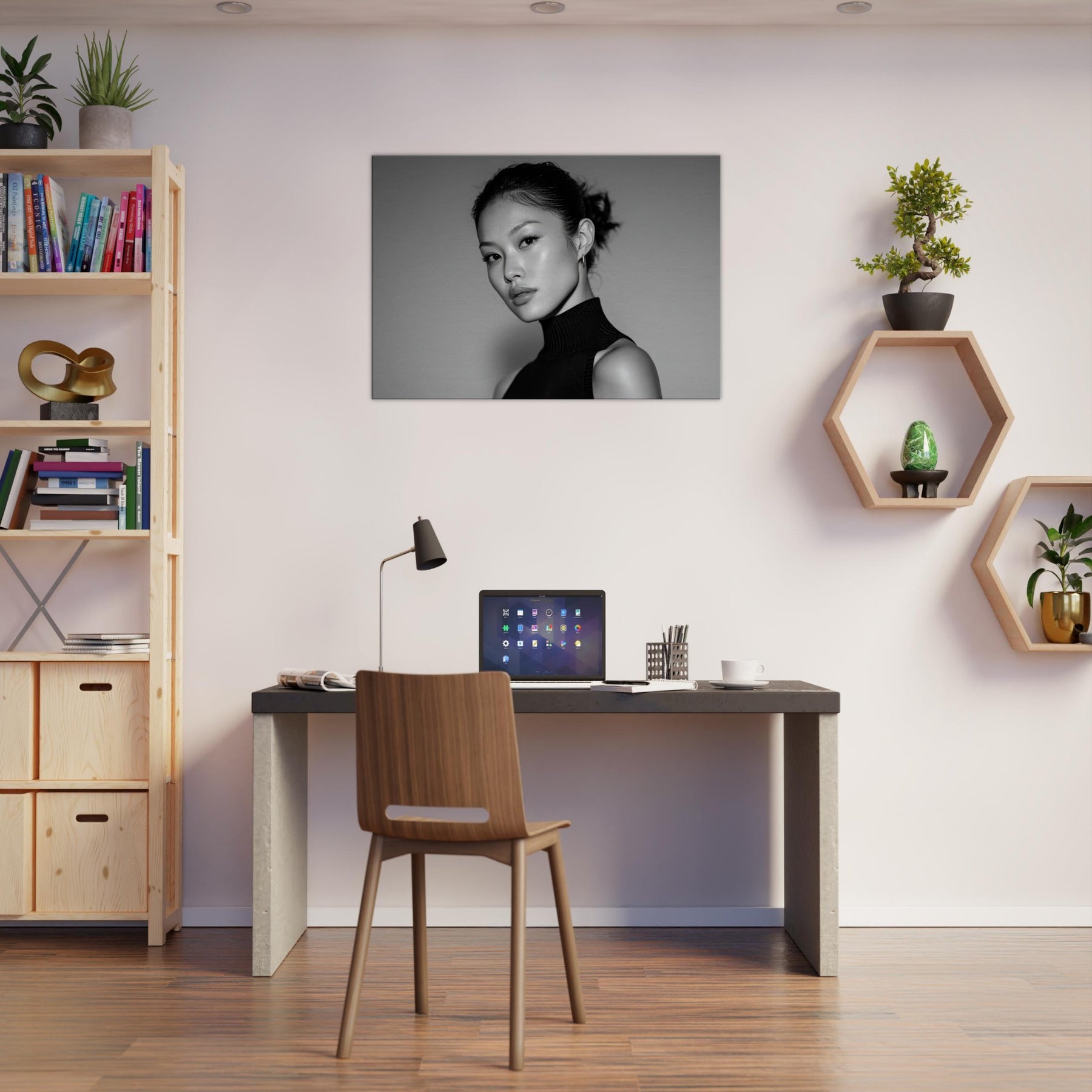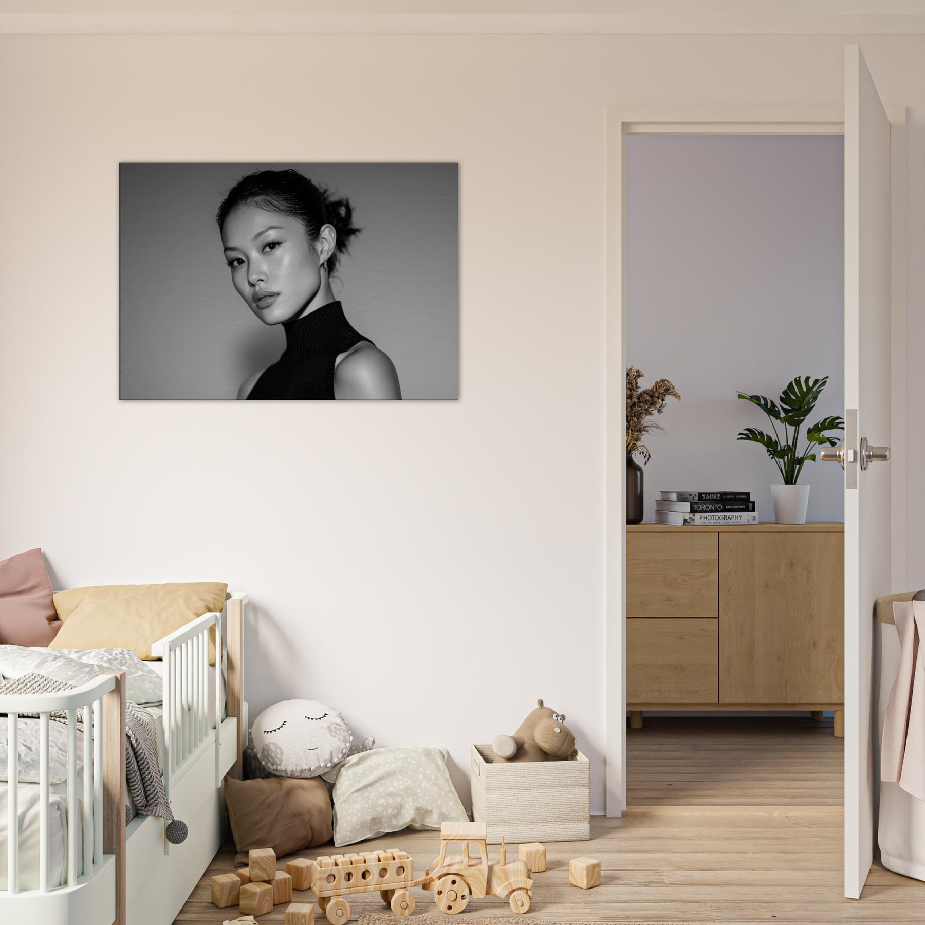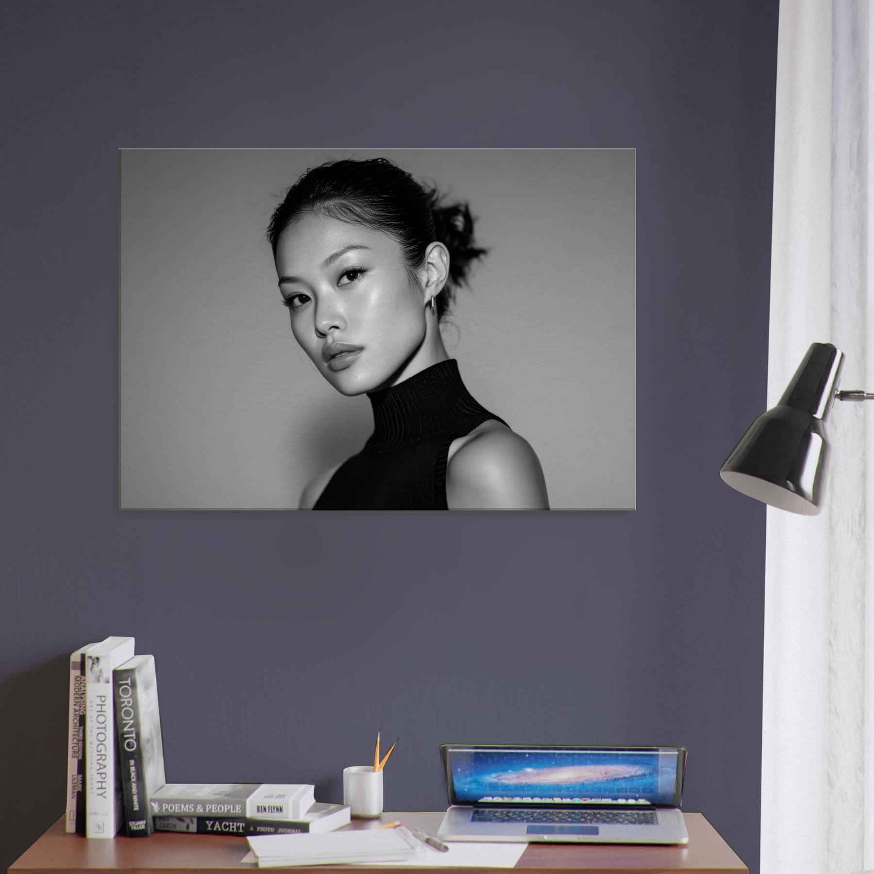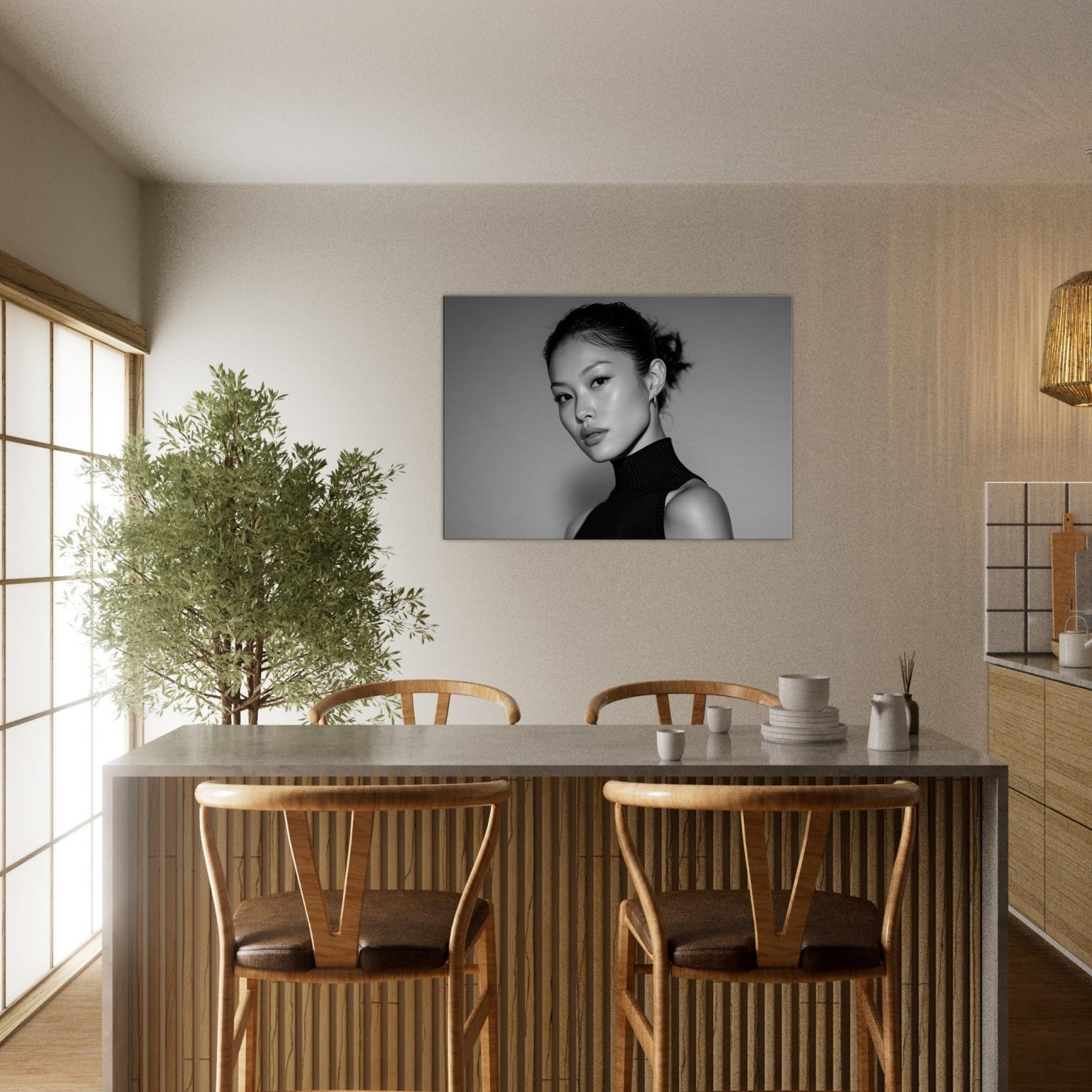 This composition centers the Asian Woman in a hush of shadow and light, a quiet dialogue between desire and restraint. The monochrome tones sculpt her features into a timeless contour, where every pore of skin seems to catch a subtle glow and the collar’s ribbed texture adds tactile rhythm.