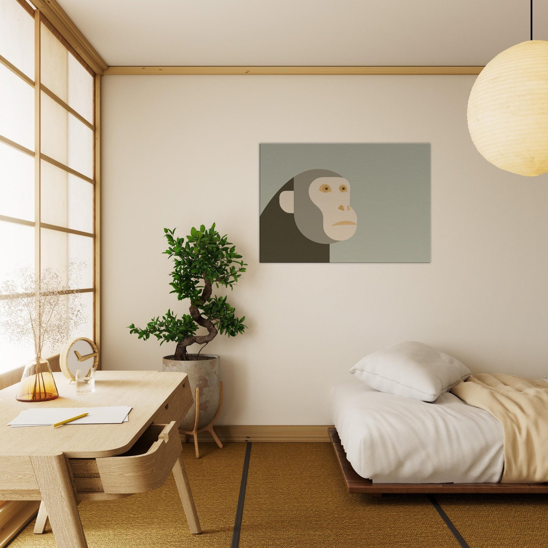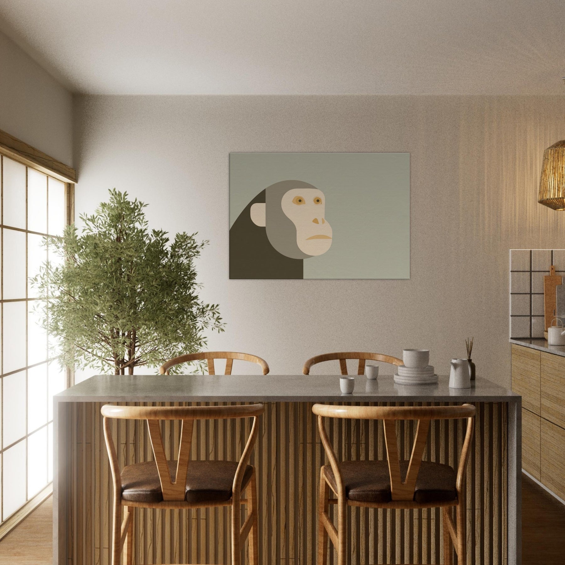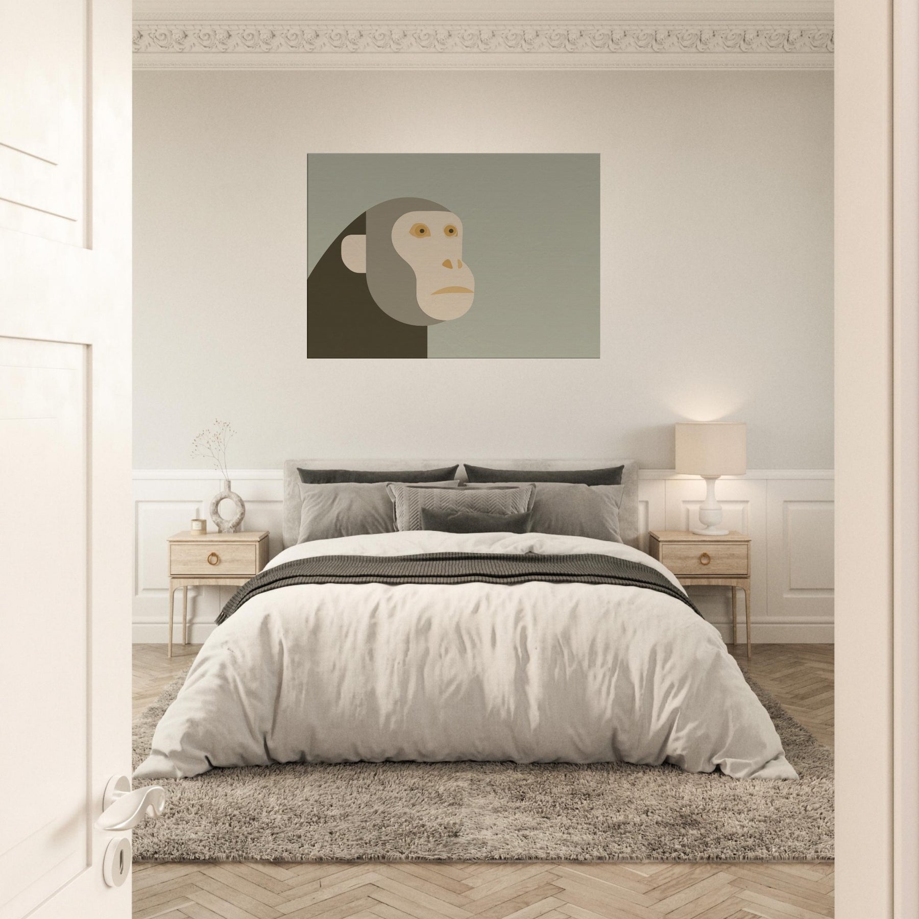An airy meditation on form and restraint, this piece centers the Monkey in a quiet, minimalist silhouette. The head and face are composed of soft, overlapping shapes in warm sand tones, set against a misty sage backdrop. The result is a calm, almost reverent presence that invites pause and reflection. In a living room or hallway, it quiets the bustle of daily life, turning walls into a serene gallery and letting light, texture, and color breathe with you.
