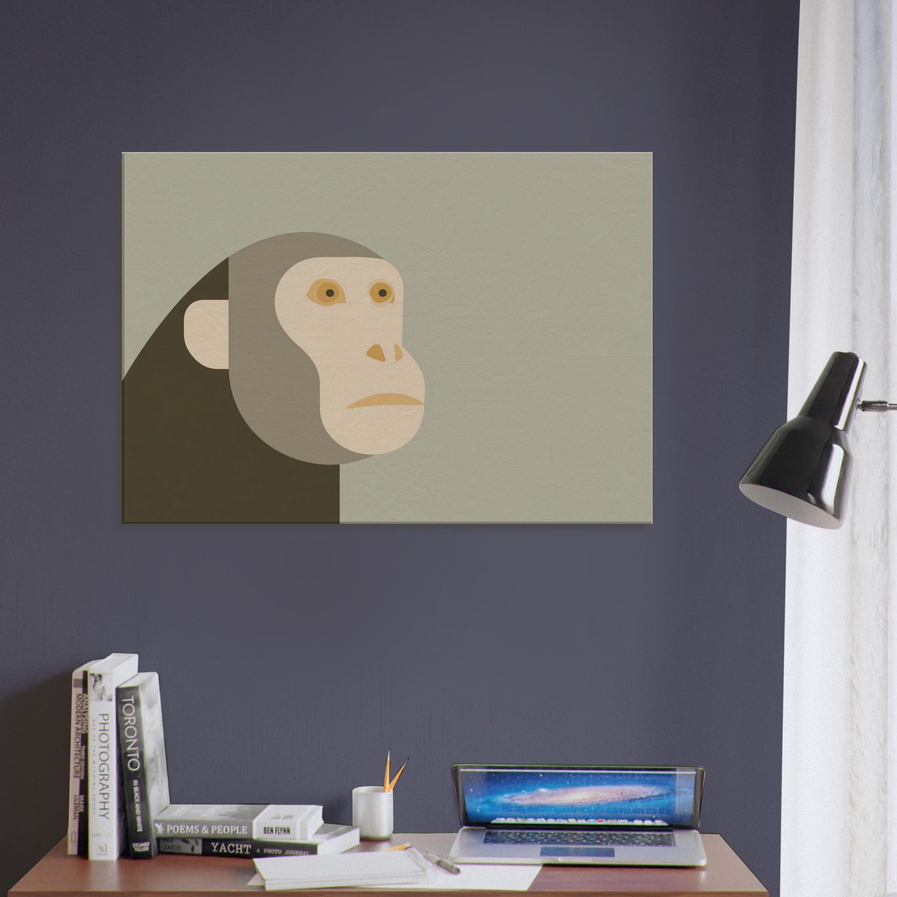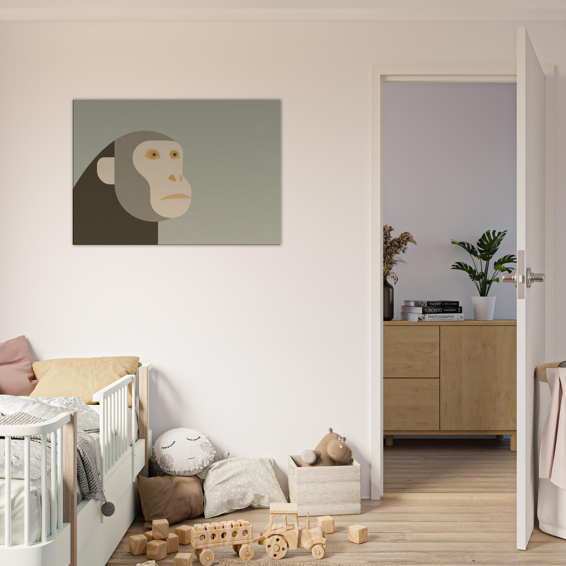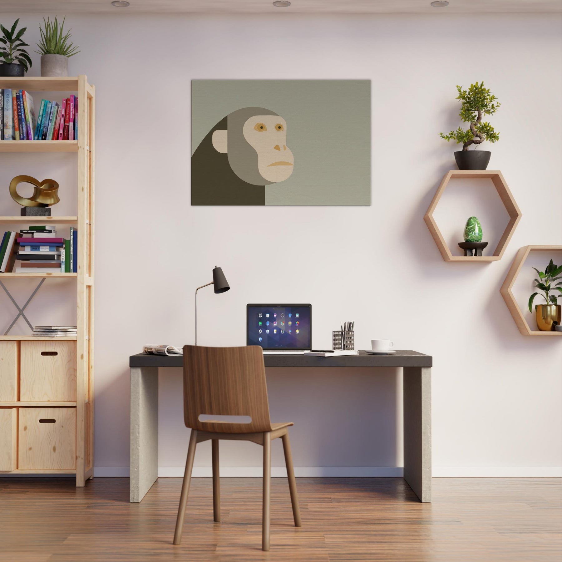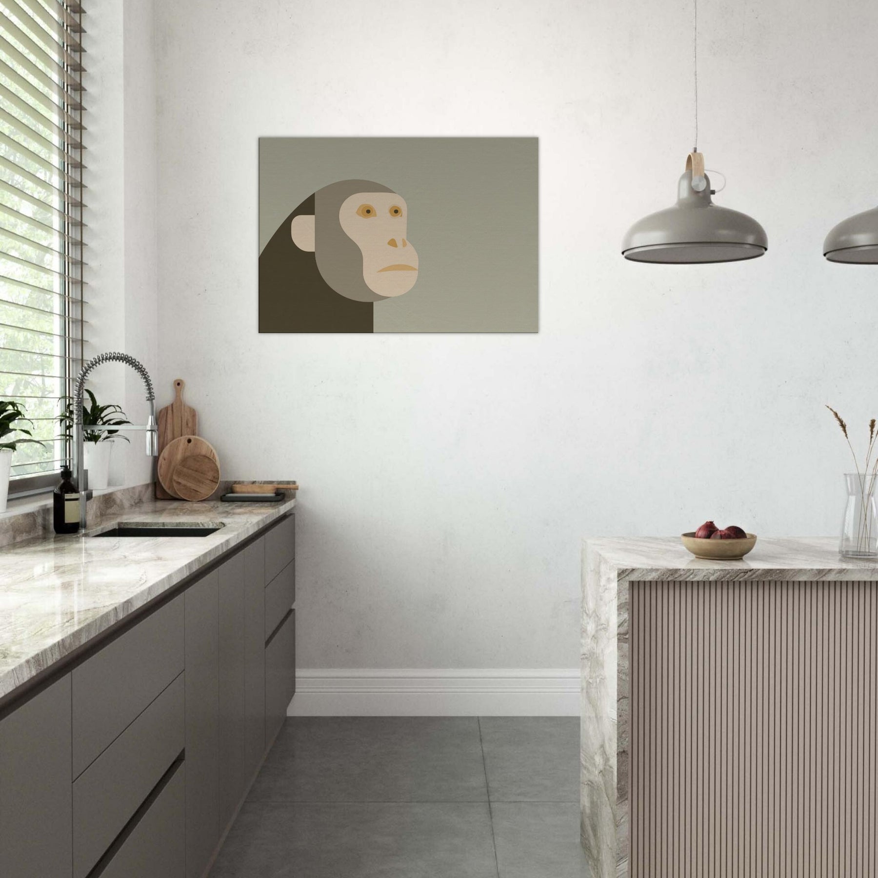 An airy meditation on form and restraint, this piece centers the Monkey in a quiet, minimalist silhouette. The head and face are composed of soft, overlapping shapes in warm sand tones, set against a misty sage backdrop. The result is a calm, almost reverent presence that invites pause and reflection. In a living room or hallway, it quiets the bustle of daily life, turning walls into a serene gallery and letting light, texture, and color breathe with you.