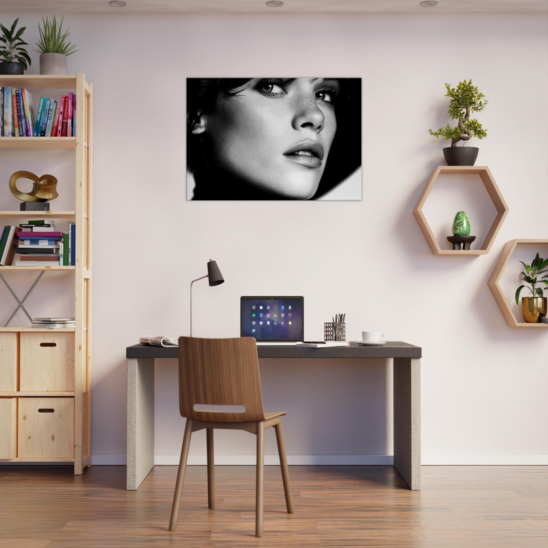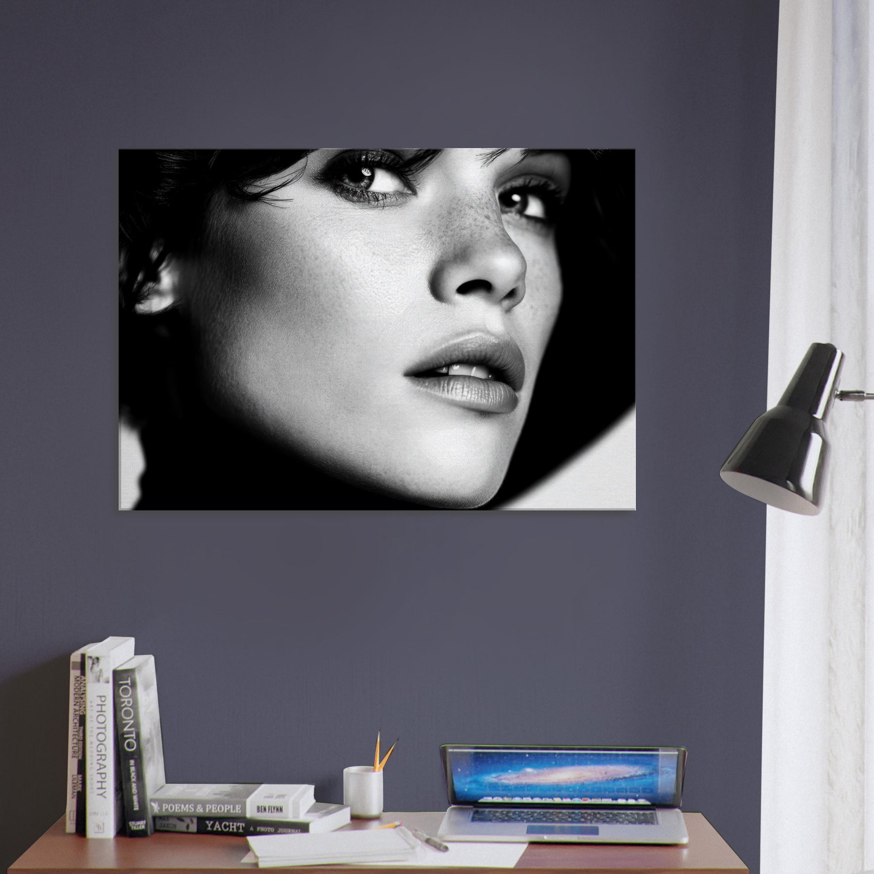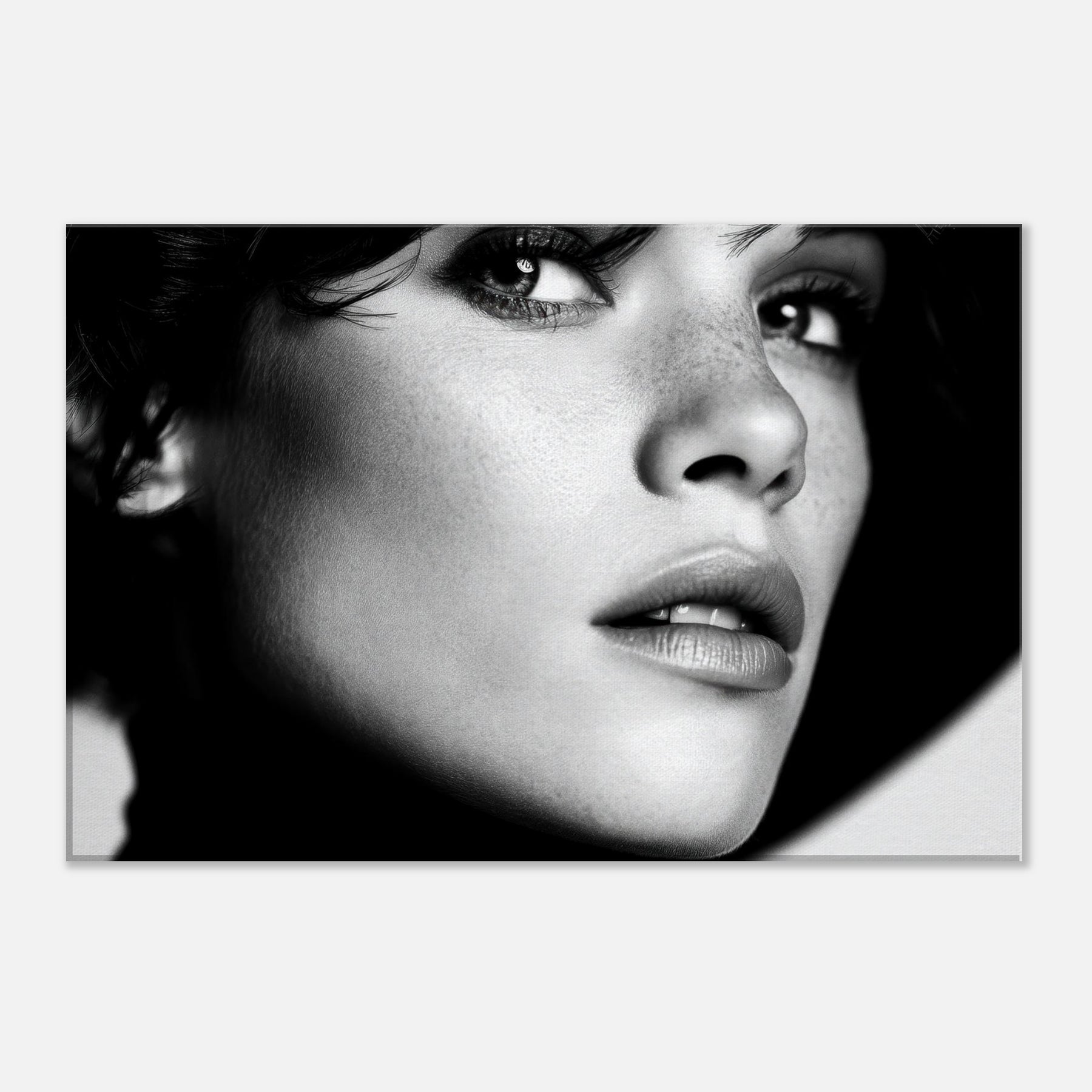 A striking European Woman emerges in luminous grayscale, capturing a moment where light and shadow braid the features with quiet intensity. The close crop and sultry gaze invite reflection, turning any wall into a contemplative corner.