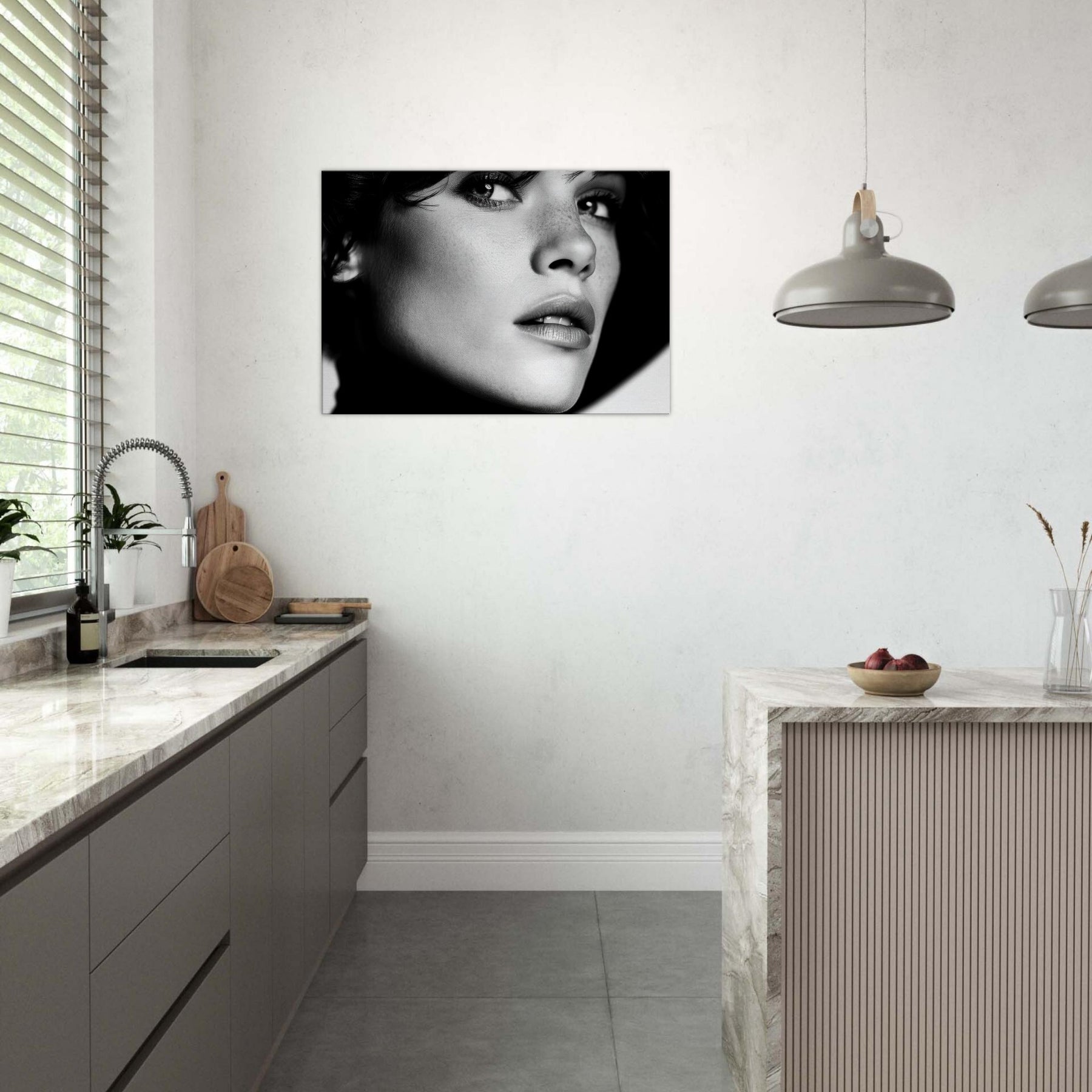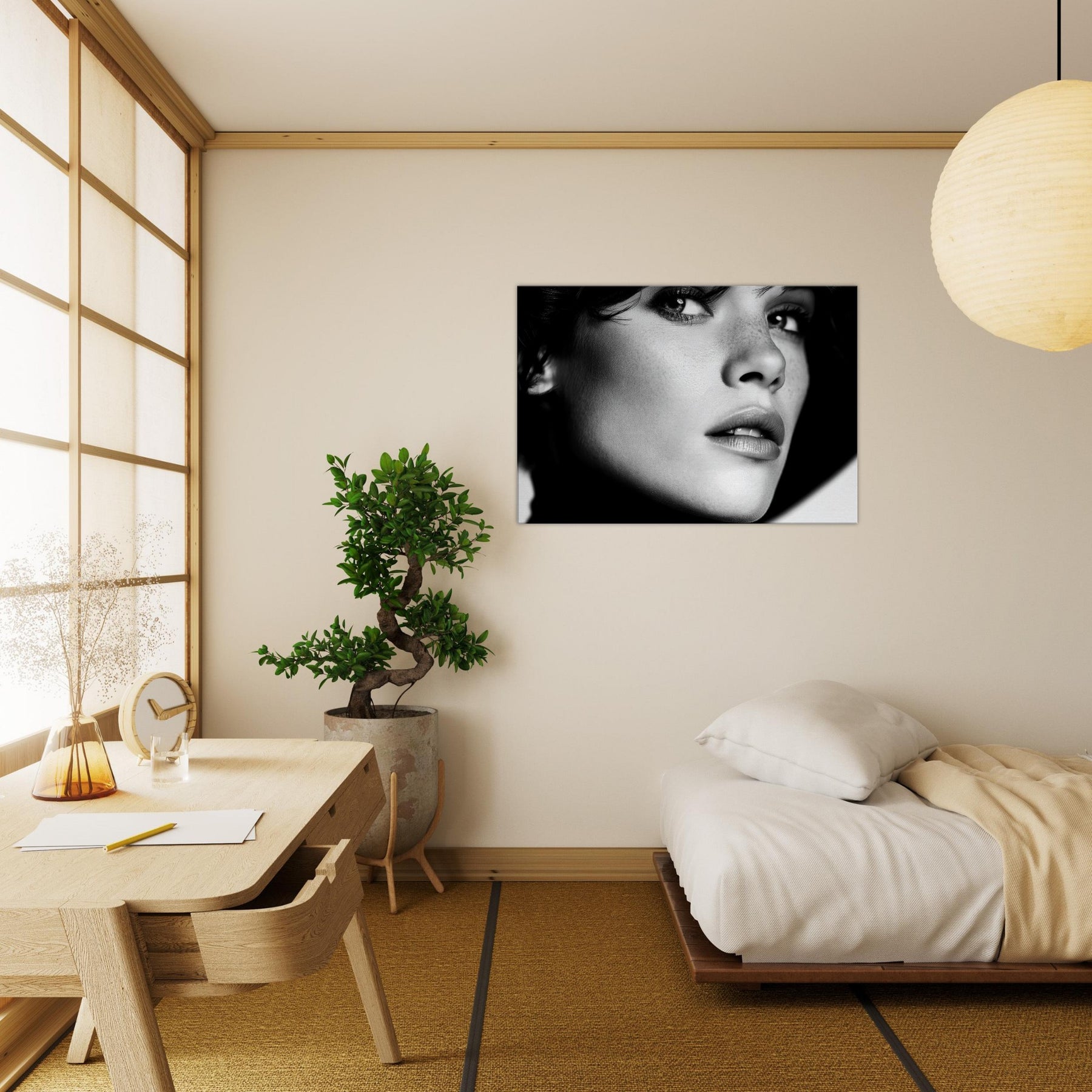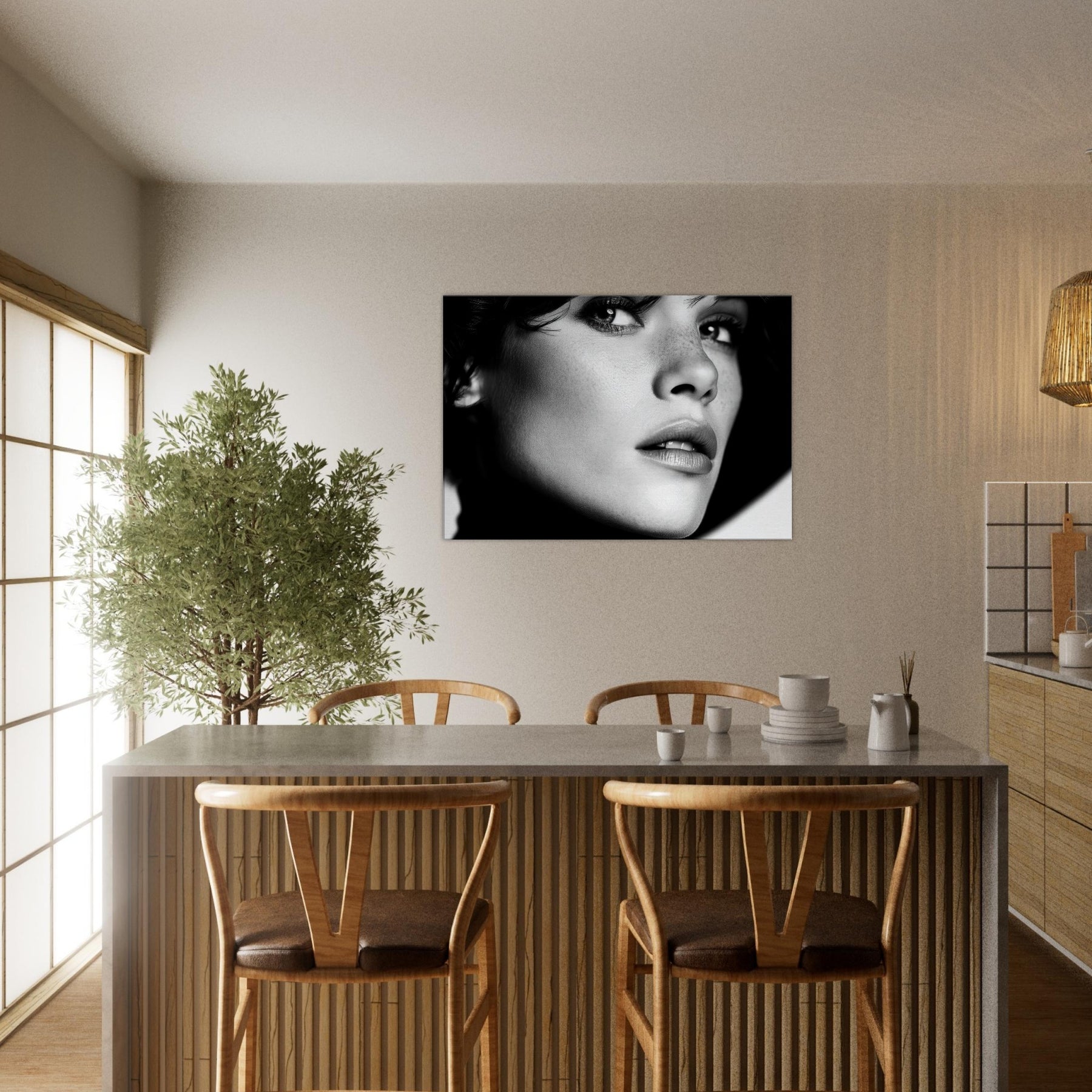 A striking European Woman emerges in luminous grayscale, capturing a moment where light and shadow braid the features with quiet intensity. The close crop and sultry gaze invite reflection, turning any wall into a contemplative corner.