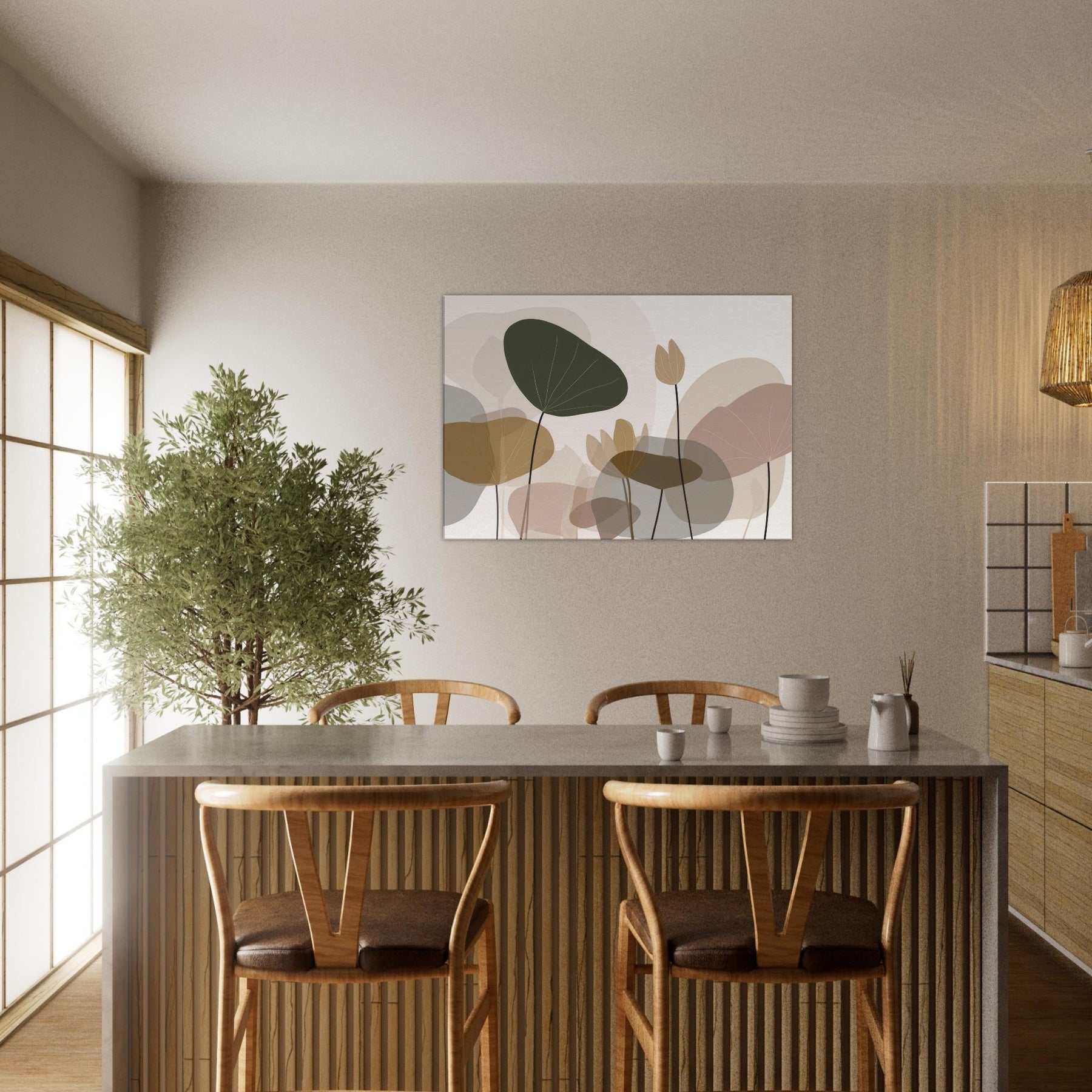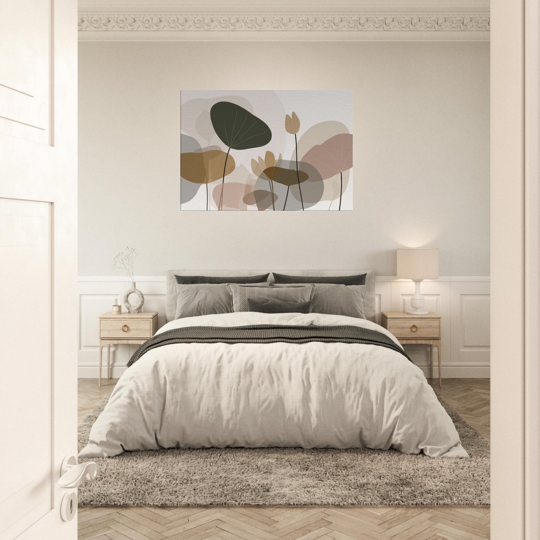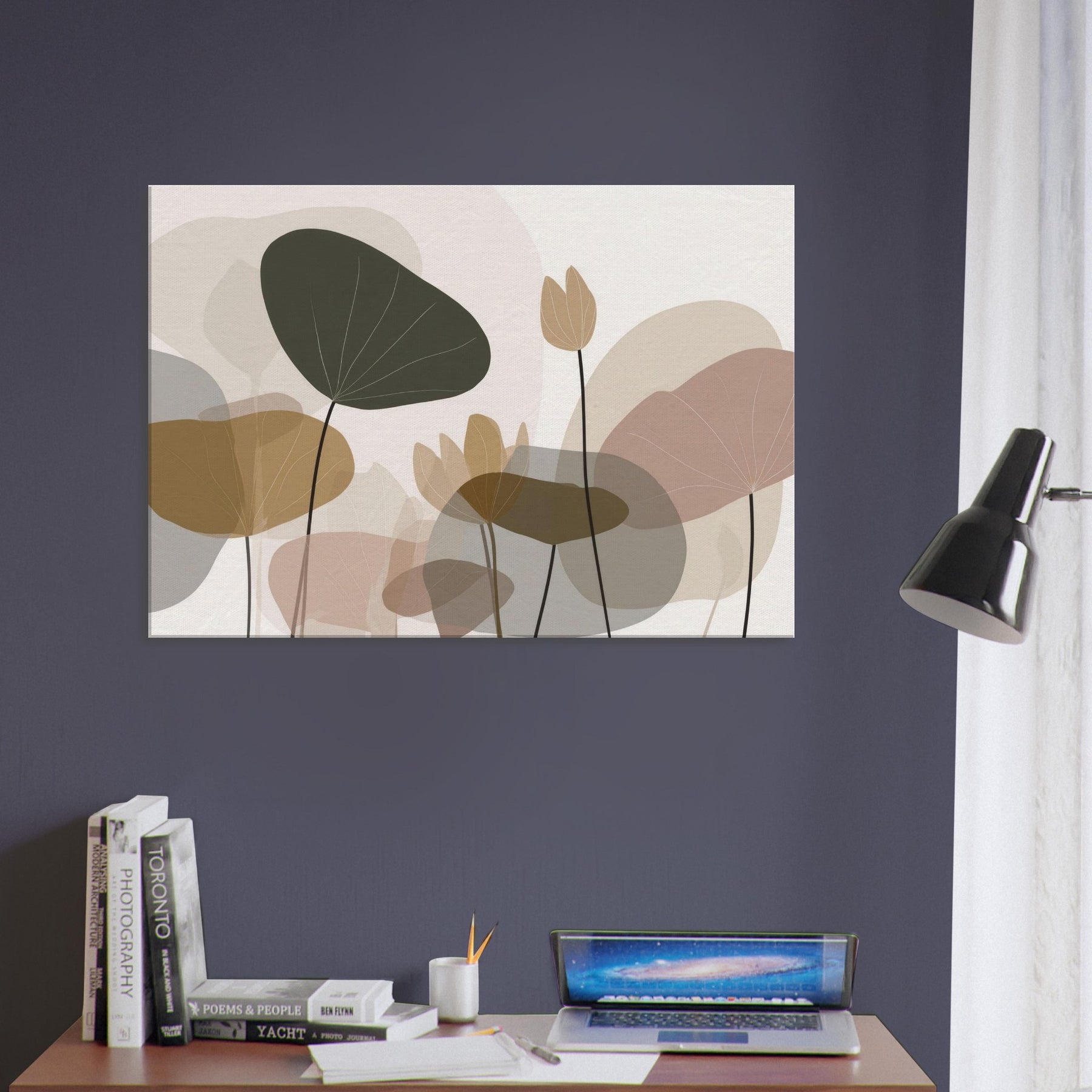 A serene meditation on light and form, this piece centers on Lotus Leaves set against a quiet, neutral field. The minimalist composition uses soft, overlapping shapes and slender, ink dark stems to invite the eye to rest. The lotus inspired silhouette dissolves into earthy tones sage, taupe, and clay evoking a gentle breeze over still water. Hang it in a living room or bedroom to soften edges, slow mornings, and invite calm conversation.