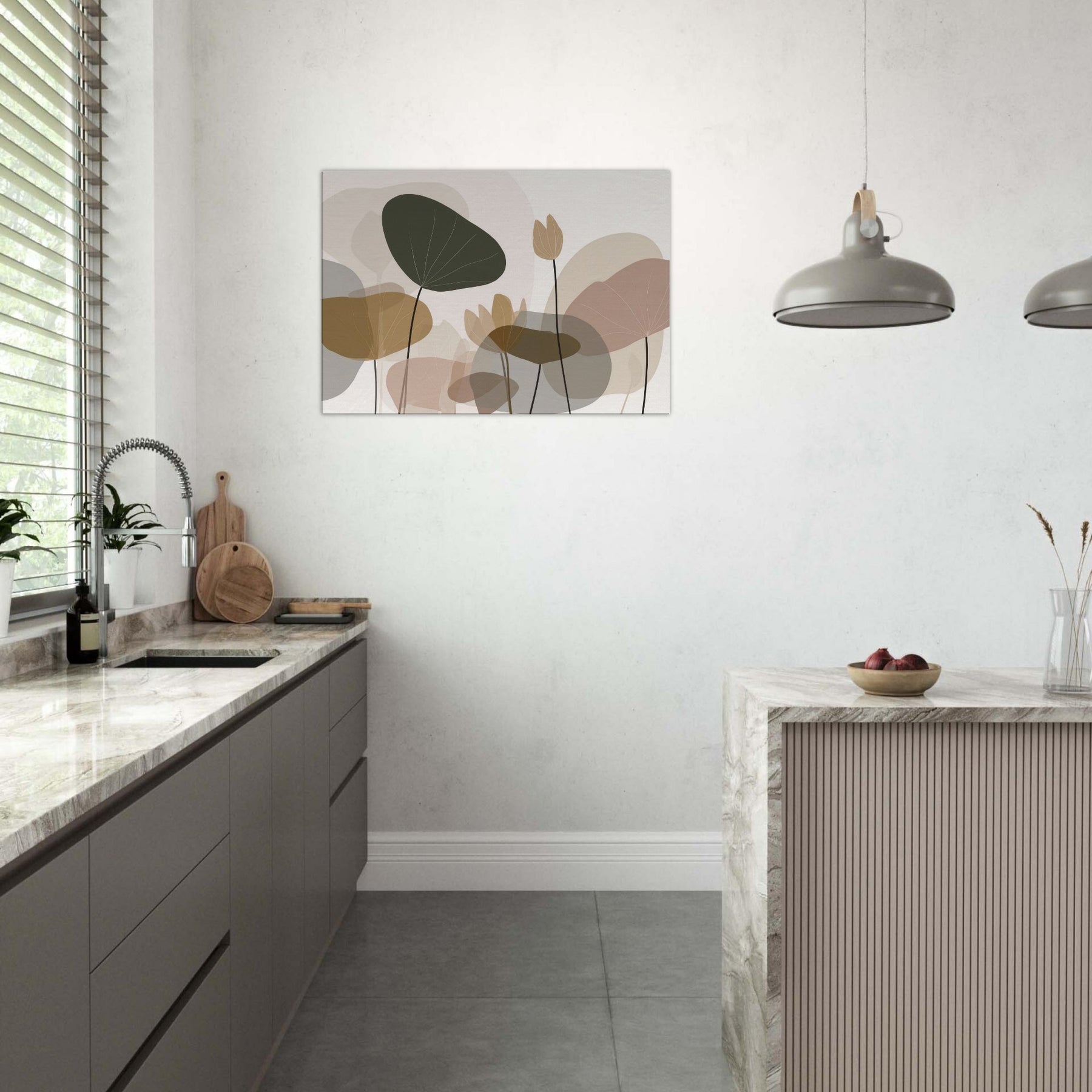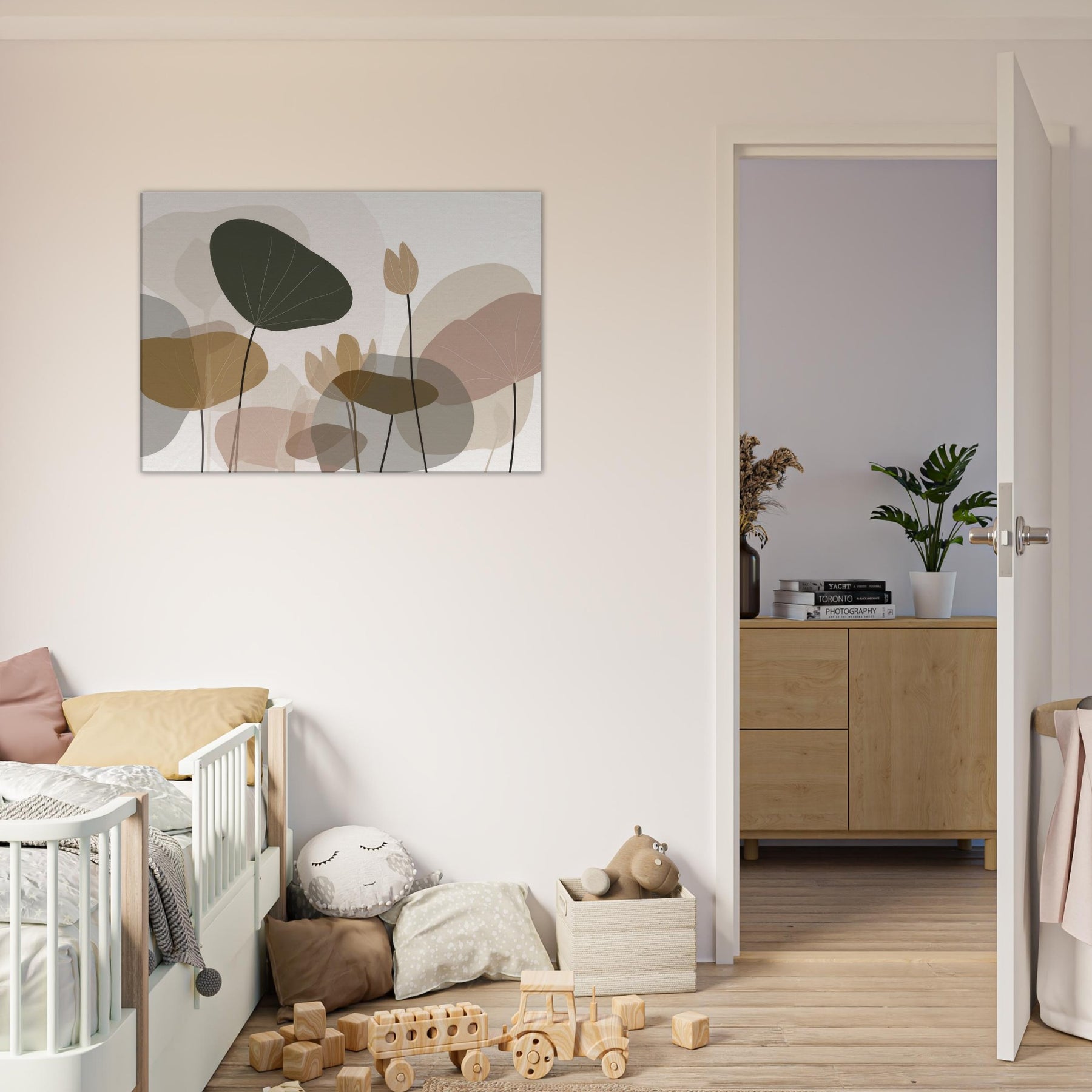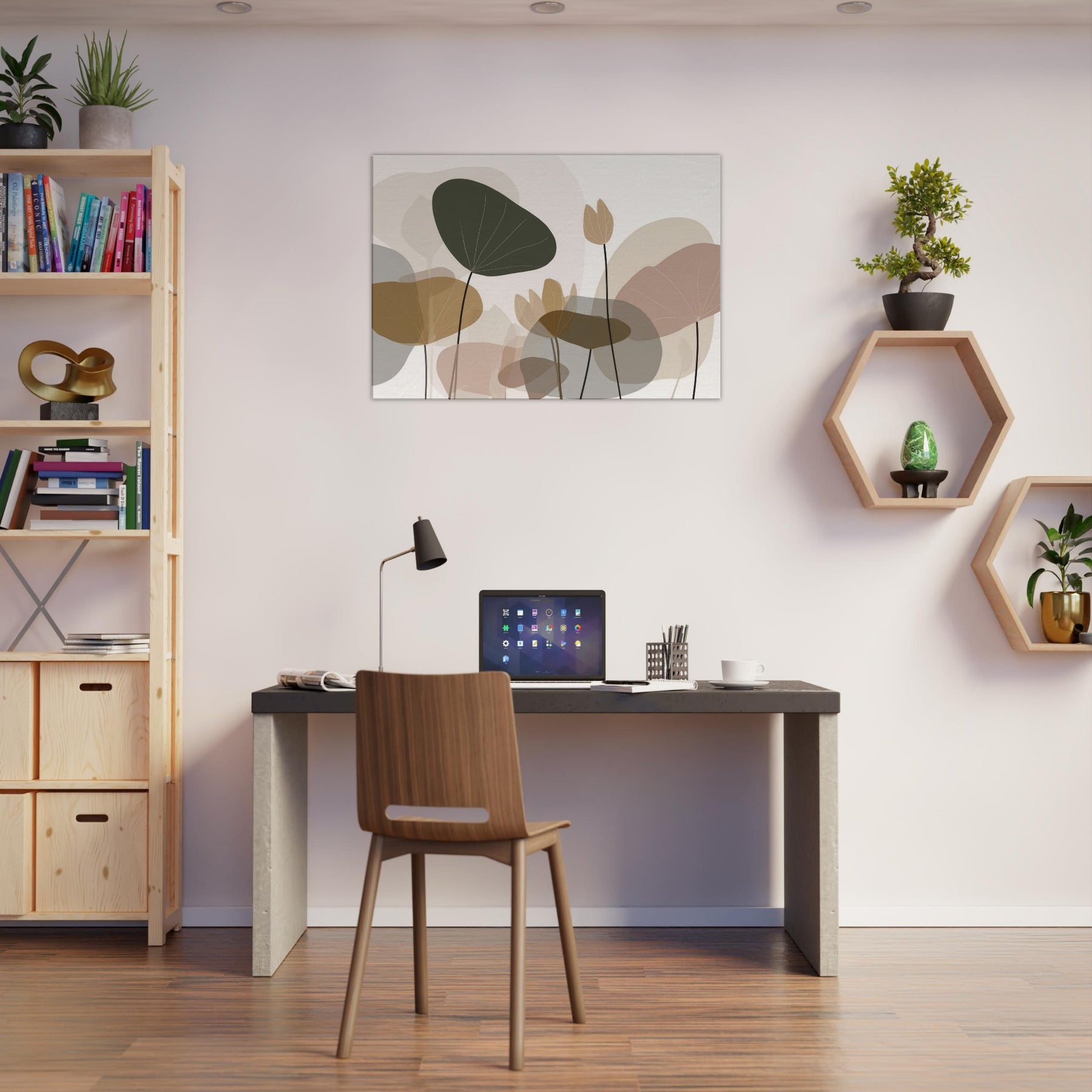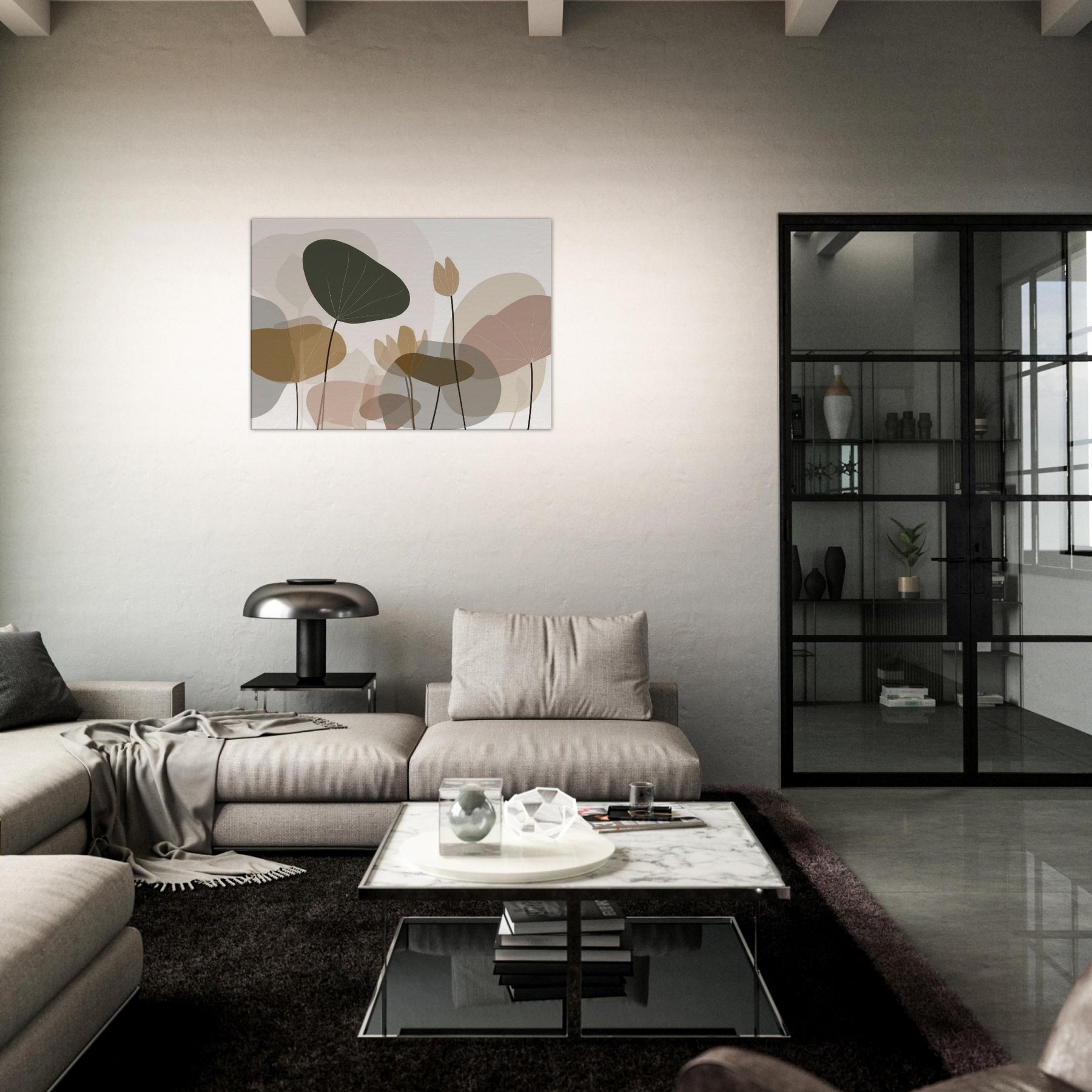 A serene meditation on light and form, this piece centers on Lotus Leaves set against a quiet, neutral field. The minimalist composition uses soft, overlapping shapes and slender, ink dark stems to invite the eye to rest. The lotus inspired silhouette dissolves into earthy tones sage, taupe, and clay evoking a gentle breeze over still water. Hang it in a living room or bedroom to soften edges, slow mornings, and invite calm conversation.