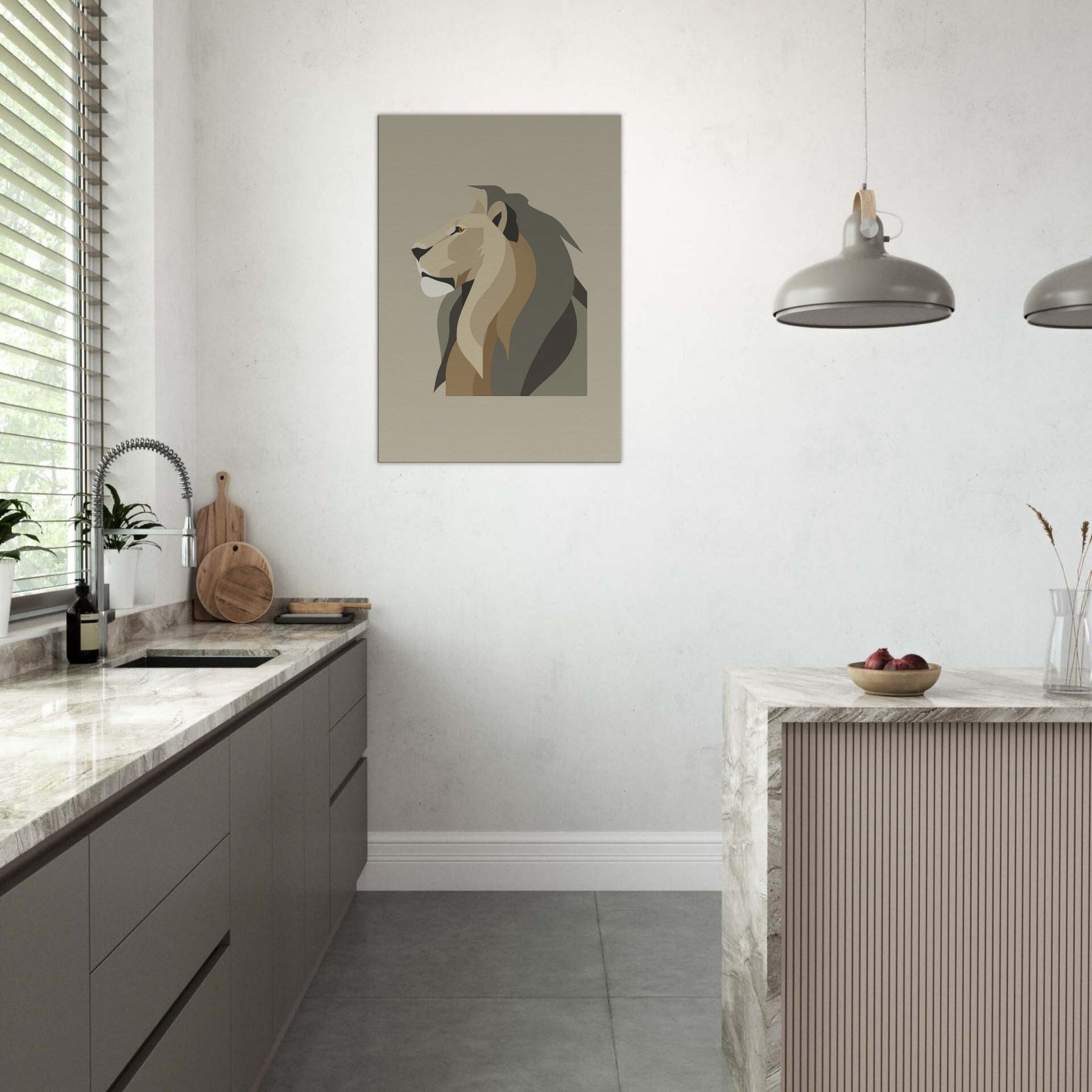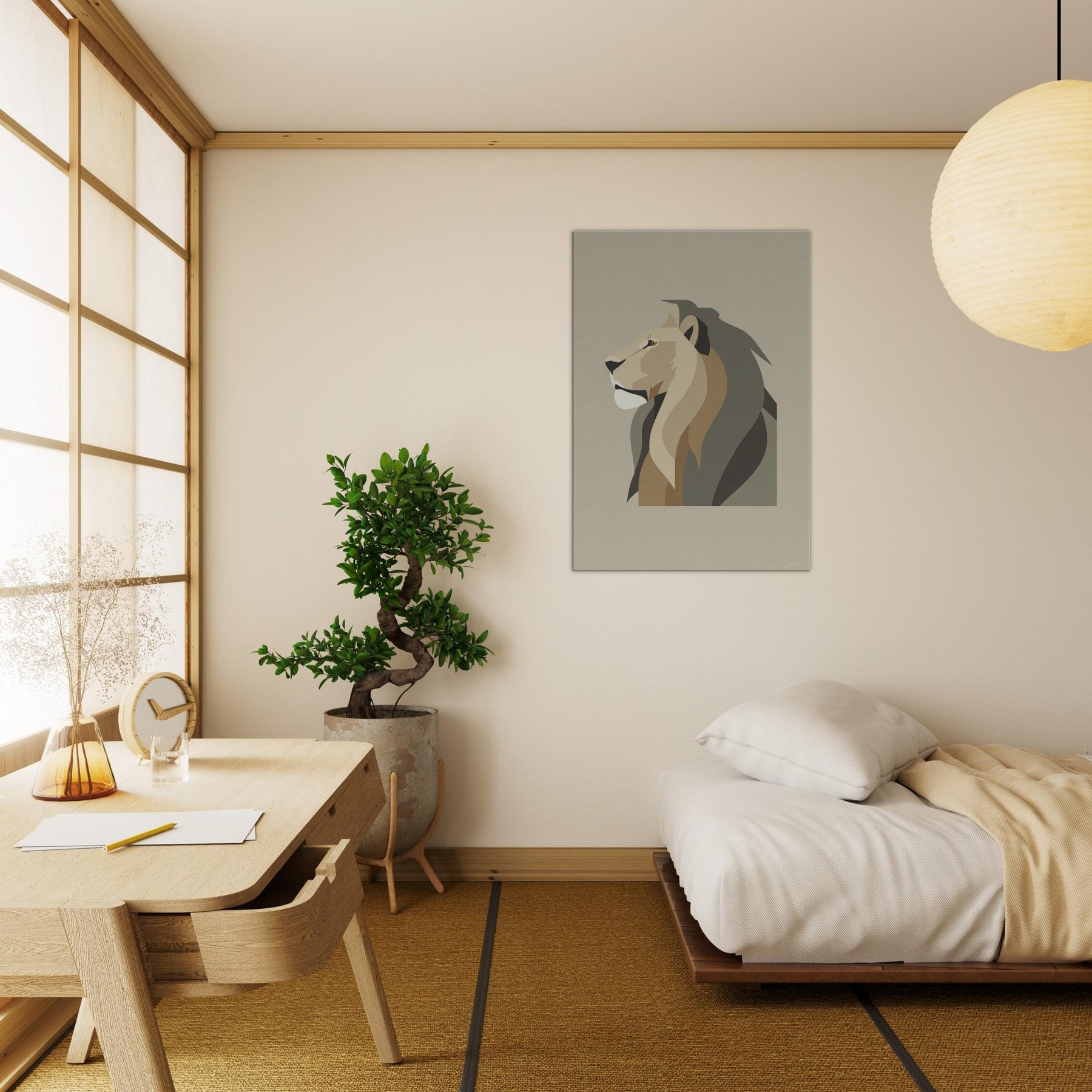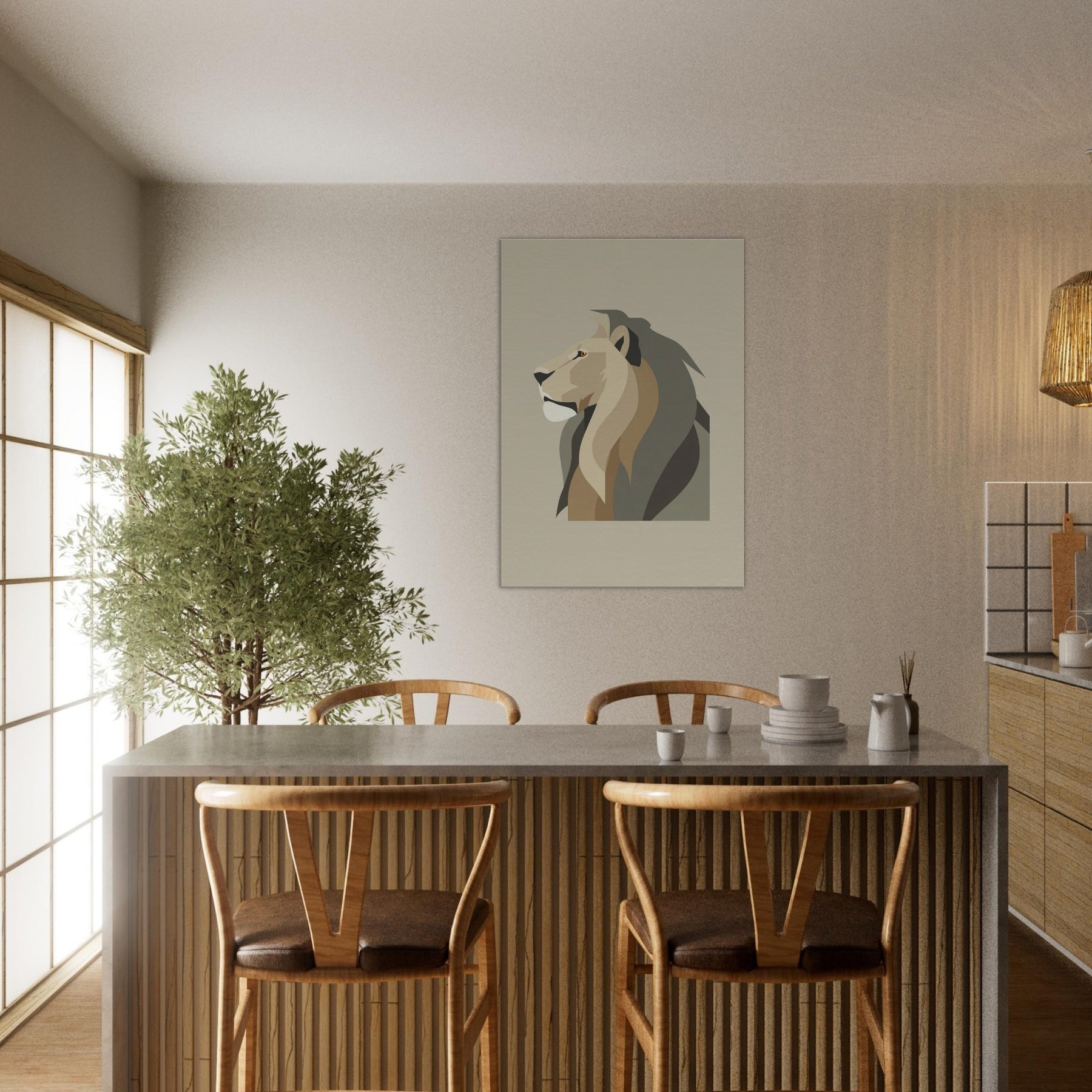 Anchor your living space with the quiet authority of a Lion rendered in clean, geometric planes. In soft earth tones, the minimalist exudes noble restraint, a sculptural presence that invites stillness rather than noise. The piece breathes with light, casting subtle shadows that shift through the day, turning bare walls into a serene gallery. Whether hung above a sofa or in a hallway, it elevates the room with refined warmth and a timeless sense of atmosphere.