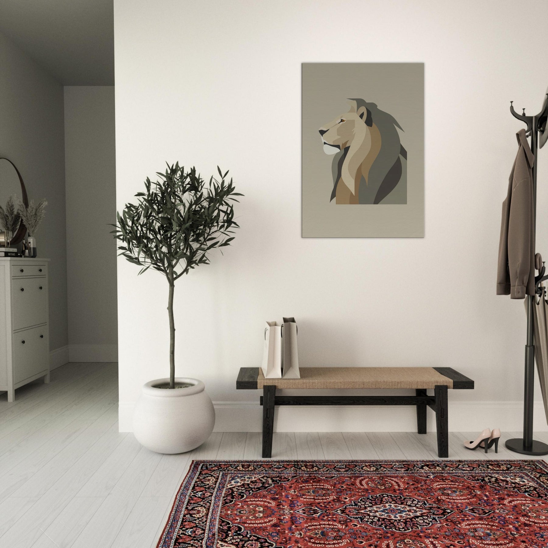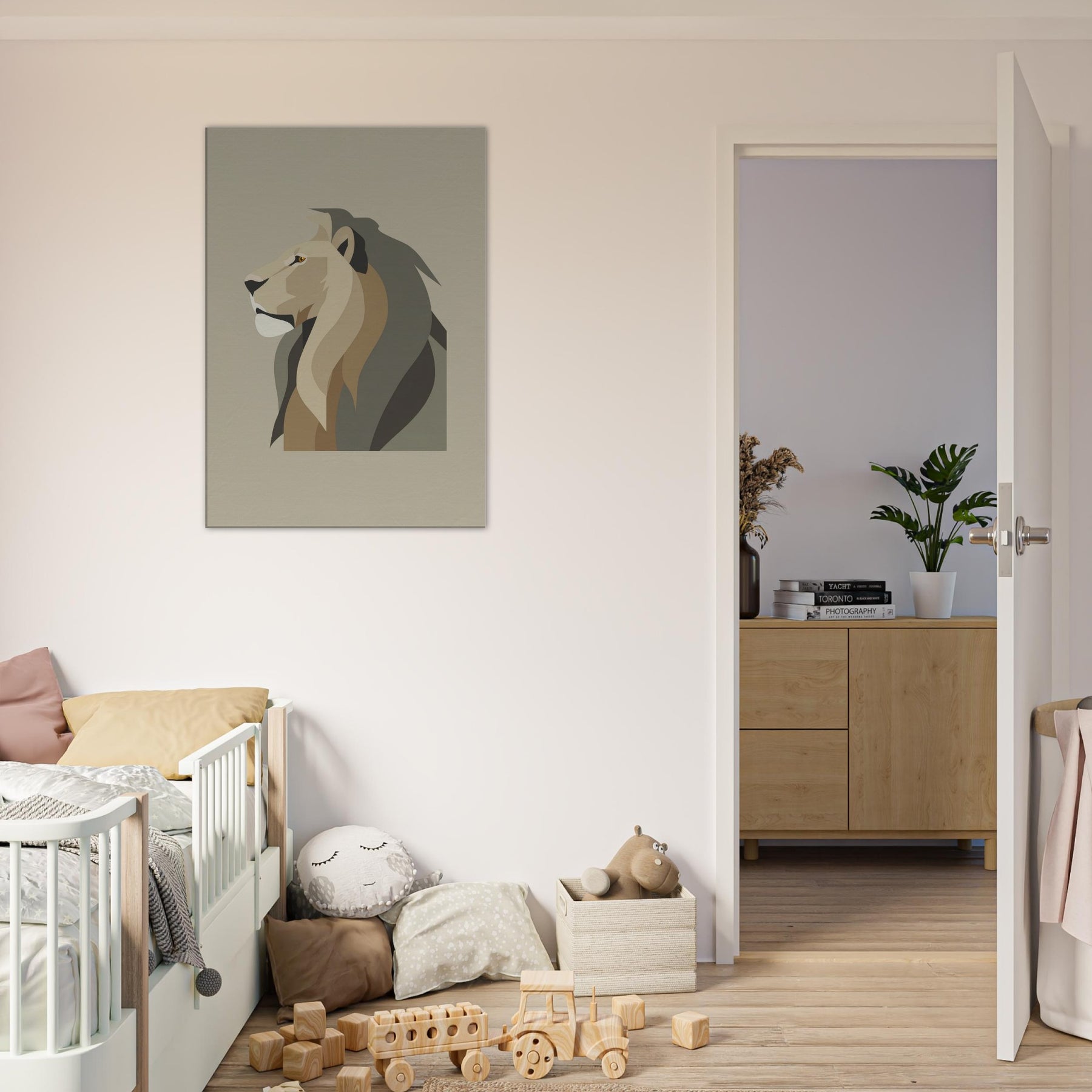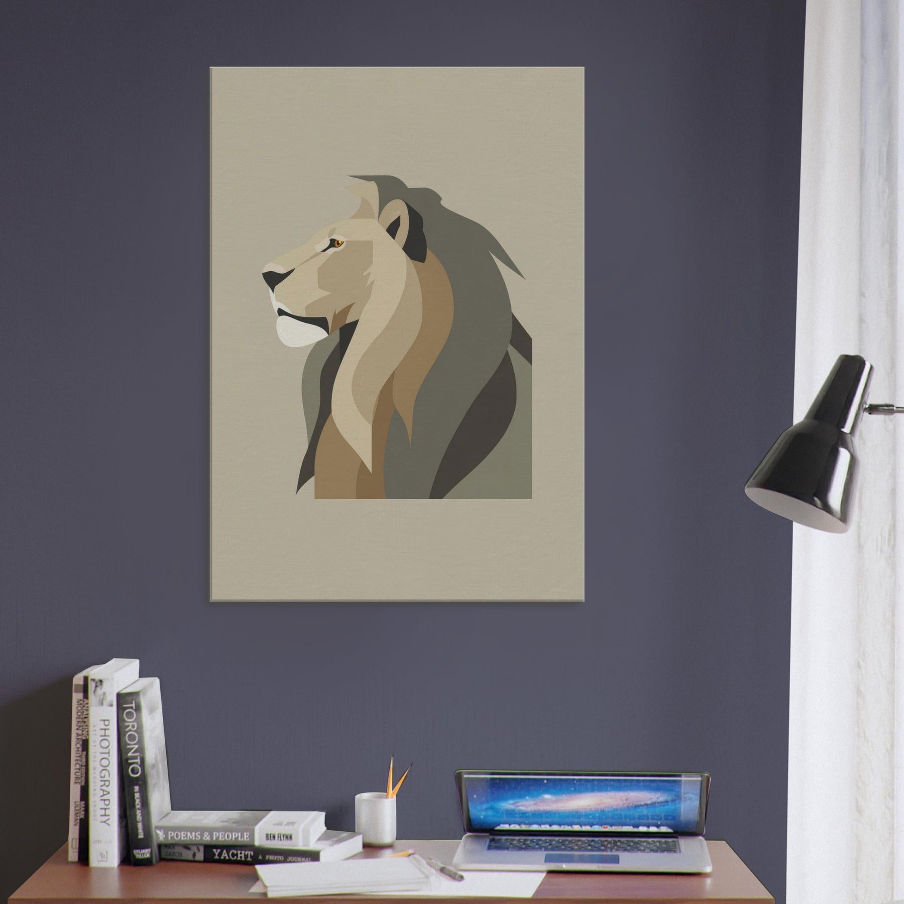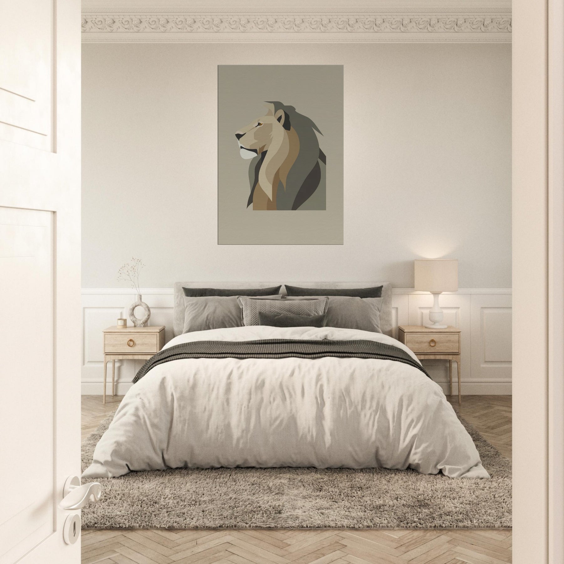 Anchor your living space with the quiet authority of a Lion rendered in clean, geometric planes. In soft earth tones, the minimalist exudes noble restraint, a sculptural presence that invites stillness rather than noise. The piece breathes with light, casting subtle shadows that shift through the day, turning bare walls into a serene gallery. Whether hung above a sofa or in a hallway, it elevates the room with refined warmth and a timeless sense of atmosphere.