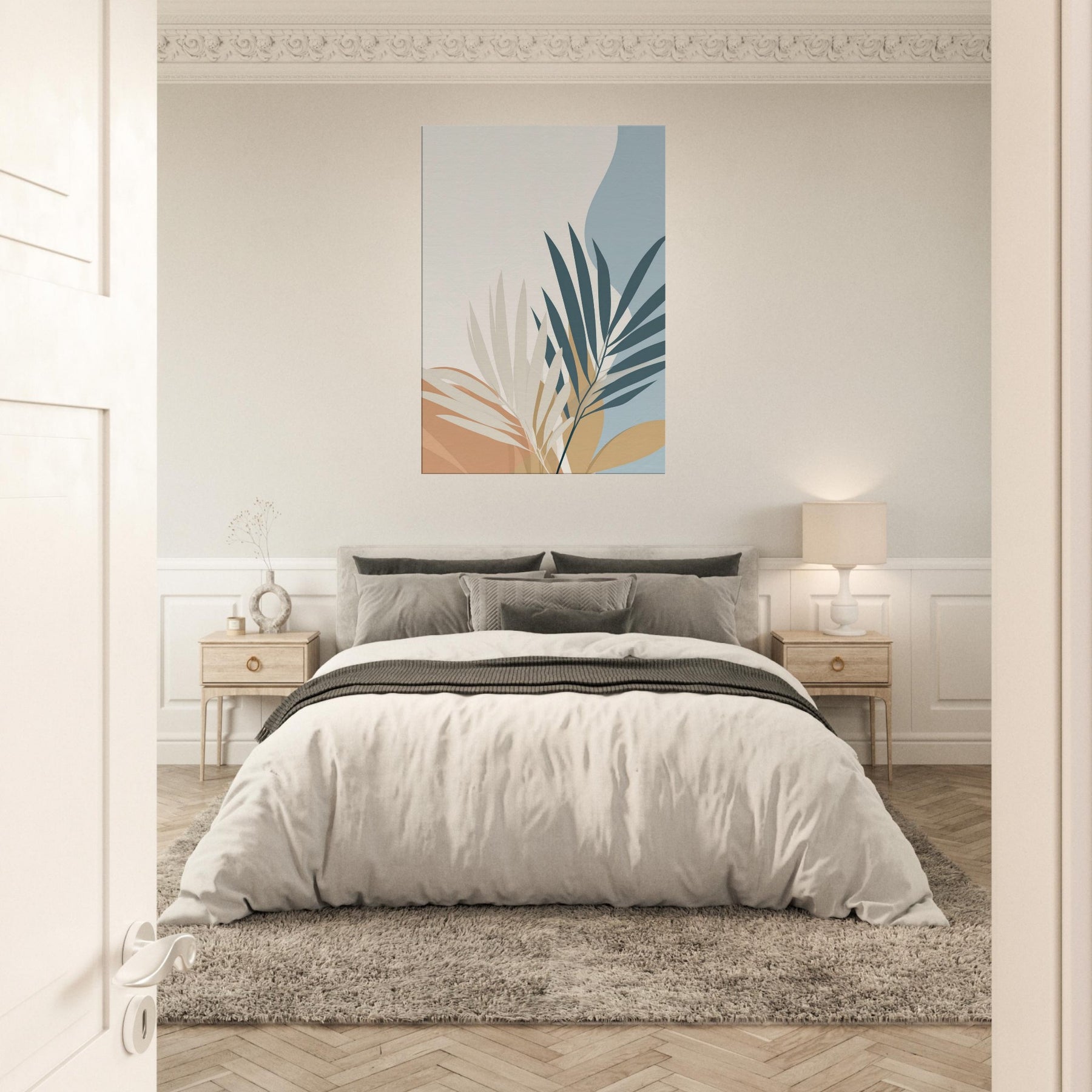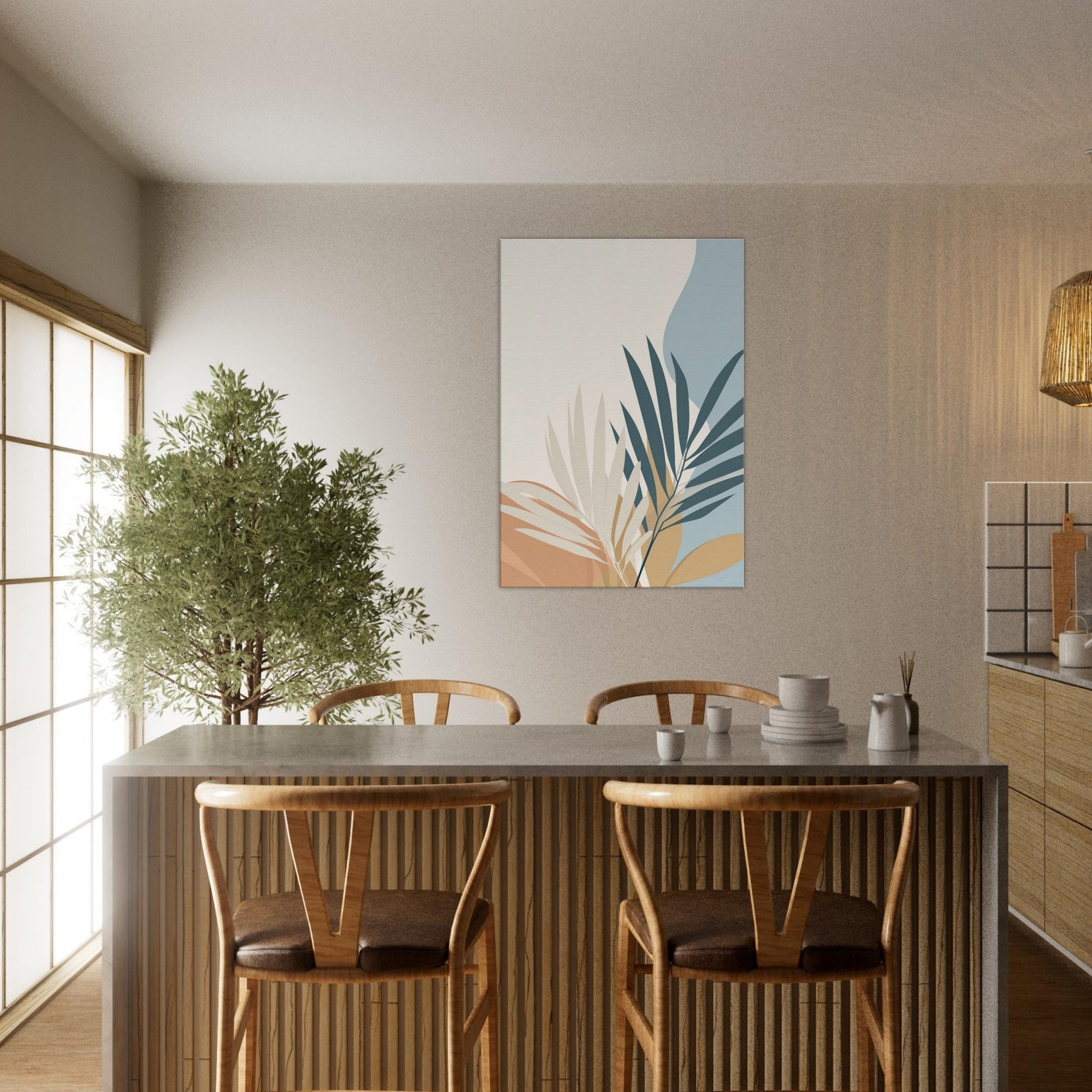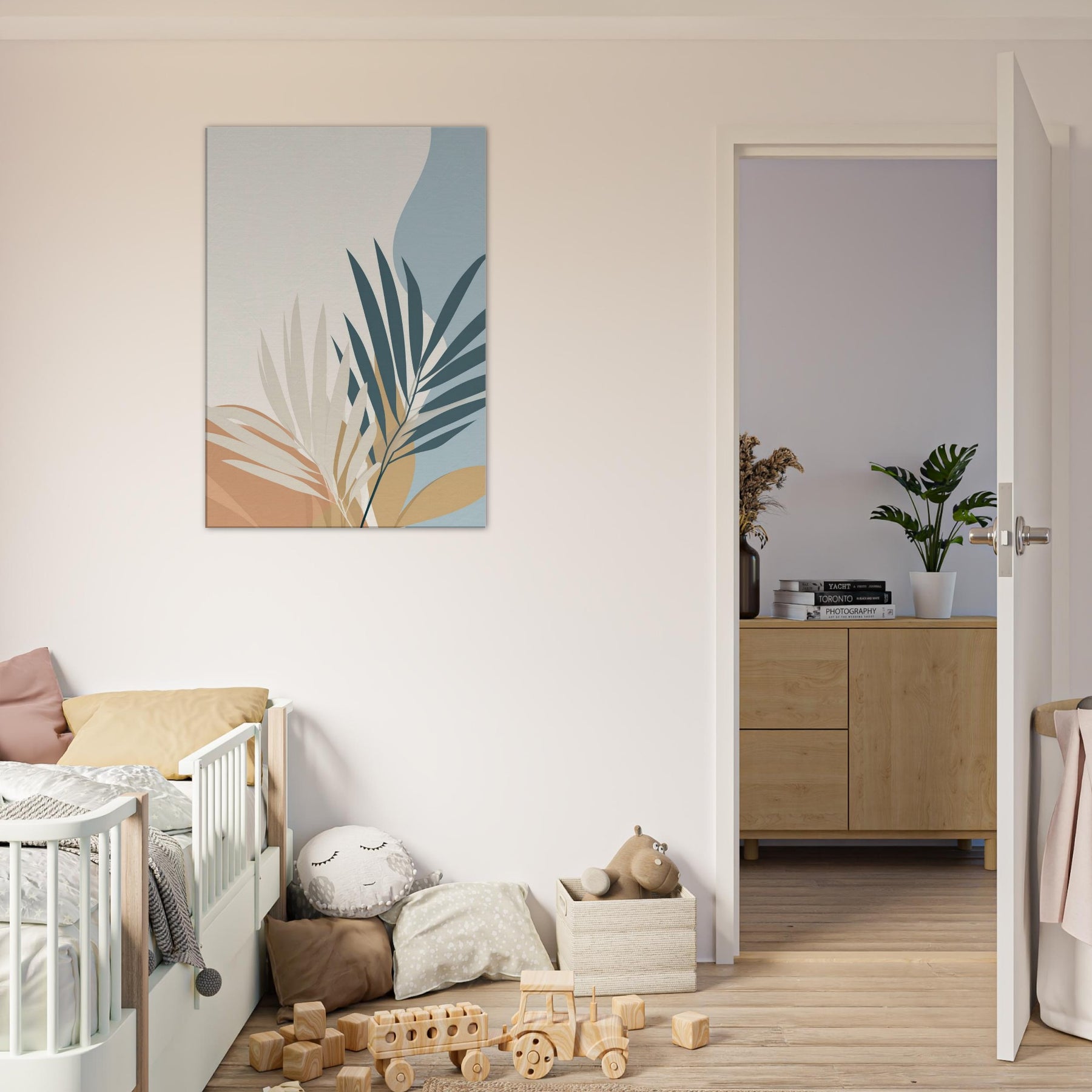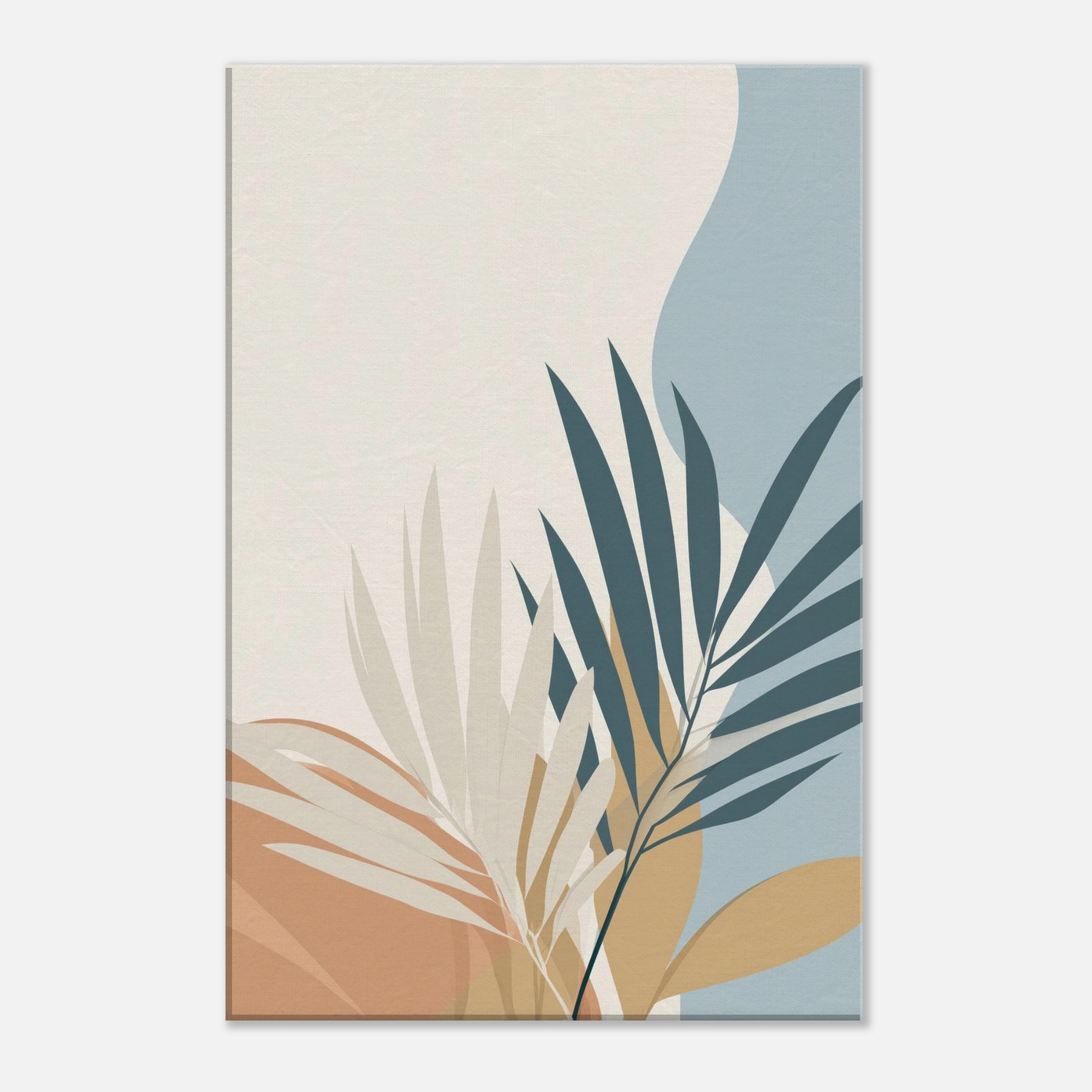 Calm, restrained, this piece unveils palm leaves in a quiet, spacious palette. The minimalist composition invites air and light to move through your room, making spaces feel larger and more serene. The primary subject palm leaves unfurls with graceful arcs, suggesting tropical ease without ornament. In soft cream, warm ochre, and muted blues, it harmonizes with wood, textiles, and greenery to create a timeless backdrop. Perfect for a living room or bedroom, it sets a soothing mood that invites reflection, while elevating your space with simple, elegant presence.