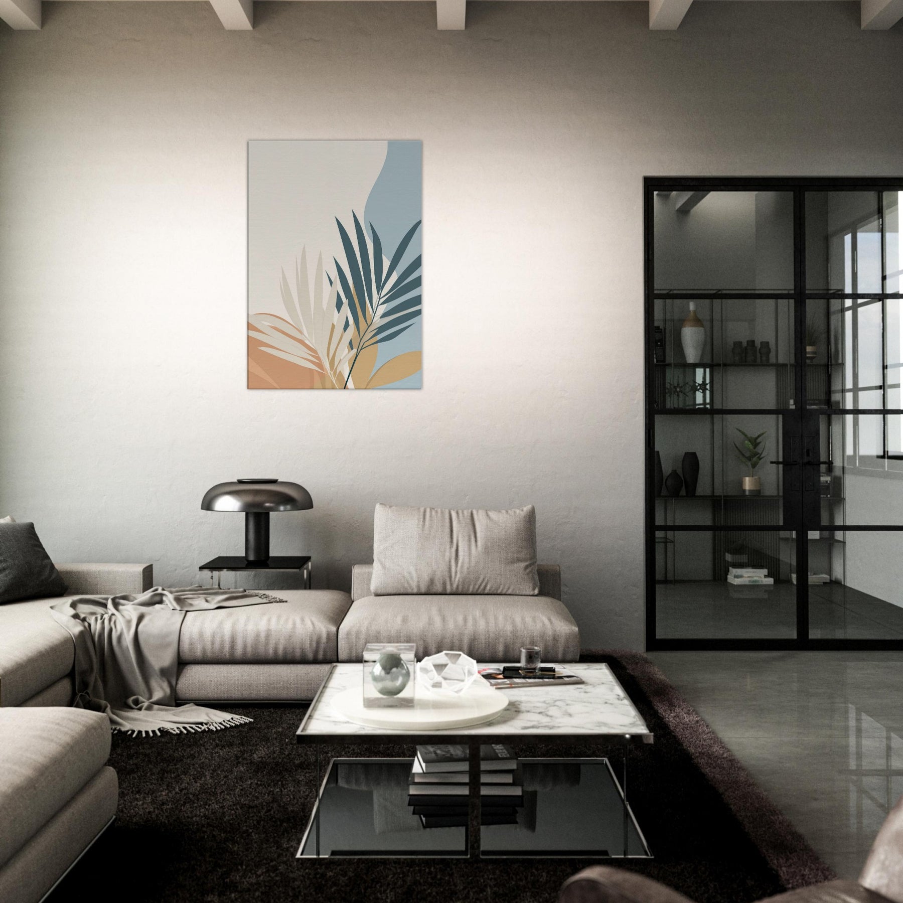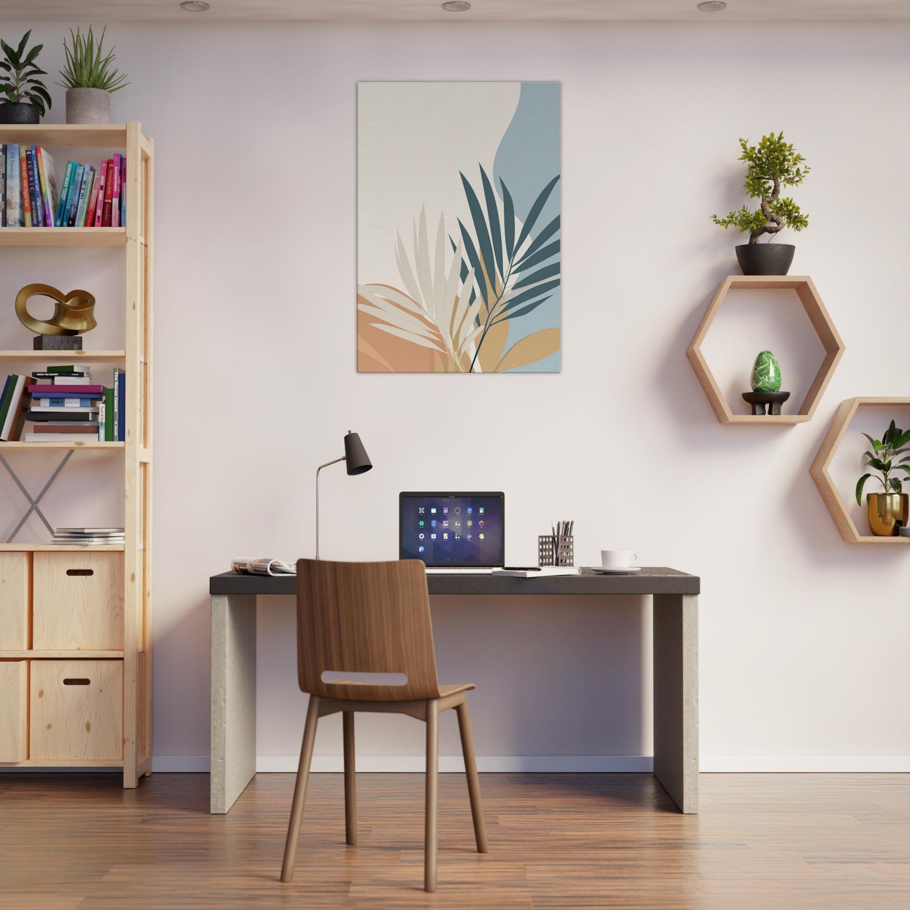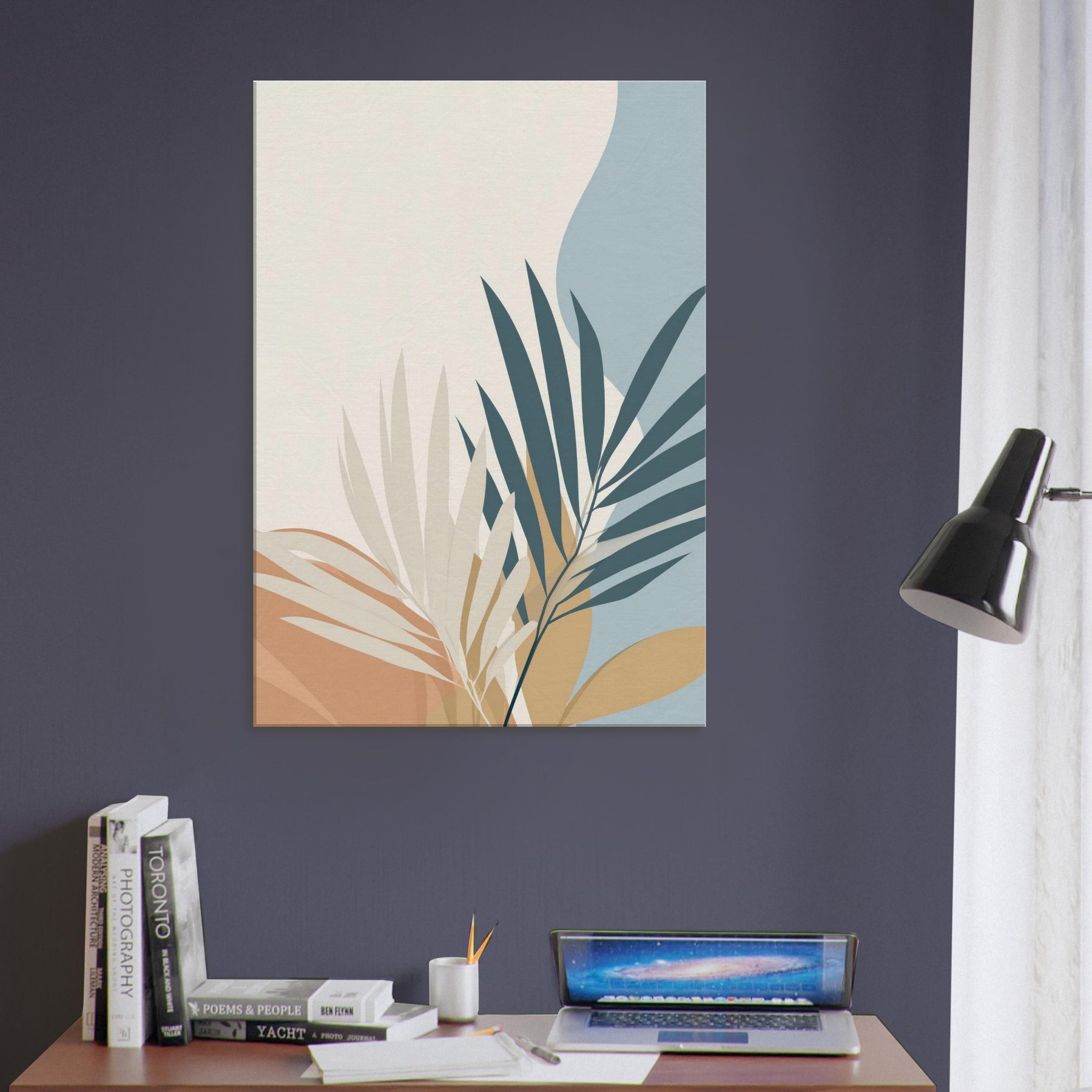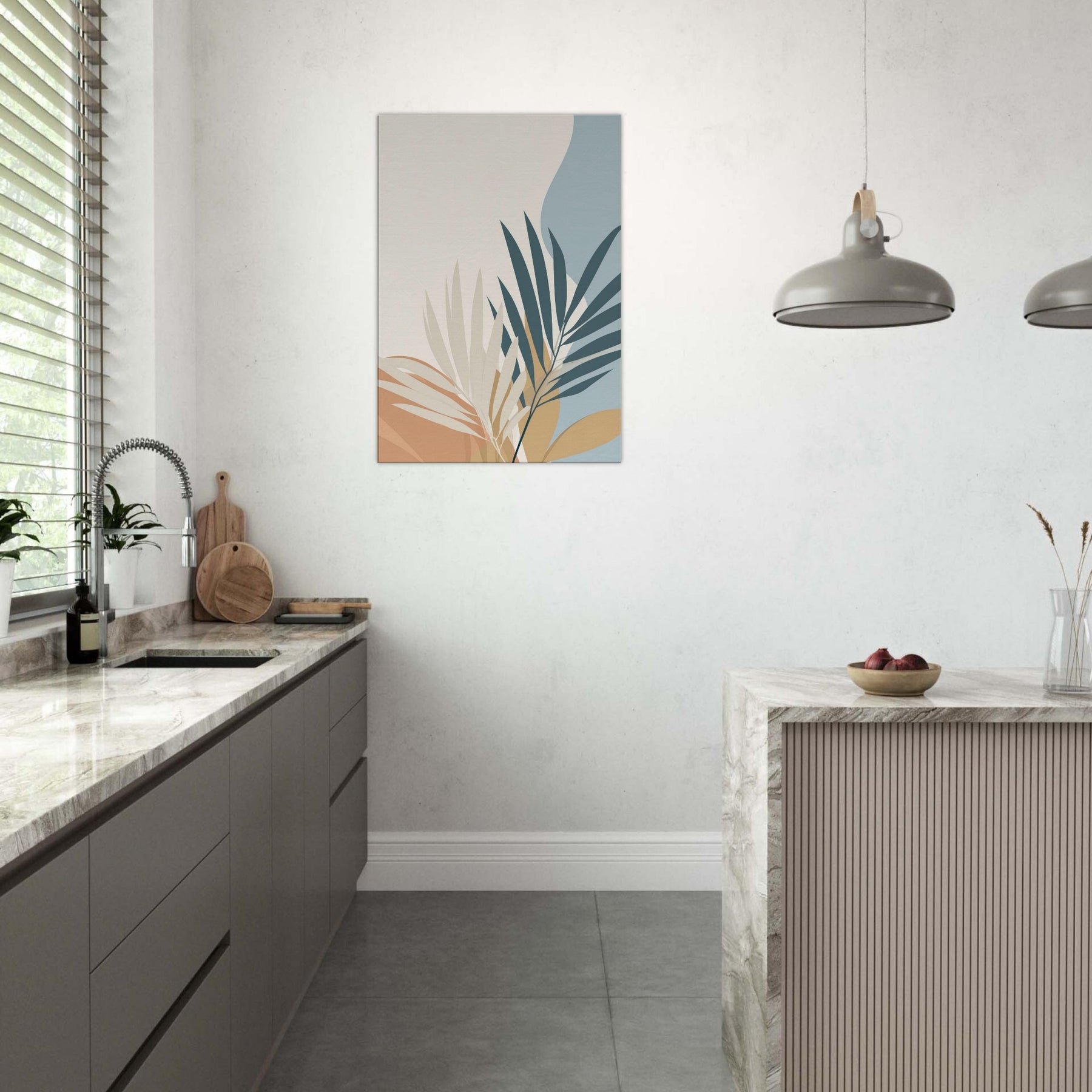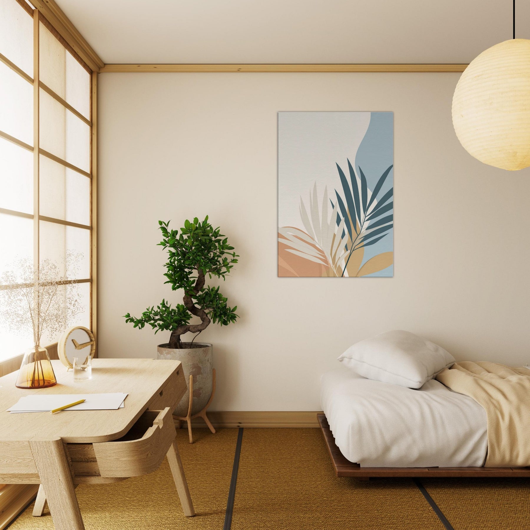 Calm, restrained, this piece unveils palm leaves in a quiet, spacious palette. The minimalist composition invites air and light to move through your room, making spaces feel larger and more serene. The primary subject palm leaves unfurls with graceful arcs, suggesting tropical ease without ornament. In soft cream, warm ochre, and muted blues, it harmonizes with wood, textiles, and greenery to create a timeless backdrop. Perfect for a living room or bedroom, it sets a soothing mood that invites reflection, while elevating your space with simple, elegant presence.