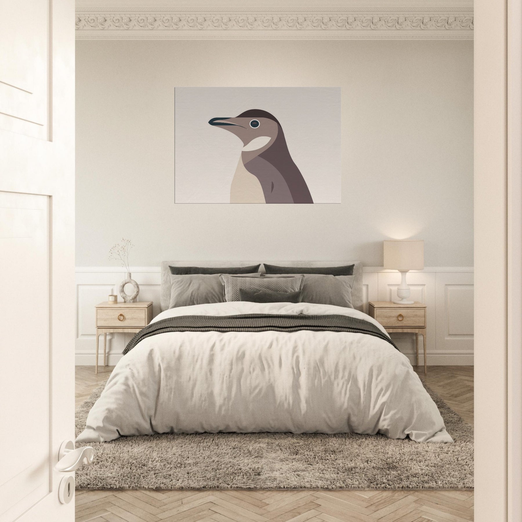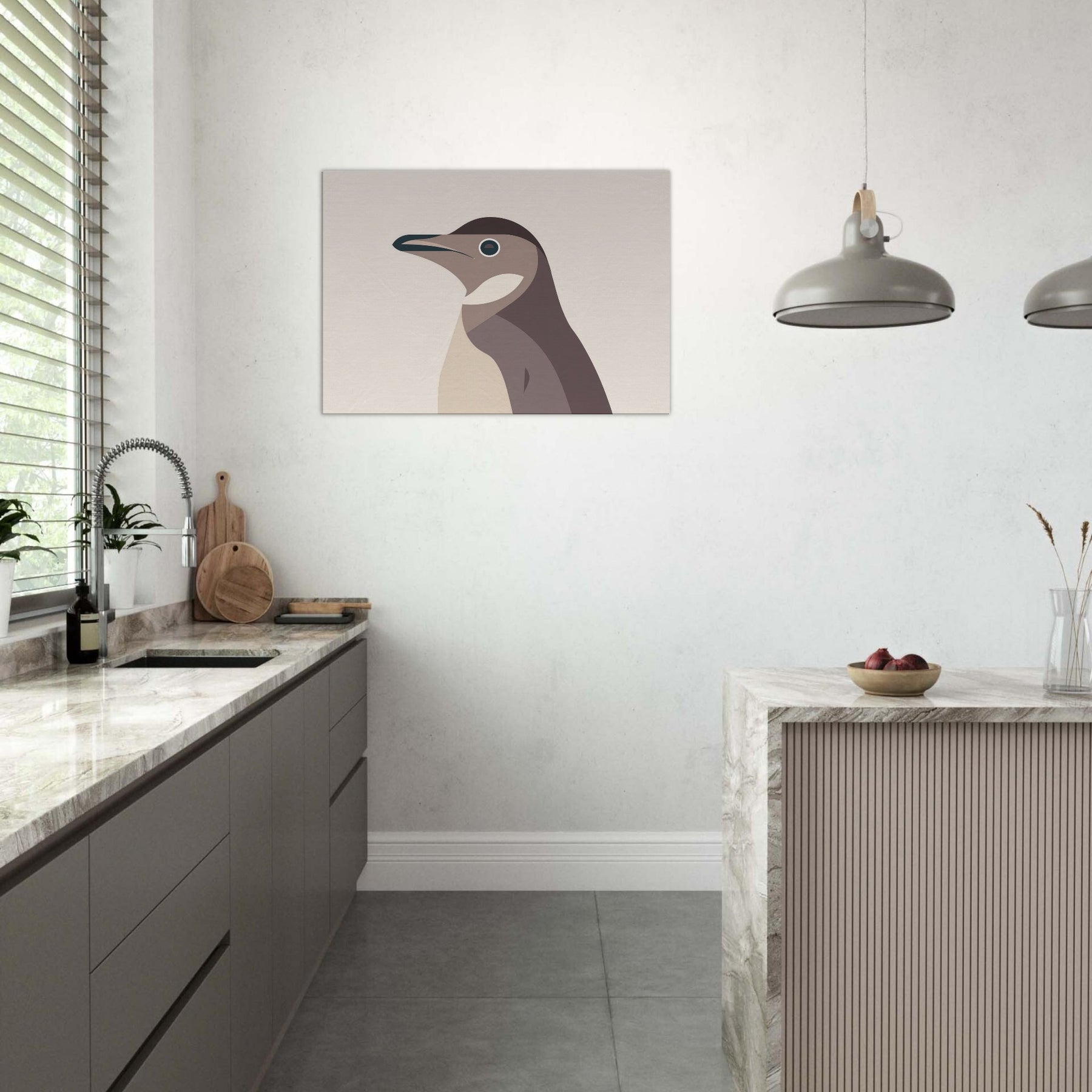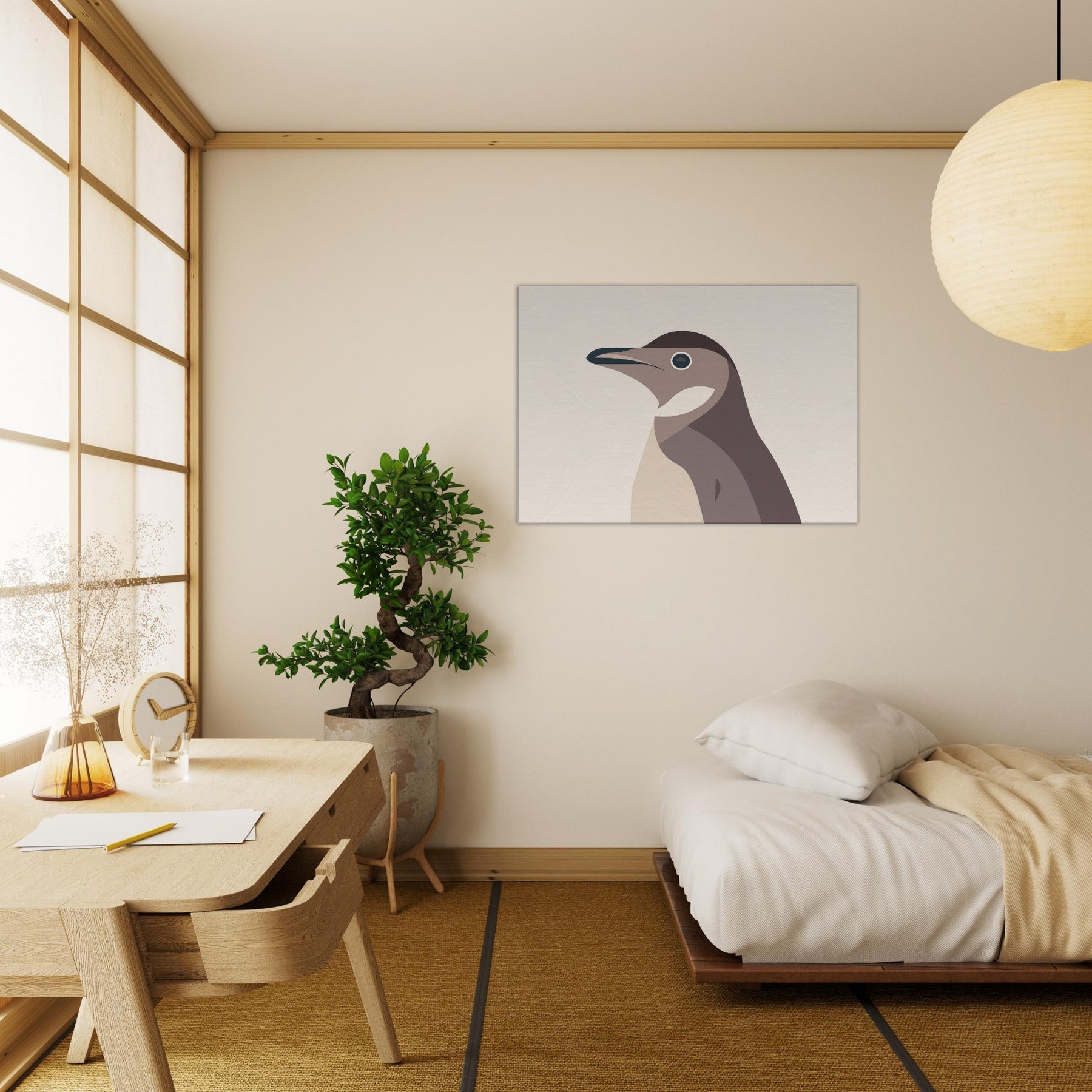 Like a breath of pale light, this minimalist Penguin folds complexity into clean, confident lines. The hush of warm beiges and dusky browns evokes a quiet, winter coast, where ink dark eye glints with curiosity. Its pared down form invites calm, making a room feel larger, more contemplative an airy focal point that pairs as gracefully with natural textures as with modern steel and glass. Hang it in a living room or bedroom to savor stillness after a busy day; the Penguin becomes a silent companion for slow, mindful moments.