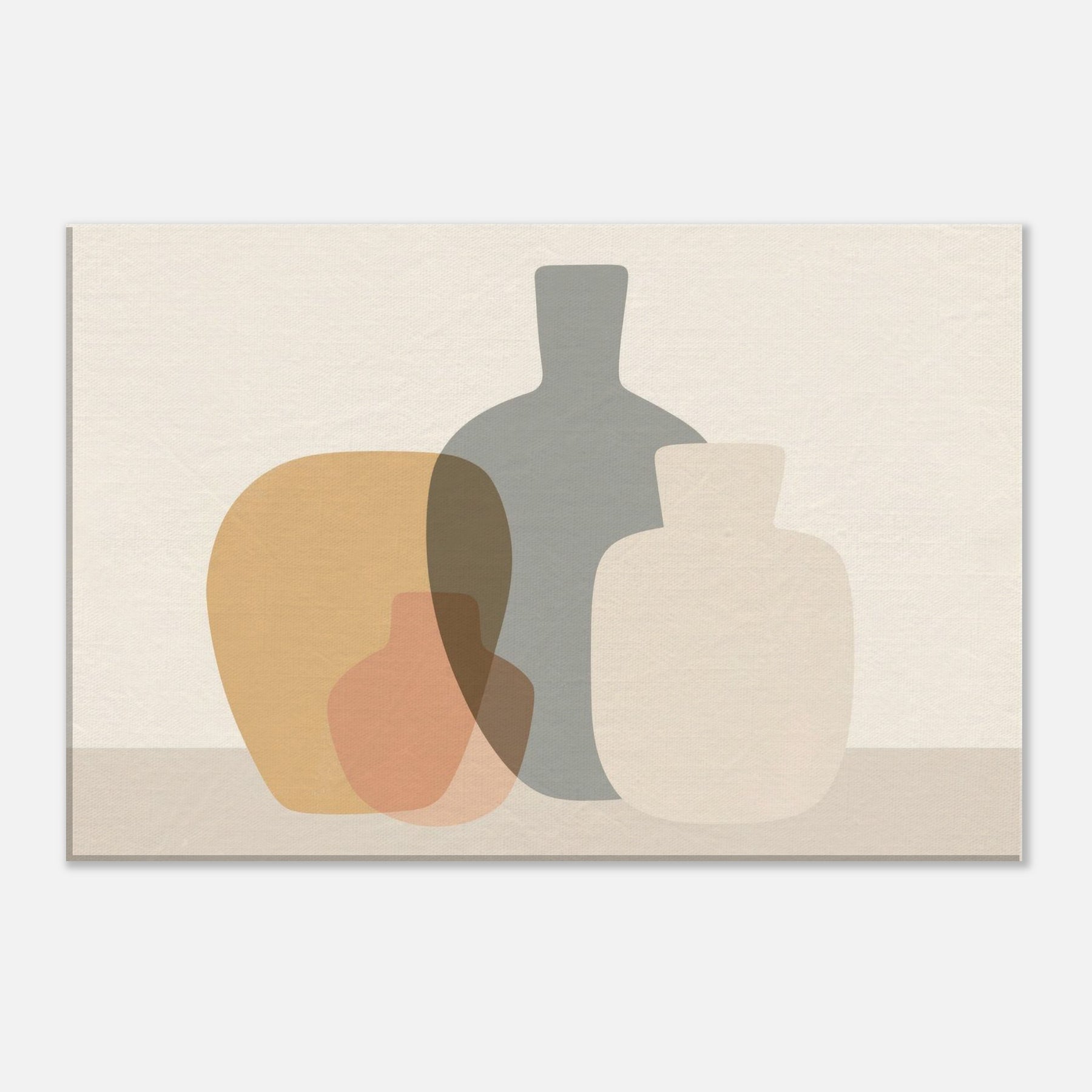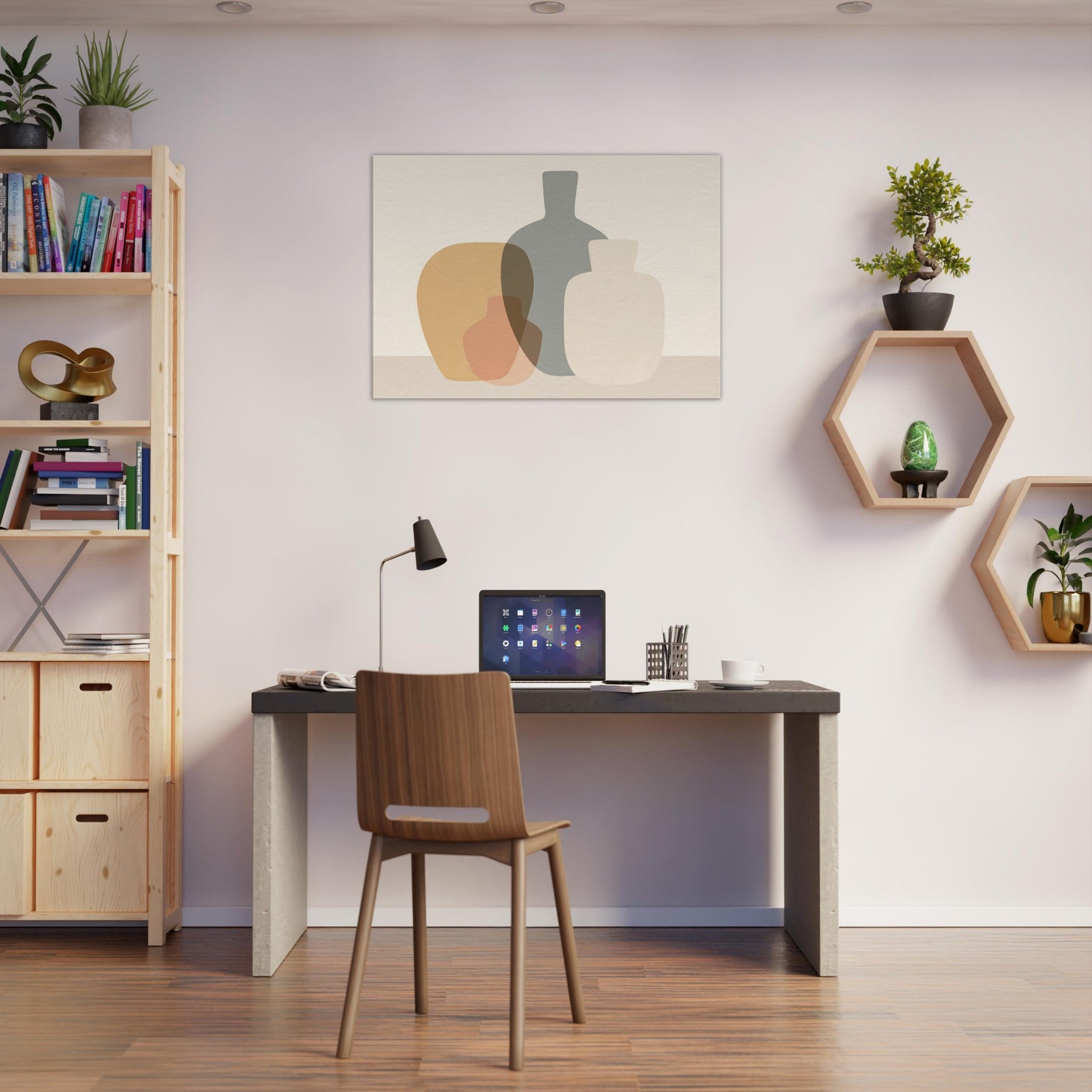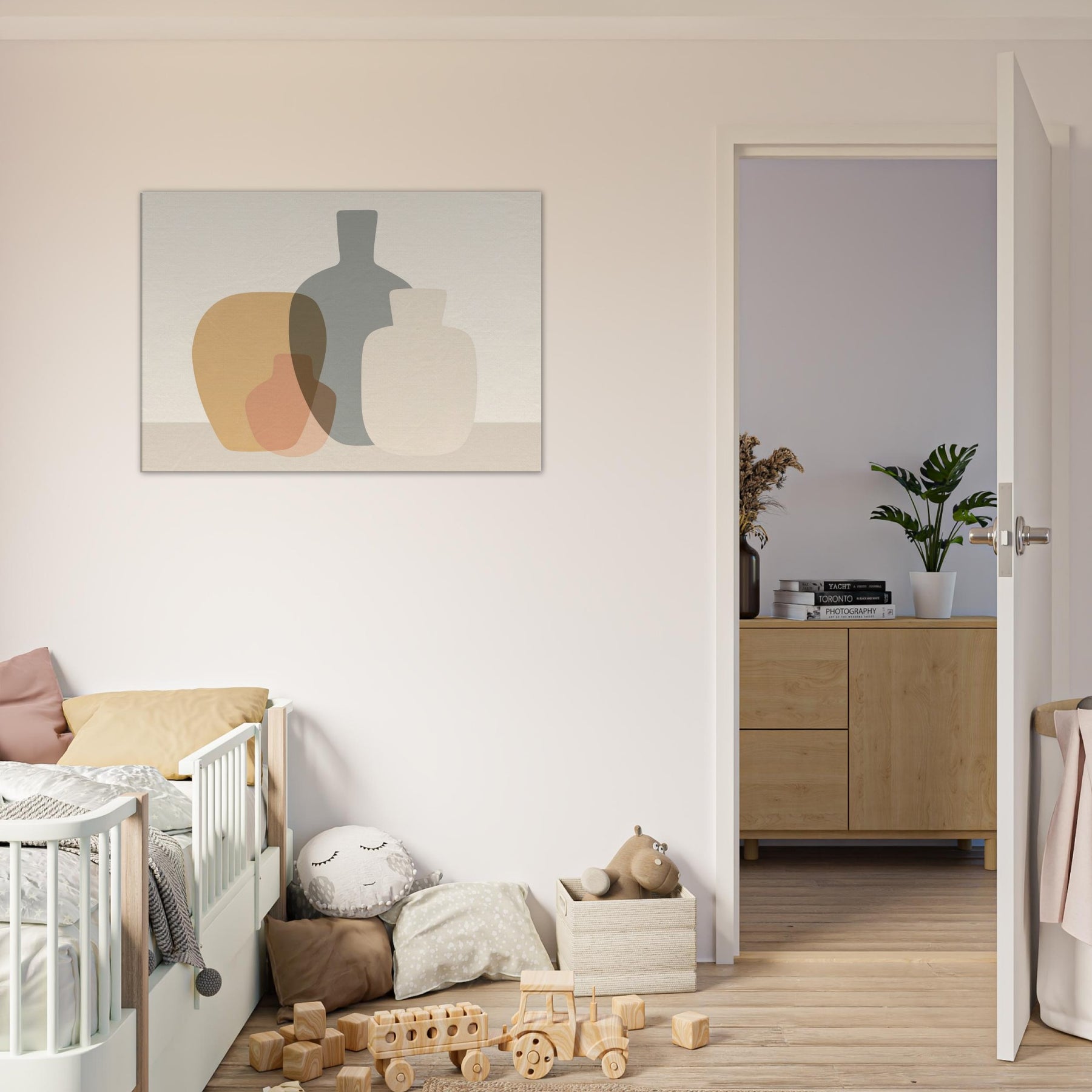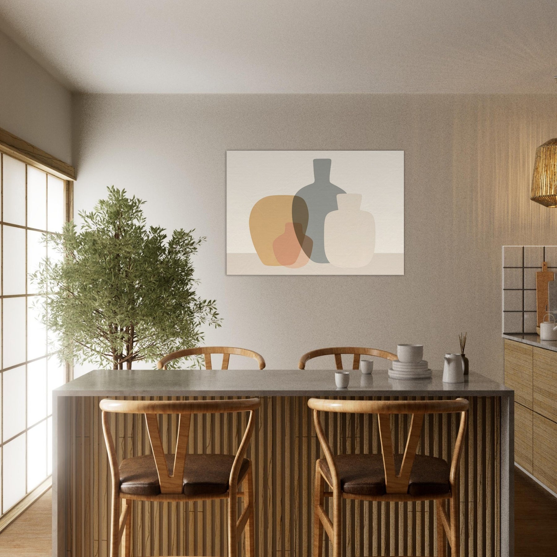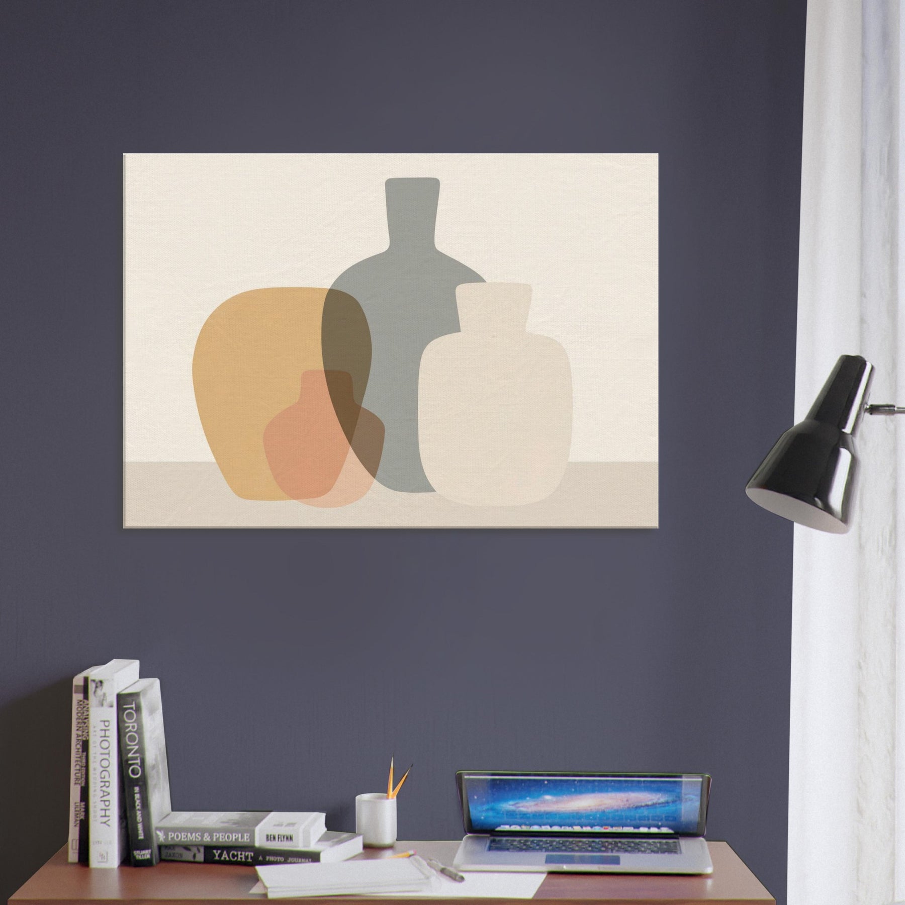 Vase Trio invites a quiet rhythm into your space. This minimalist composition layers three vessels in soft, overlapping tones, creating a gentle archive of light and shadow. The warmth of ochre, the coolness of gray, and the pale cream harmonize across a calm canvas, turning a wall into a contemplative corner. Whether a sunlit living room or a serene bedroom, this piece wears restraint beautifully, guiding the eye with effortless balance and inviting conversation without shouting for attention.