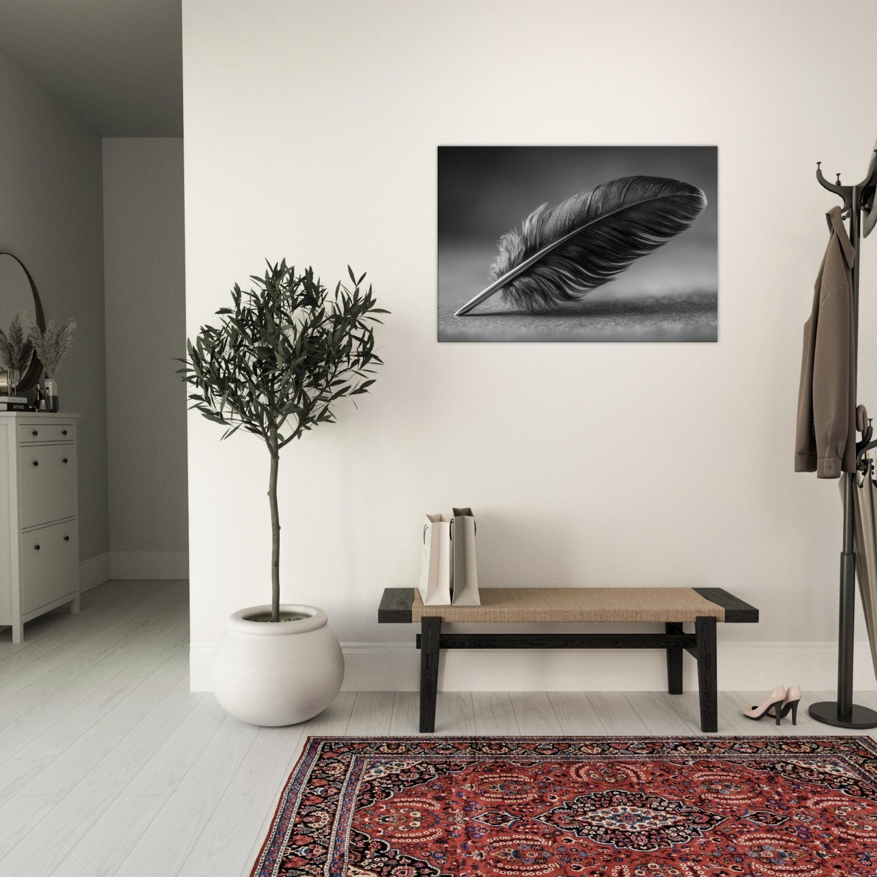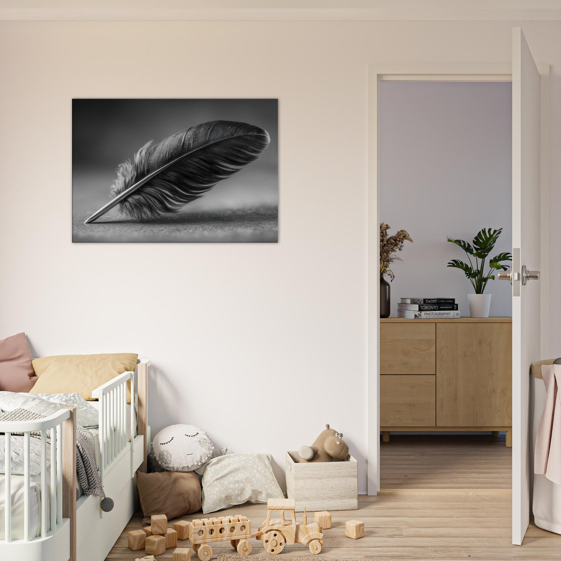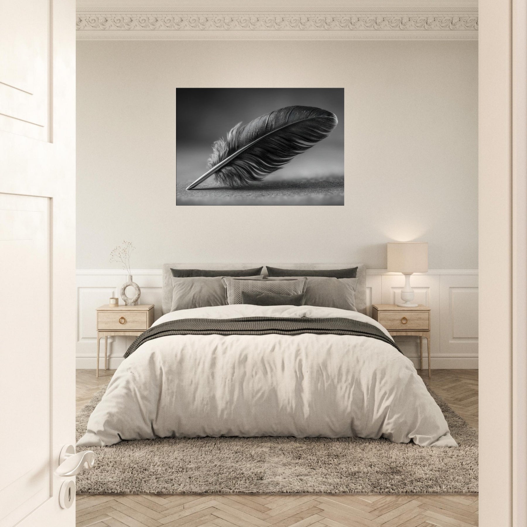 Feather Quill becomes a quiet emblem of focus and grace in this black and white study. The graceful arc of the feather suggests a moment of writing, a pause between thought and expression. The high contrast tones create a tactile, velvet like mood that anchors a living room or hallway with refined calm. It invites contemplation without shouting, pairing beautifully with muted textures and soft lighting. A timeless accent, this piece elevates everyday spaces into a gallery of everyday poetry.