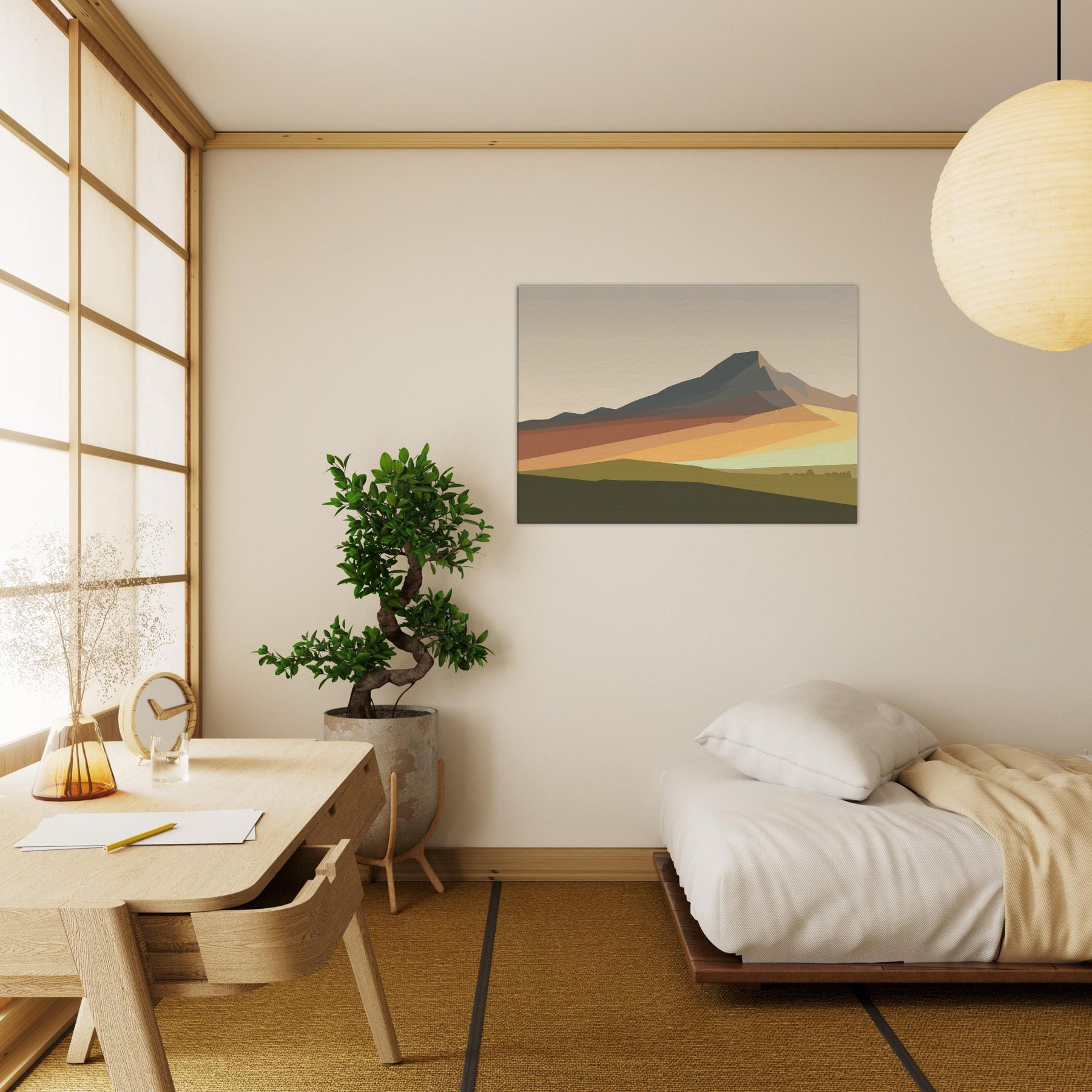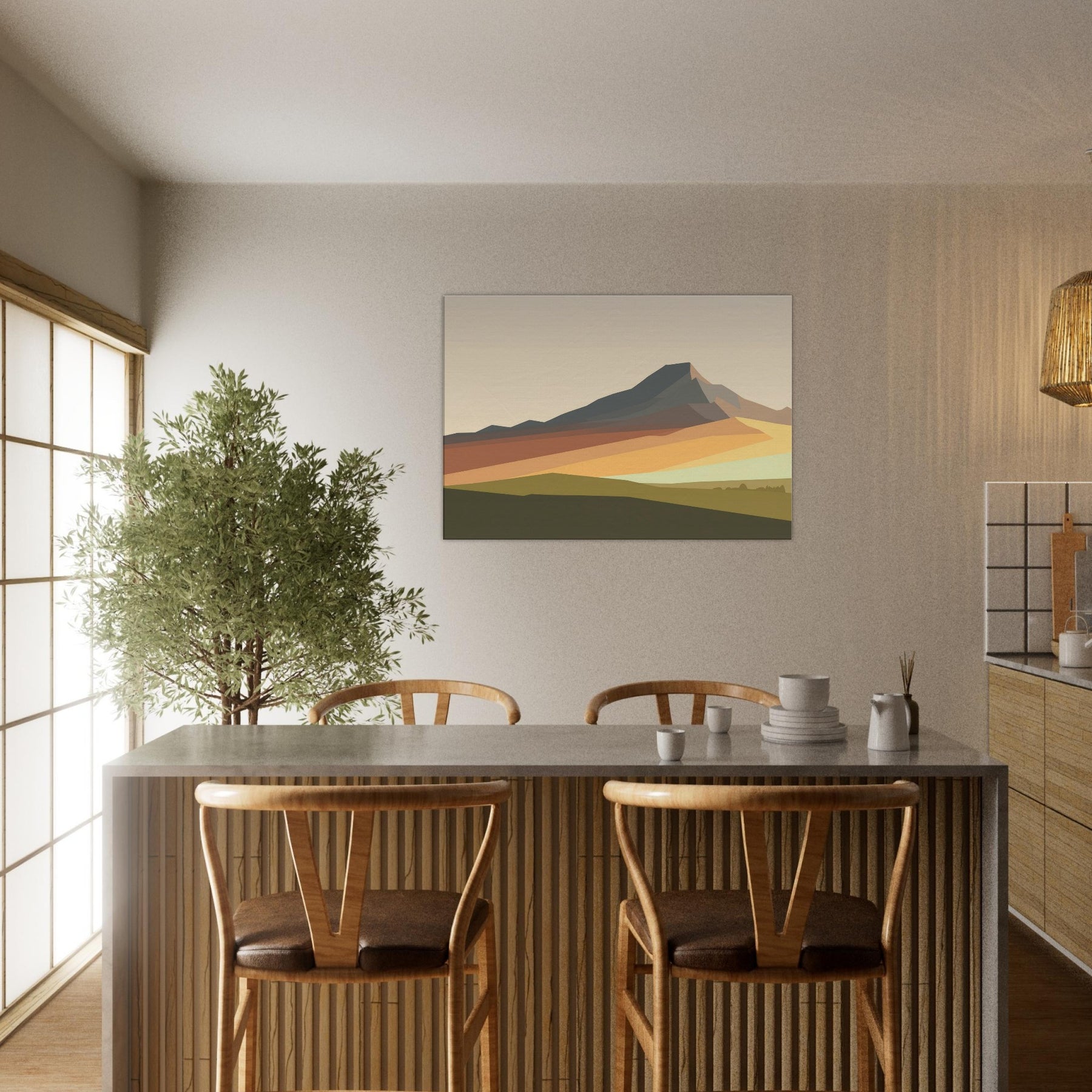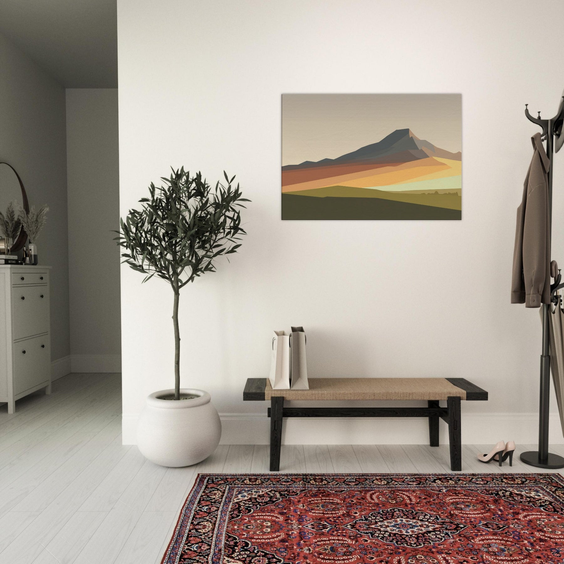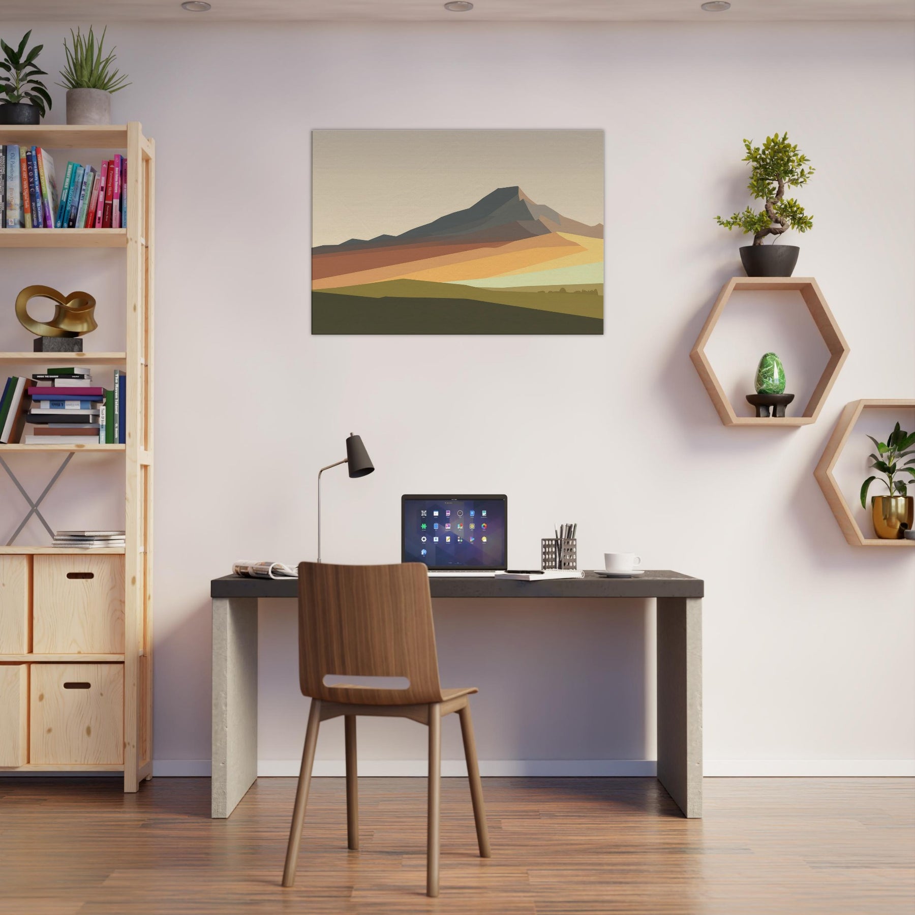 Dawn lit hills unfurl in soft bands of color, inviting quiet contemplation. Rainbow Minimal breathes nature’s gentleness into any room, a pared down vista that never feels spare. The composition glides like a calm breeze across a sunlit valley, blending warm ochres with cool slate and pale mint. It elevates living spaces with a serene aura, inviting restful focus at a desk or dining table. Hang it where daylight lingers it will glow, grounding bright walls with quiet, expansive atmosphere.