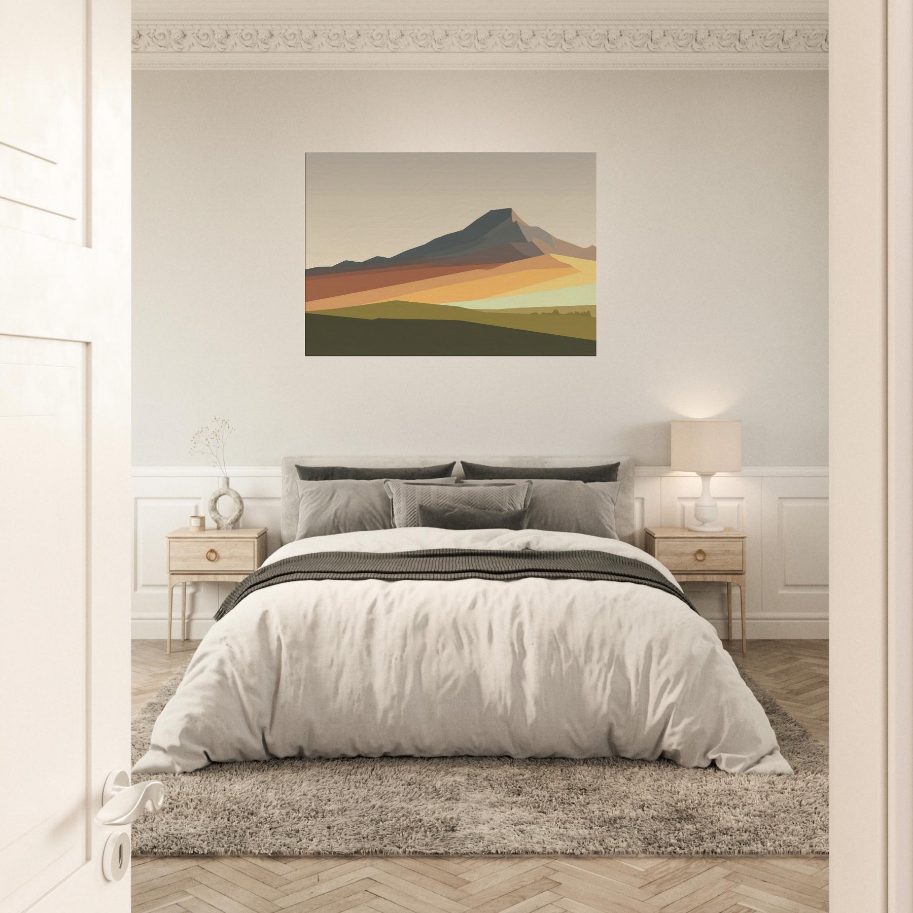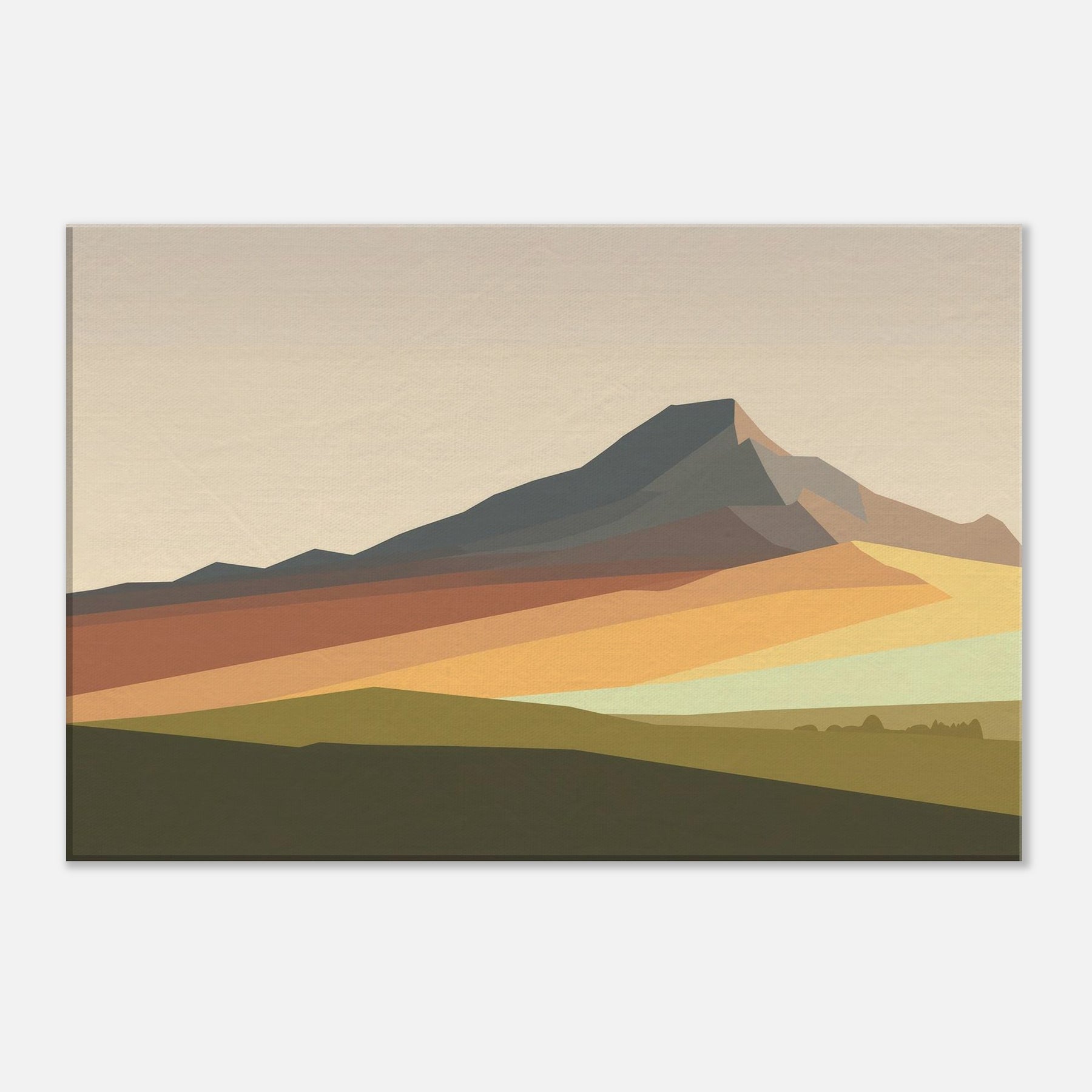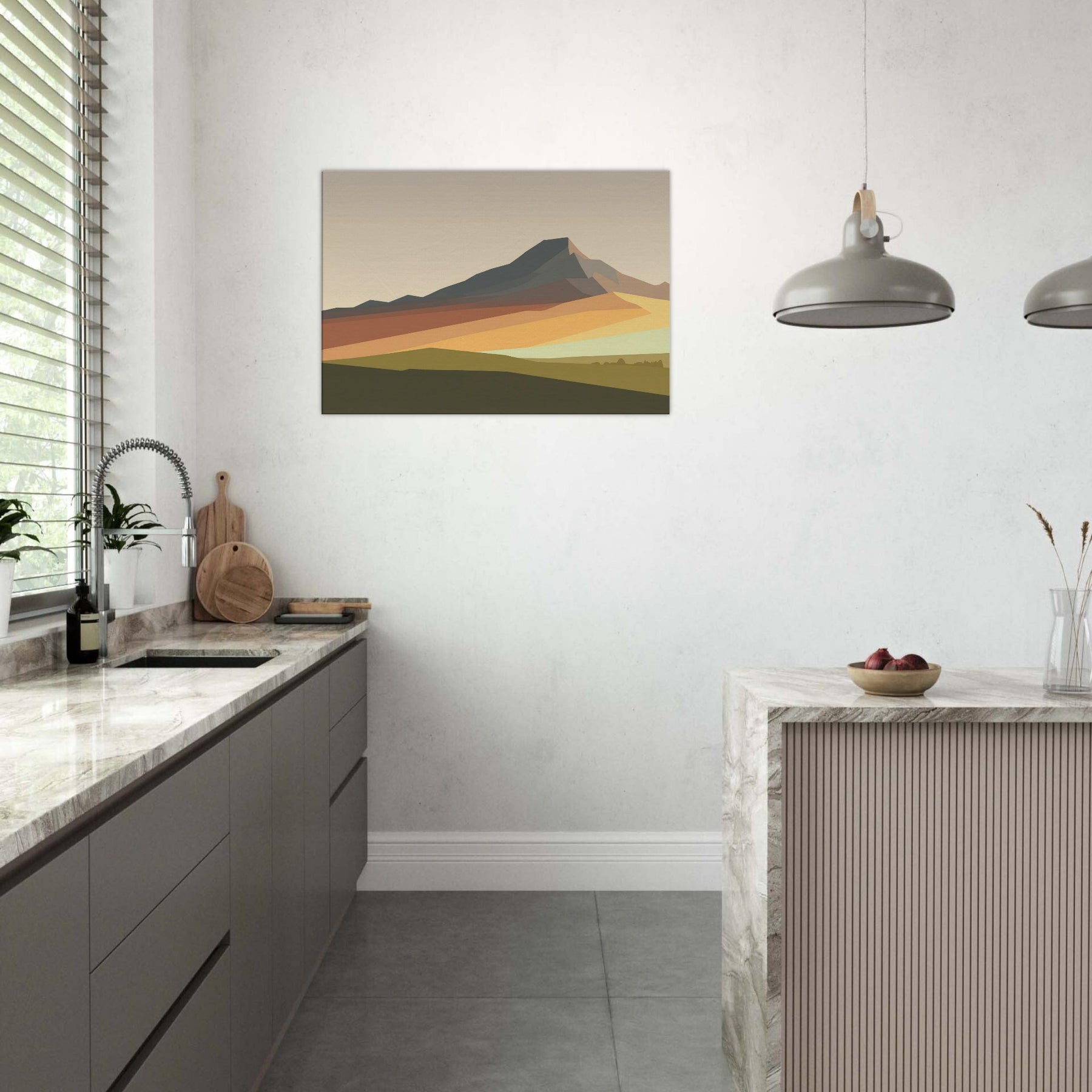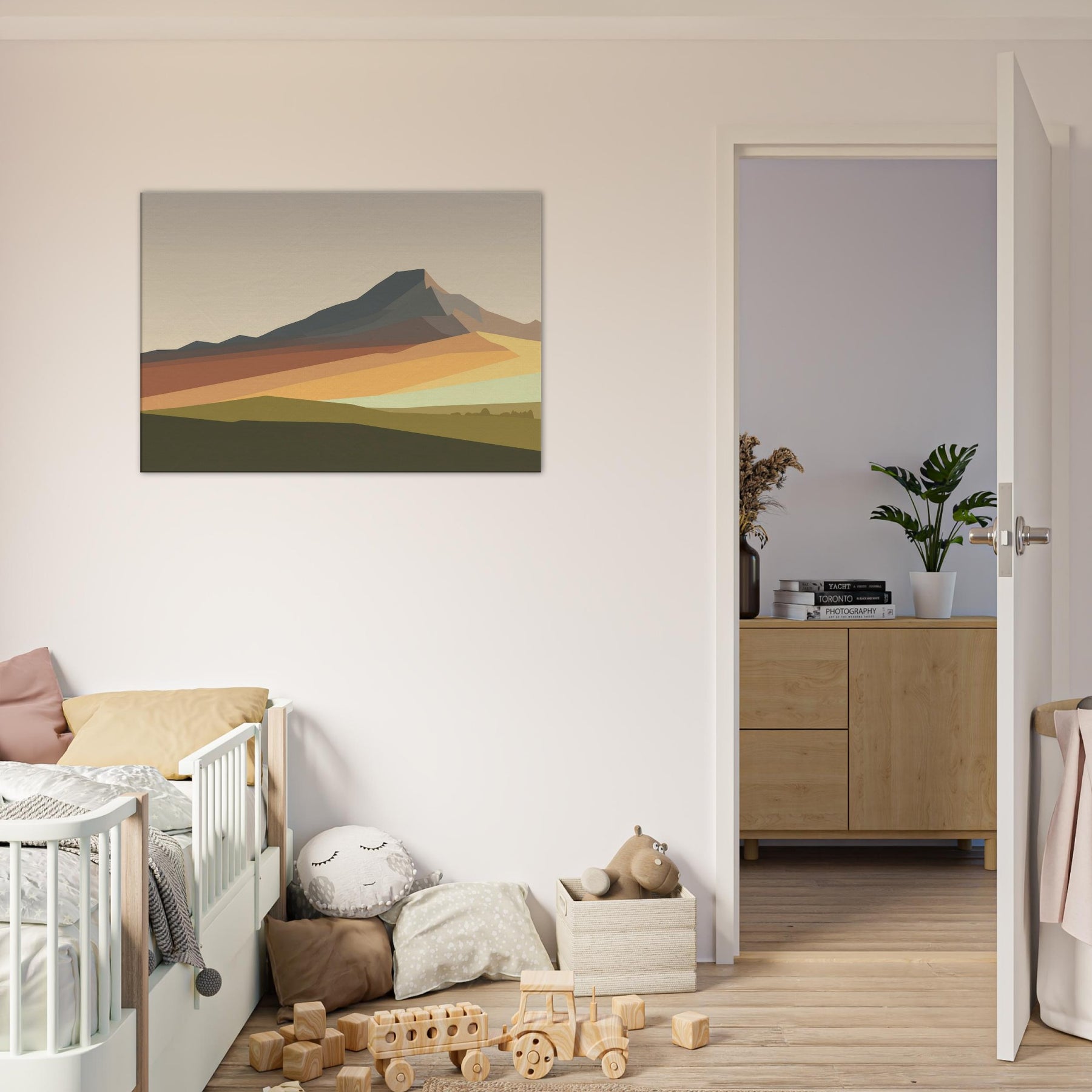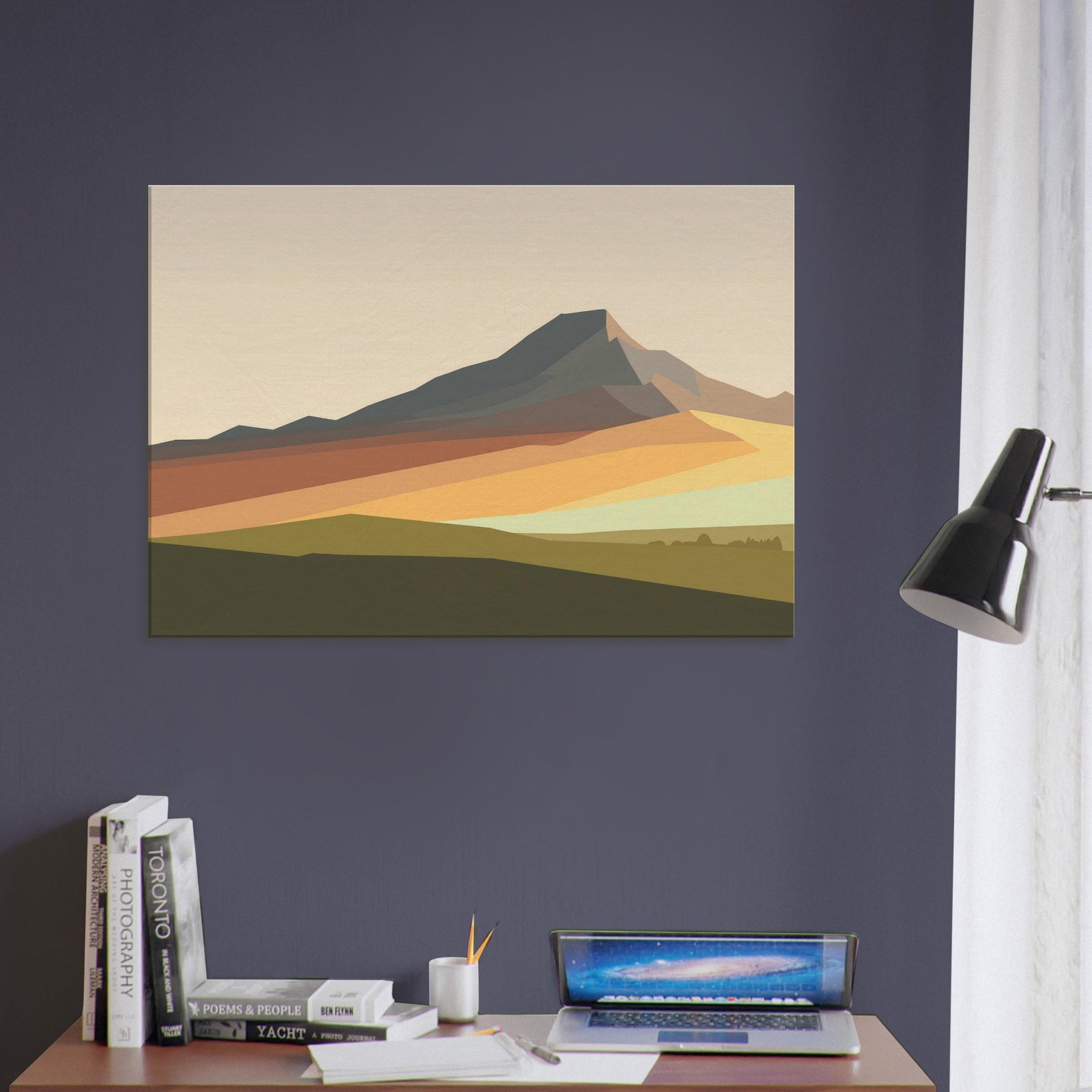 Dawn lit hills unfurl in soft bands of color, inviting quiet contemplation. Rainbow Minimal breathes nature’s gentleness into any room, a pared down vista that never feels spare. The composition glides like a calm breeze across a sunlit valley, blending warm ochres with cool slate and pale mint. It elevates living spaces with a serene aura, inviting restful focus at a desk or dining table. Hang it where daylight lingers it will glow, grounding bright walls with quiet, expansive atmosphere.