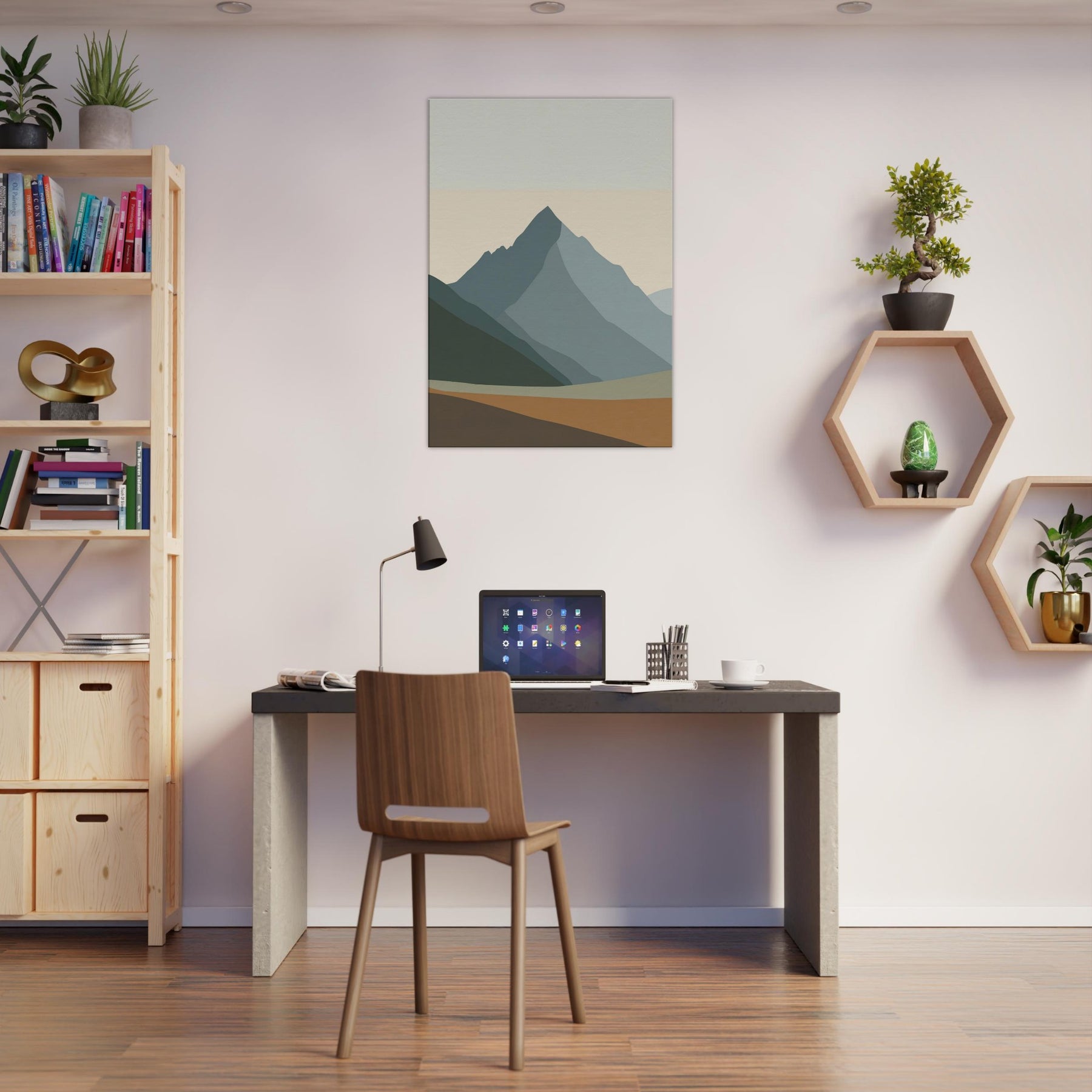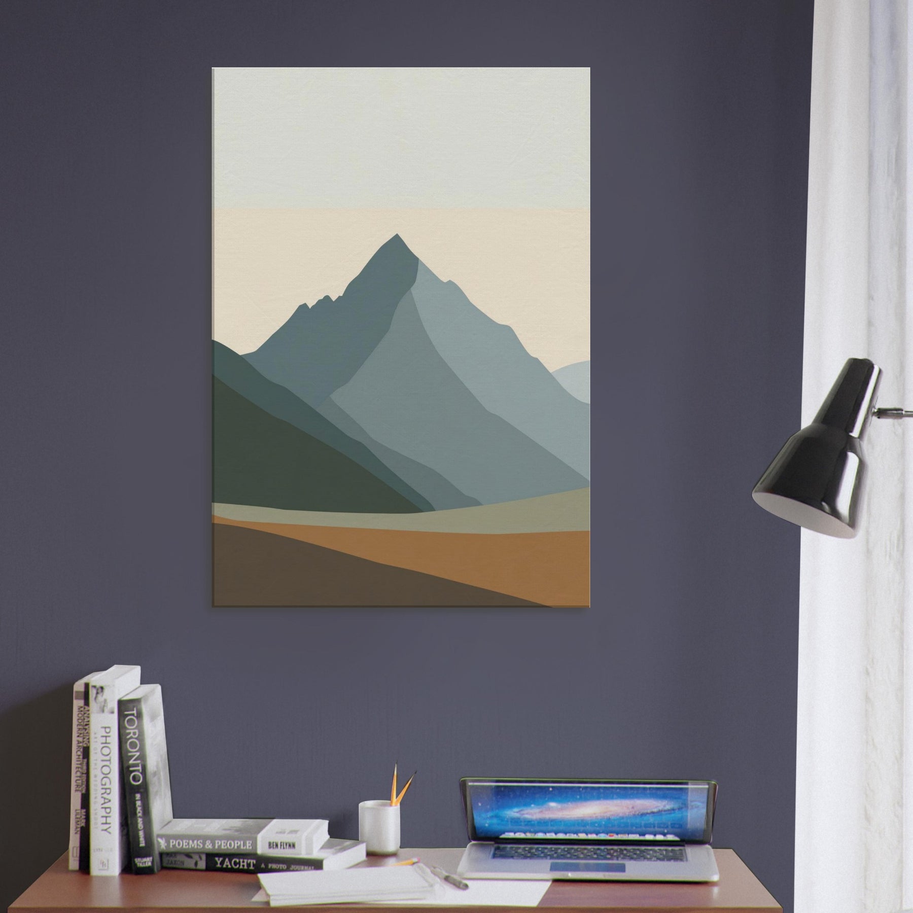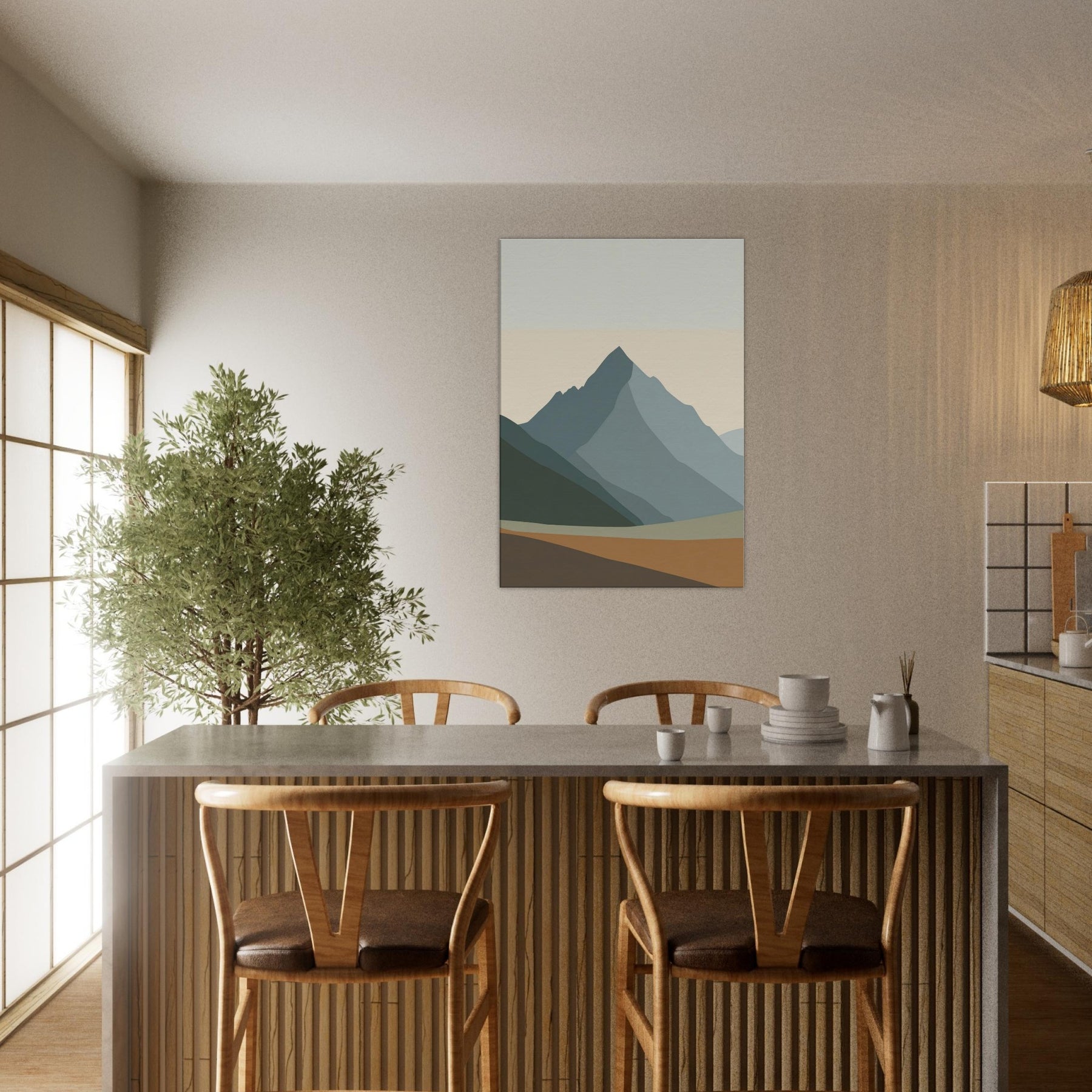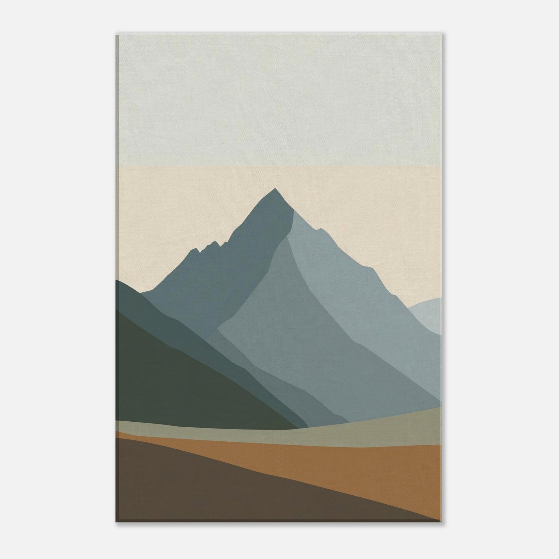 Rainbow Minimal invites a hush of color into the room. This minimalist unfolds as layered mountain silhouettes in soft greens, blues, and apricot, creating a calm horizon you can step into with your eyes. The atmosphere feels serene and uplifting, like dawn pausing to breathe. Hung above the sofa or in a studio nook, it softens light, anchors the space, and echoes nature's quiet rhythm. Rainbow Minimal becomes a subtle, elegant focal point for daily life.