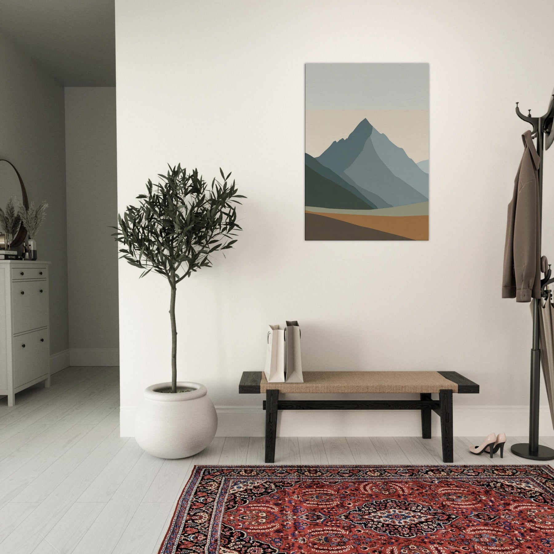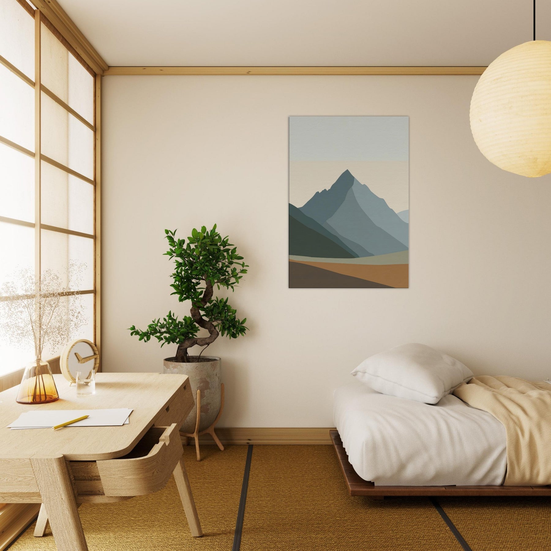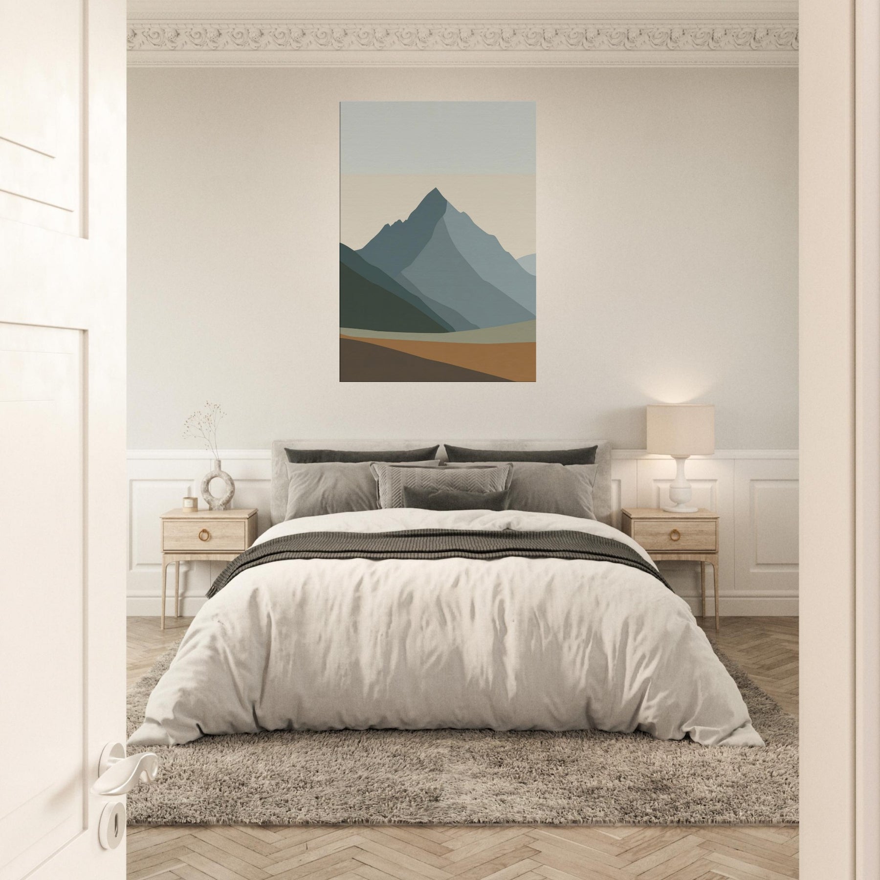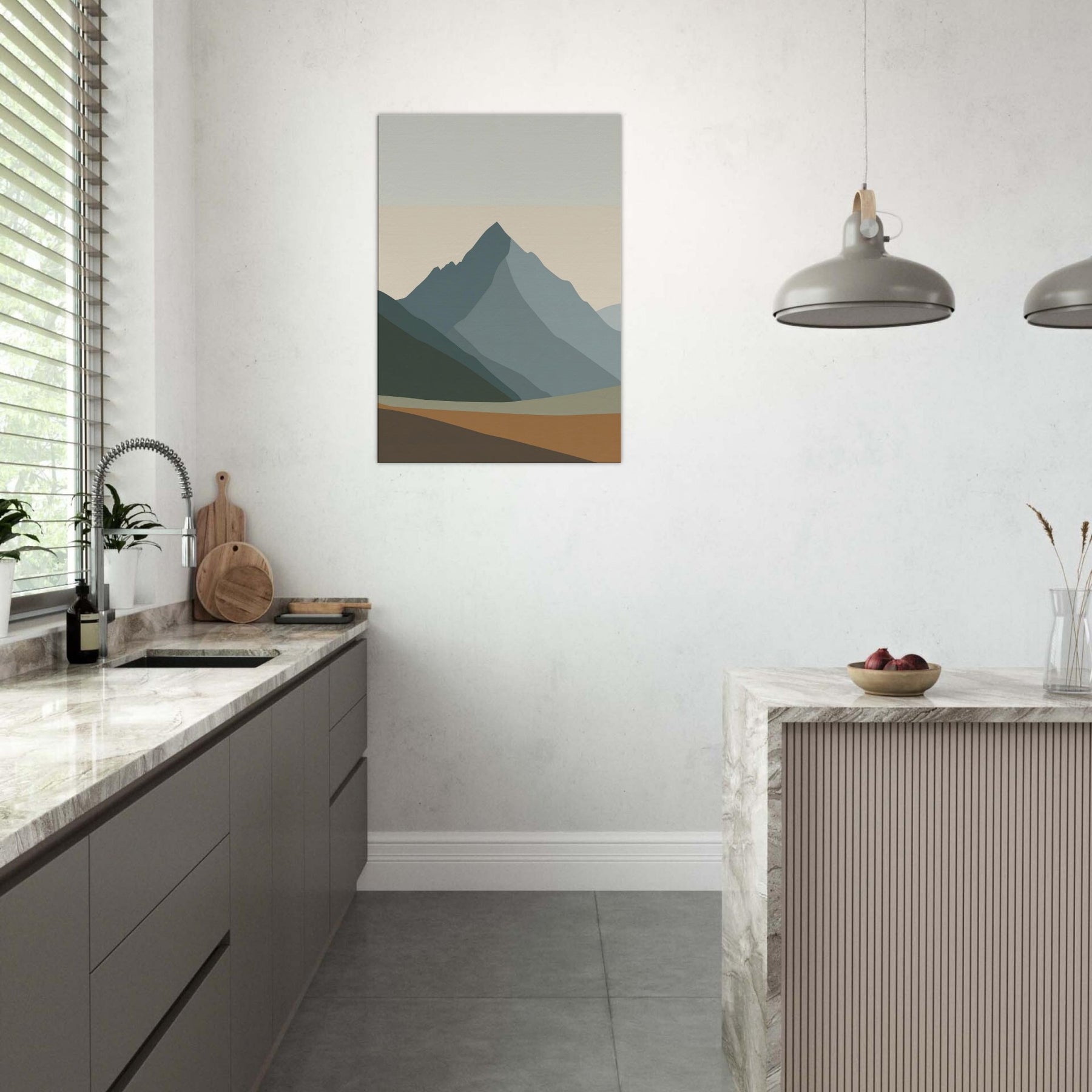 Rainbow Minimal invites a hush of color into the room. This minimalist unfolds as layered mountain silhouettes in soft greens, blues, and apricot, creating a calm horizon you can step into with your eyes. The atmosphere feels serene and uplifting, like dawn pausing to breathe. Hung above the sofa or in a studio nook, it softens light, anchors the space, and echoes nature's quiet rhythm. Rainbow Minimal becomes a subtle, elegant focal point for daily life.