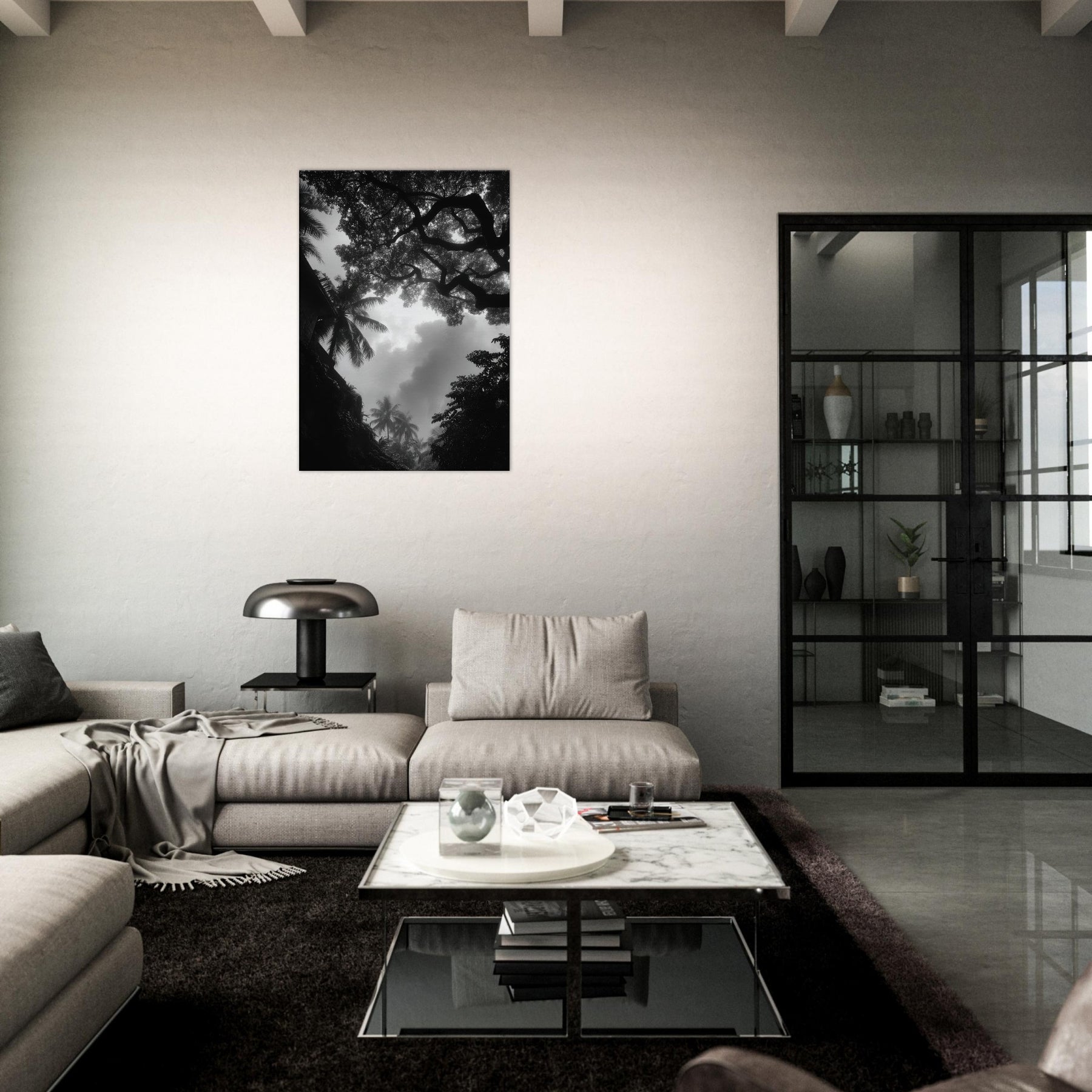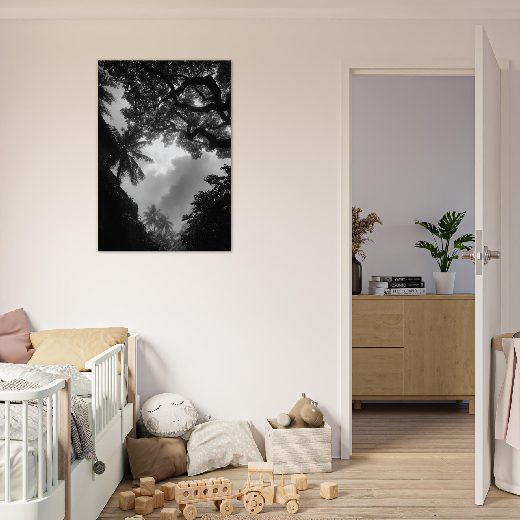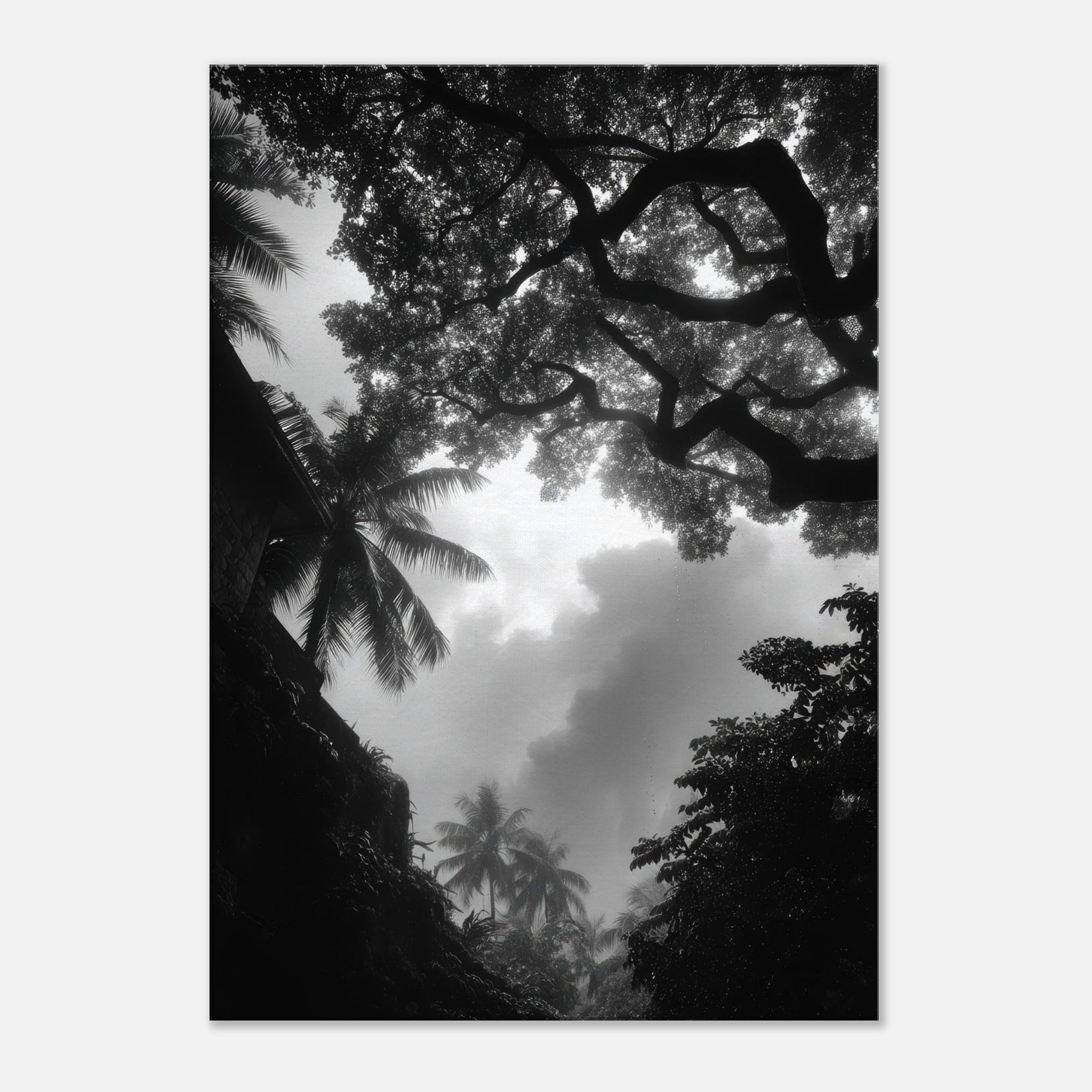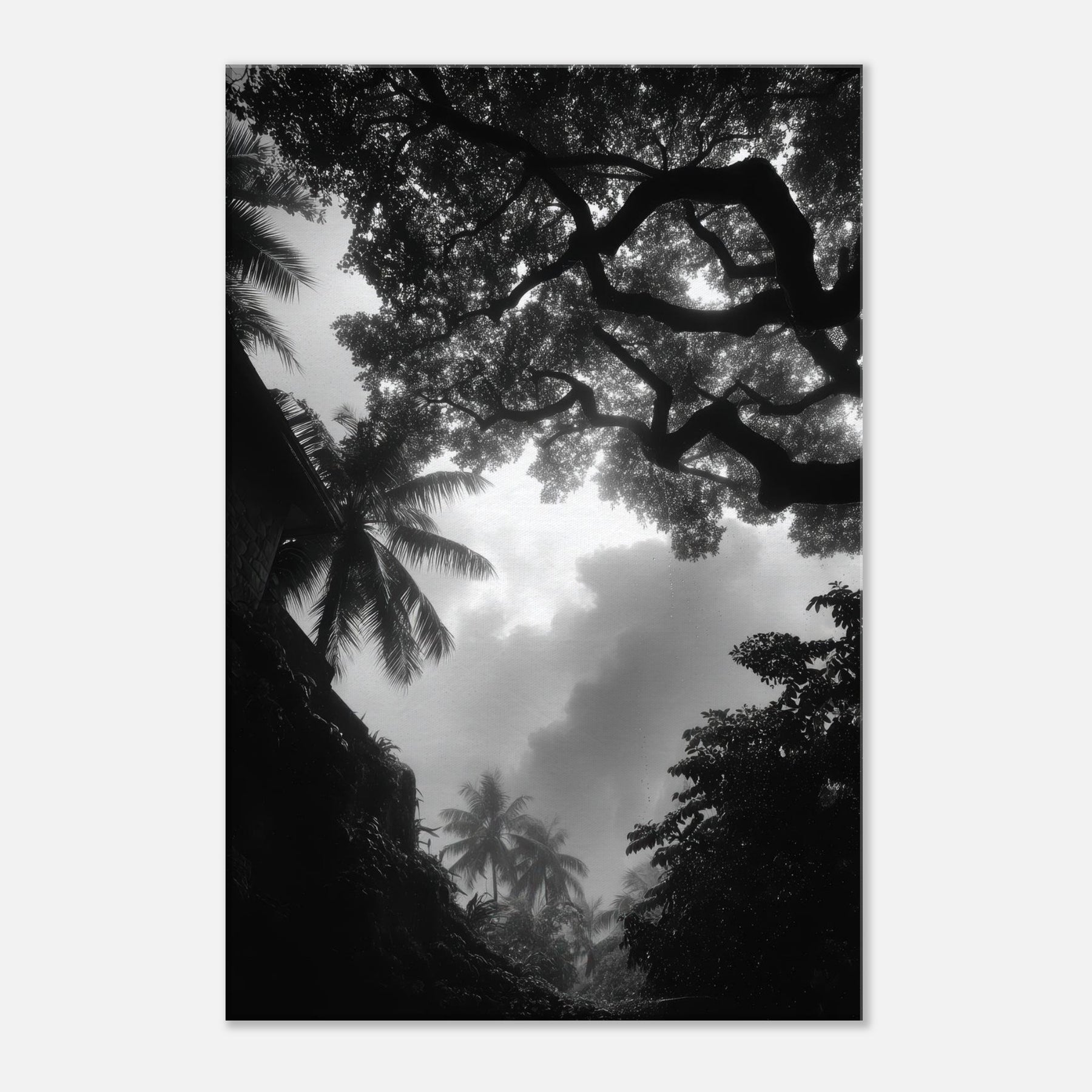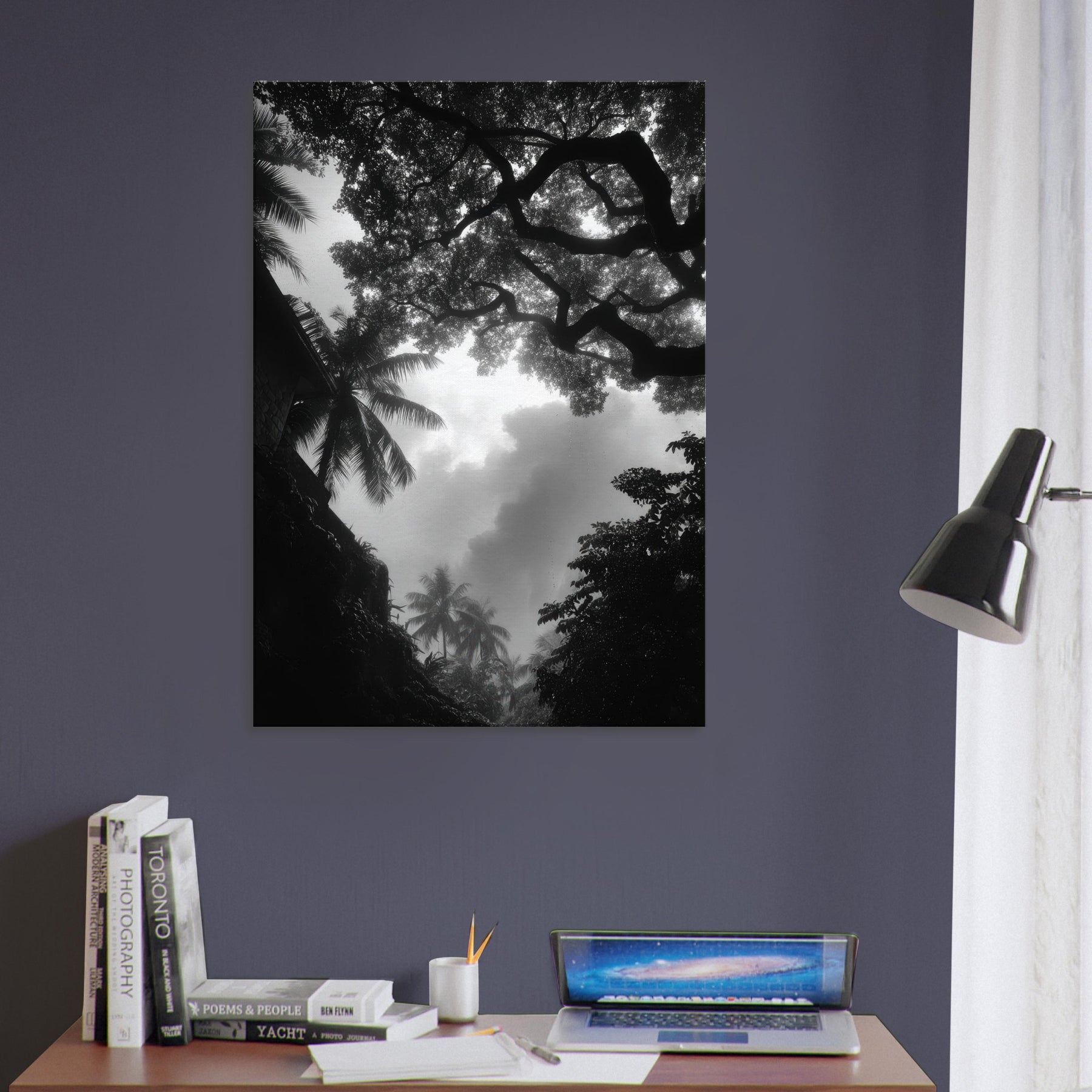 Let Tropical Rain settle over your space in a hush of monochrome. This black and white composition captures rain slick leaves, looming branches, and a misted horizon, inviting the eye to wander as if you stood beneath a cavernous canopy. The quiet drama adds mood and depth to any living area soothing the walls with rhythm, height, and a touch of nature’s mystery. Hang it where you seek calm and creative reflection after day’s bustle.