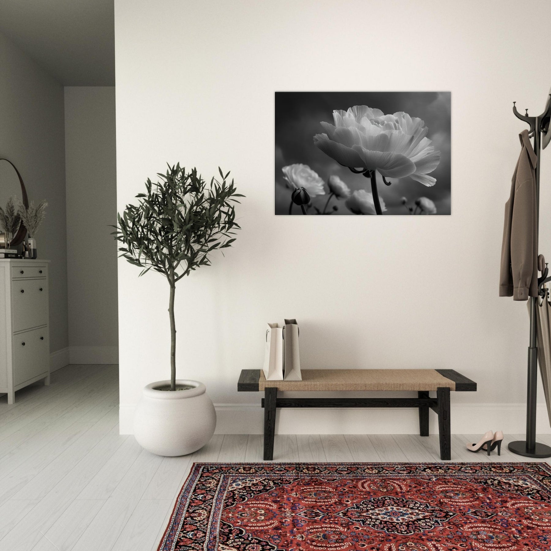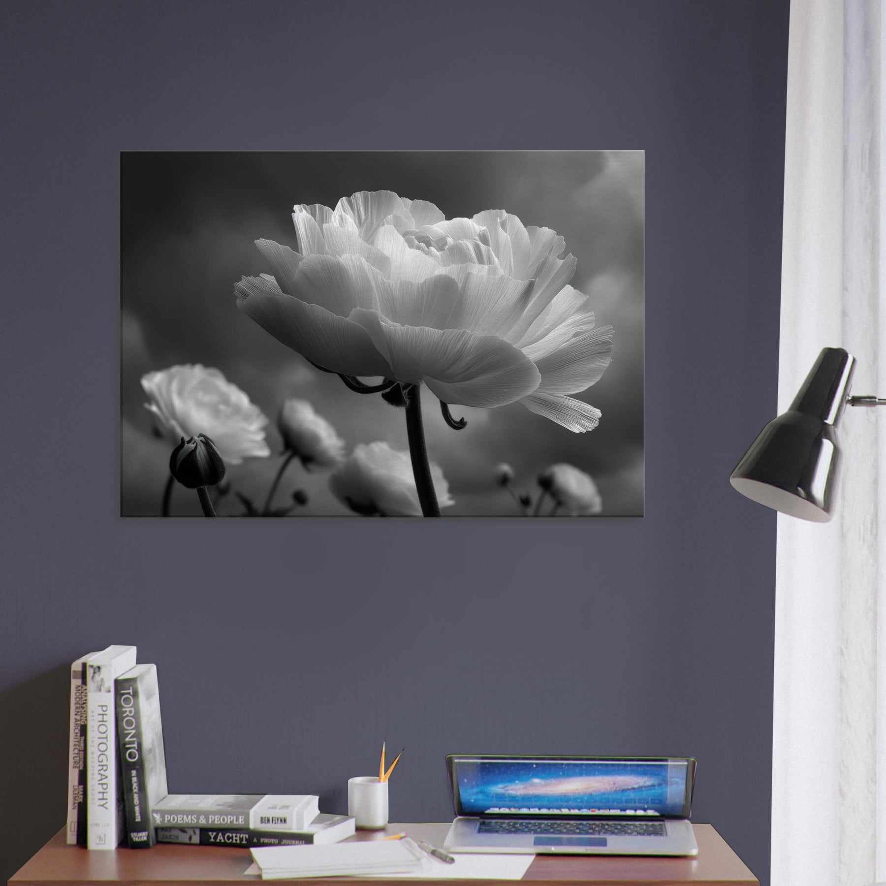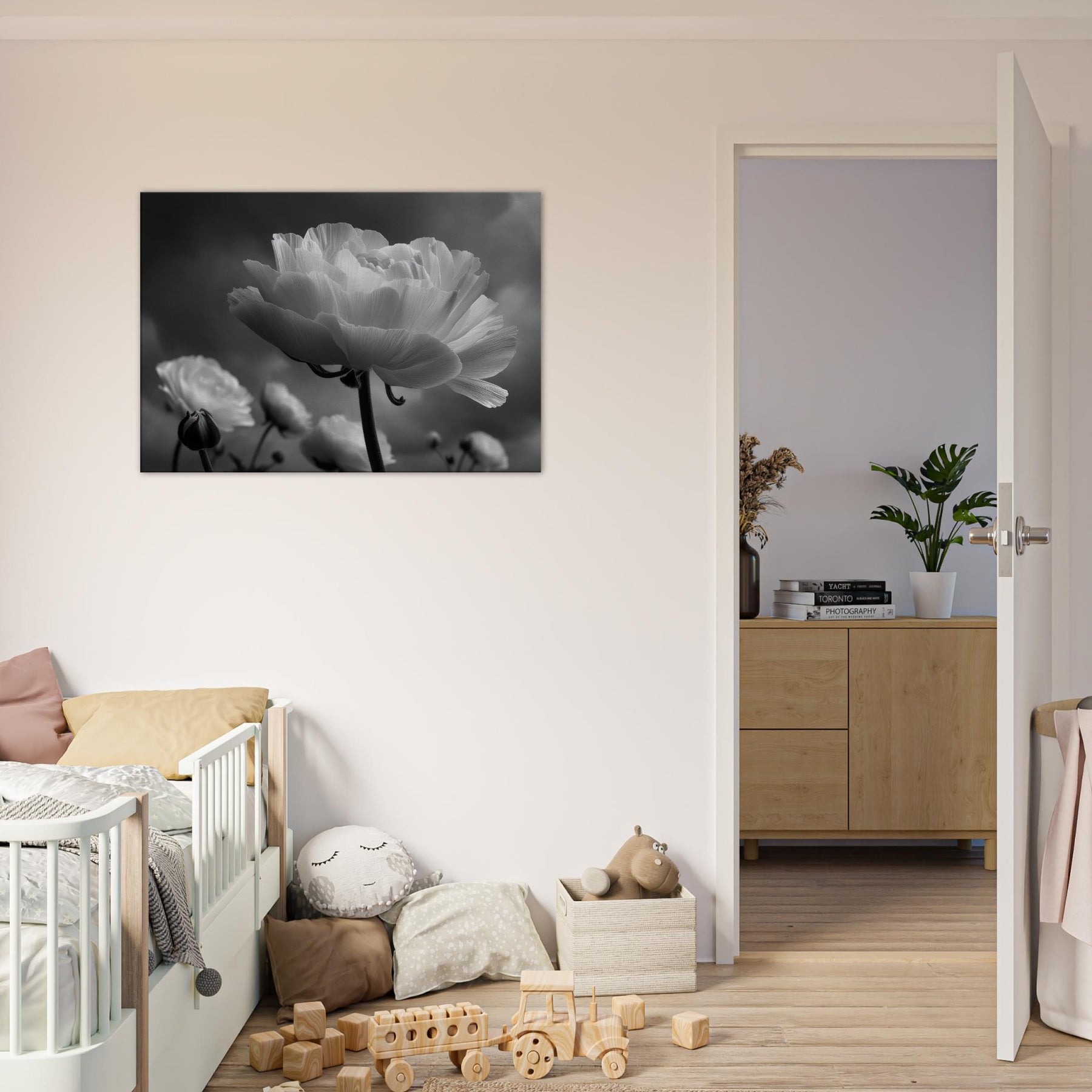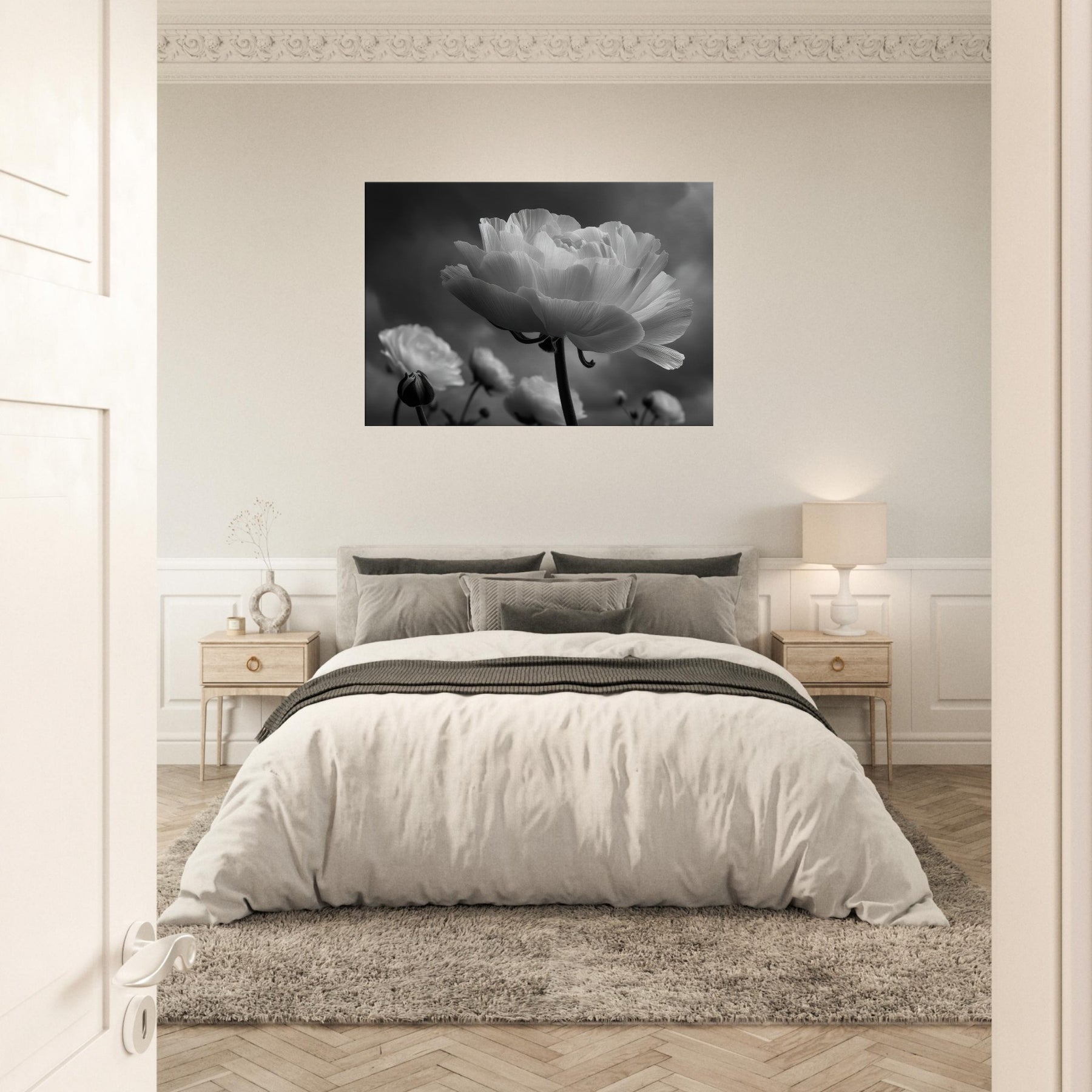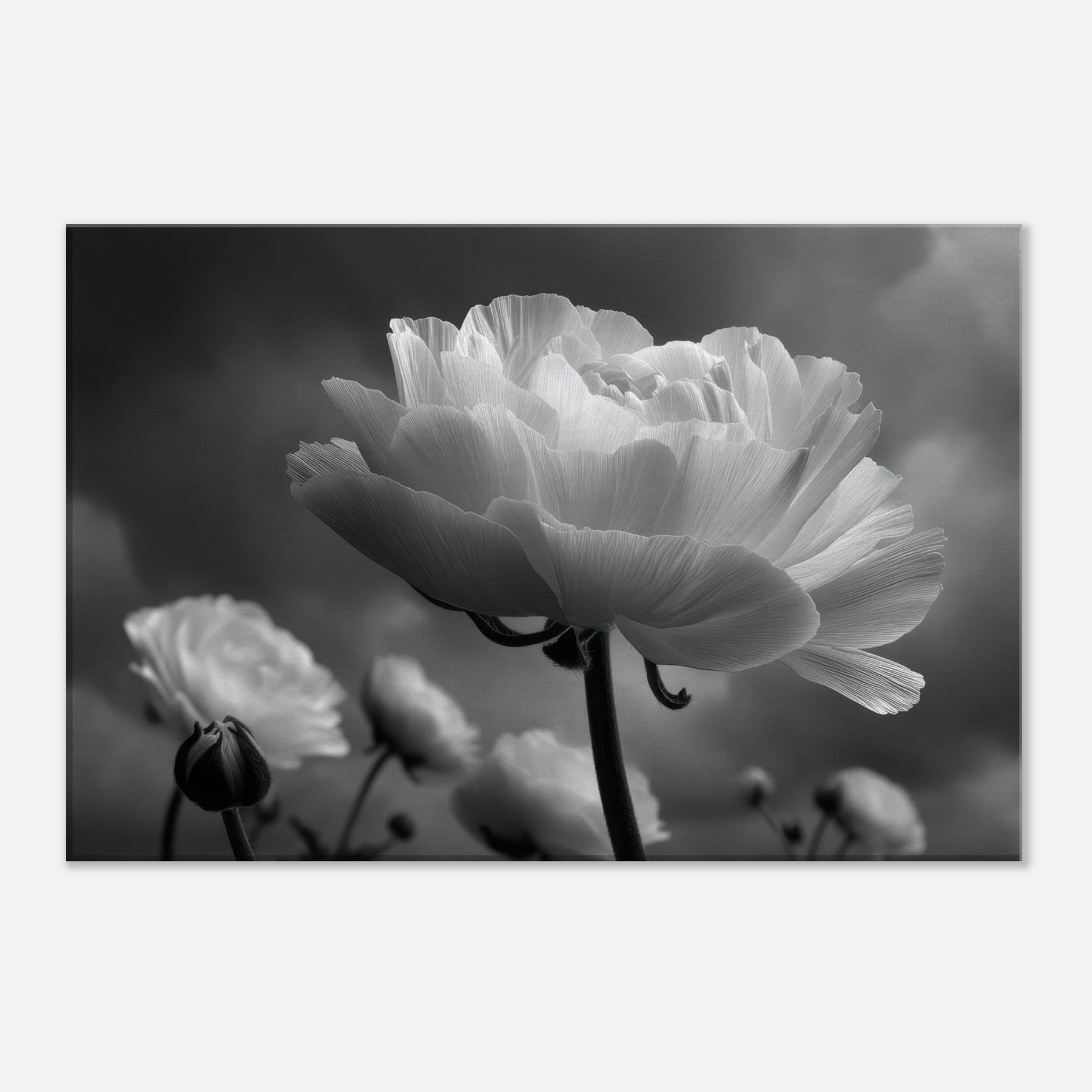 Immerse your room in the quiet drama of Ranunculus, captured in luminous blacks and whites.