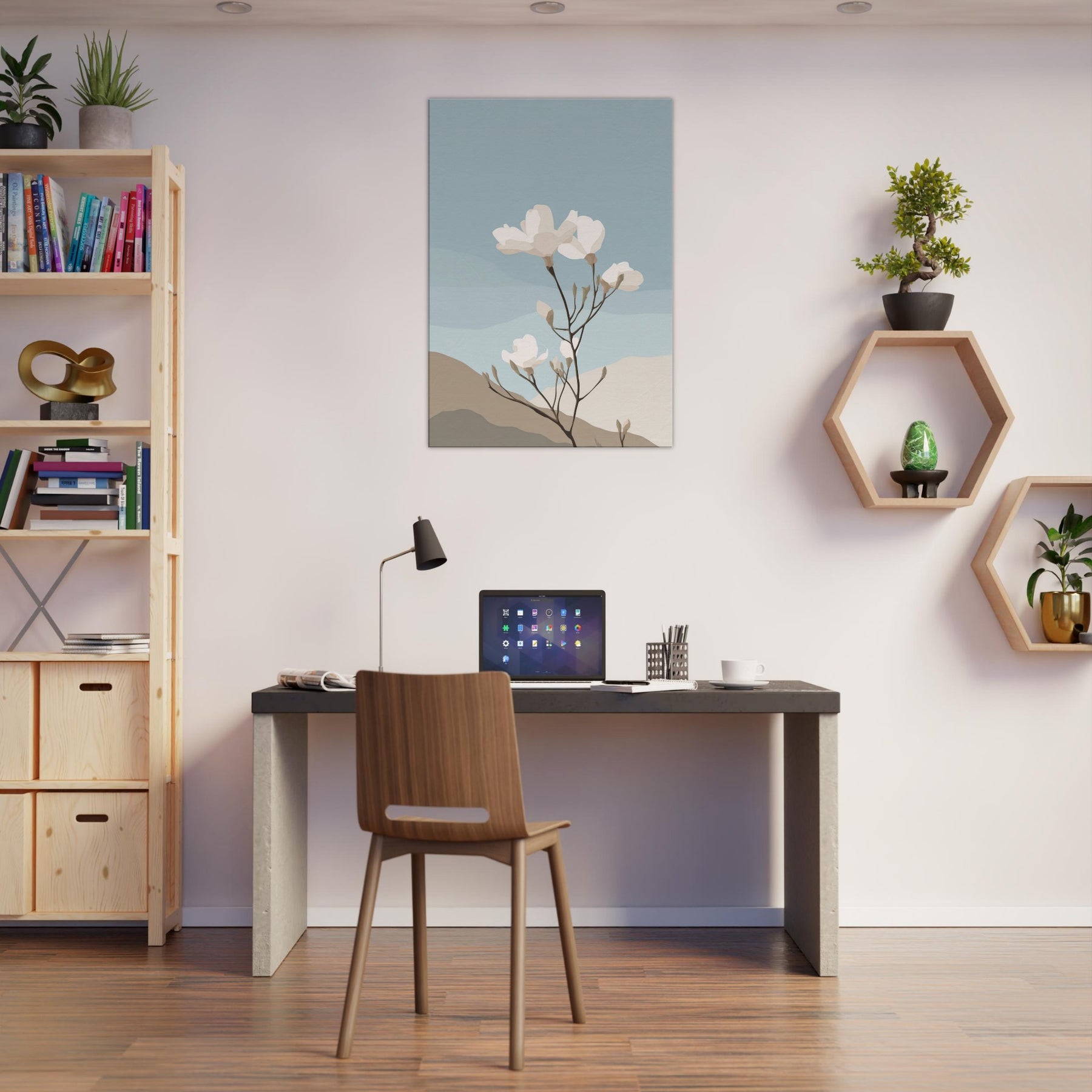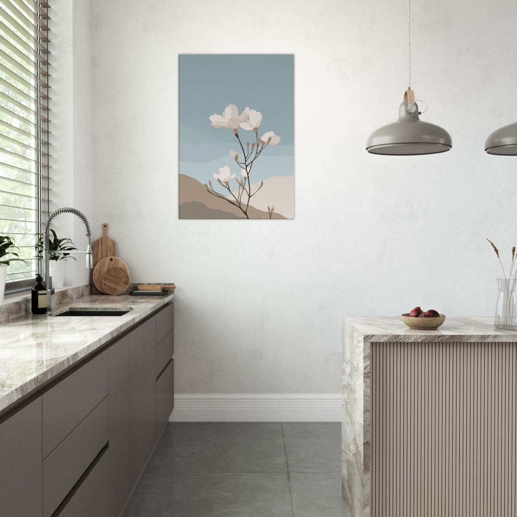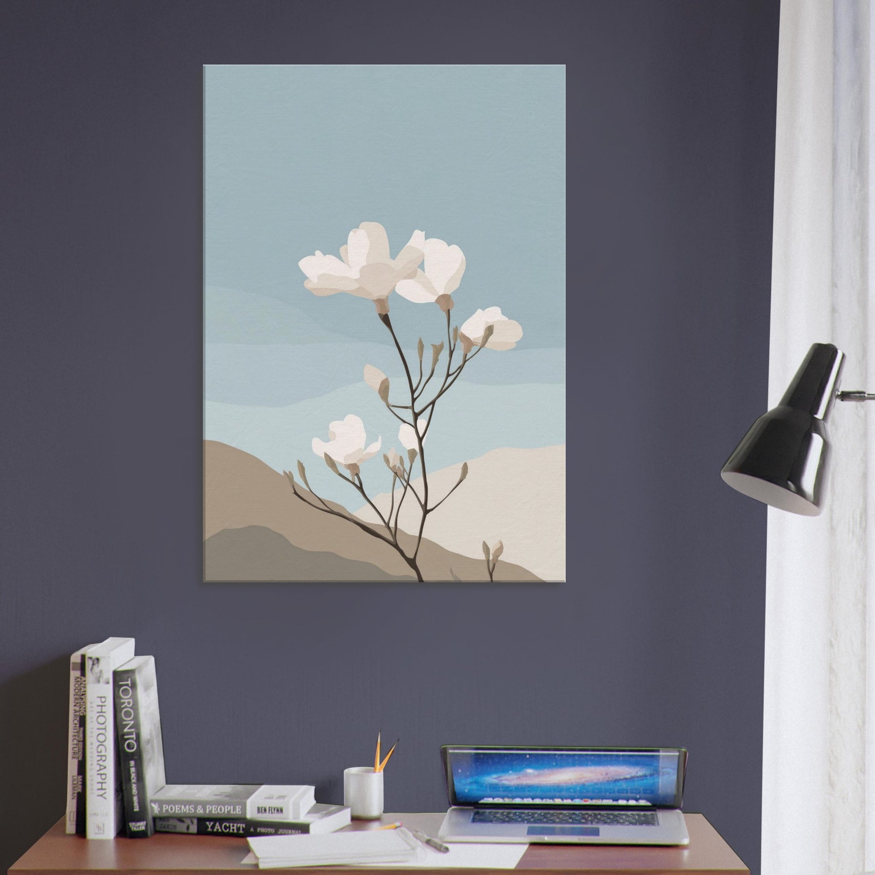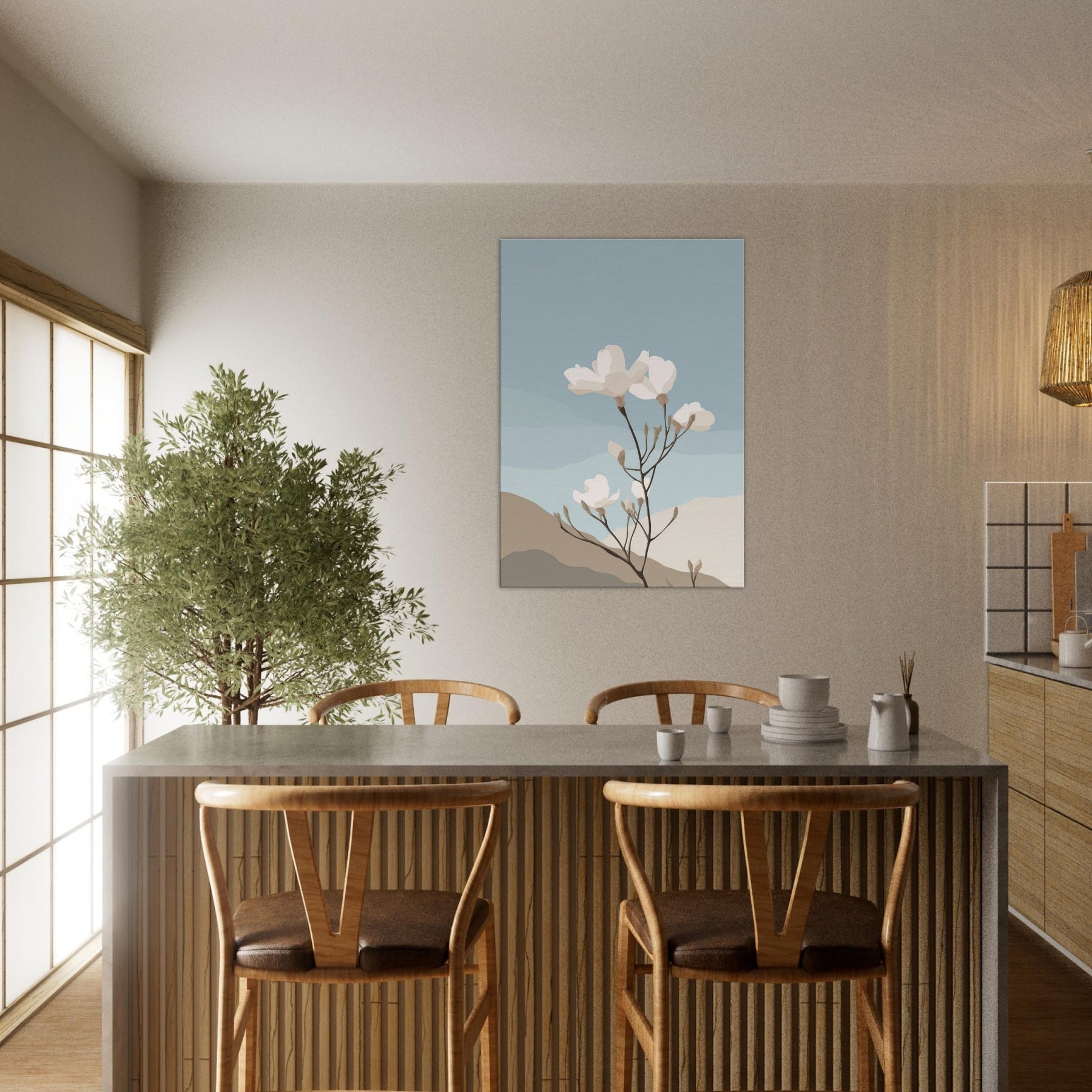 This piece centers on a Sakura Branch, its pale blossoms unfurling against a quiet sky. The minimalist composition invites the eye to travel along slender, charcoal stems and airy petals, creating a sense of breath and stillness. Bathed in soft blues and warm creams, it threads serenity through a room, merging nature with modern living. Hang it where light lingers above a sofa, a desk, or a bedside vignette and let the gentle arc of the branch calm conversation and elevate everyday moments with subtle elegance.