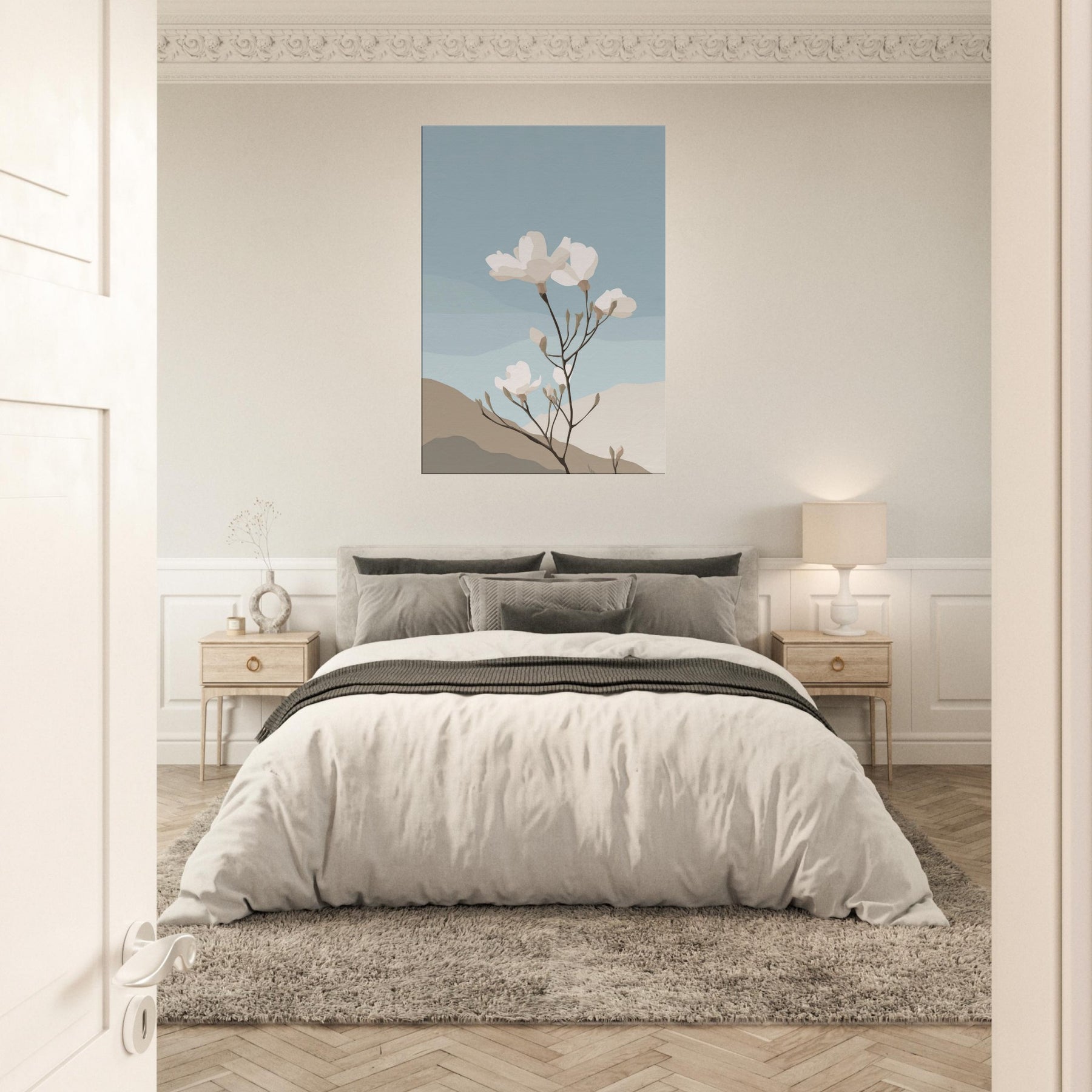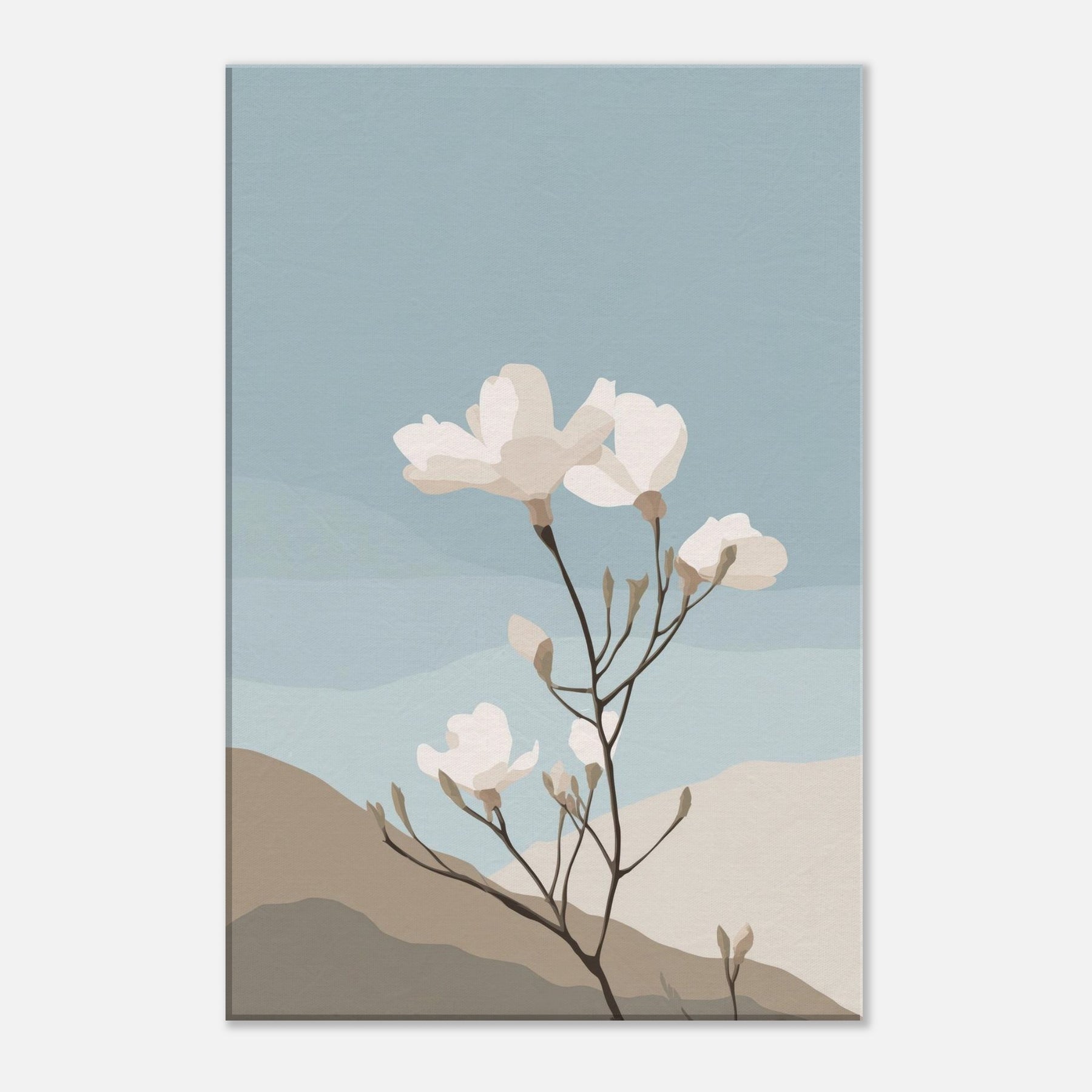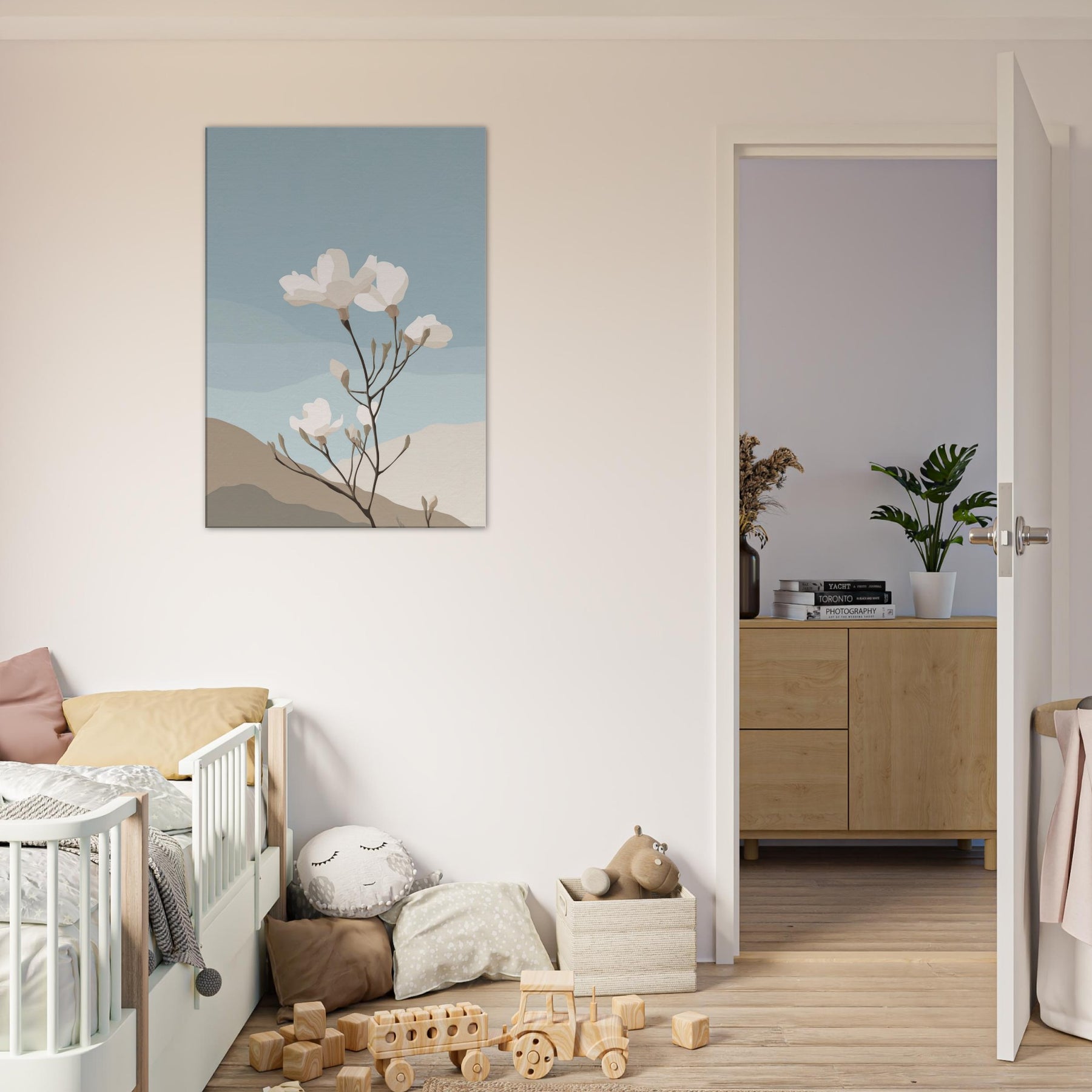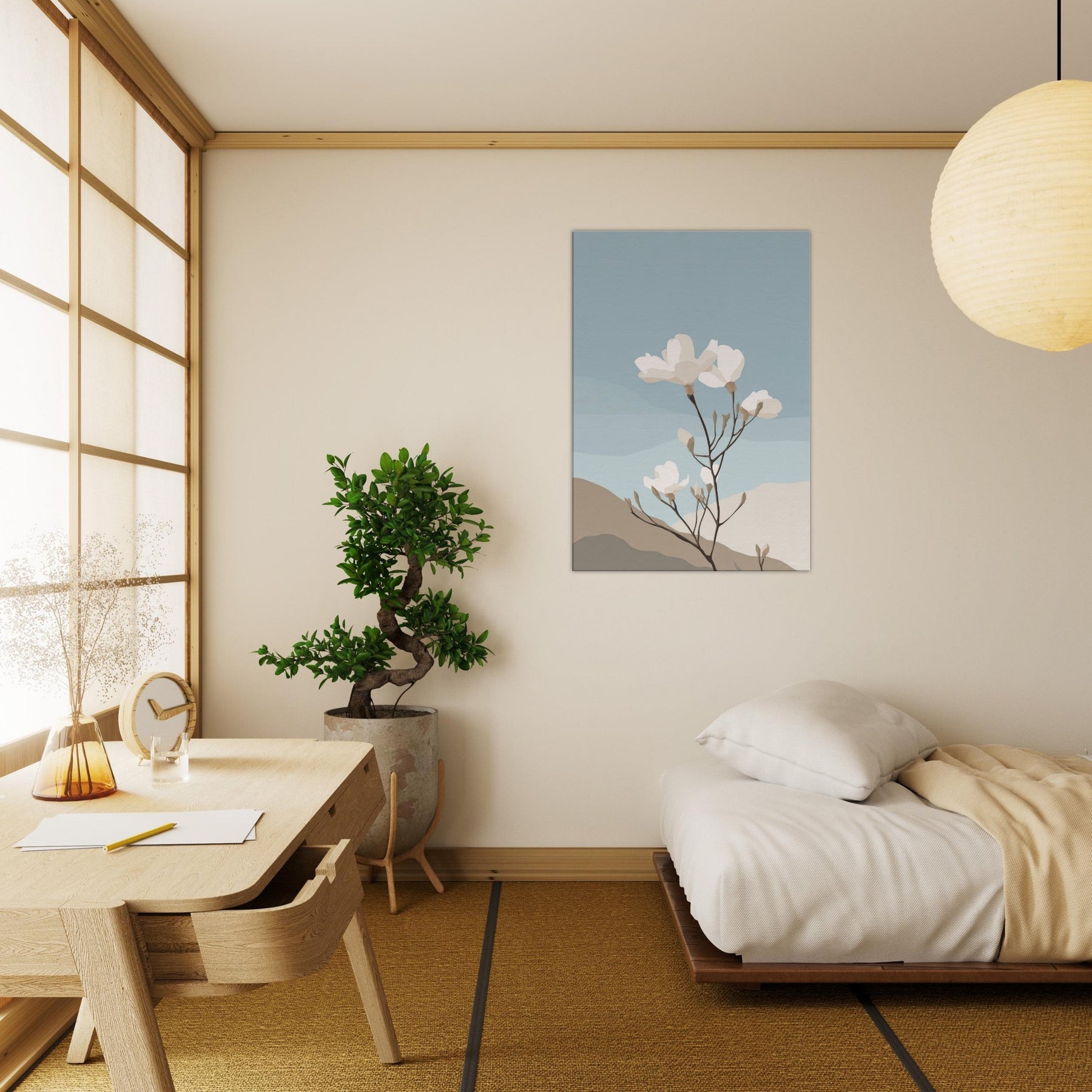 This piece centers on a Sakura Branch, its pale blossoms unfurling against a quiet sky. The minimalist composition invites the eye to travel along slender, charcoal stems and airy petals, creating a sense of breath and stillness. Bathed in soft blues and warm creams, it threads serenity through a room, merging nature with modern living. Hang it where light lingers above a sofa, a desk, or a bedside vignette and let the gentle arc of the branch calm conversation and elevate everyday moments with subtle elegance.