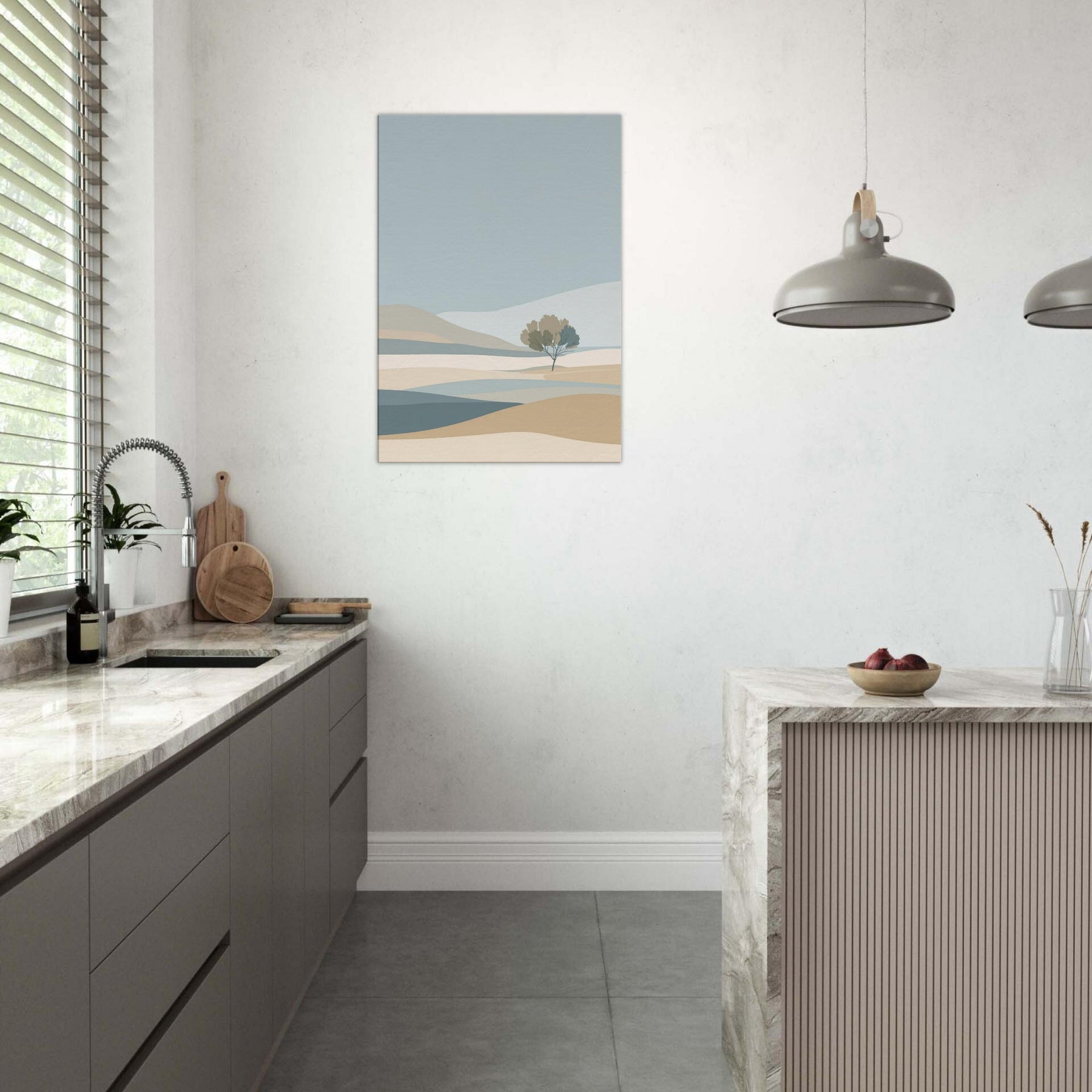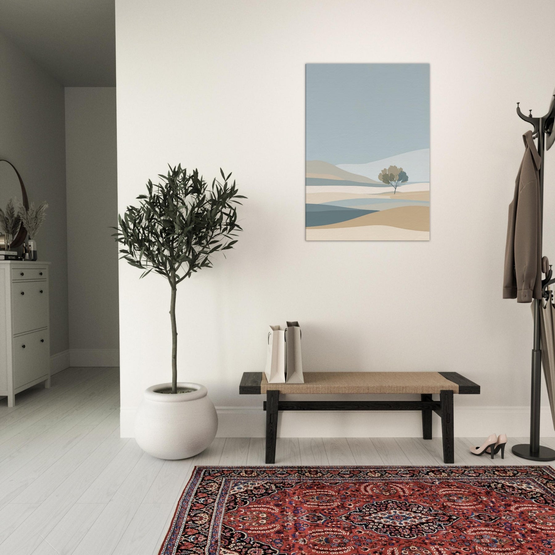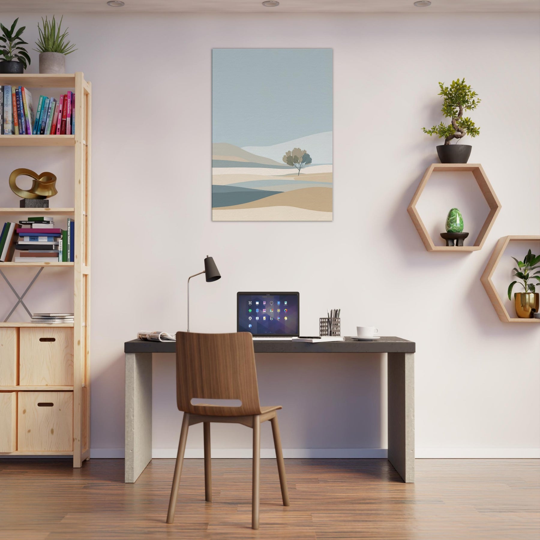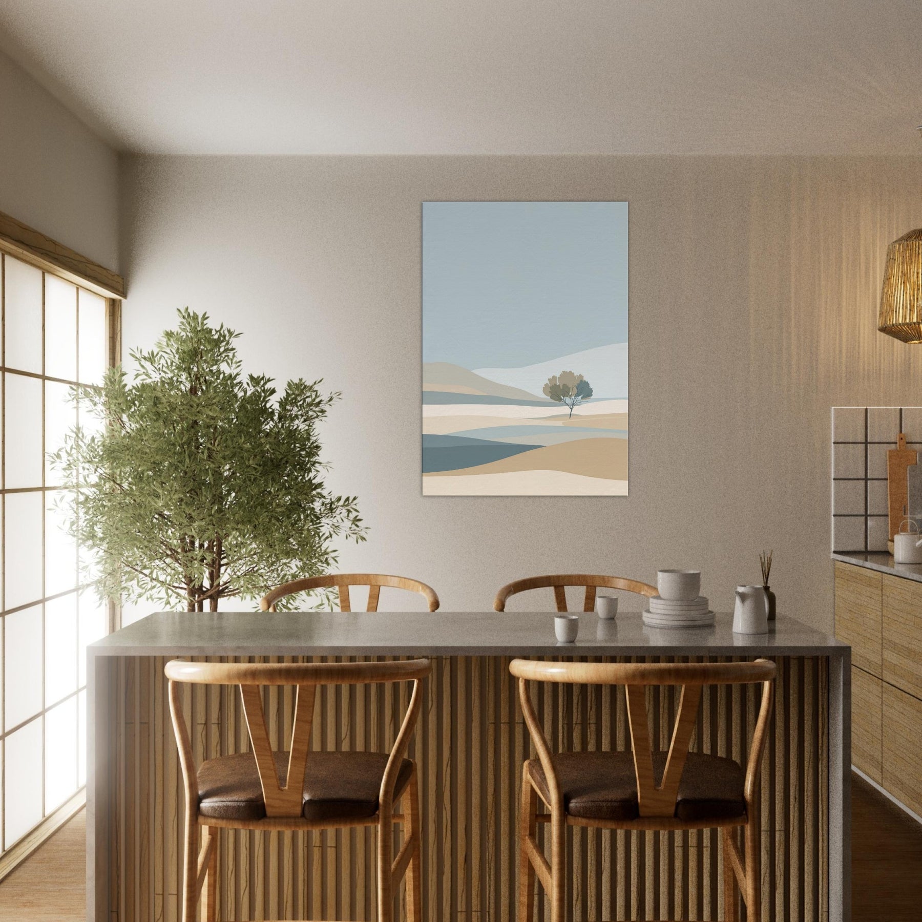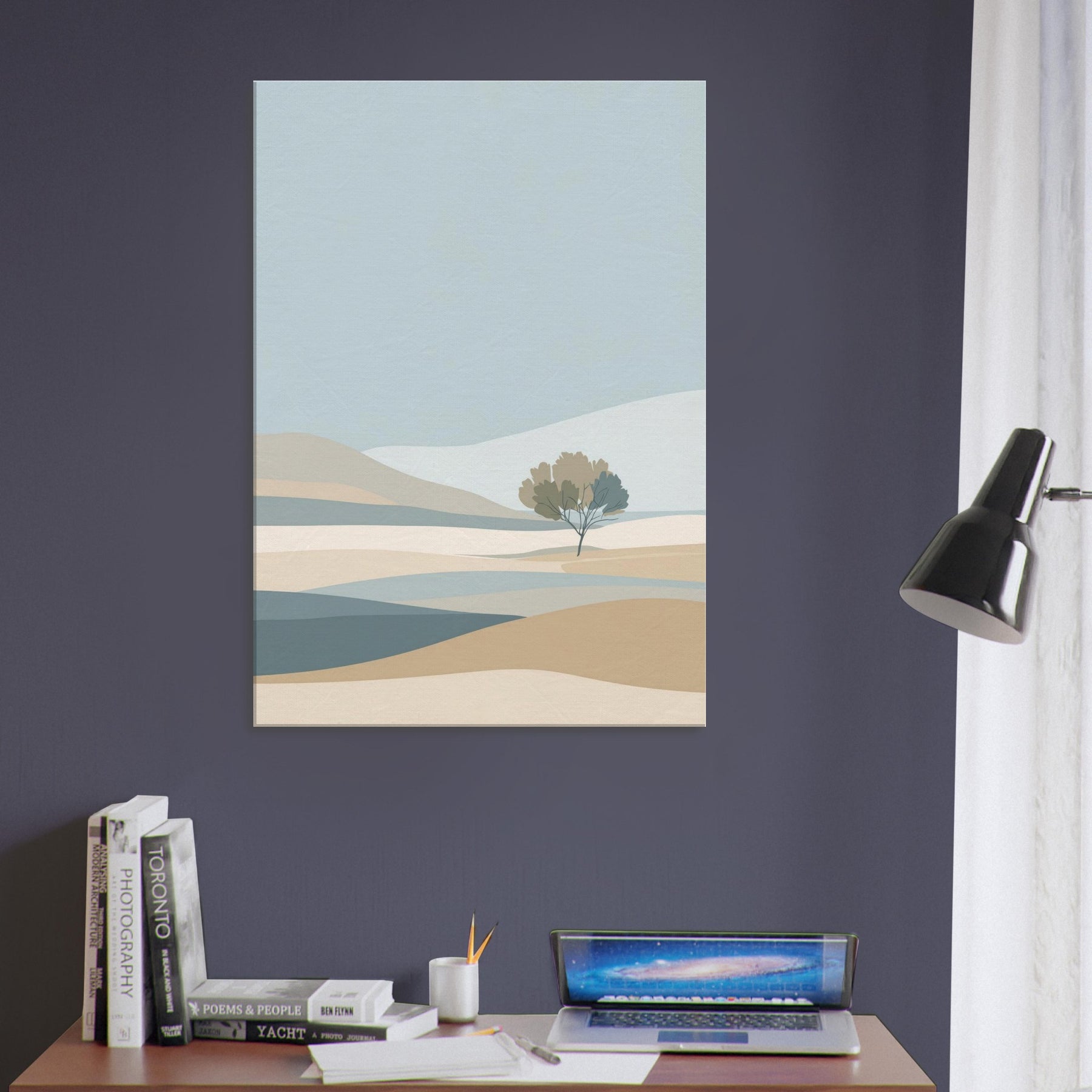 Sandstorm Silence invites the room to breathe with a quiet, expansive horizon. In minimalist tones, soft dunes roll like whispered ombres, and a lone tree stands as a patient witness to the day’s wind. This piece balances symmetry and spaciousness, creating a calm center in any living space. Hang it above a sofa or beside a bedside lamp to cast a cooling, contemplative atmosphere an invitation to pause, reflect, and let the outside world melt into the quiet interior of your home.