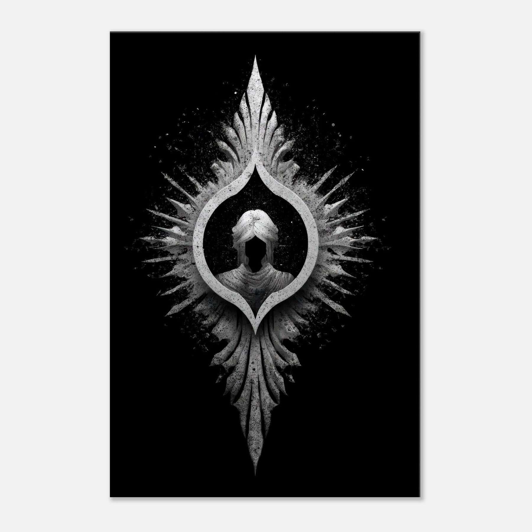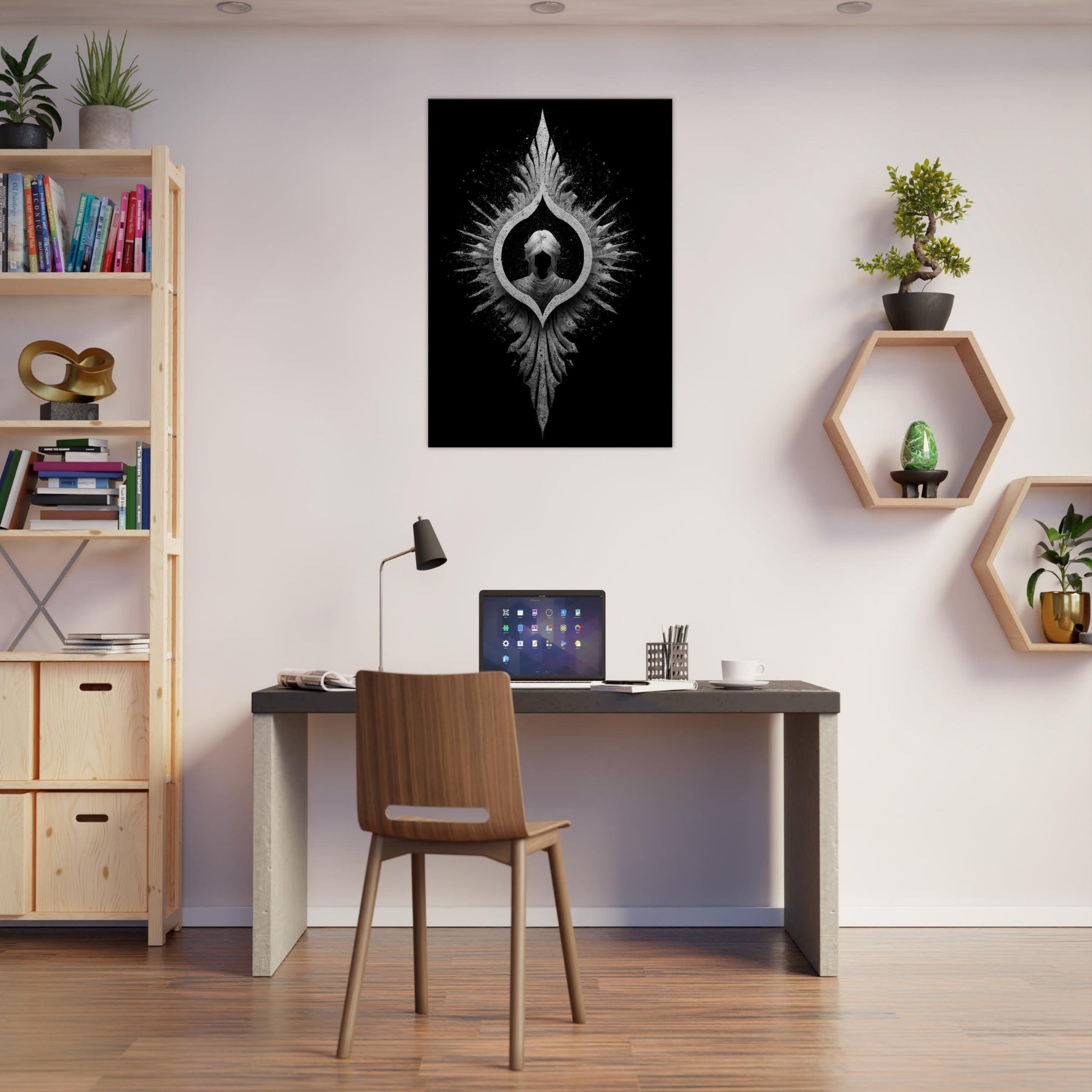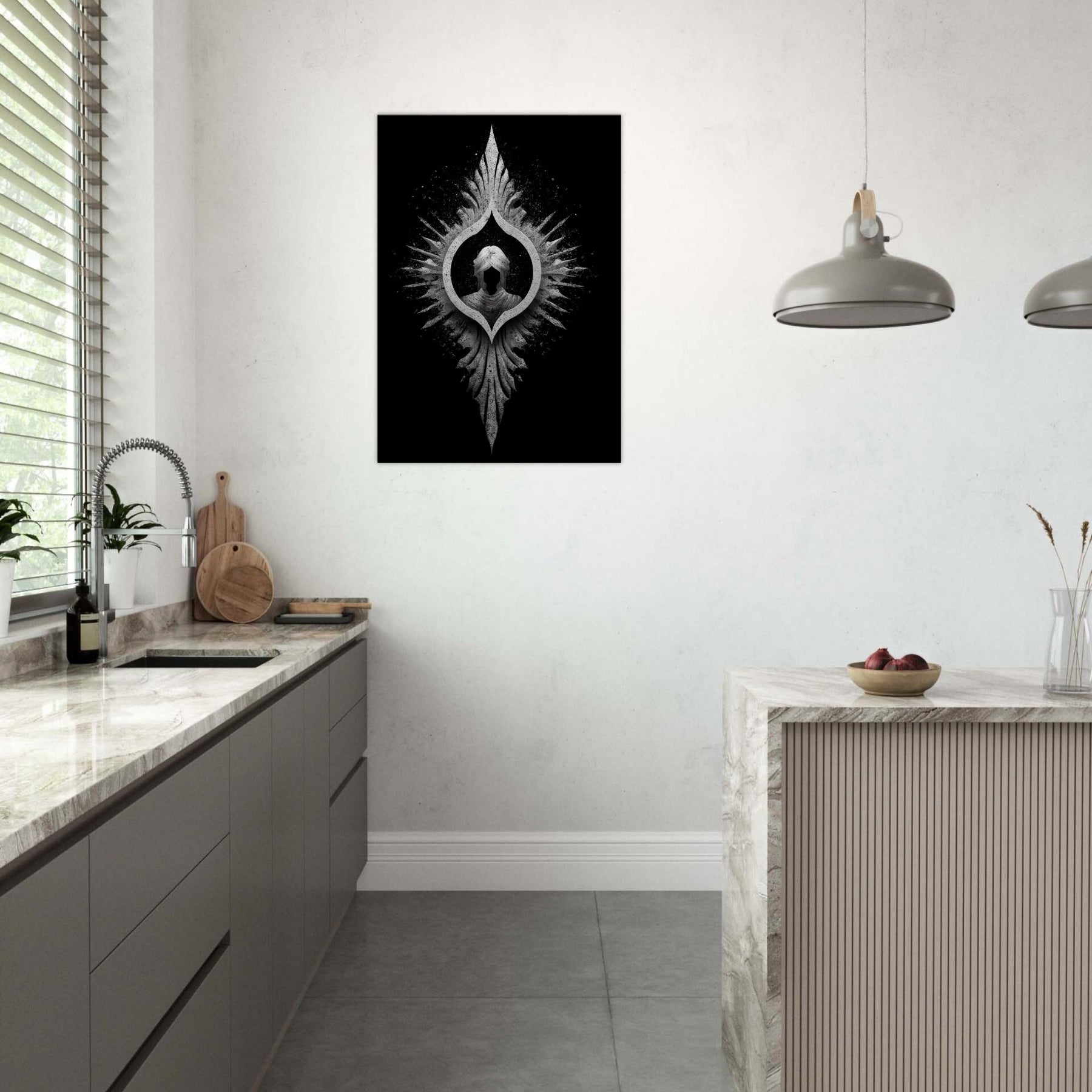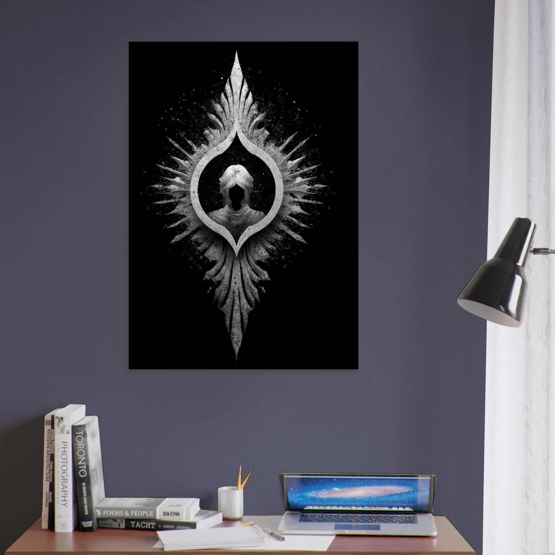 The surrounding radiance feels like inspiration spilling into the room, a candle lit hush, a study that breathes with creativity. Printed in velvety grayscale, it balances minimalism with spiritual depth, making a living room or study feel more mindful, more focused, more you.