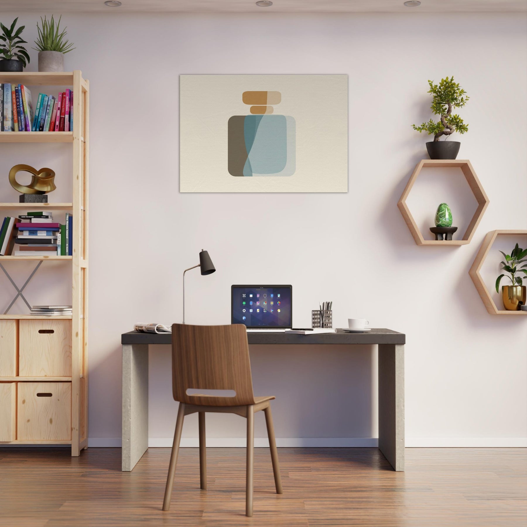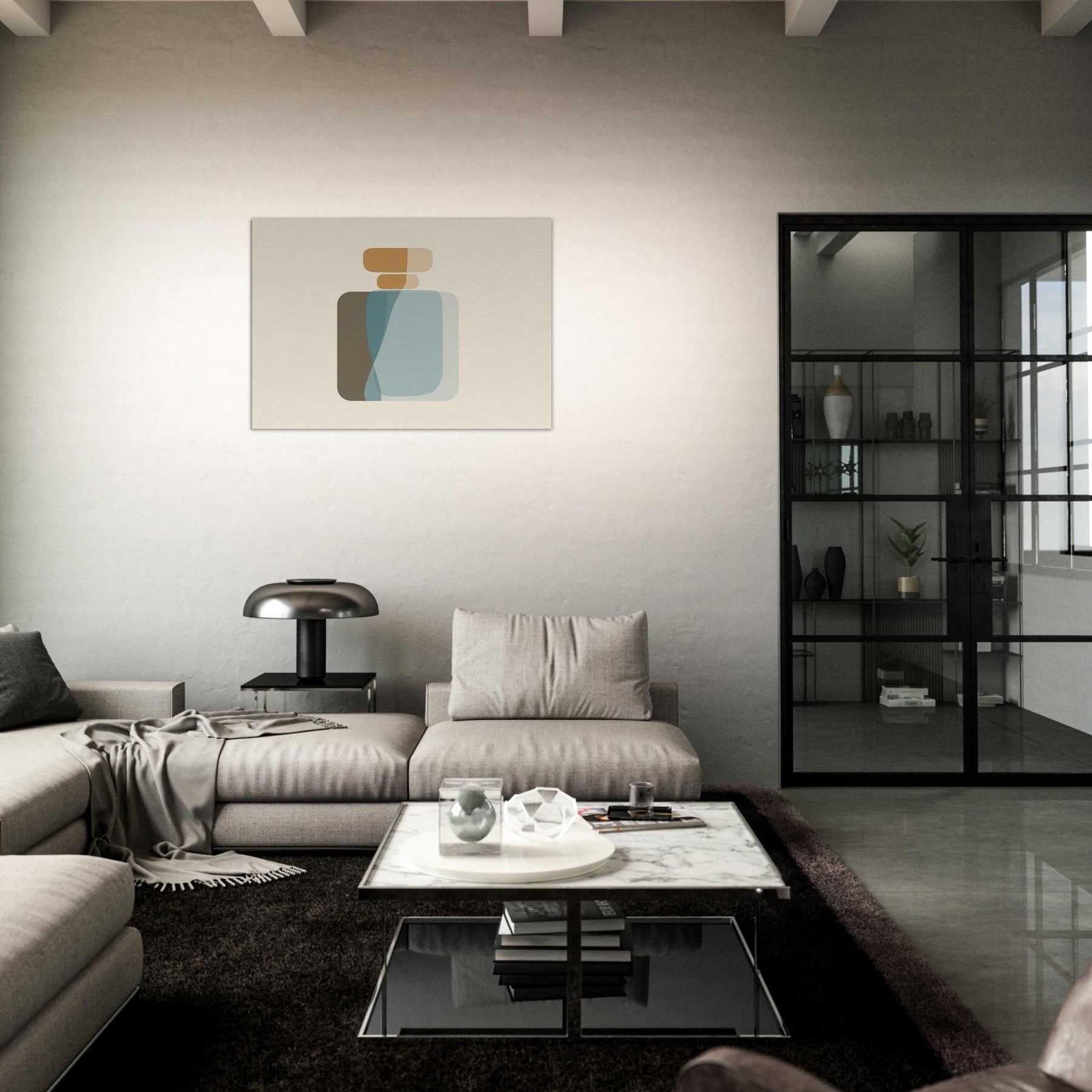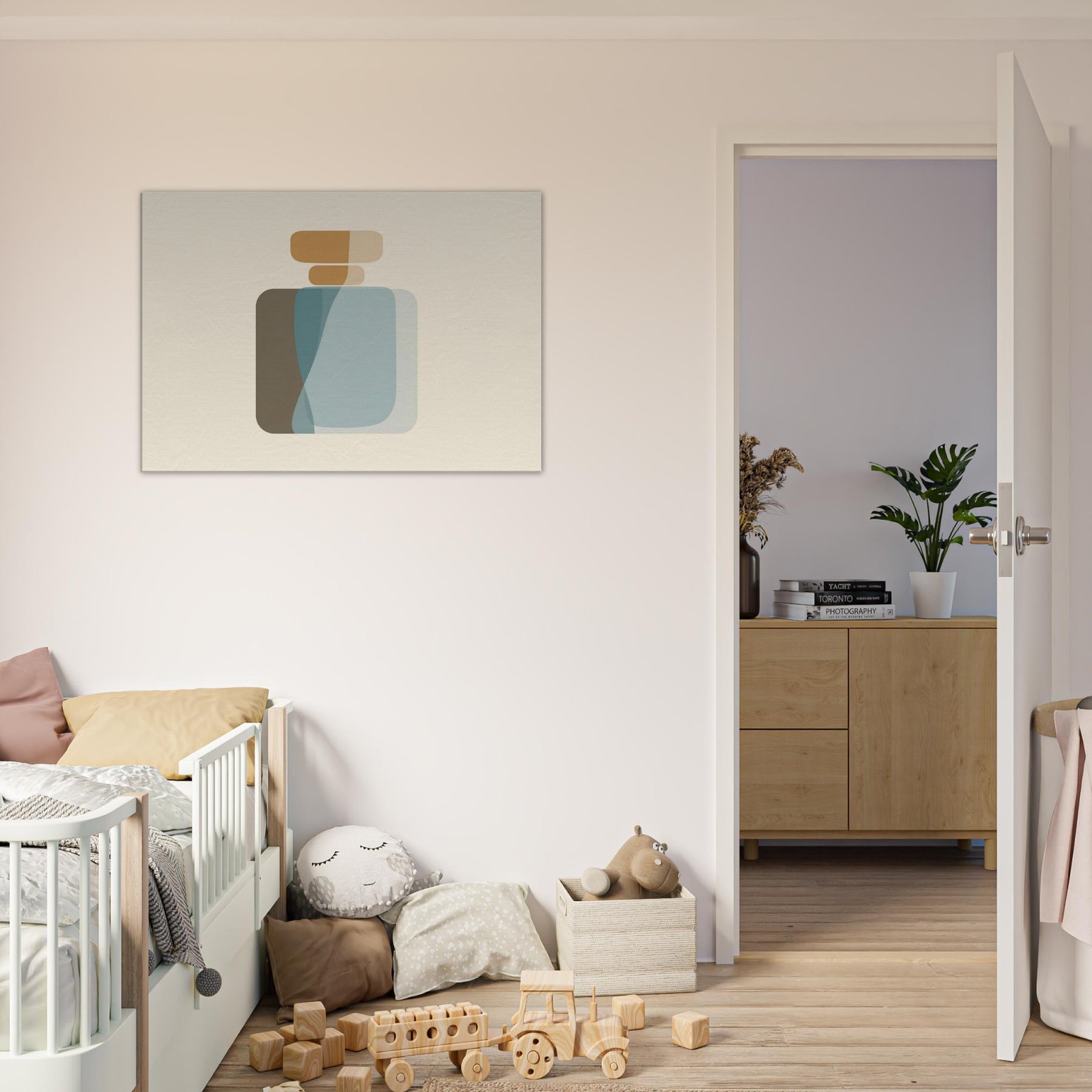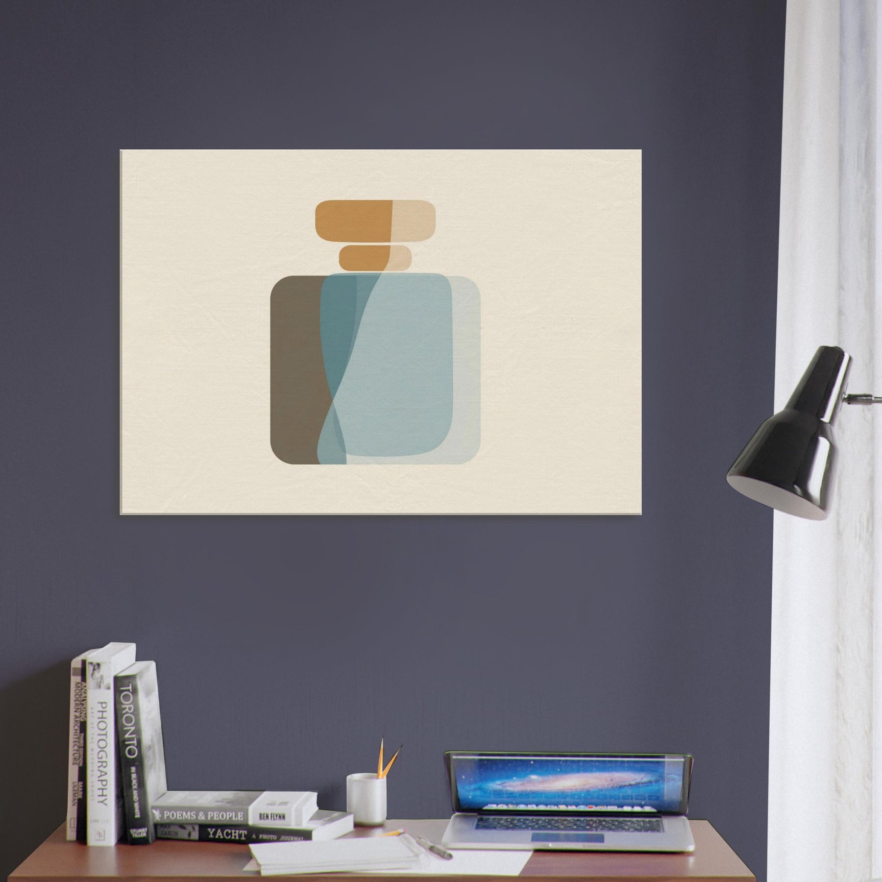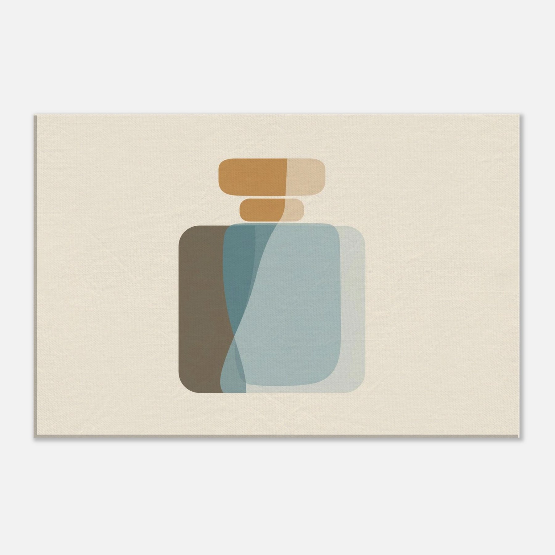 This minimalist composition centers on a Perfume Bottle, stripped to elegant, interlocking shapes that invite a quiet turn of the eye. Warm amber neutrals meet cool, translucent blues, creating a soft fragrance of color you can feel rather than smell. The overlap and rounded corners soften the room, turning a surface into a moment of stillness. Hang this in a living space to draft a calm, upscale mood an invitation to linger, reflect, and let everyday rituals unfold with subtle refinement.