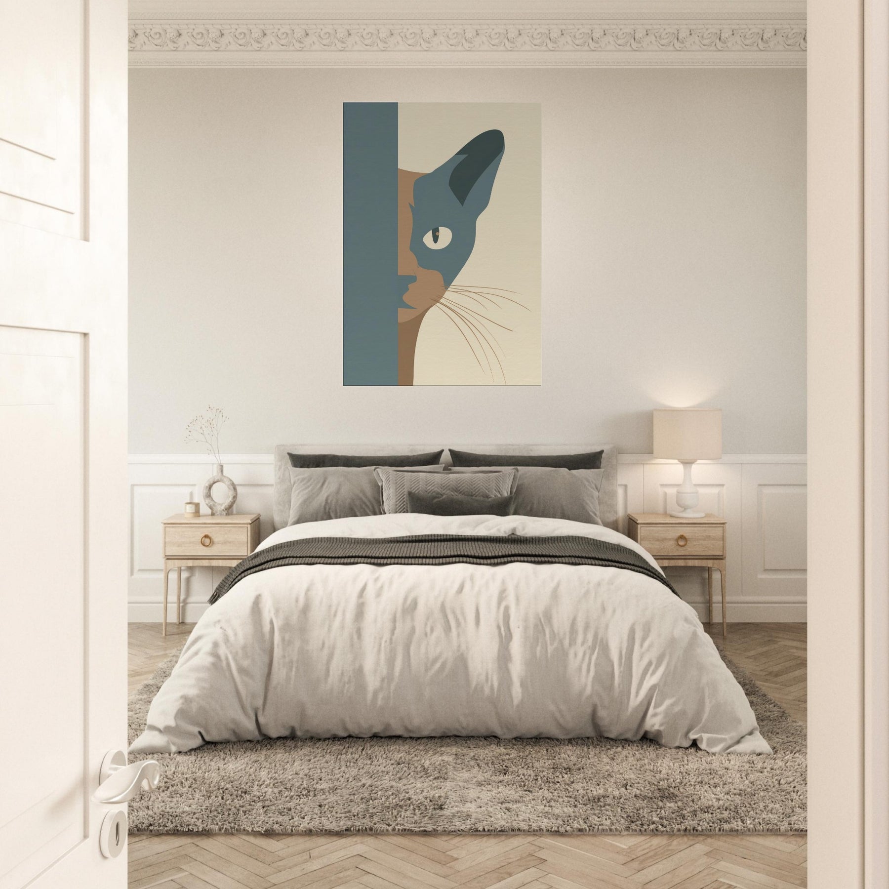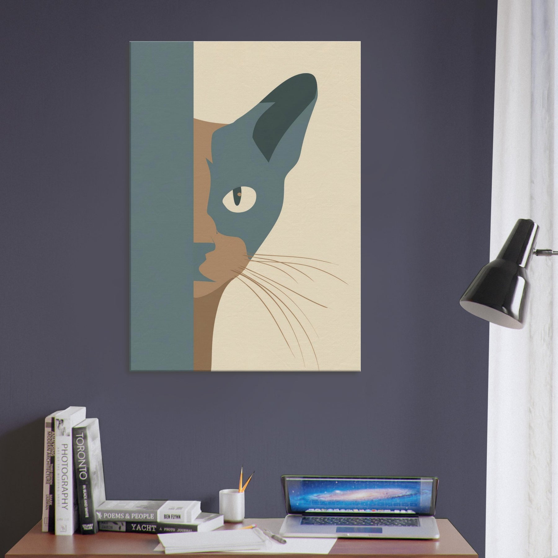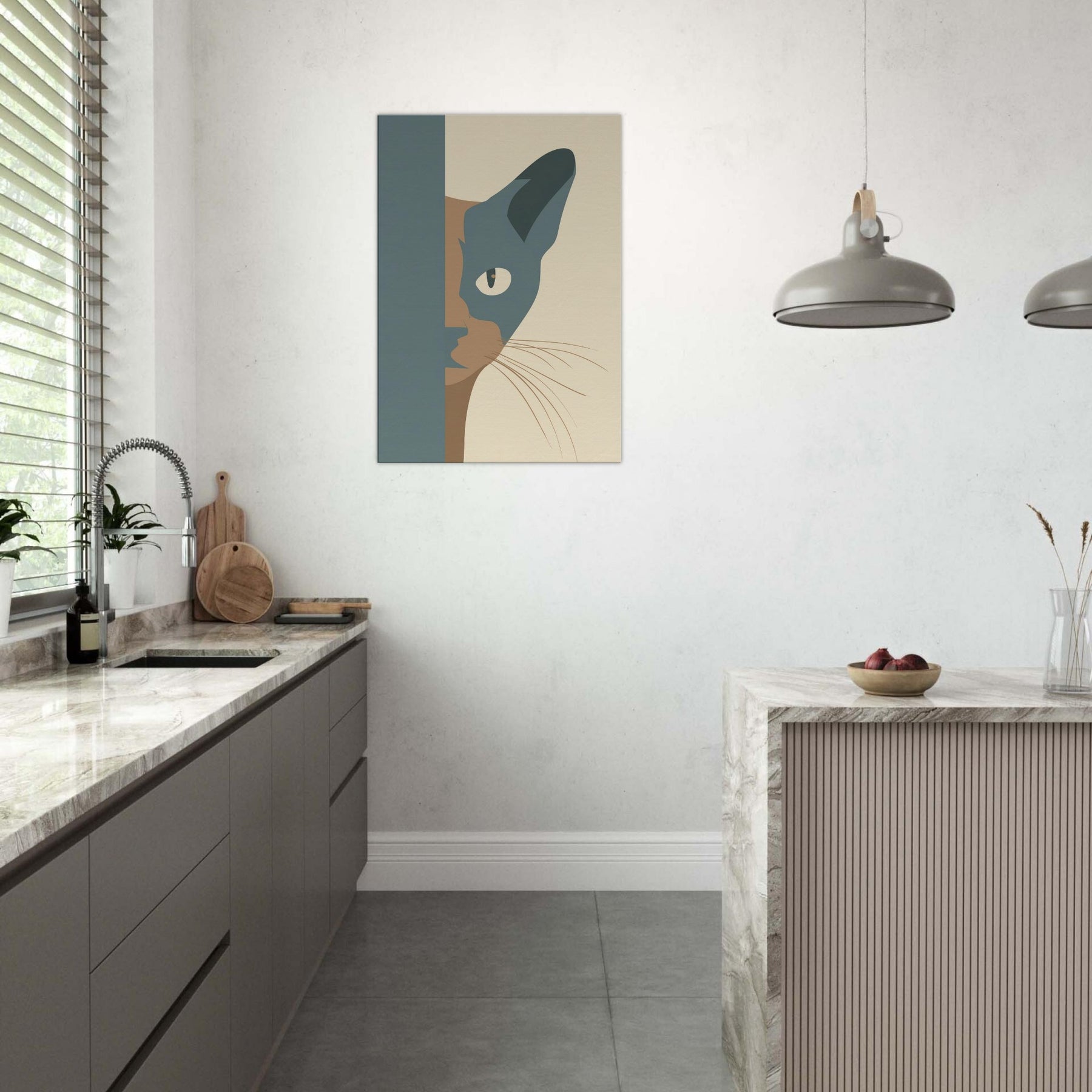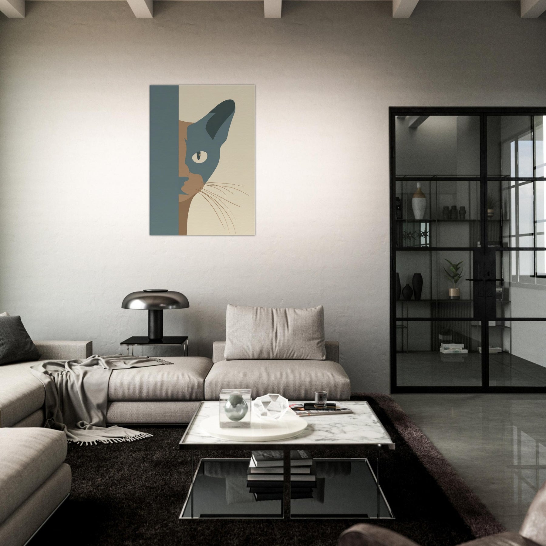 Cat peeking from the edge of a calm wall, this minimalist study reduces form to clean, purposeful planes and a whisper soft palette. The gentle contrast of cream, taupe, and blue gray bathes a room in quiet light, while the poised half face invites a moment of contemplation. The composition acts like a breath between spaces, offering a subtle focal point that elevates a sofa or bedside vignette without shouting. Perfect for living rooms or studios seeking elegance, restraint, and a touch of playful mystery.