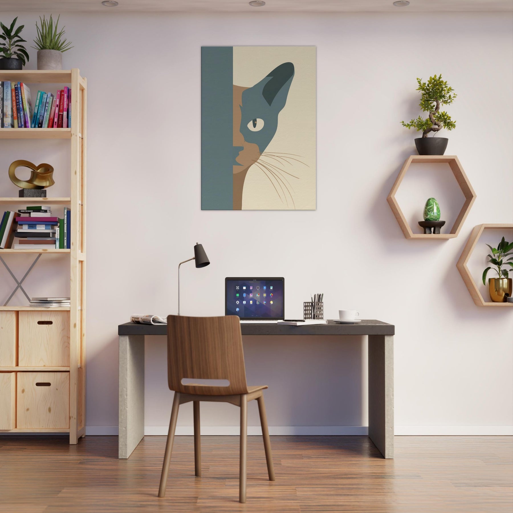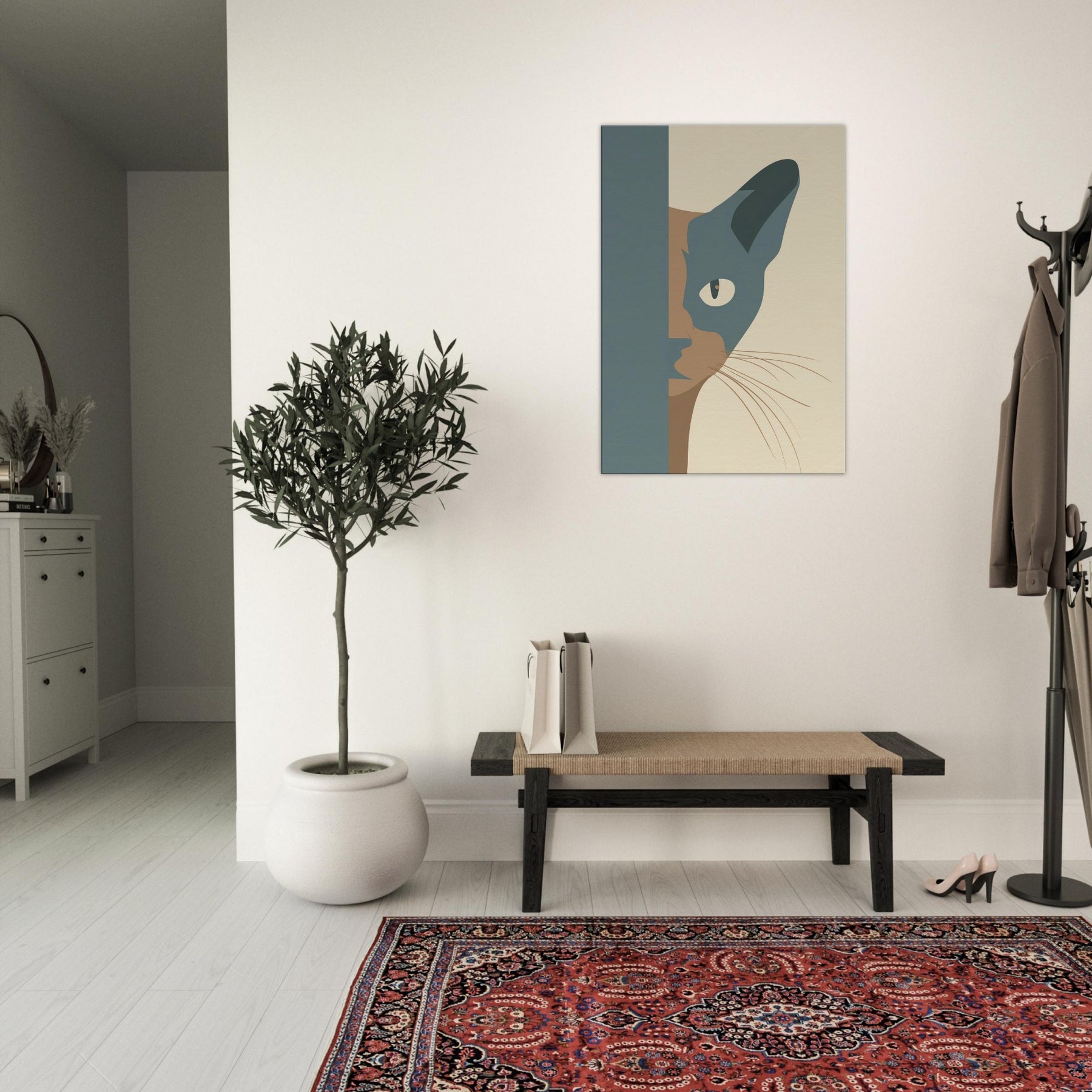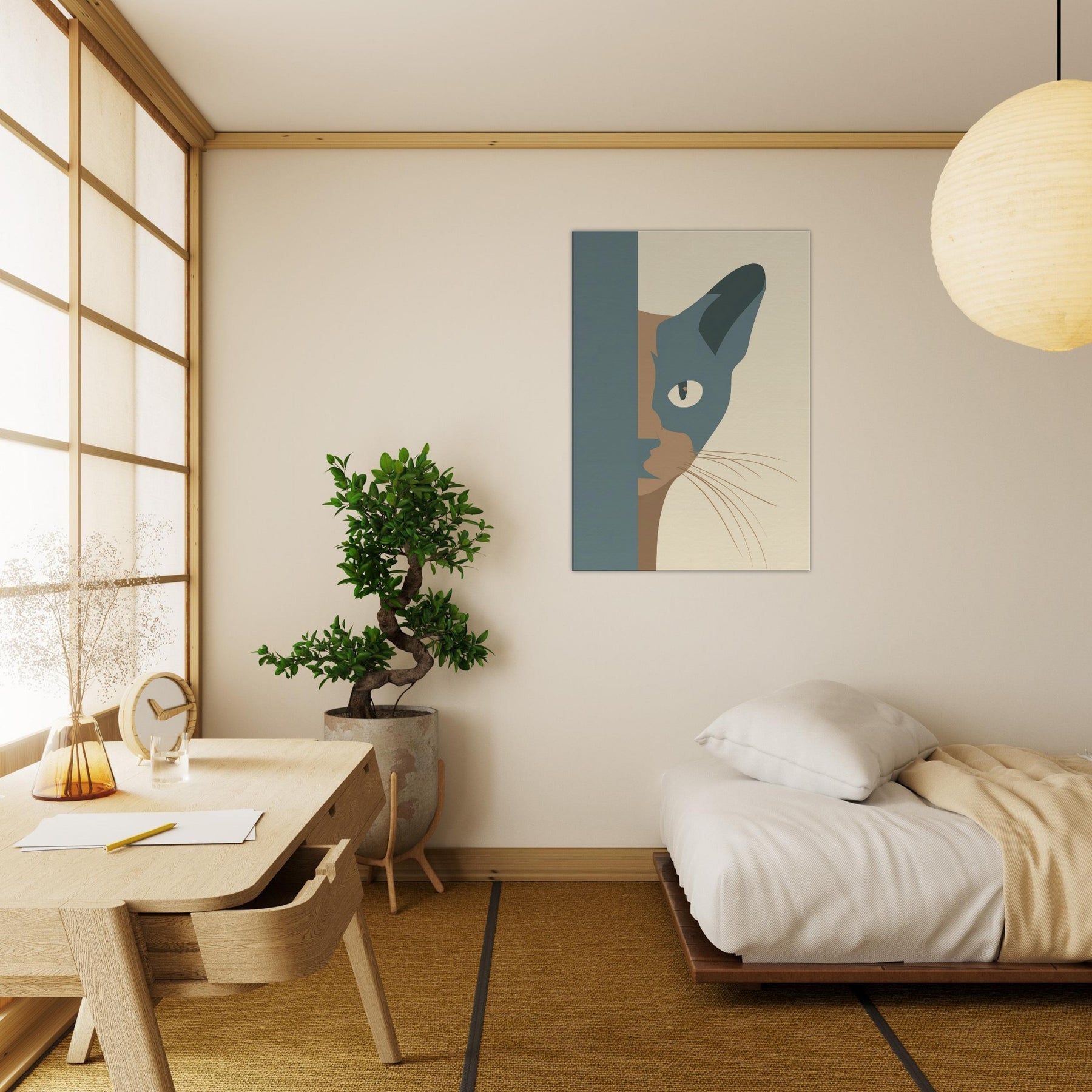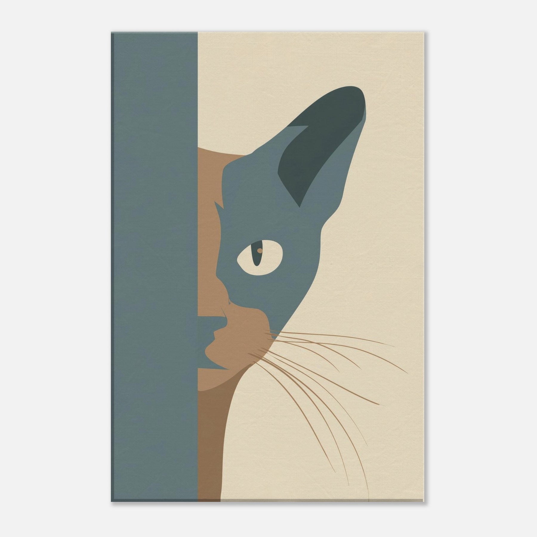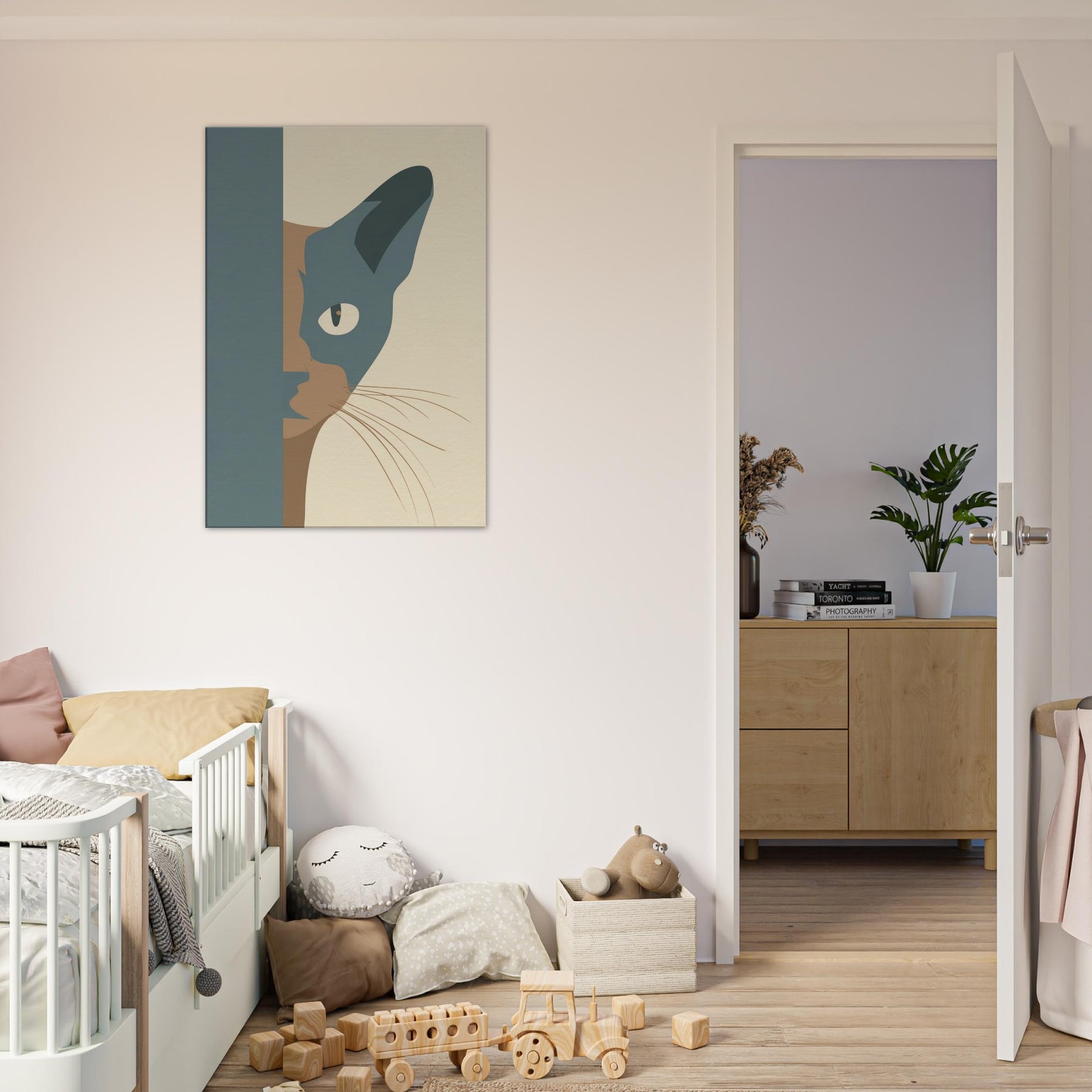Cat peeking from the edge of a calm wall, this minimalist study reduces form to clean, purposeful planes and a whisper soft palette. The gentle contrast of cream, taupe, and blue gray bathes a room in quiet light, while the poised half face invites a moment of contemplation. The composition acts like a breath between spaces, offering a subtle focal point that elevates a sofa or bedside vignette without shouting. Perfect for living rooms or studios seeking elegance, restraint, and a touch of playful mystery.