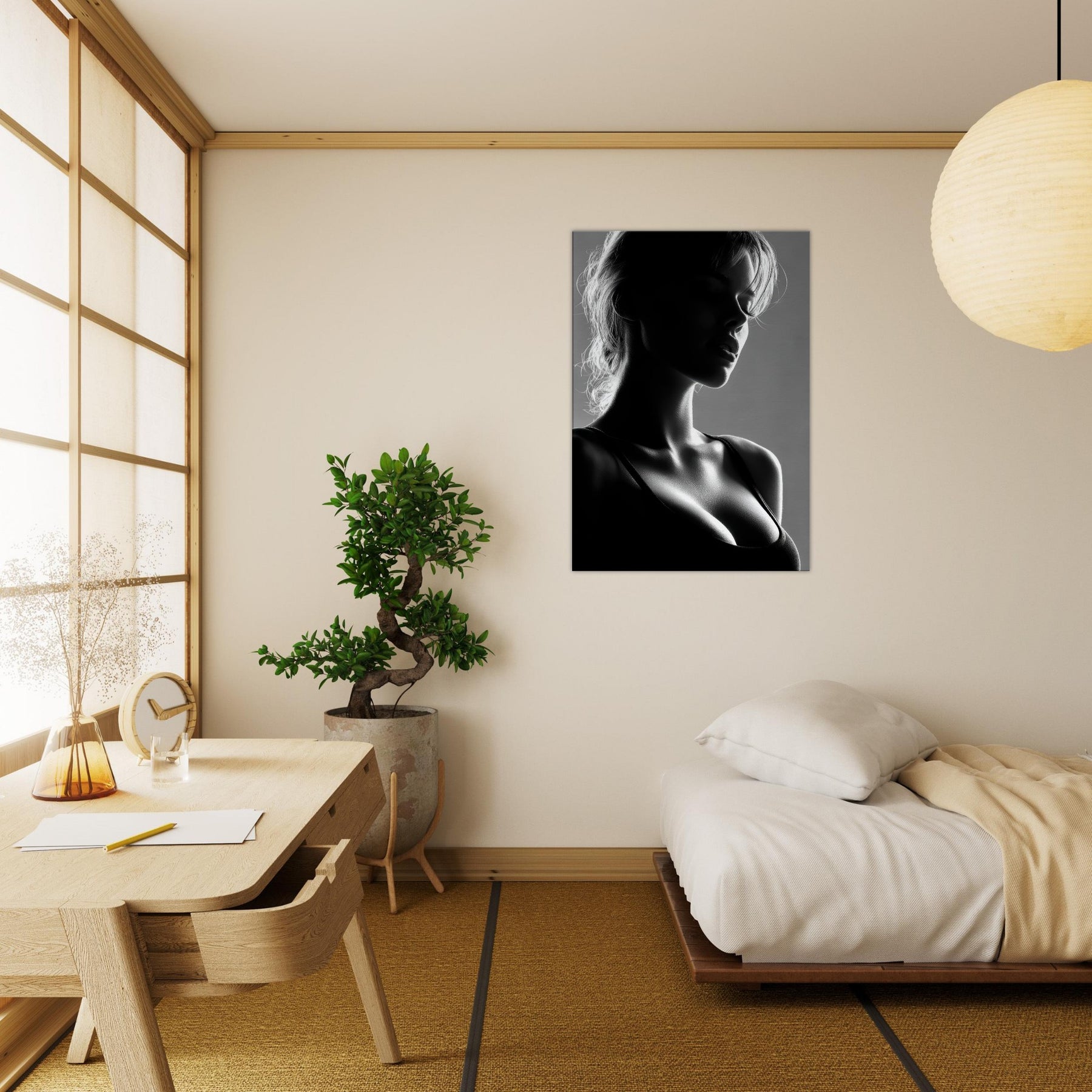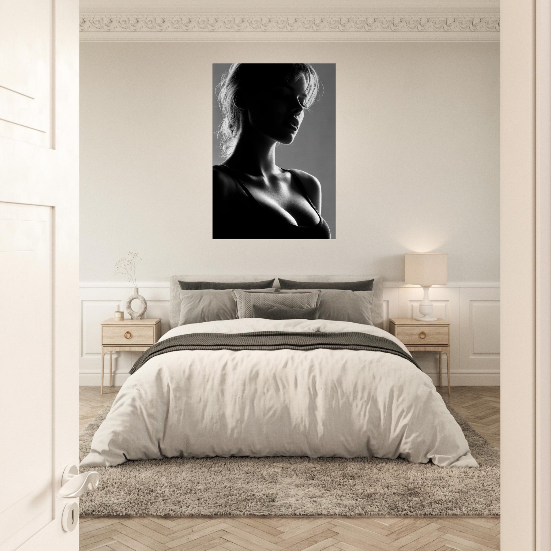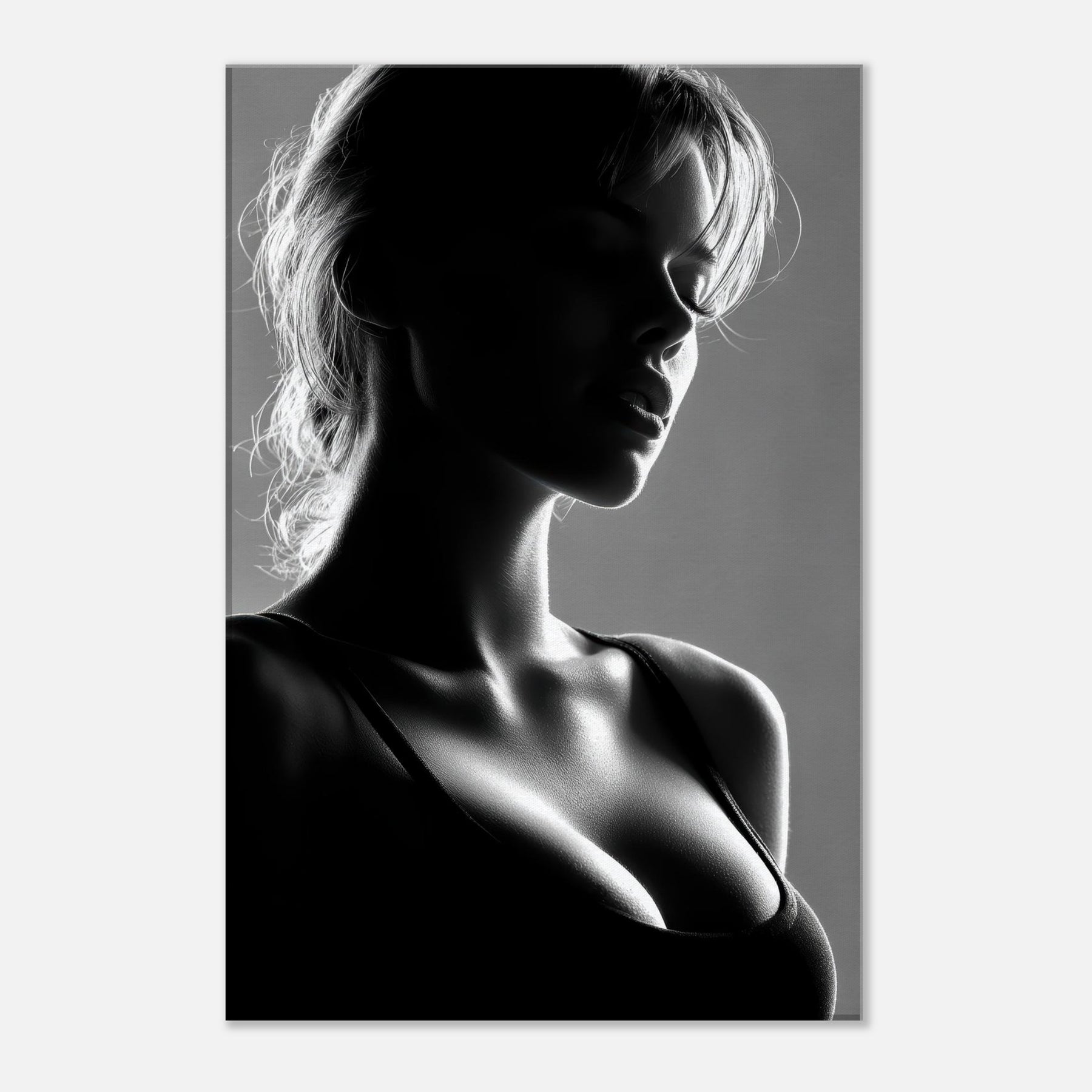 Shadowed silhouettes glide across a field of light in this black and white study of form and quiet emotion. The primary subject, a Female Silhouette, is rendered in a single, sinuous line that folds into shadows and highlights, suggesting both motion and stillness. This artwork invites a calm, intimate mood perfect for a living room corner, bedroom, or entryway where soft light and restrained contrast awaken the senses without shouting. It pairs beautifully with textured neutrals and modern furnishings.