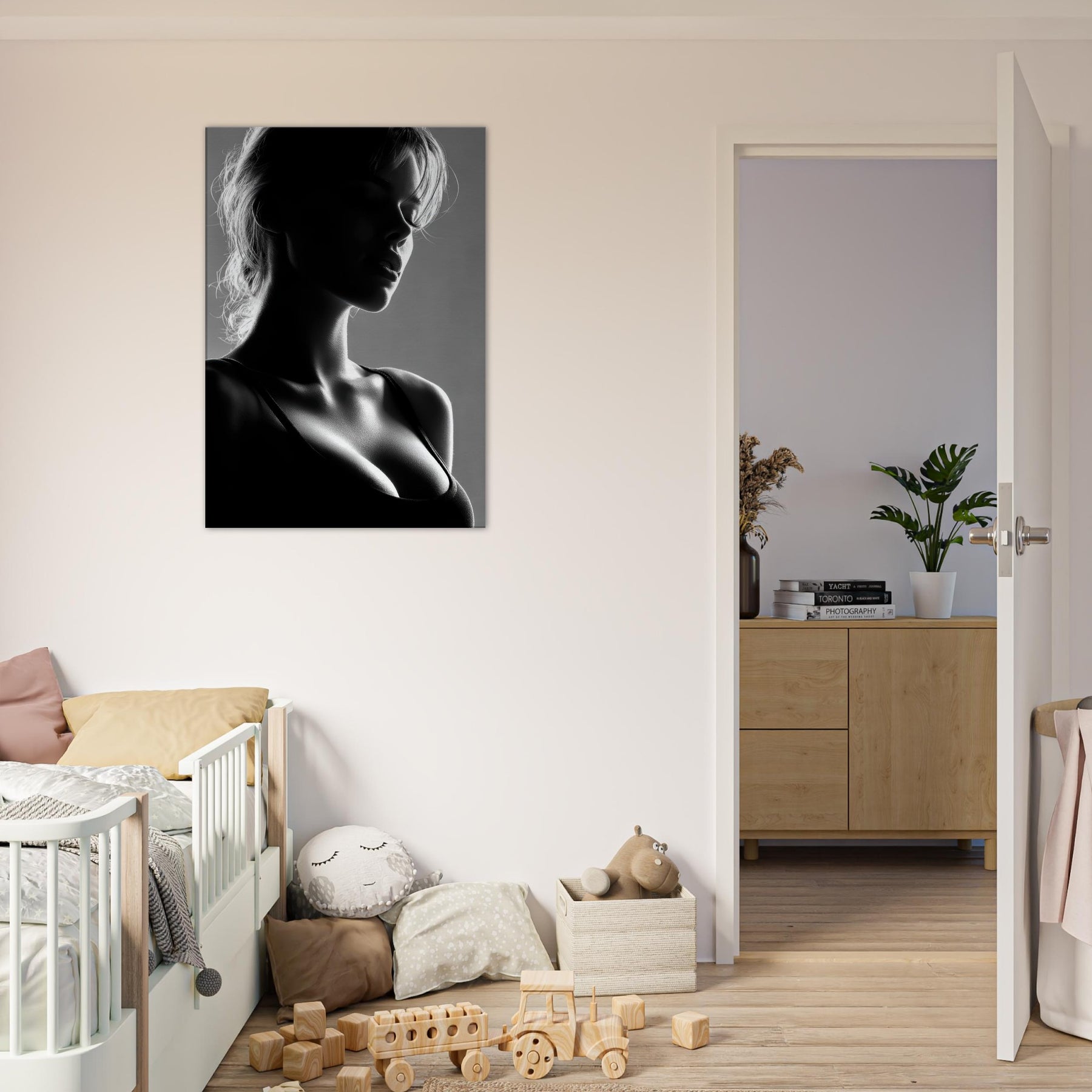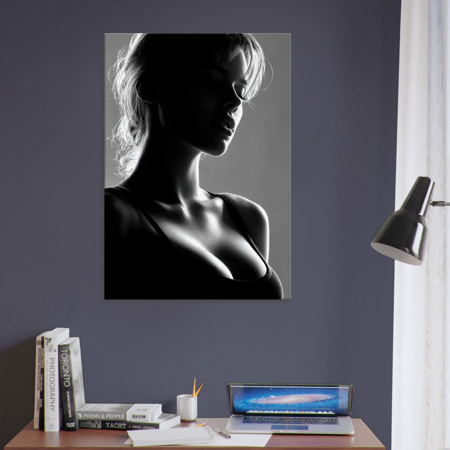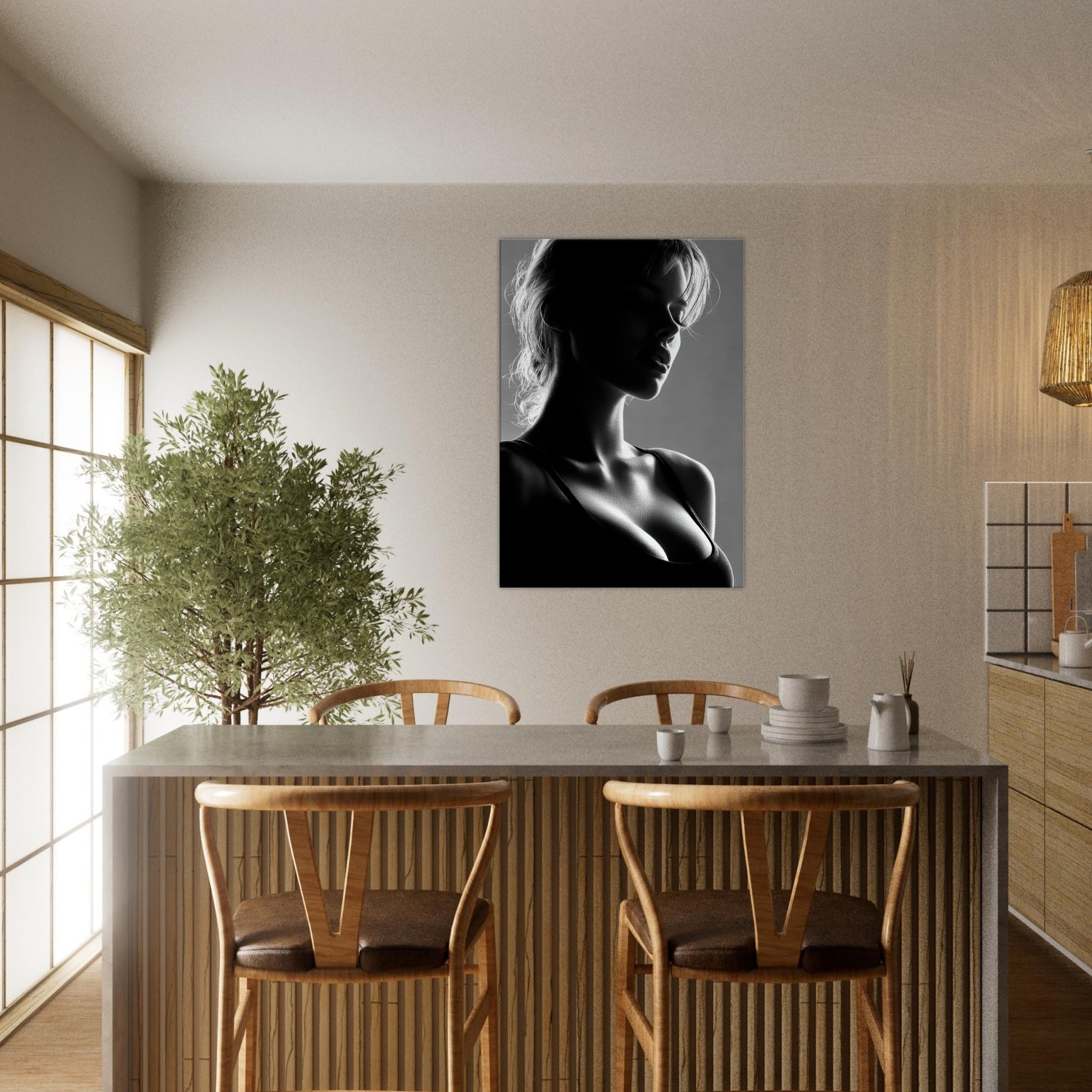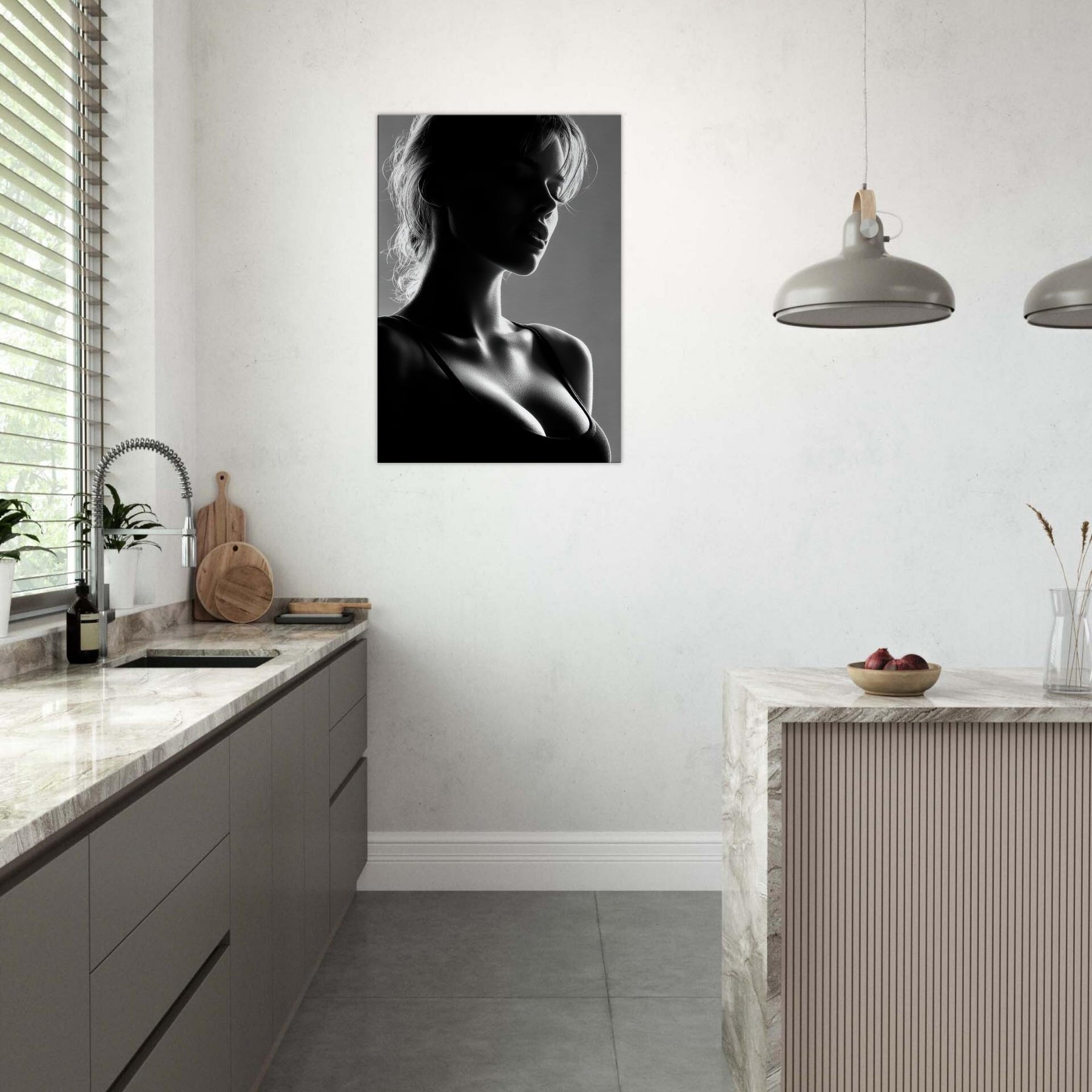 Shadowed silhouettes glide across a field of light in this black and white study of form and quiet emotion. The primary subject, a Female Silhouette, is rendered in a single, sinuous line that folds into shadows and highlights, suggesting both motion and stillness. This artwork invites a calm, intimate mood perfect for a living room corner, bedroom, or entryway where soft light and restrained contrast awaken the senses without shouting. It pairs beautifully with textured neutrals and modern furnishings.