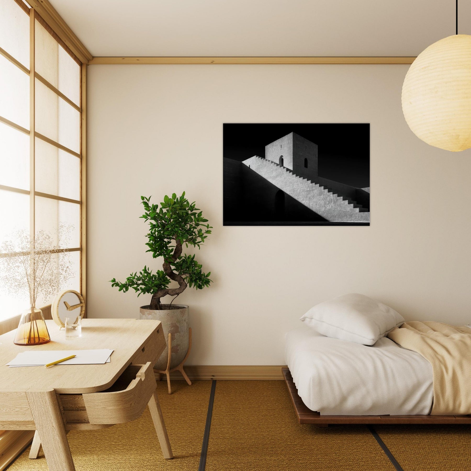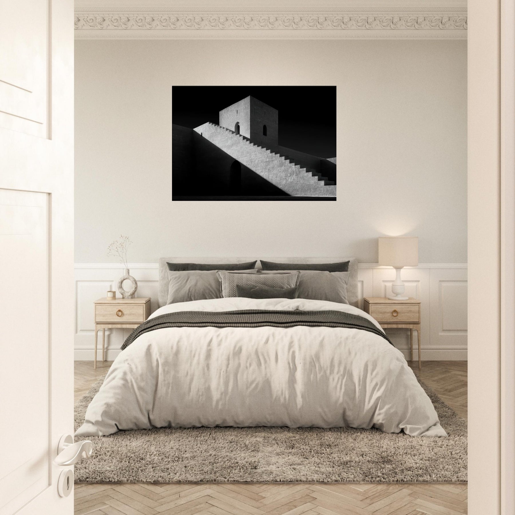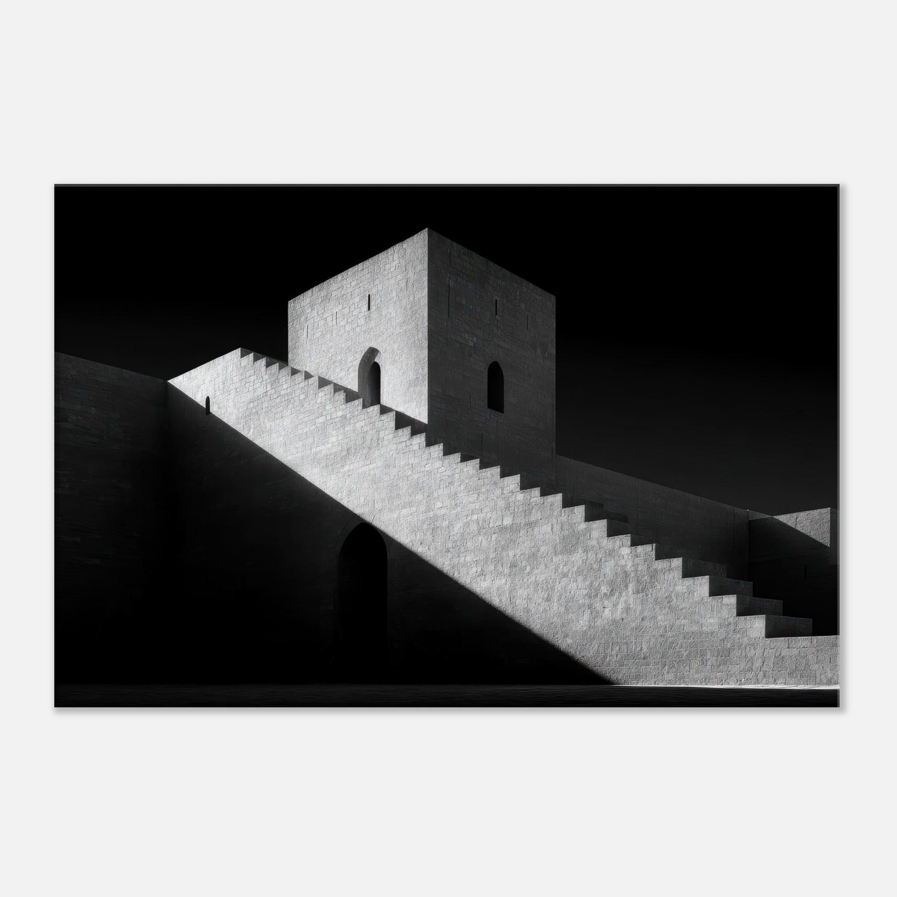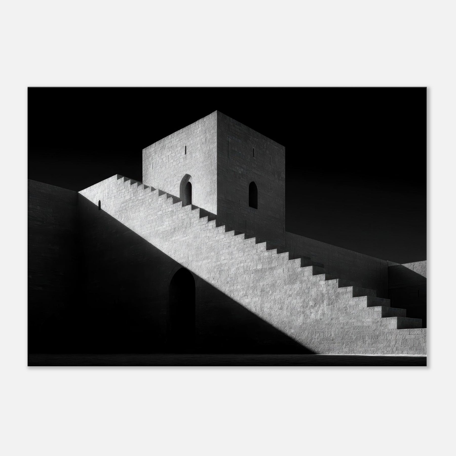 The monumental stairs cut across the image like a quiet ramp of time, guiding the eye to a solitary doorway and a watchful tower. The atmosphere is serene yet dramatic, a canvas for contemplation in any room. Hang it in a living space for gravitas, or in a hallway to elongate space with timeless architectural poetry.