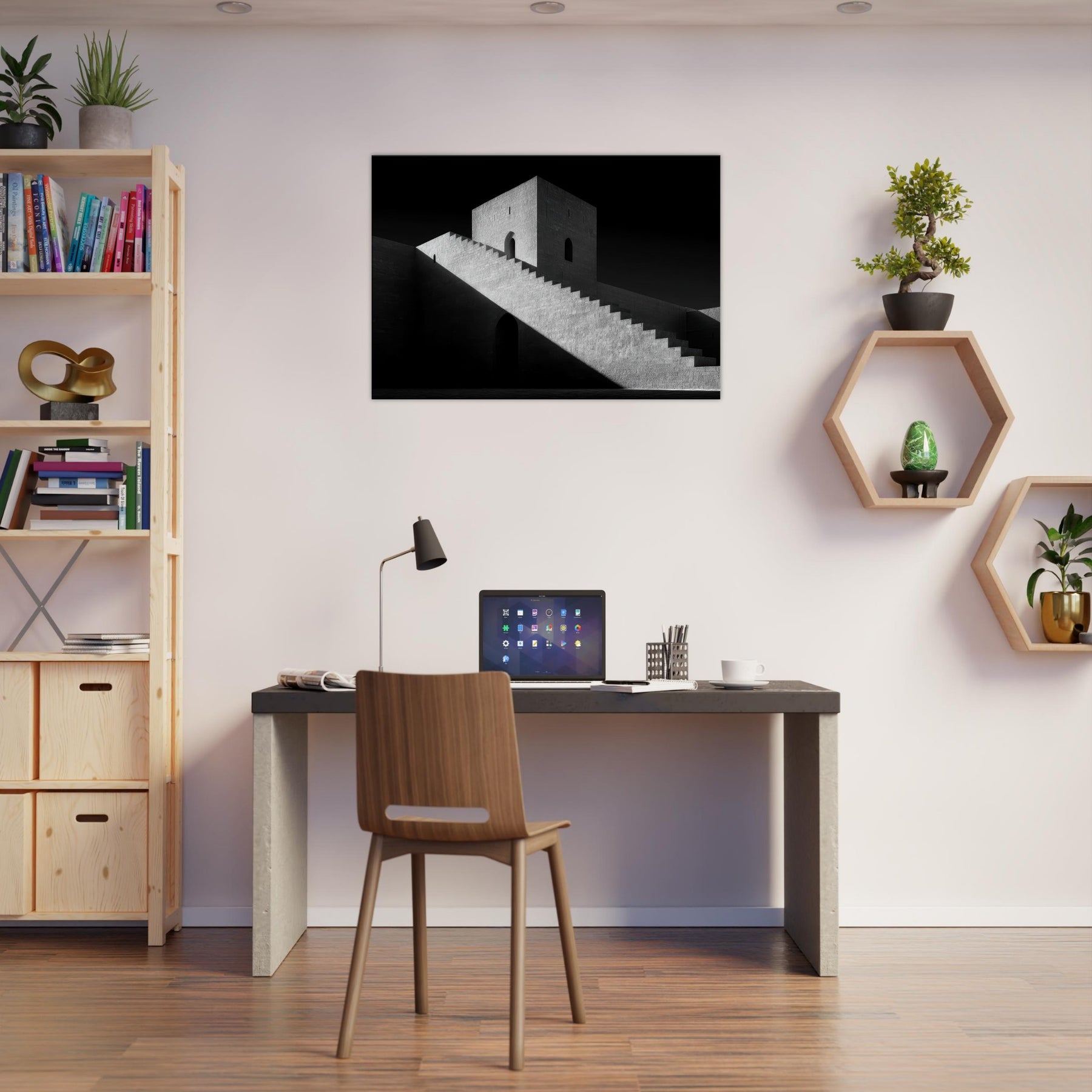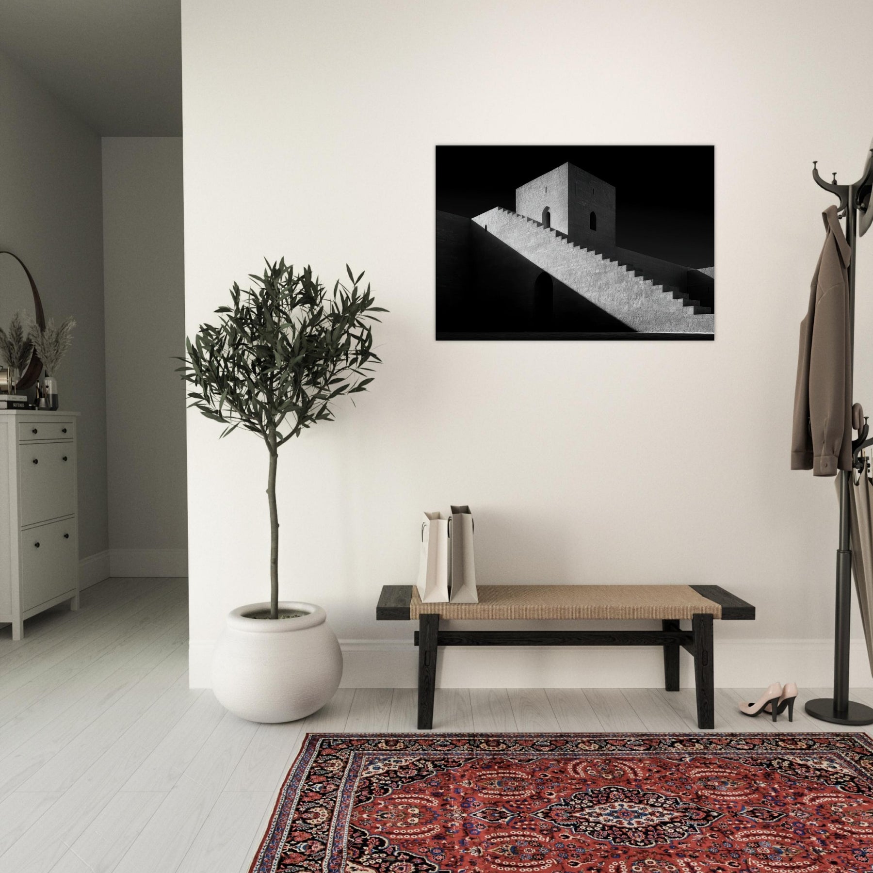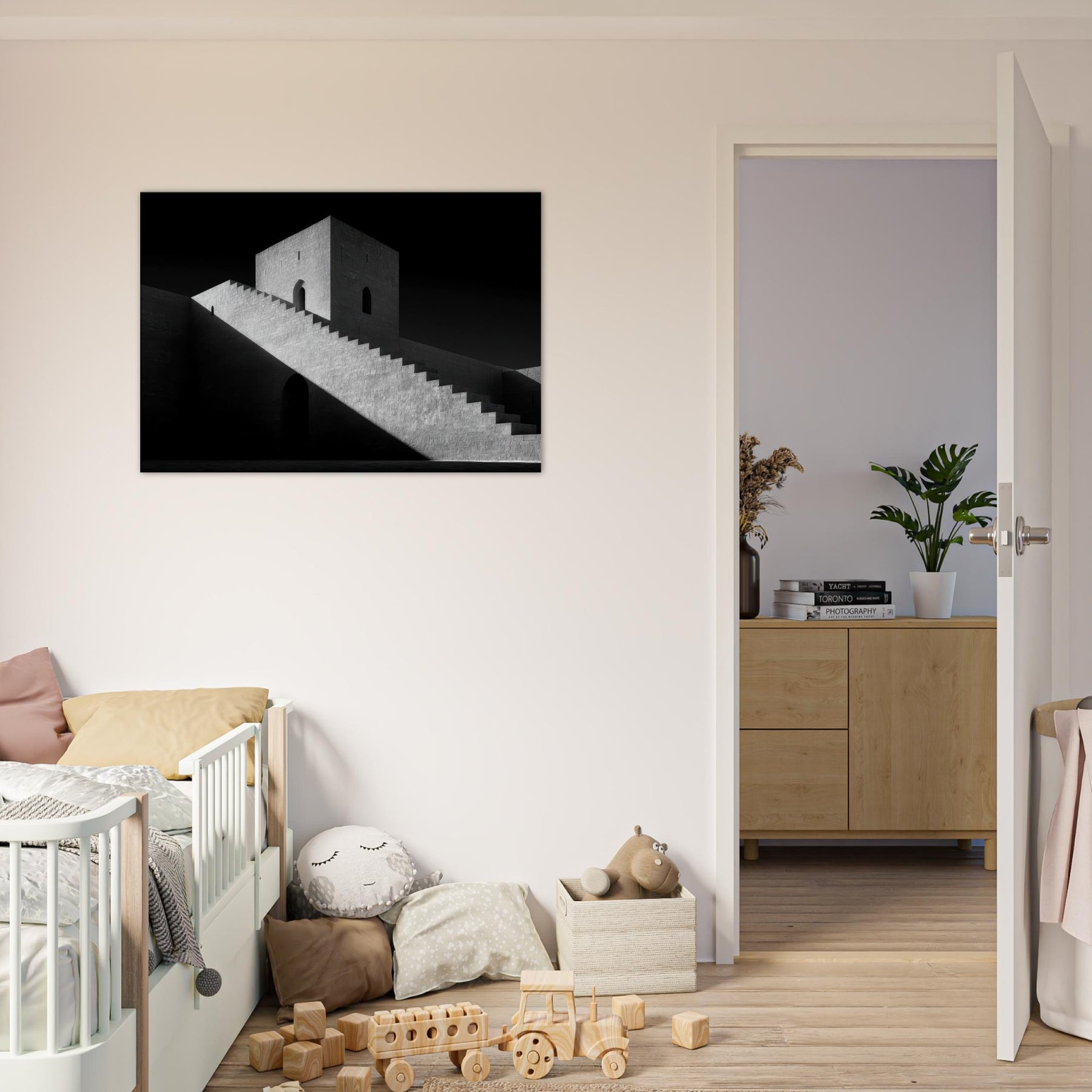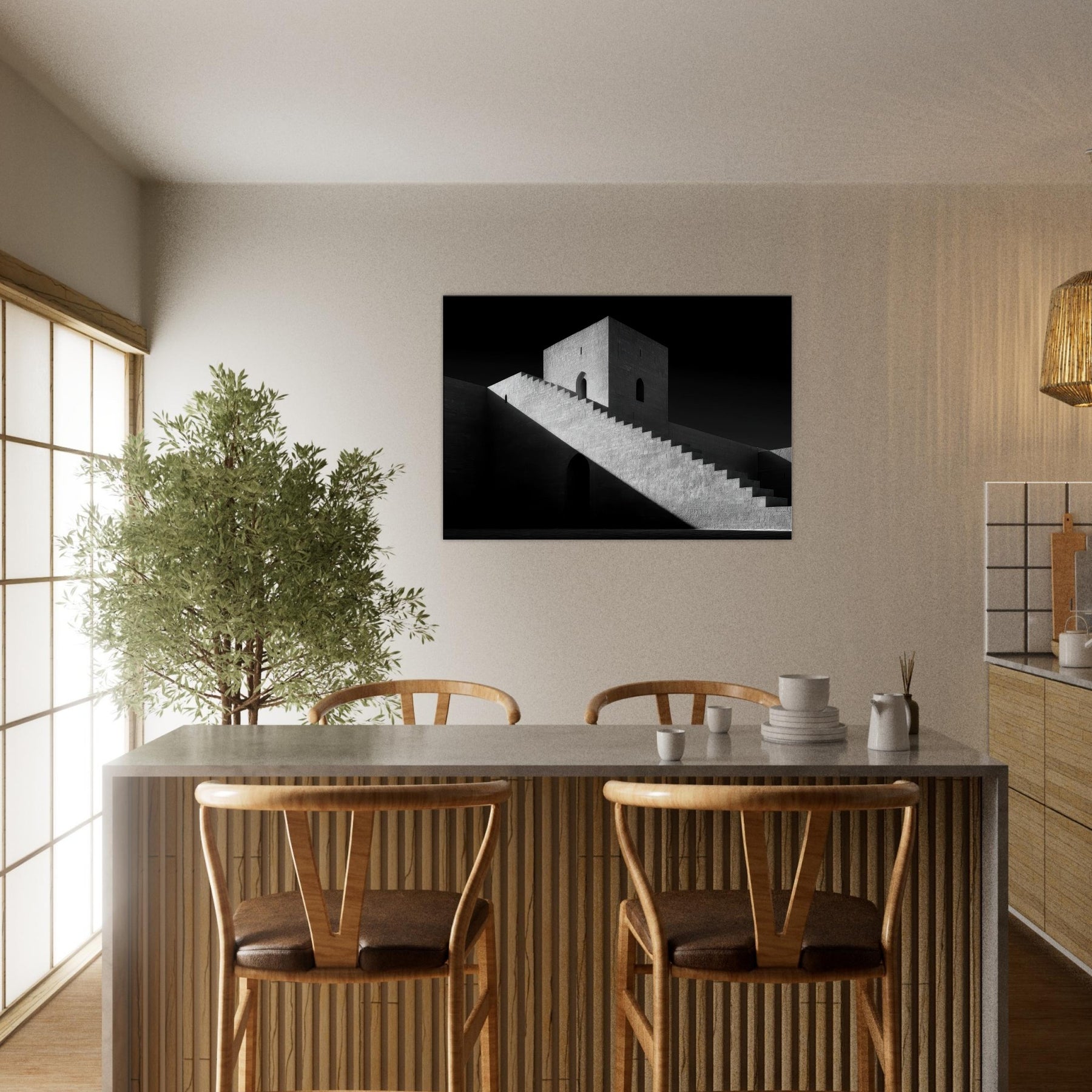 The monumental stairs cut across the image like a quiet ramp of time, guiding the eye to a solitary doorway and a watchful tower. The atmosphere is serene yet dramatic, a canvas for contemplation in any room. Hang it in a living space for gravitas, or in a hallway to elongate space with timeless architectural poetry.