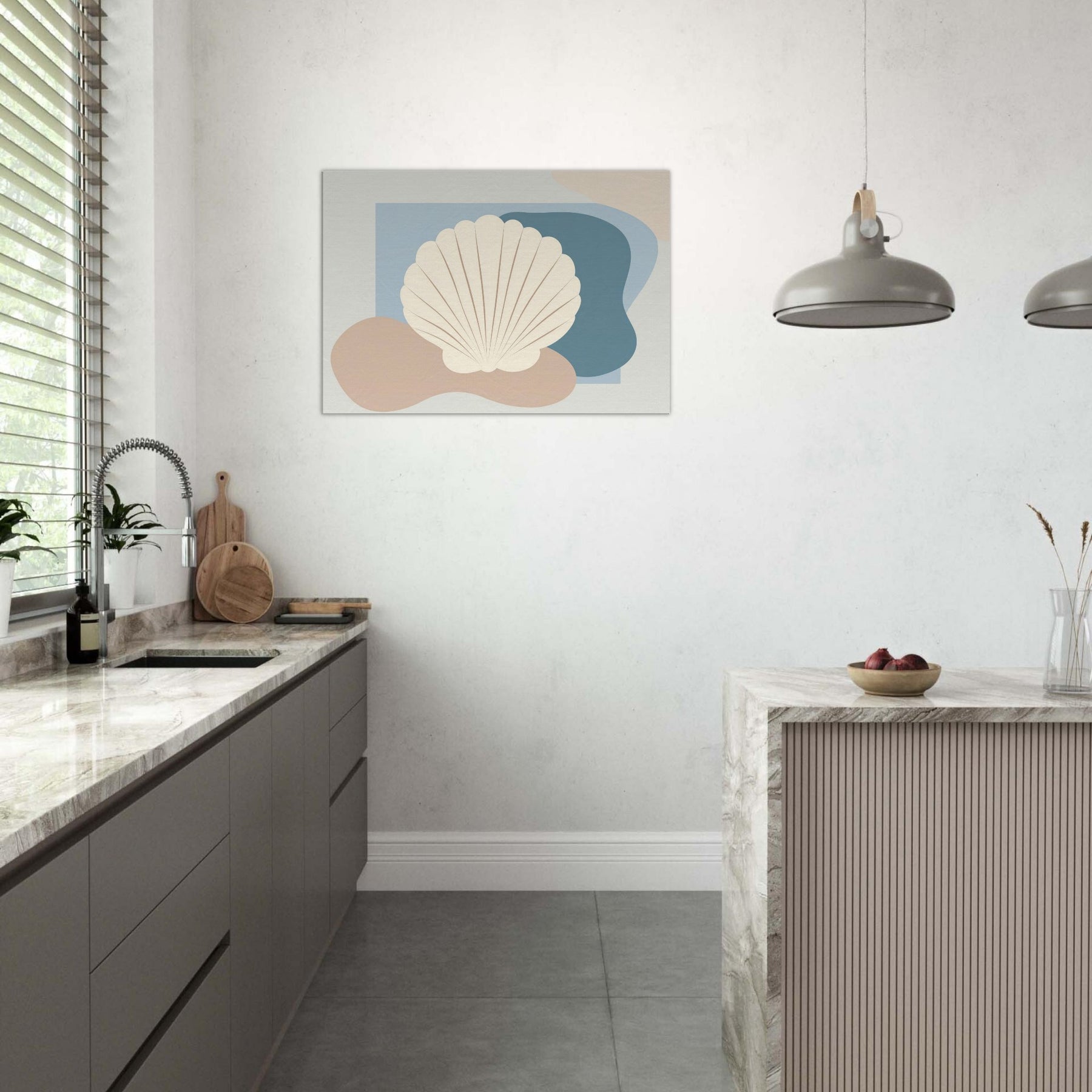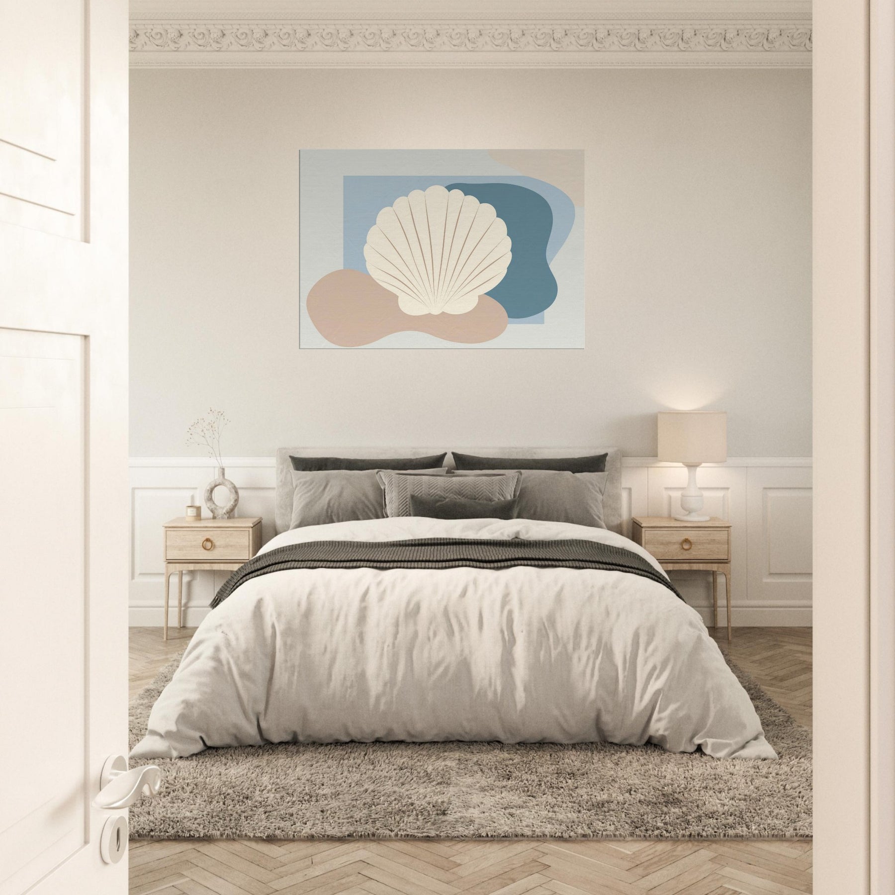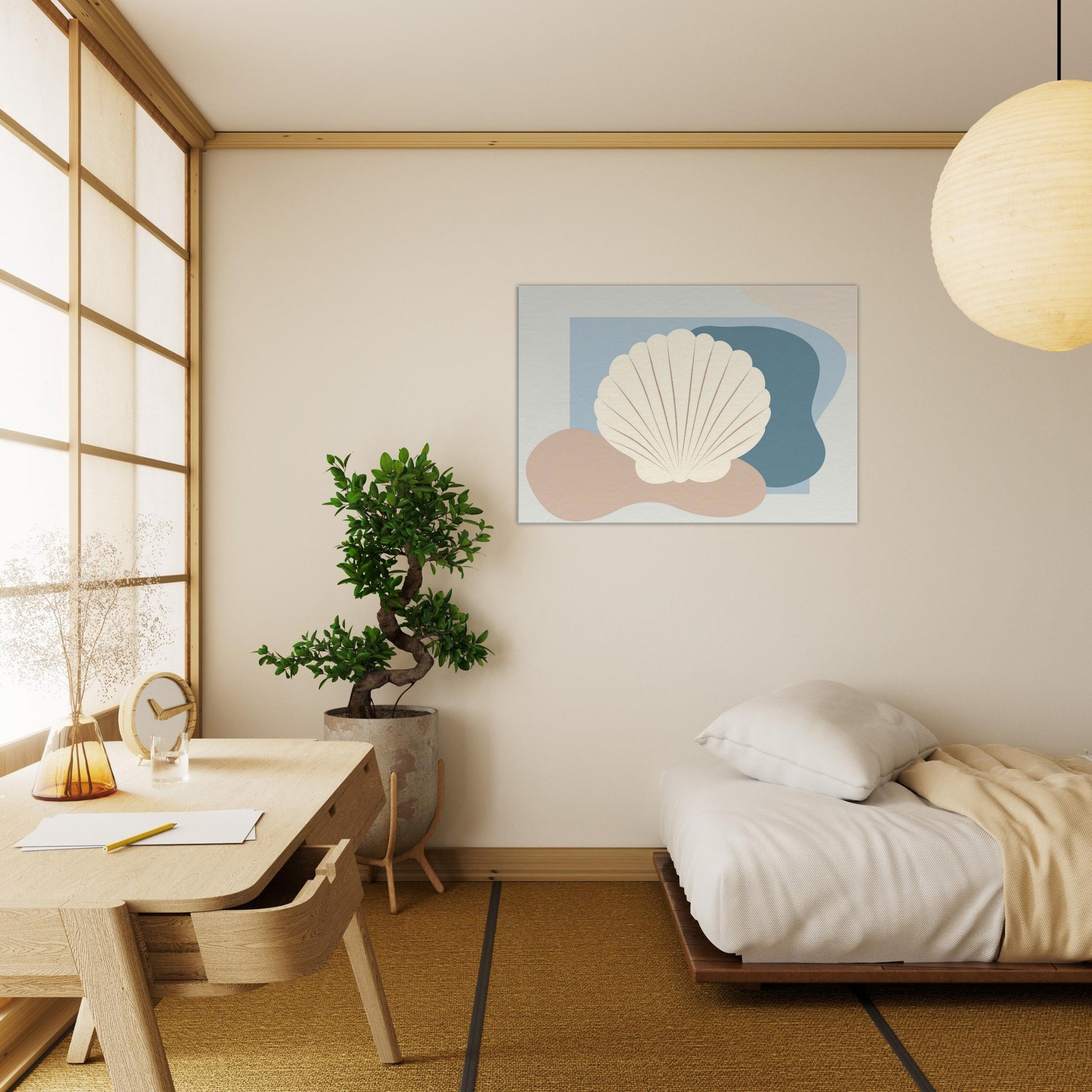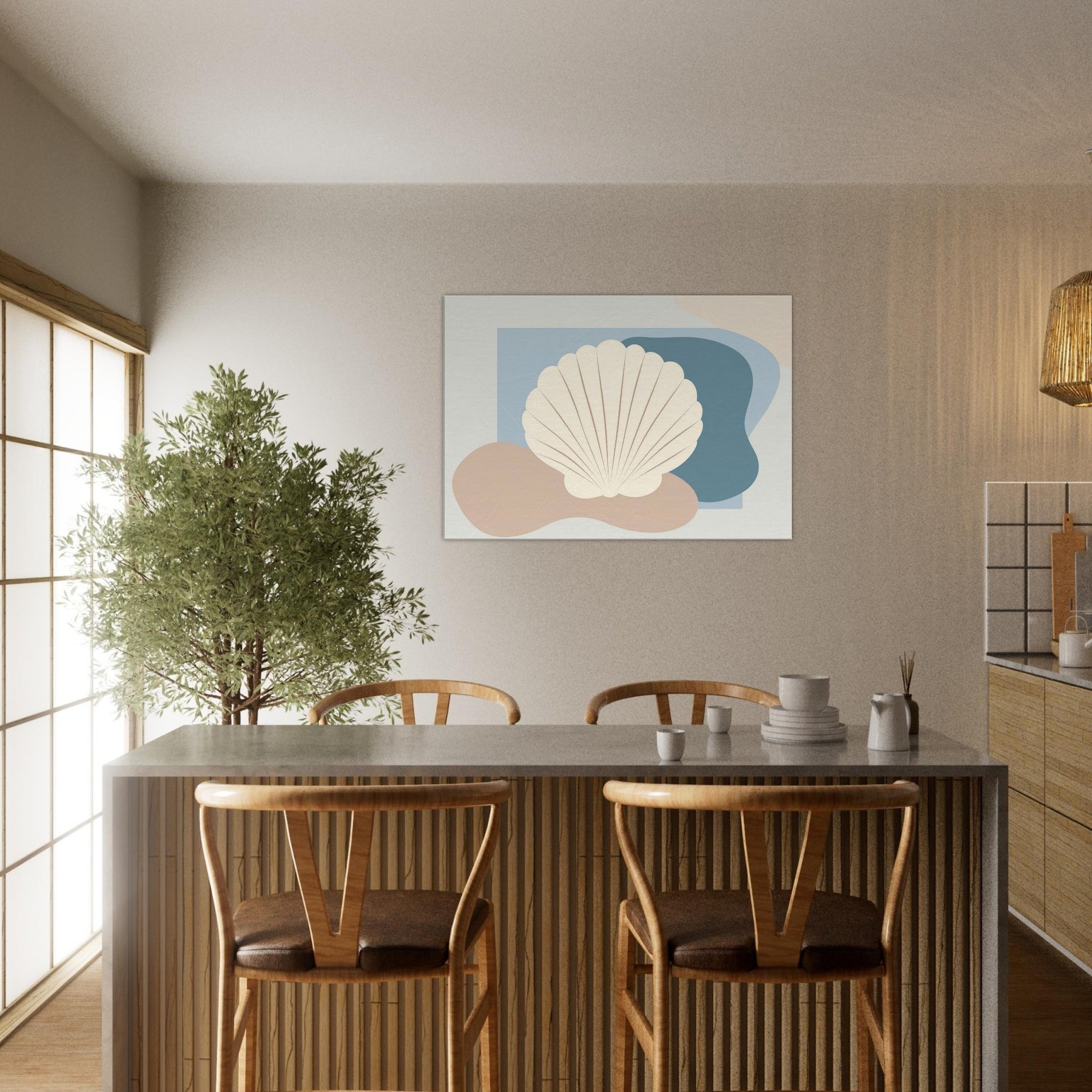 Hovering in soft light, this Seashell artwork distills the quiet rhythm of the shore into a single, serene presence. The minimalist silhouette sits against gentle blues and warm sand tones, inviting calm into your living space. Its airy contour echoes a shoreline breeze, while the creamy shell shape adds texture and tactility from every angle. Hang it above a sofa or bed to conjure coastal stillness, a tranquil focal point that softens walls and invites quiet reflection.