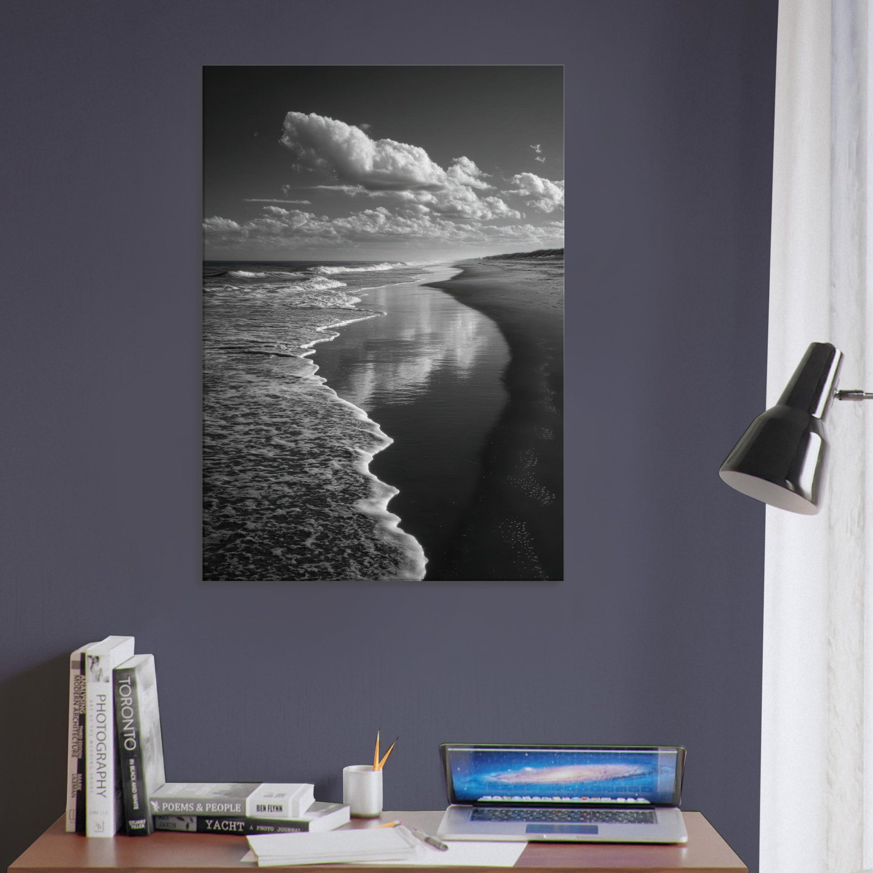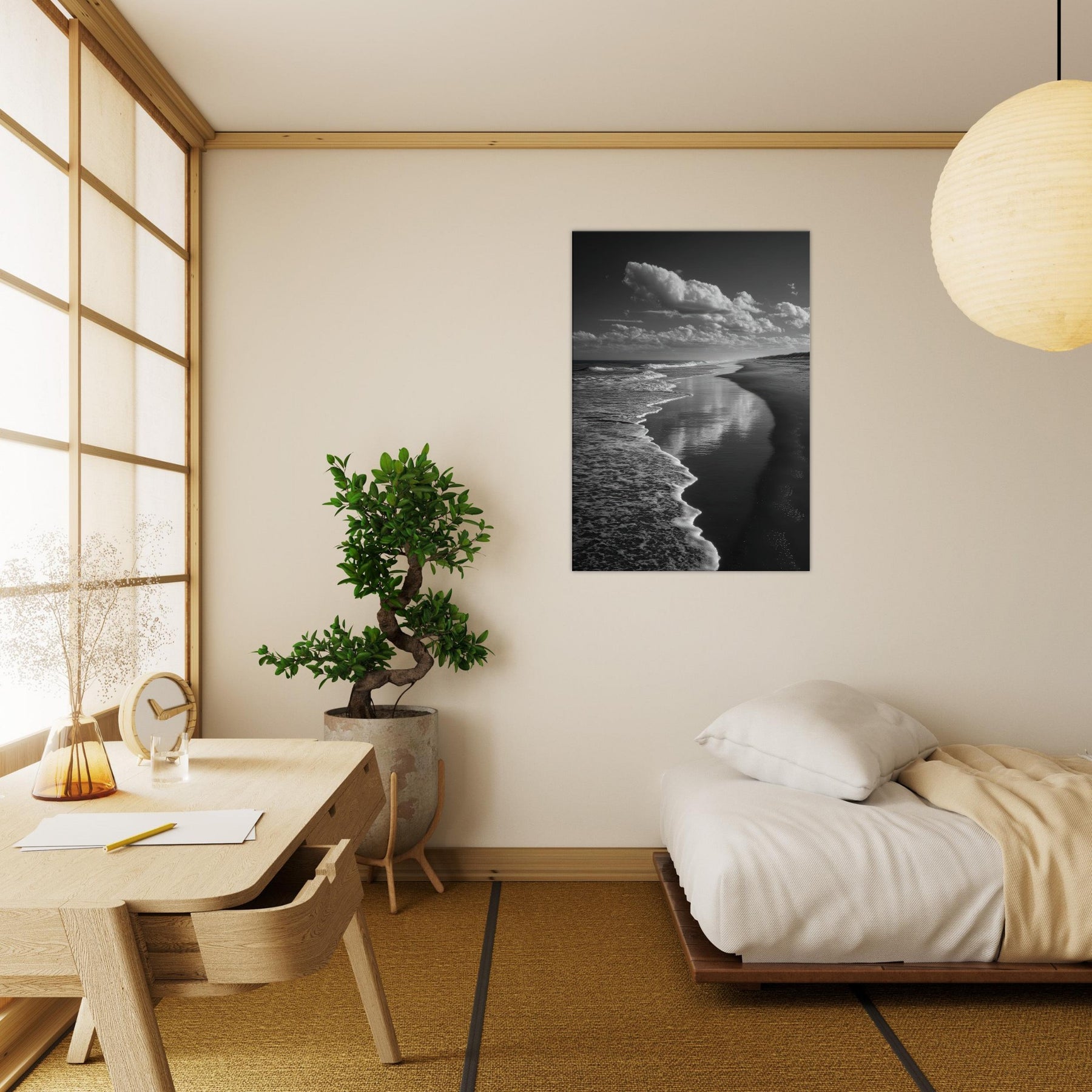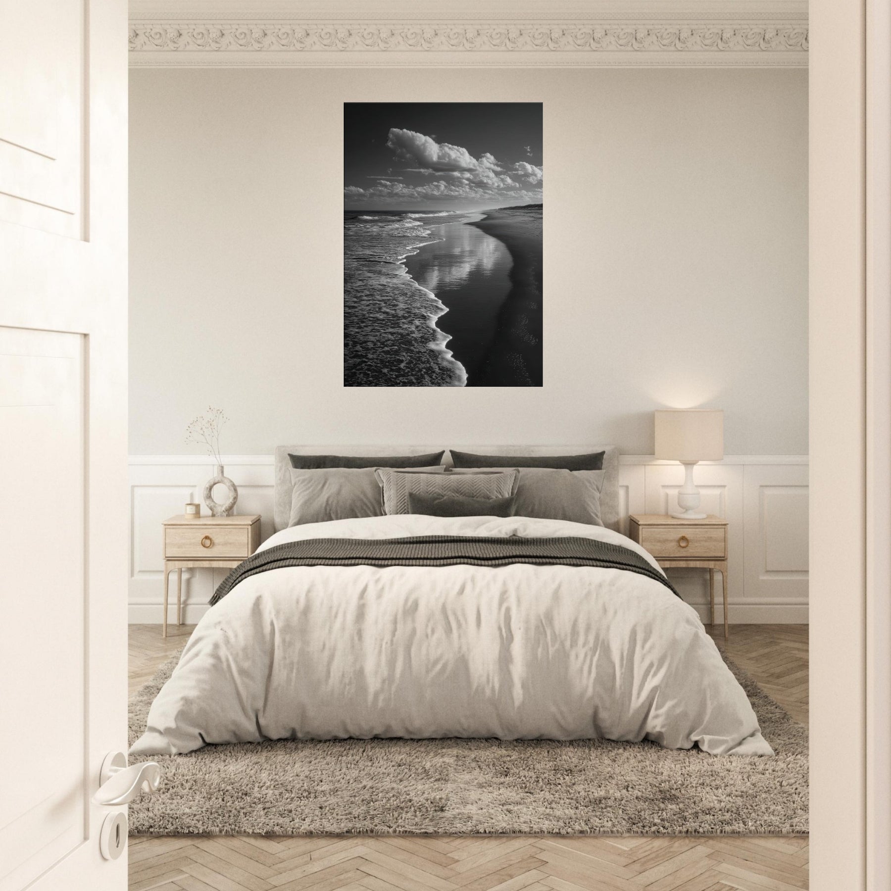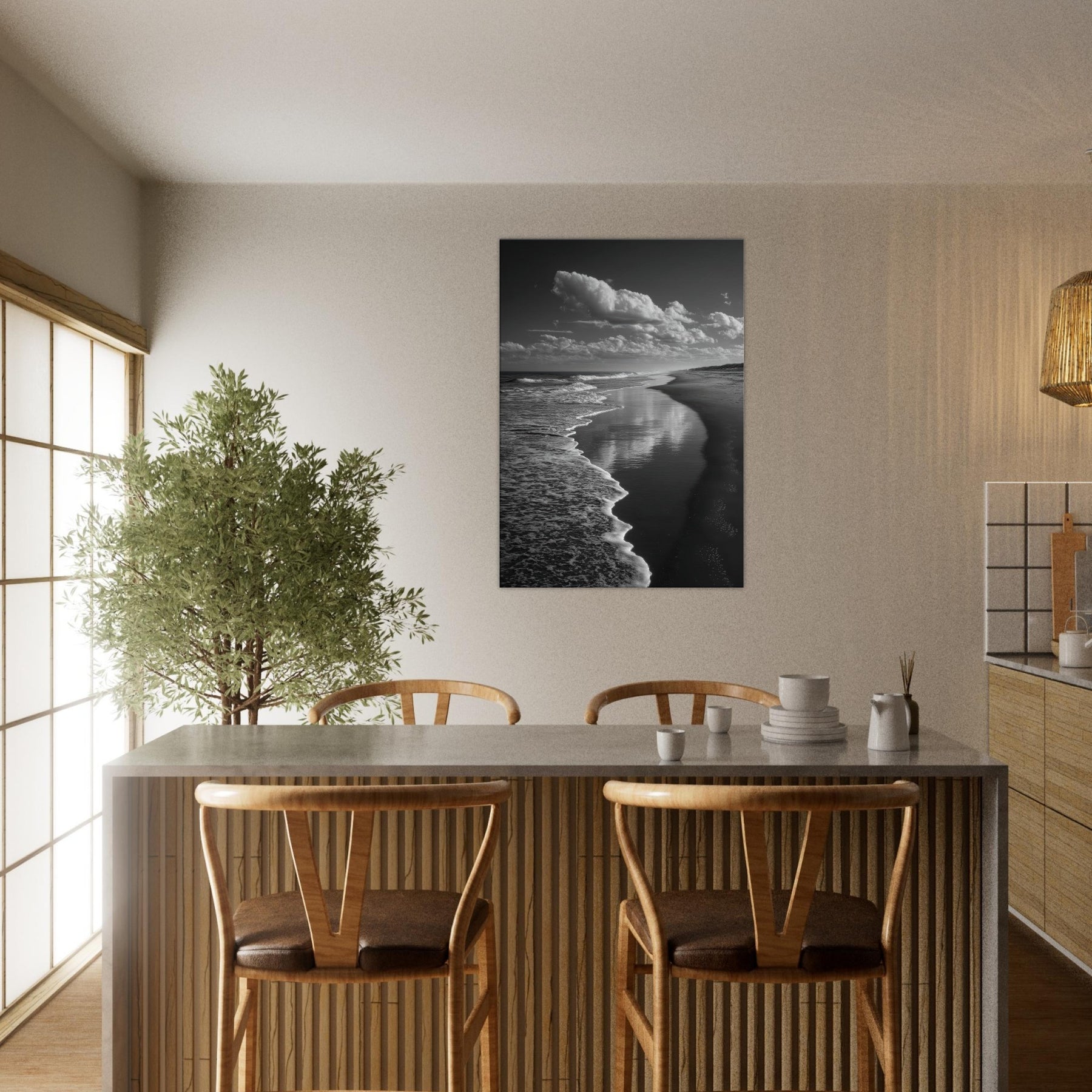 On a quiet coastline, this beach study invites you to hear the hush between tide and tide. The black and white shoreline becomes a meditation on light, shadow, and the patient rhythm of waves washing the sand. Wet surface mirrors the sky, turning simple motion into a serene mural that expands a room with depth and calm. Ideal for living rooms or bedrooms, it pairs minimalist furniture with a natural, contemplative energy a daily reminder to breathe and drift.