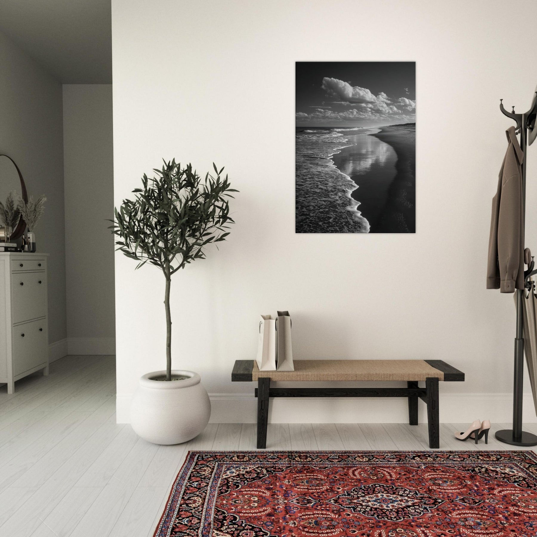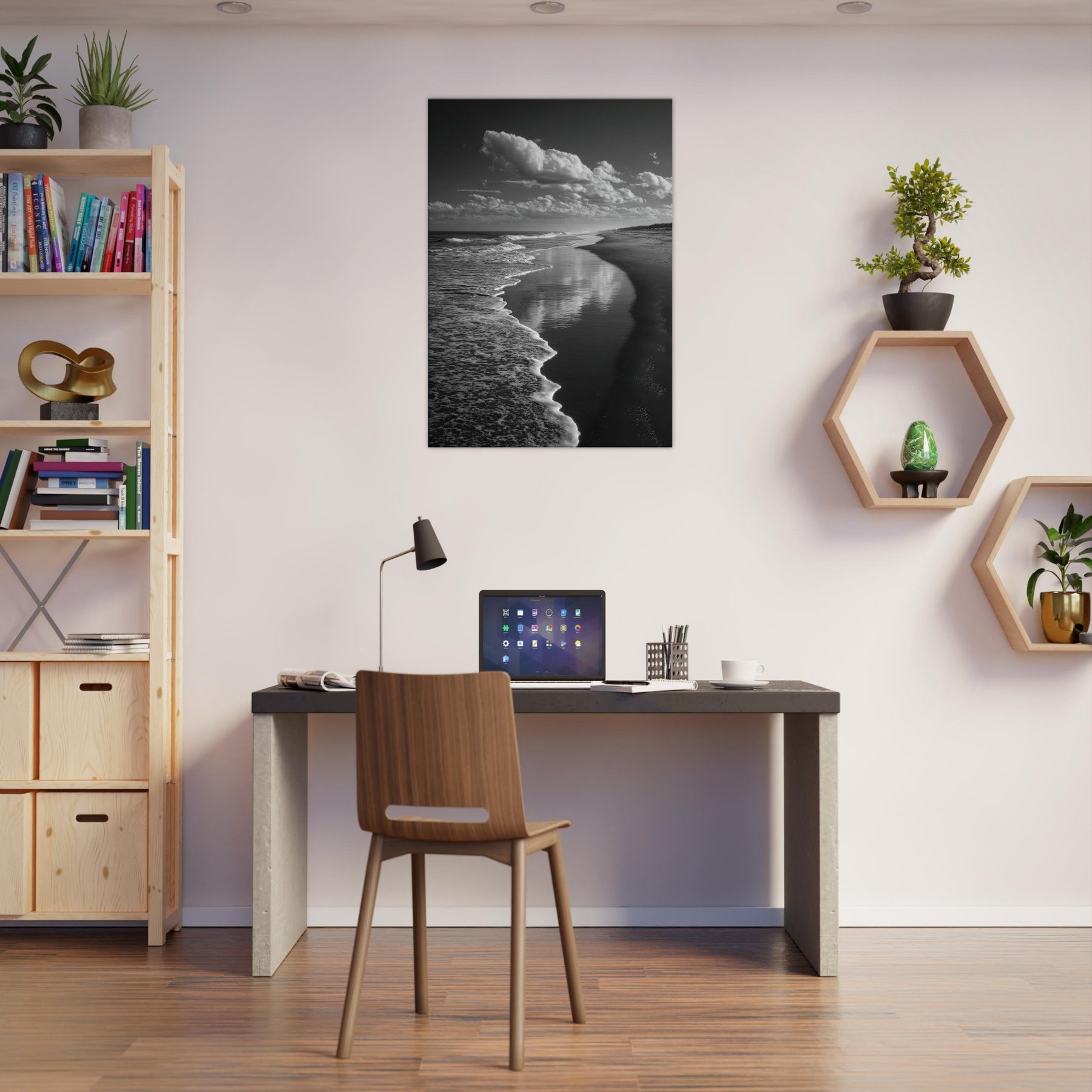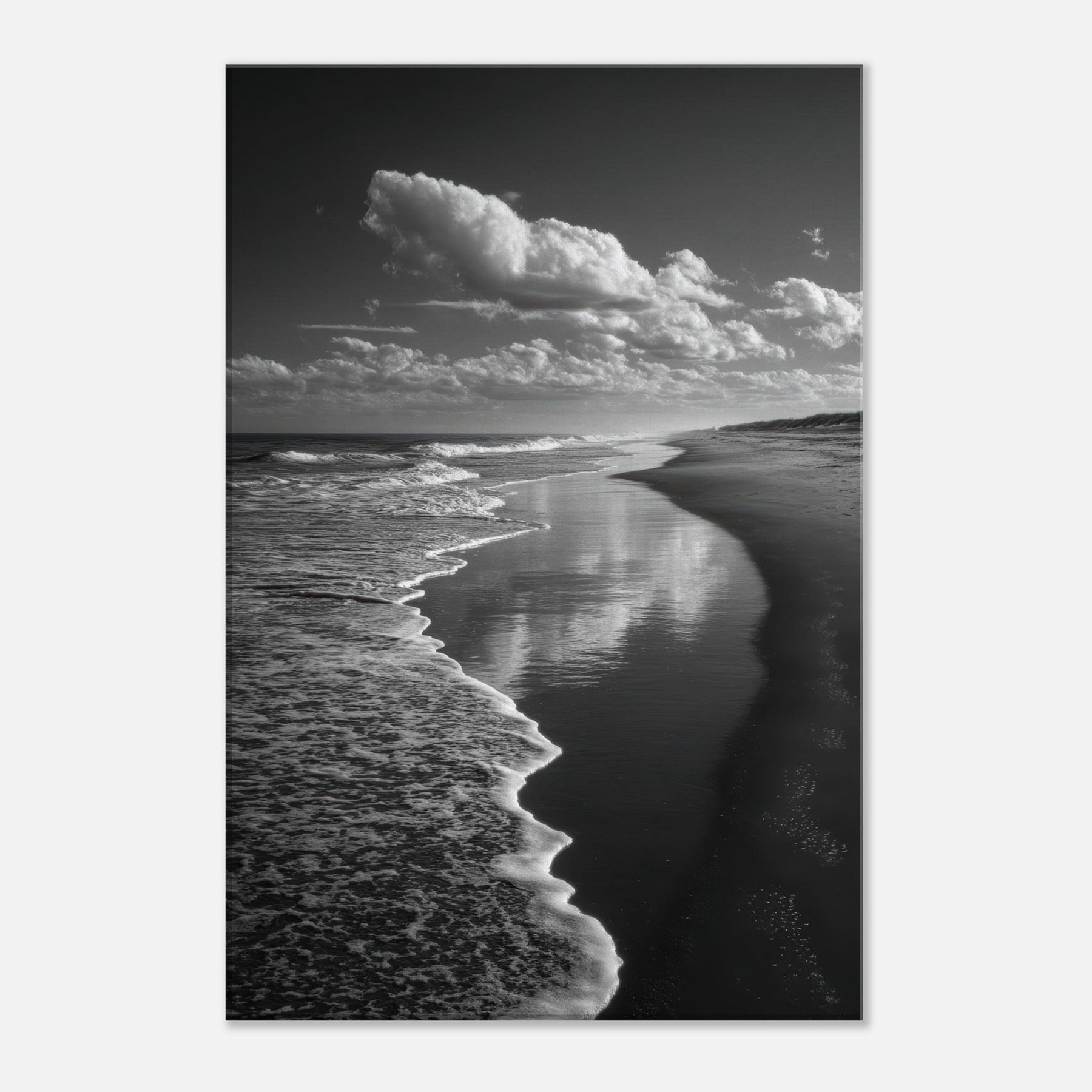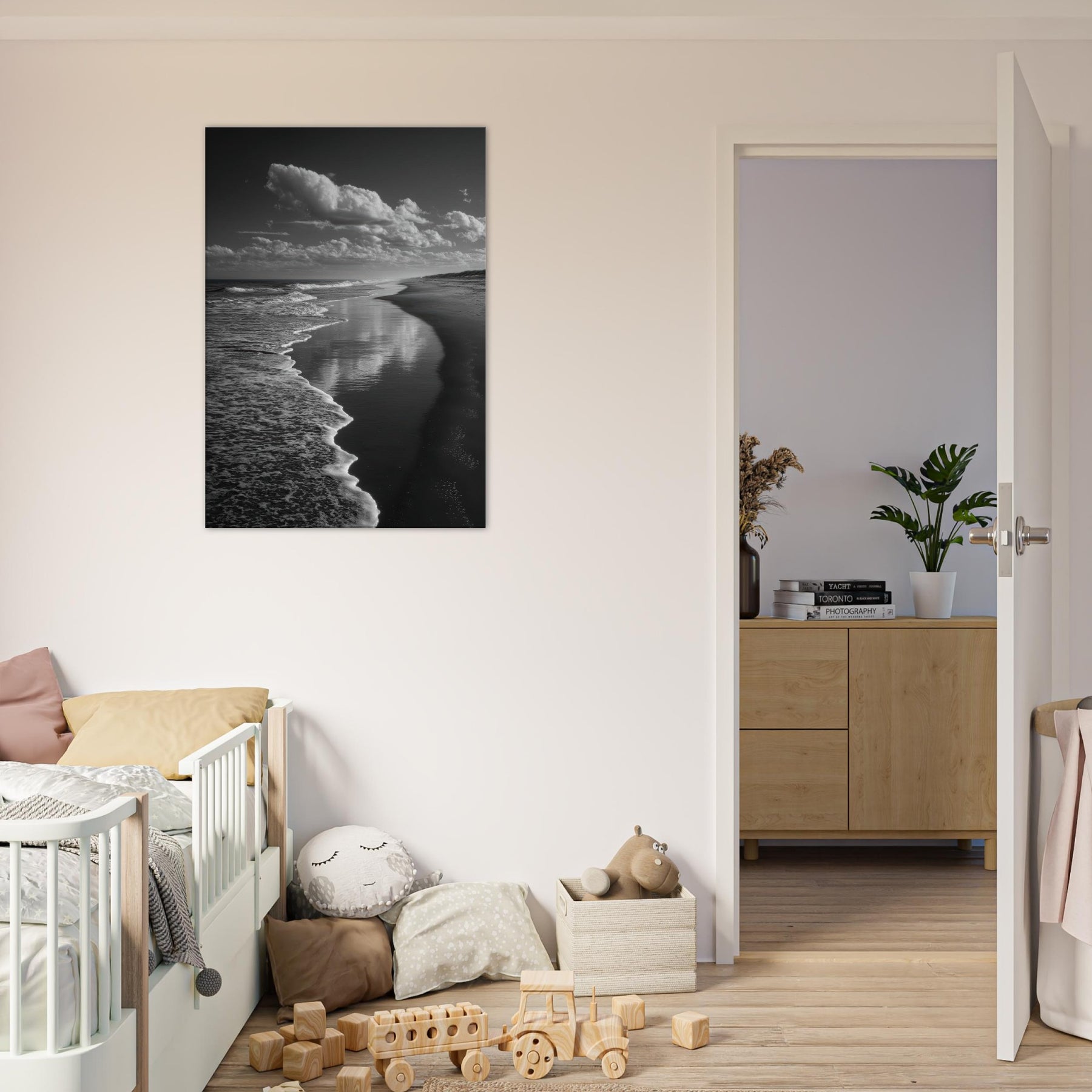 On a quiet coastline, this beach study invites you to hear the hush between tide and tide. The black and white shoreline becomes a meditation on light, shadow, and the patient rhythm of waves washing the sand. Wet surface mirrors the sky, turning simple motion into a serene mural that expands a room with depth and calm. Ideal for living rooms or bedrooms, it pairs minimalist furniture with a natural, contemplative energy a daily reminder to breathe and drift.