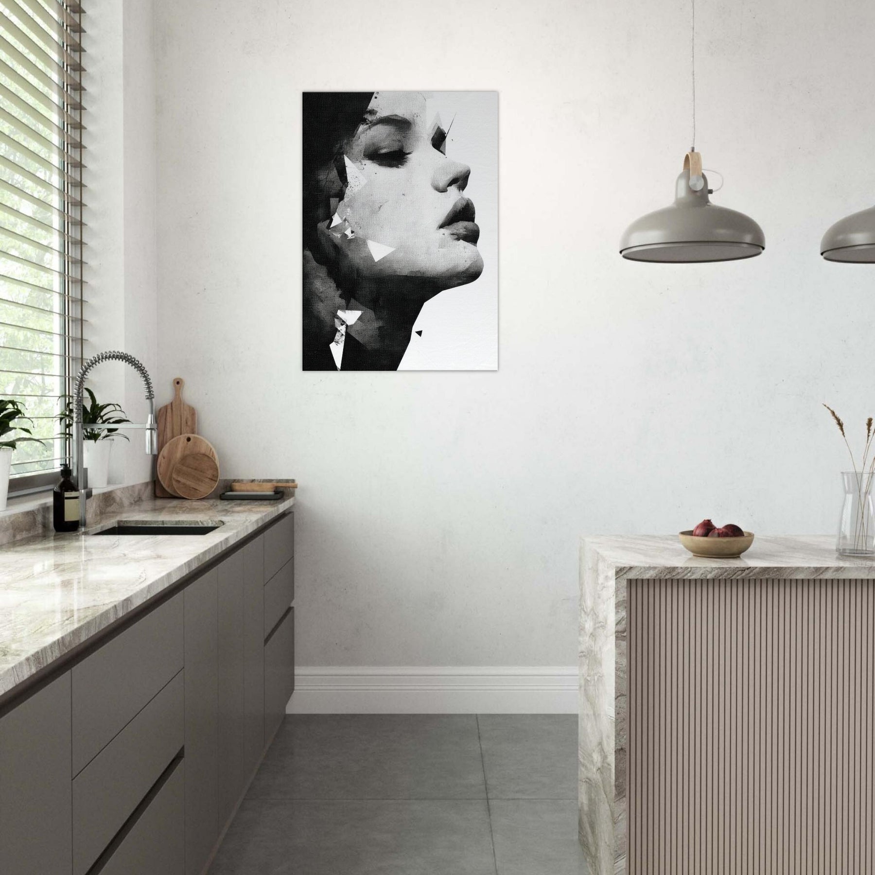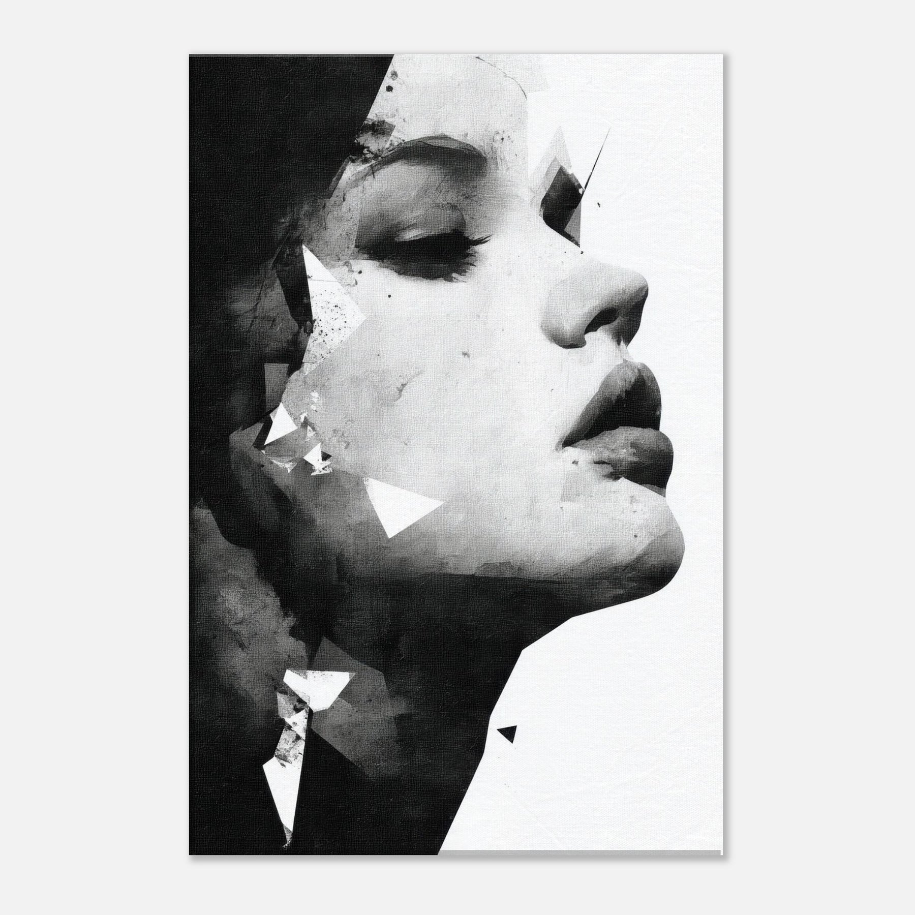Centered on the Abstract Female Face, this black and white study unfolds like a whisper of light and shadow. Fragmented facets glide across the cheek and jaw, creating a quiet tension that invites slow, meditative looking.