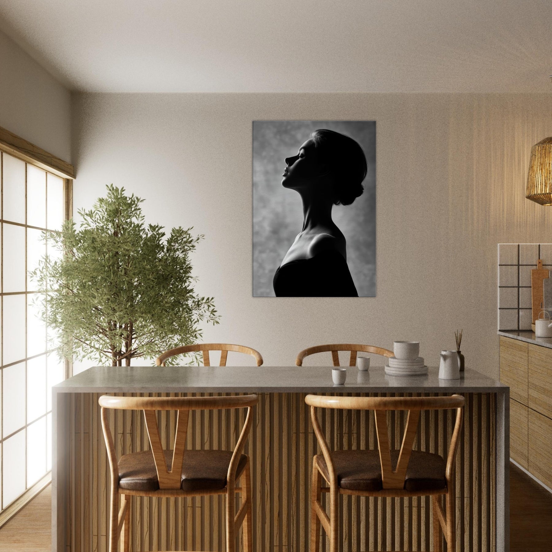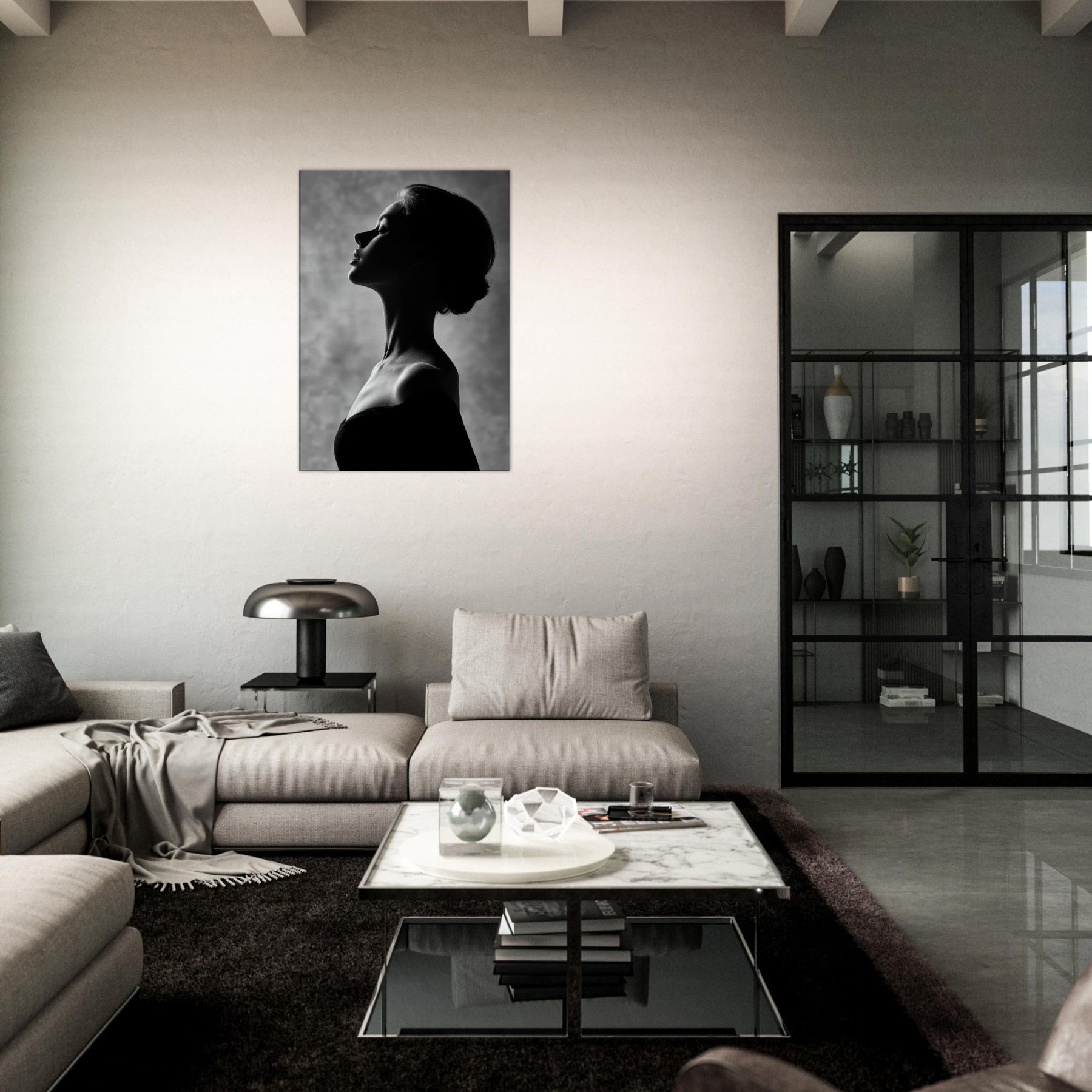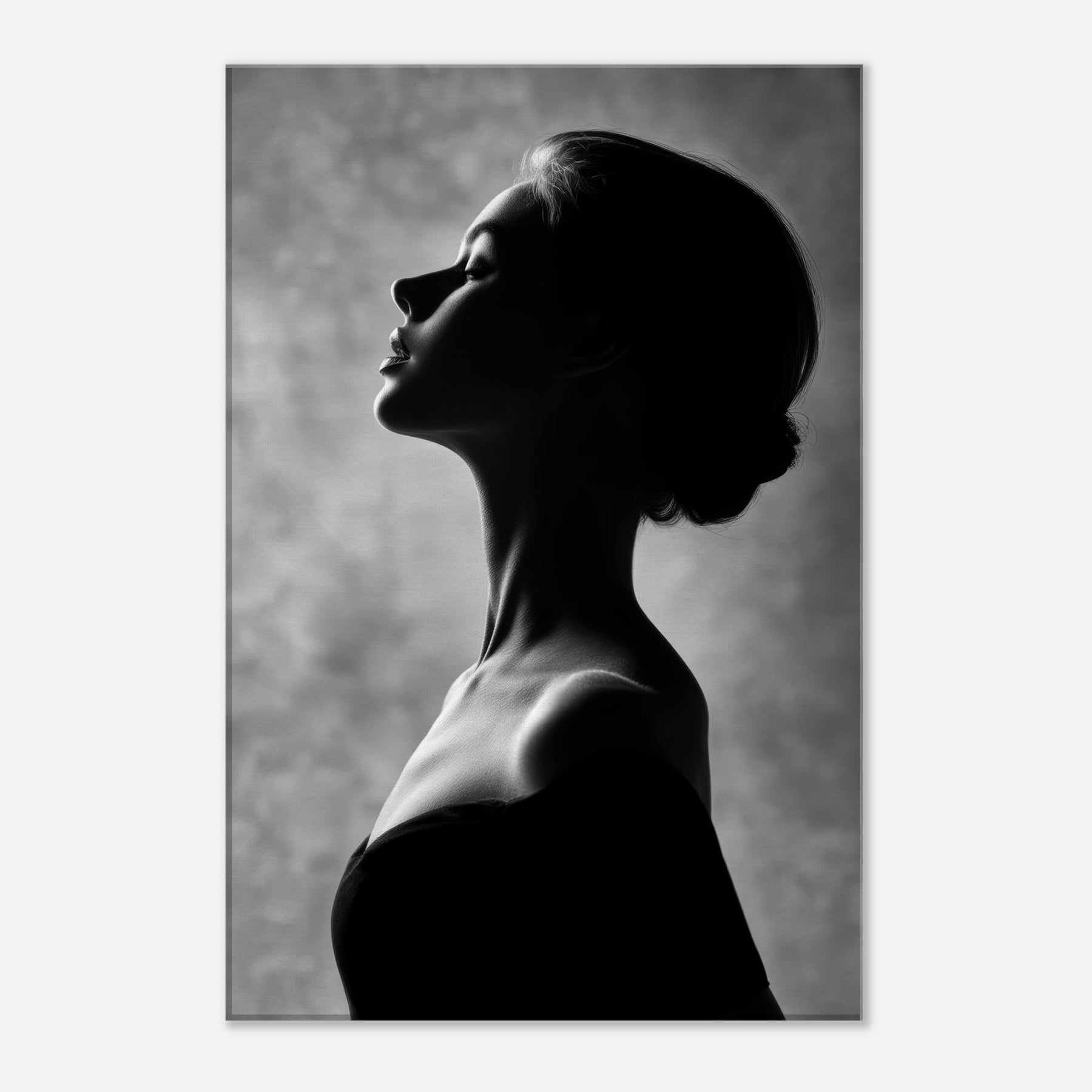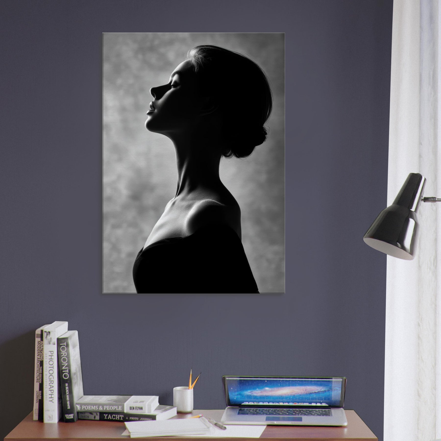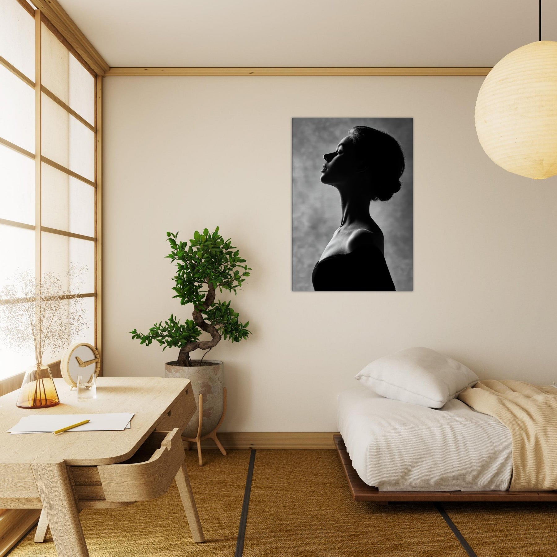 The silhouette steps from shadow into stillness, rendered in bold black and white. Every curve of the neck, shoulder, and the sweep of the bun feels sculpted by light, a moment of poised motion that remains exquisitely calm.
