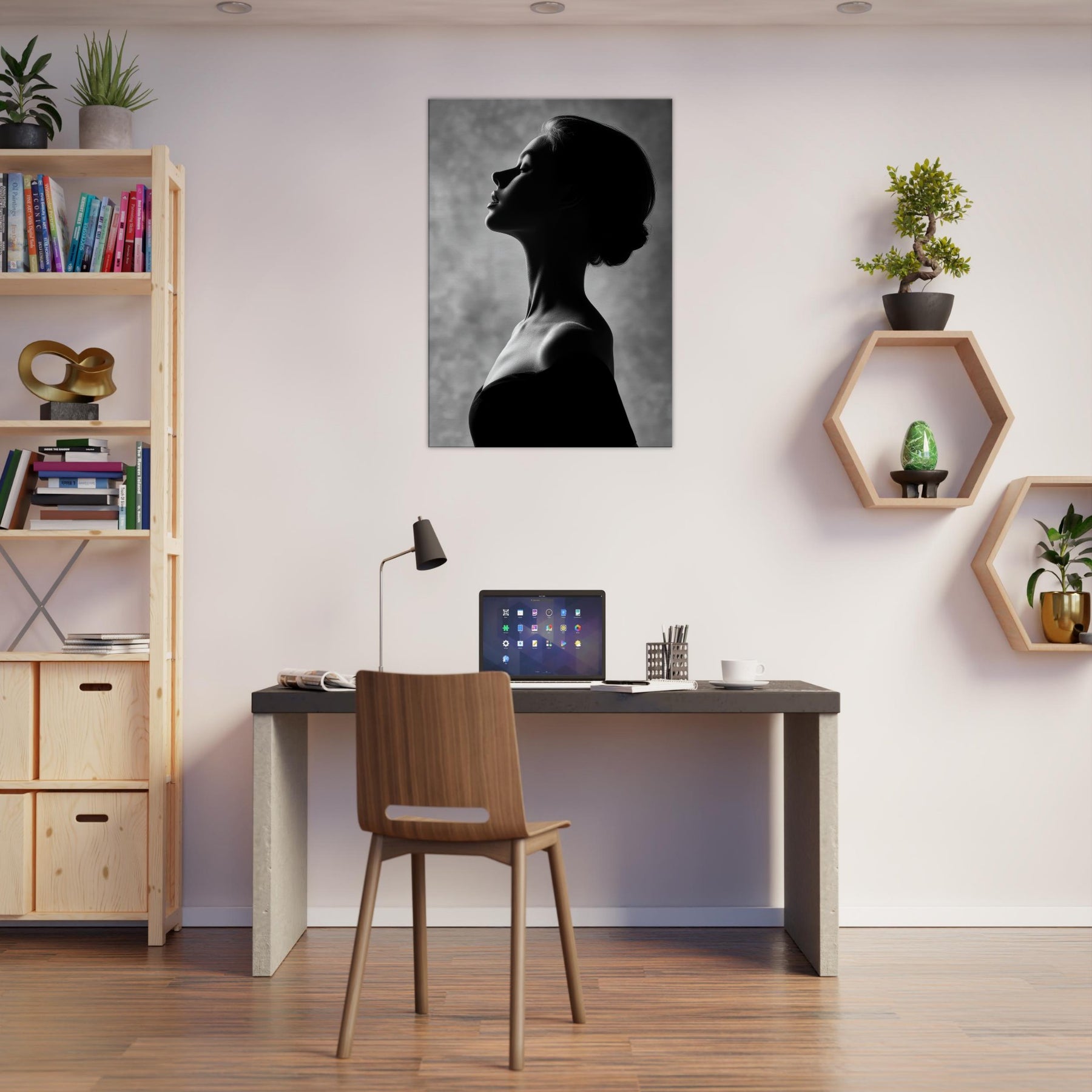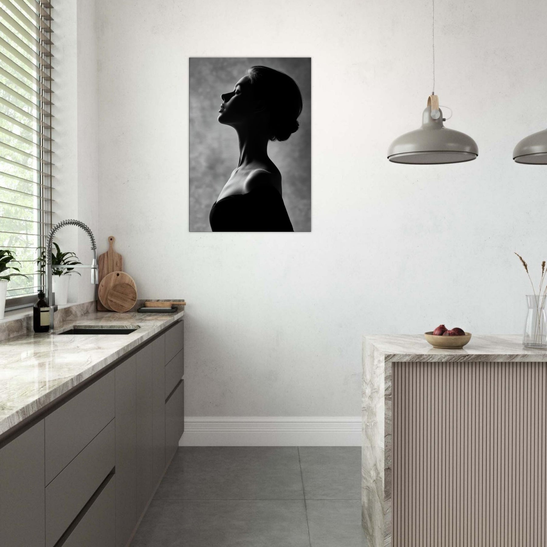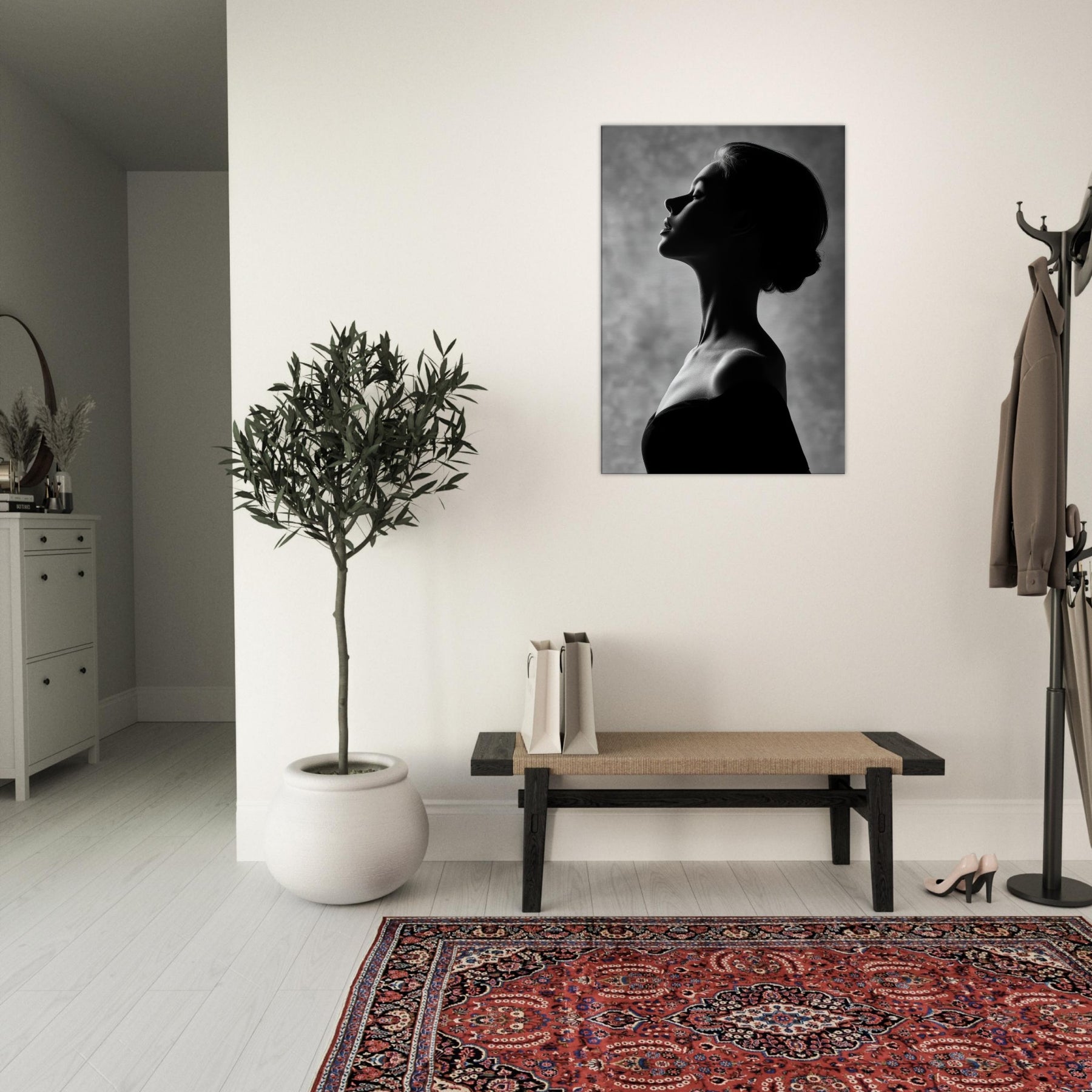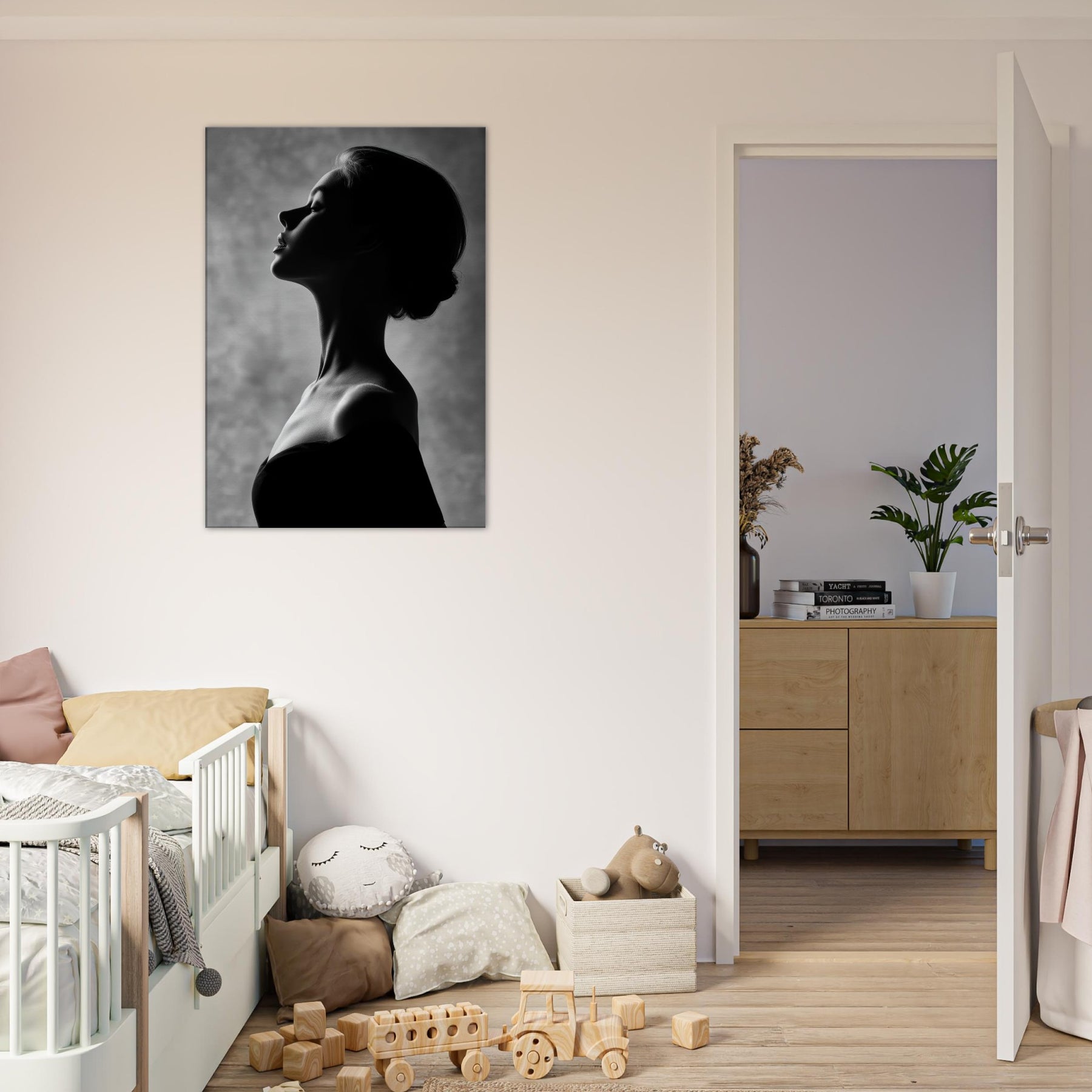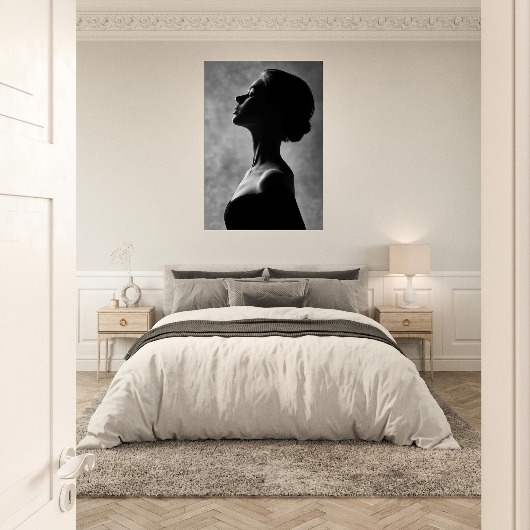 The silhouette steps from shadow into stillness, rendered in bold black and white. Every curve of the neck, shoulder, and the sweep of the bun feels sculpted by light, a moment of poised motion that remains exquisitely calm.
