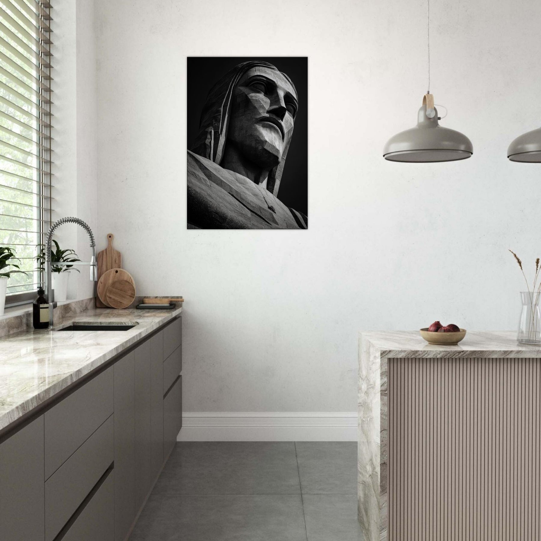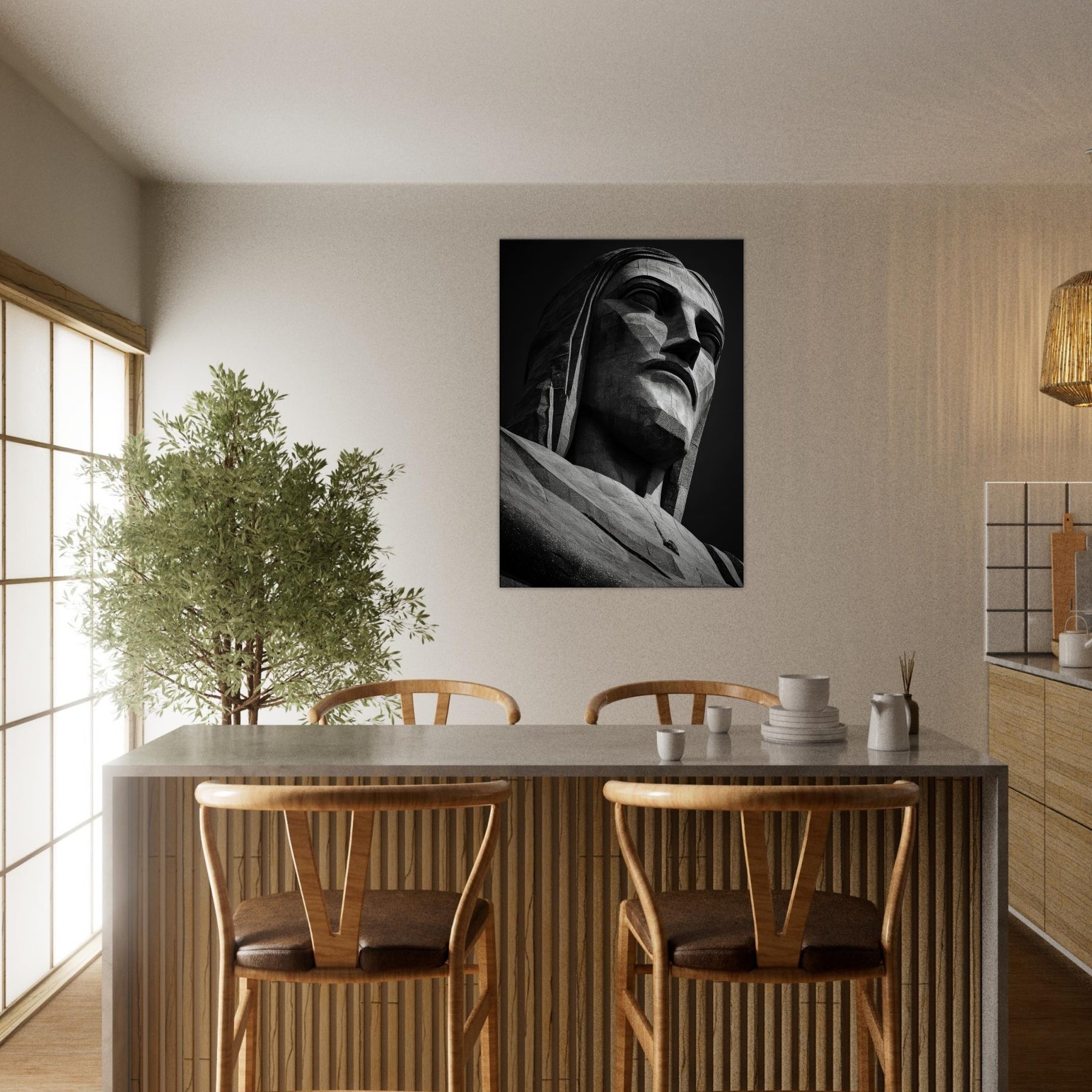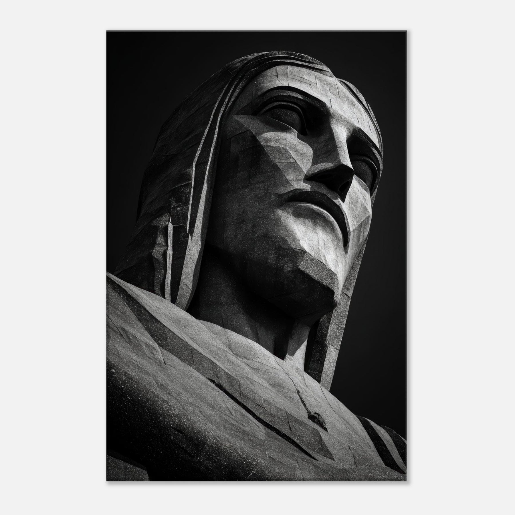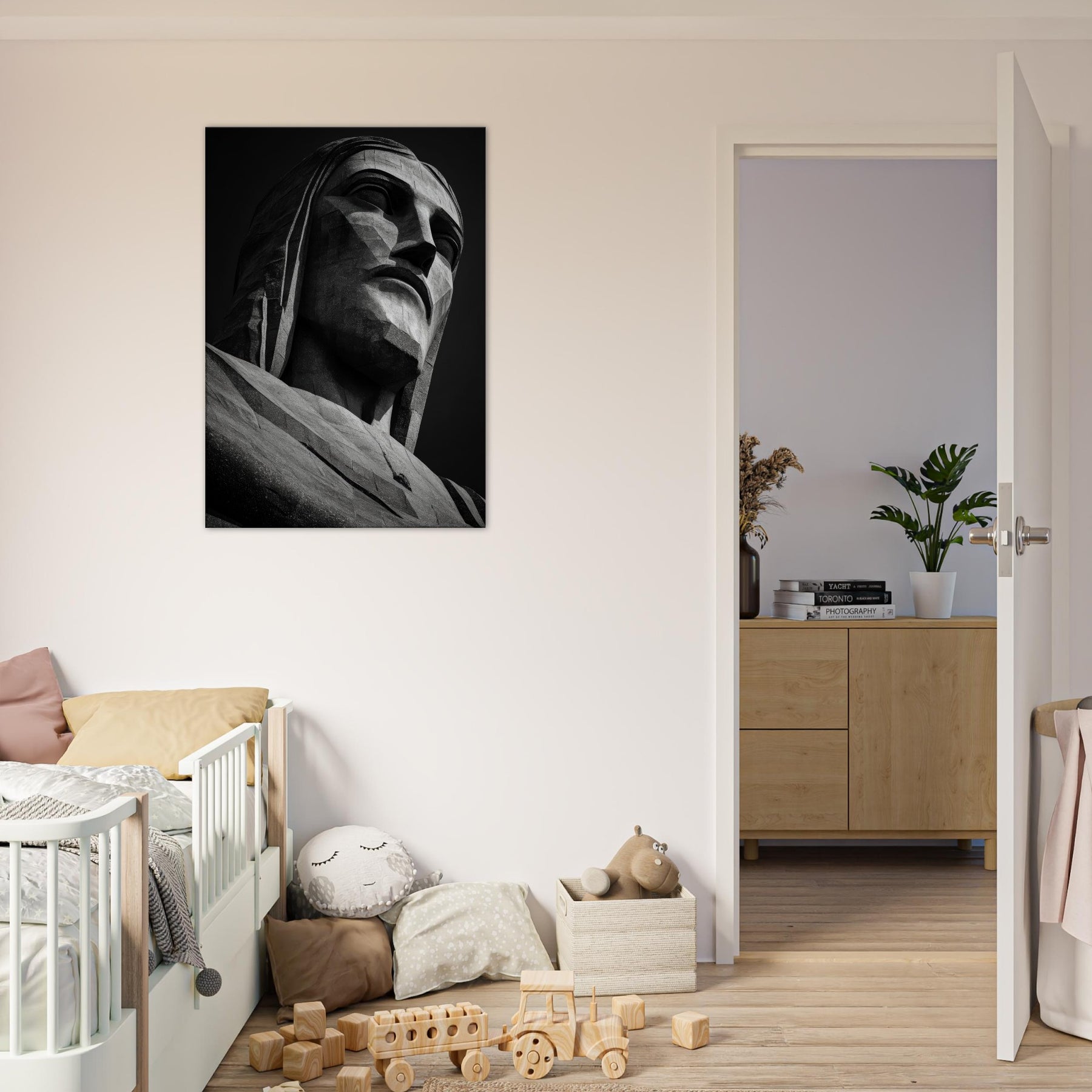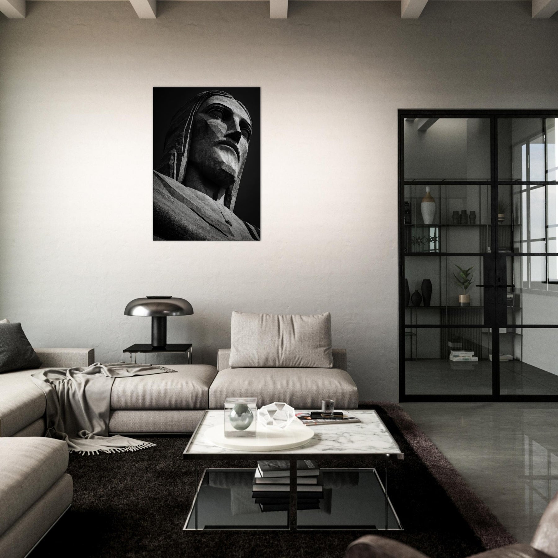 Christ the Redeemer rises in stark, sculptural profile, captured in radiant blacks and gentle grays. This black and white composition reduces a city landmark to weathered planes of light and shadow, inviting a contemplative pause in any room.