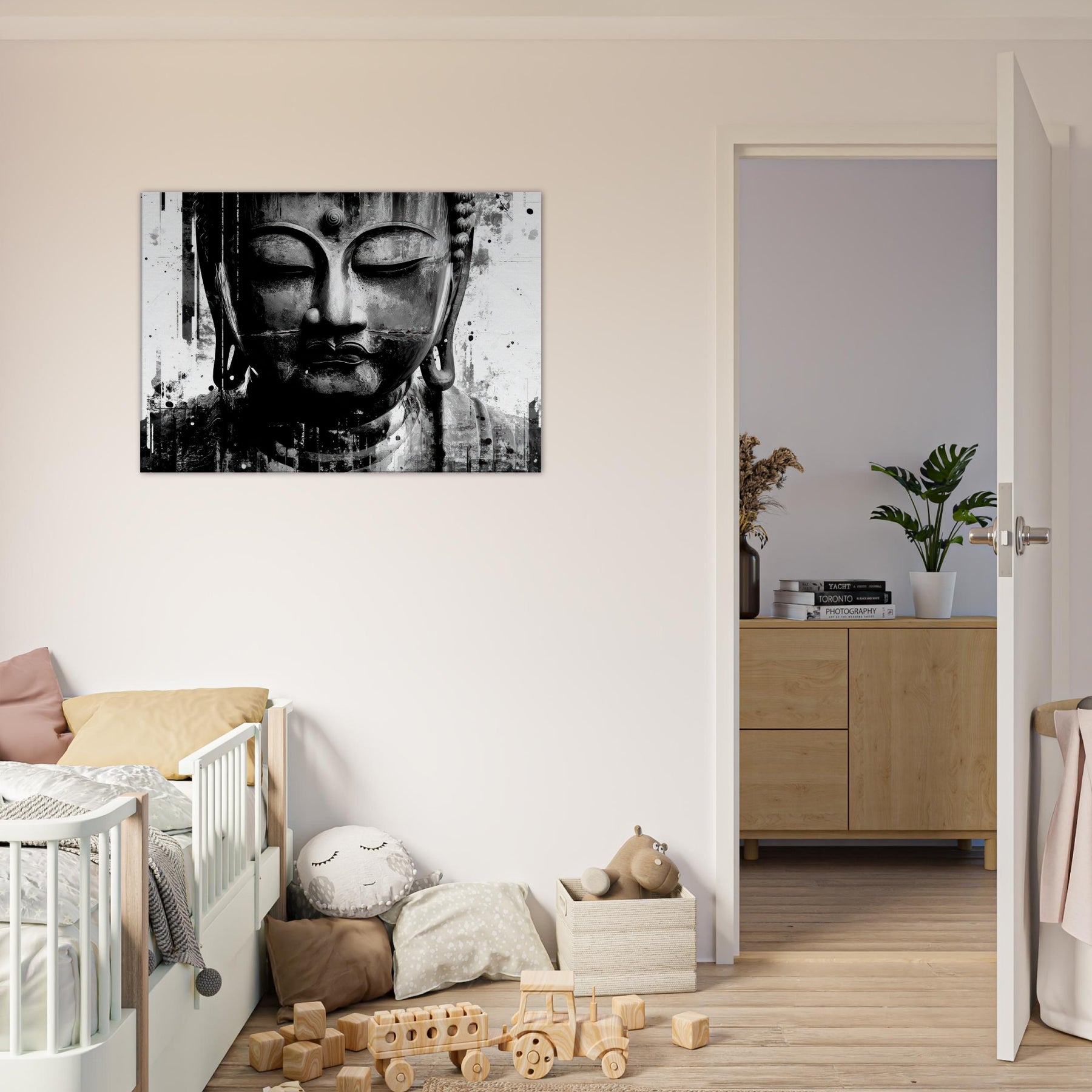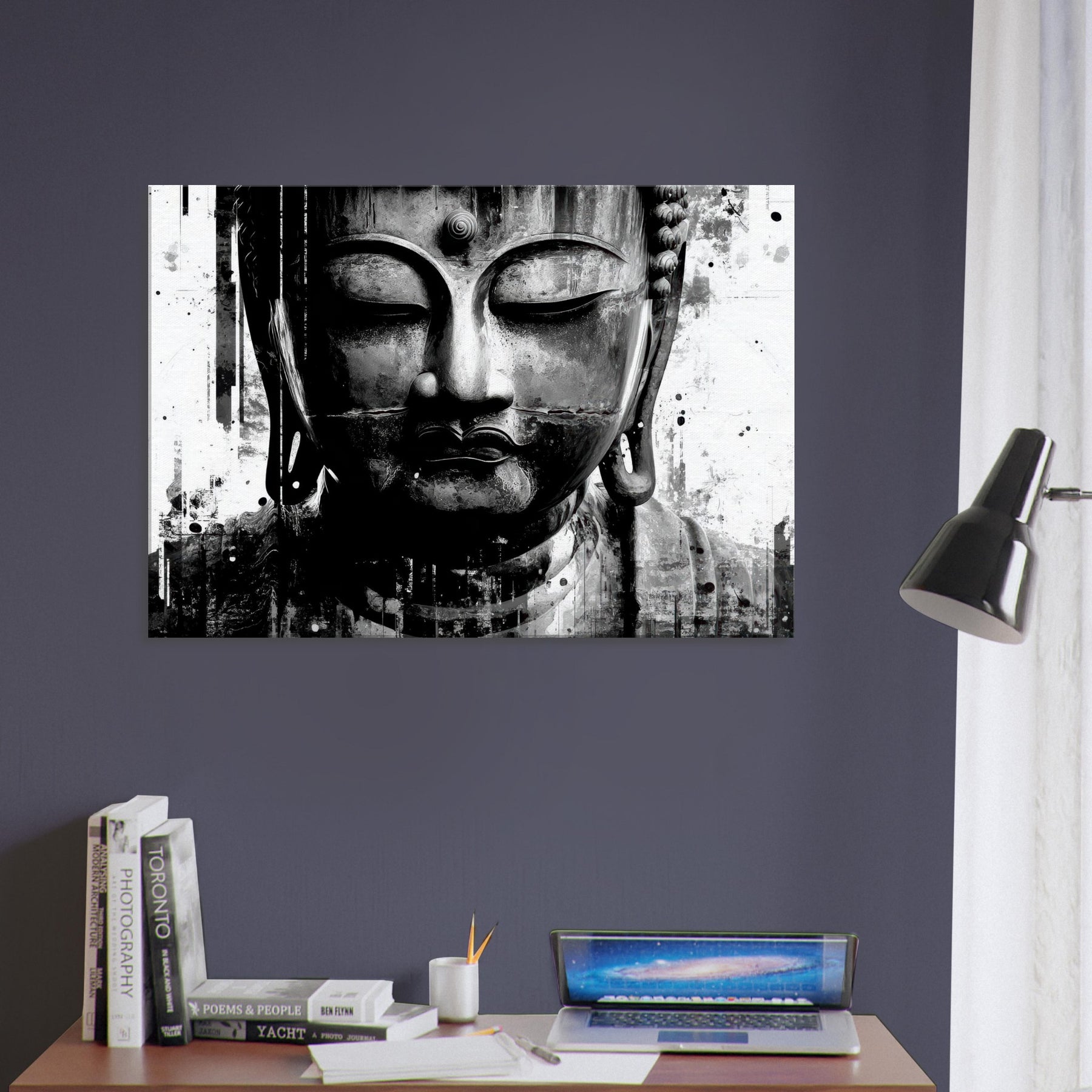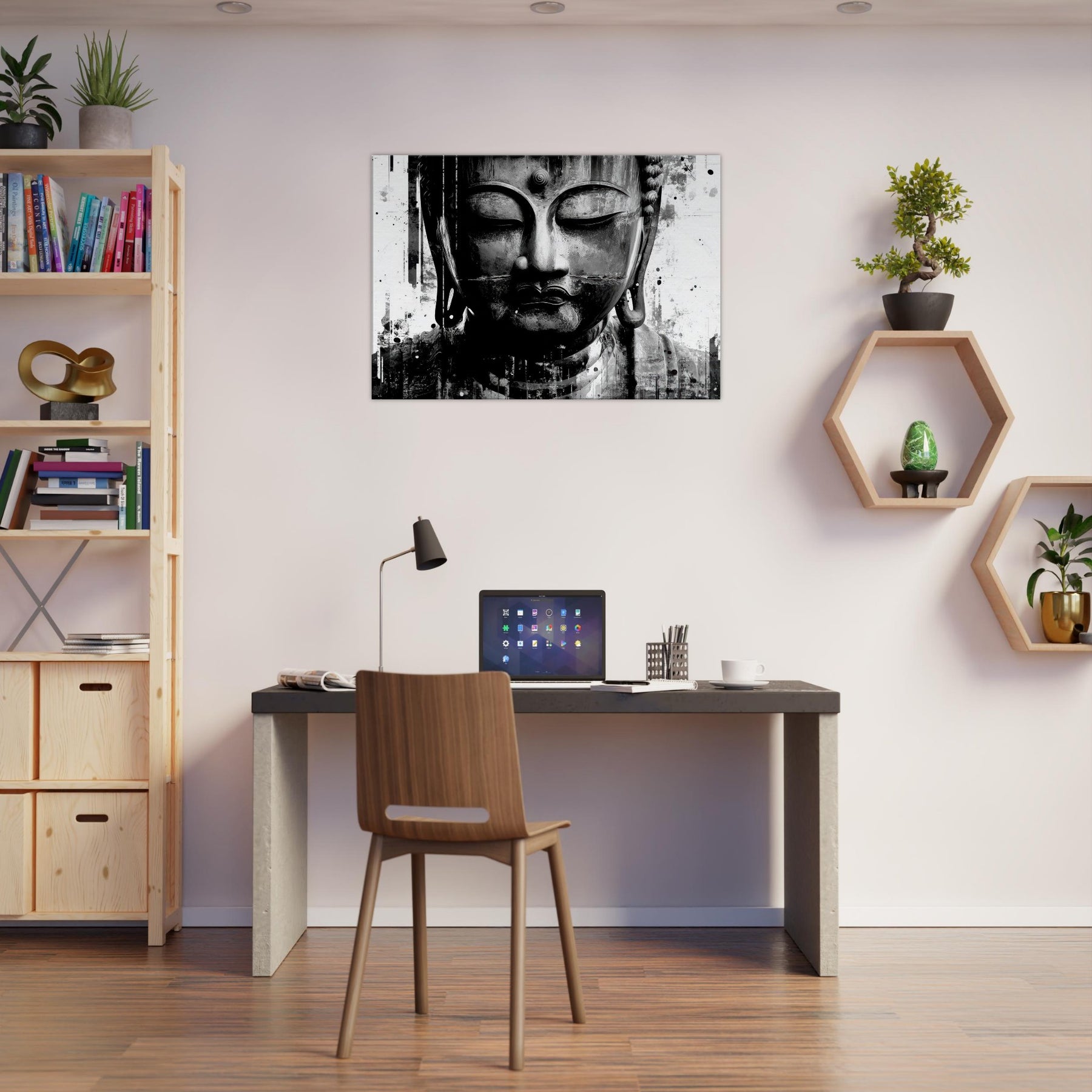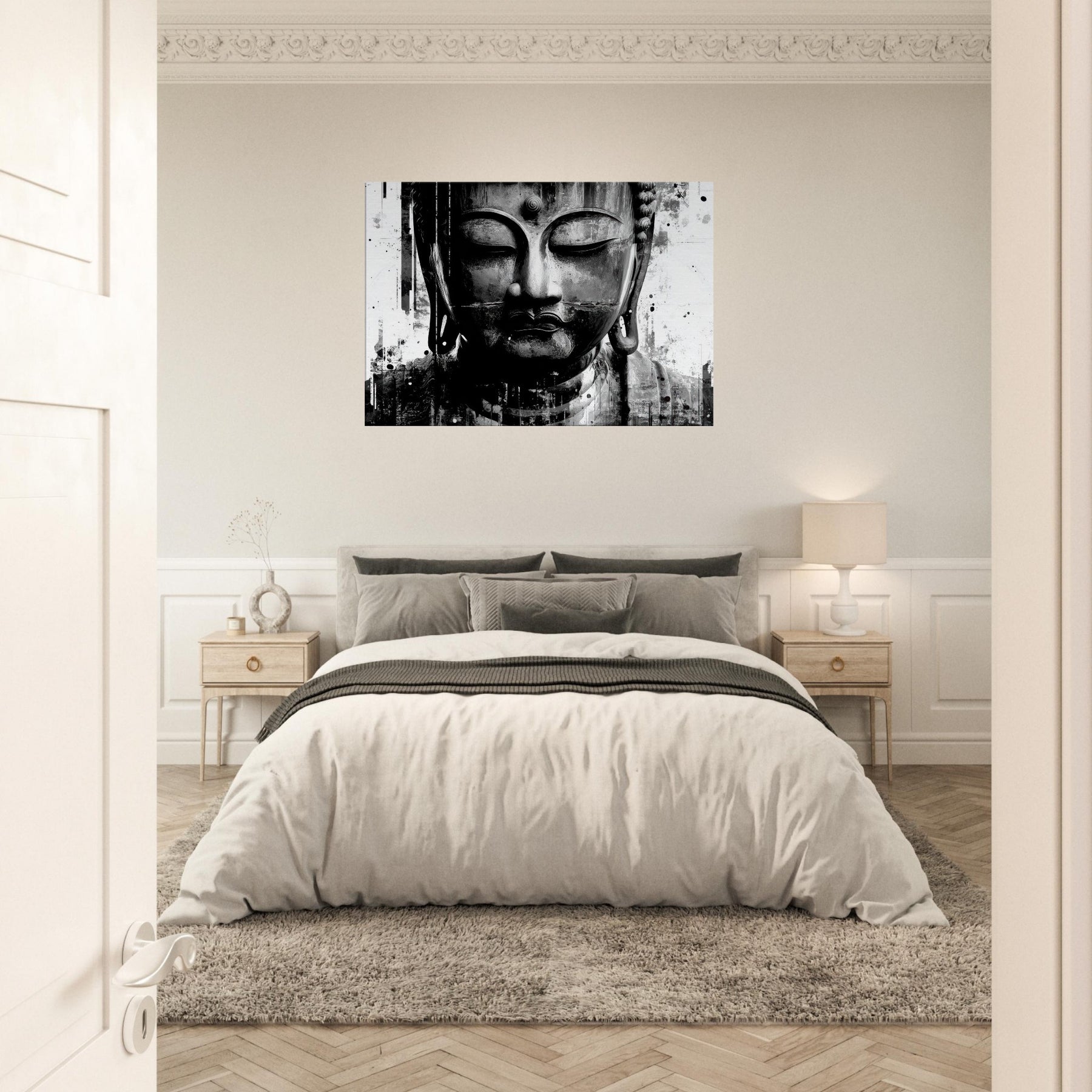 Suspended in timeless calm, it turns a wall into a shrine of presence perfect for a living space that treasures reflection, slow mornings, and deep conversations. Its mystical aura pairs with minimal furnishings to create a sanctuary where serenity and style coexist in effortless grace. The central subject is Bodhisattva (Abstract).