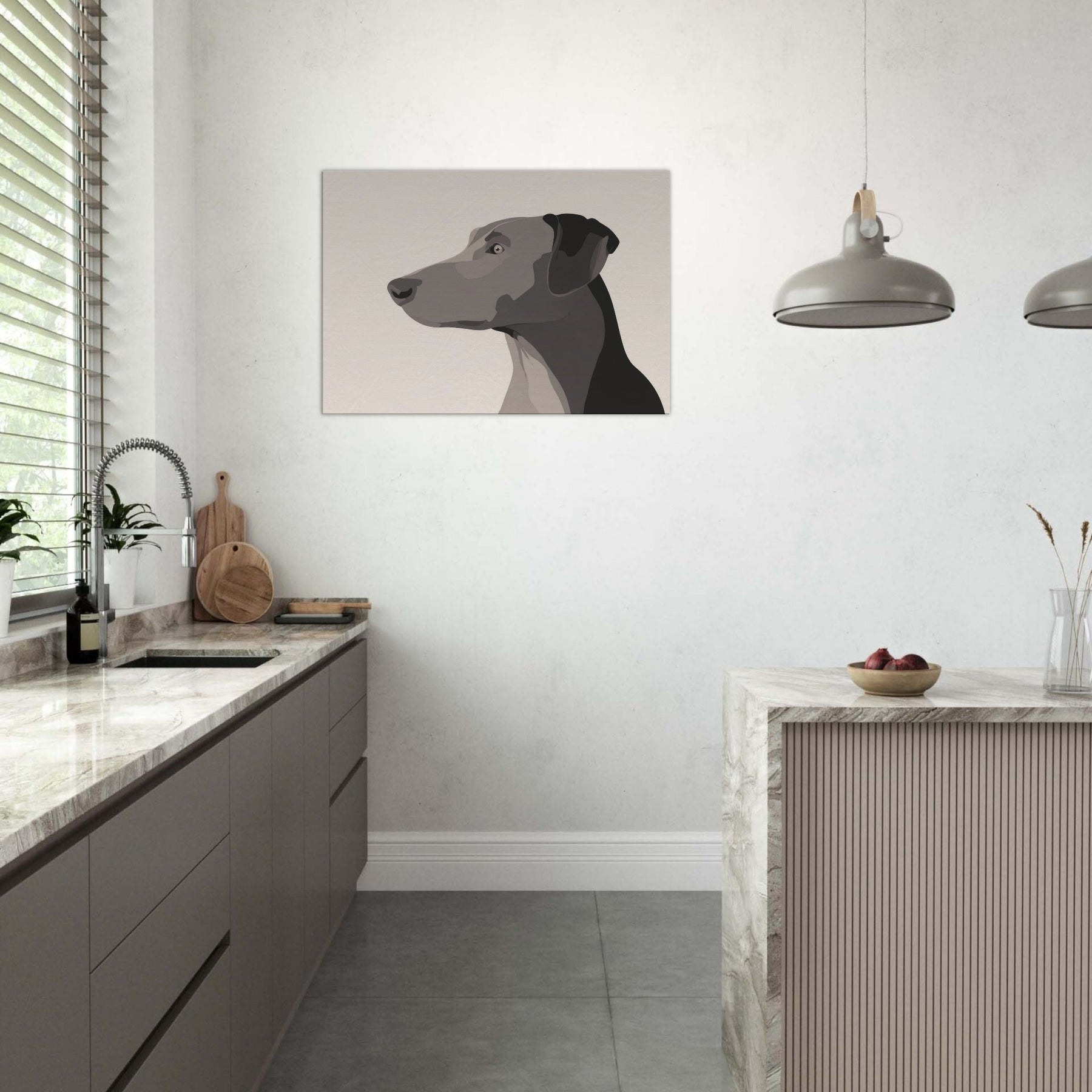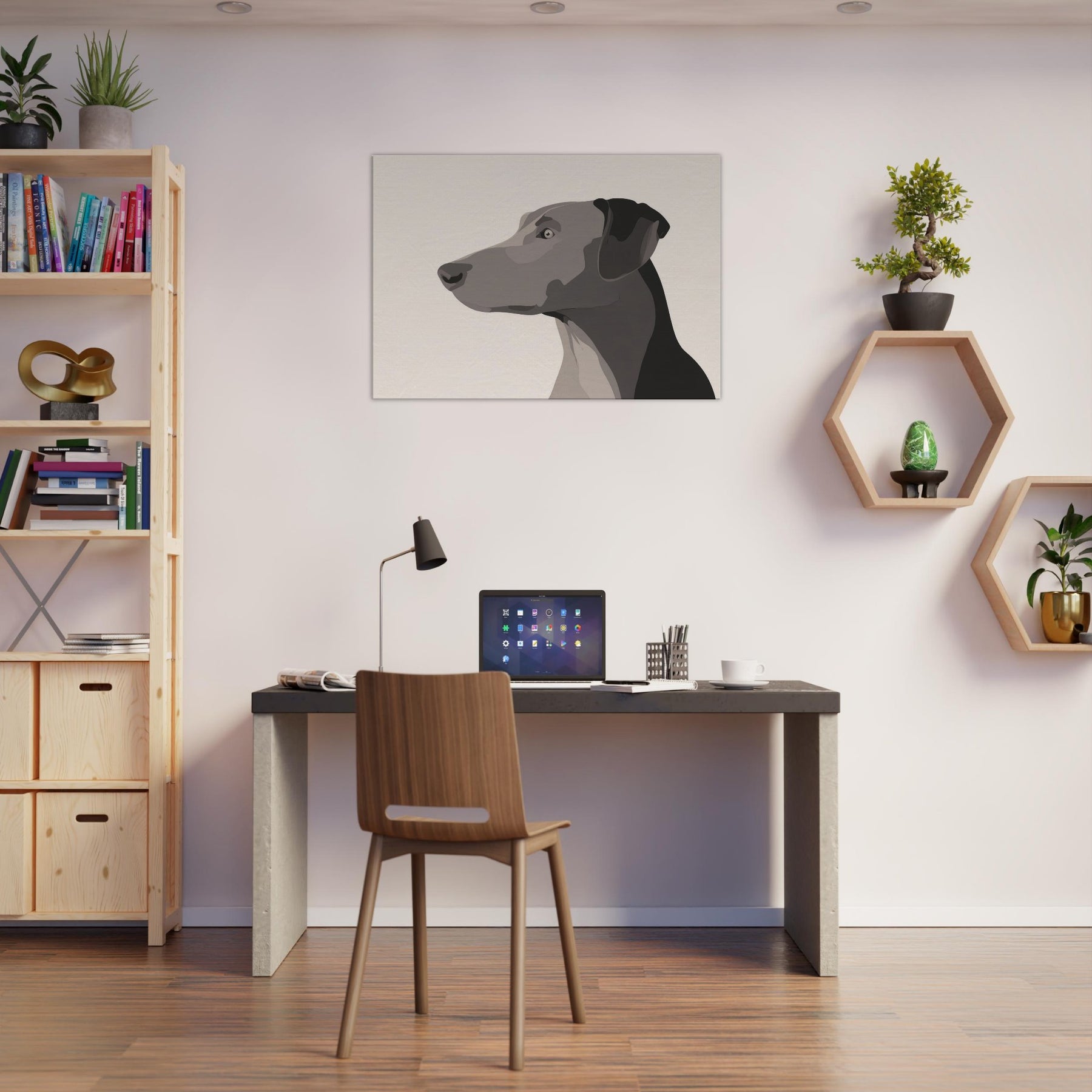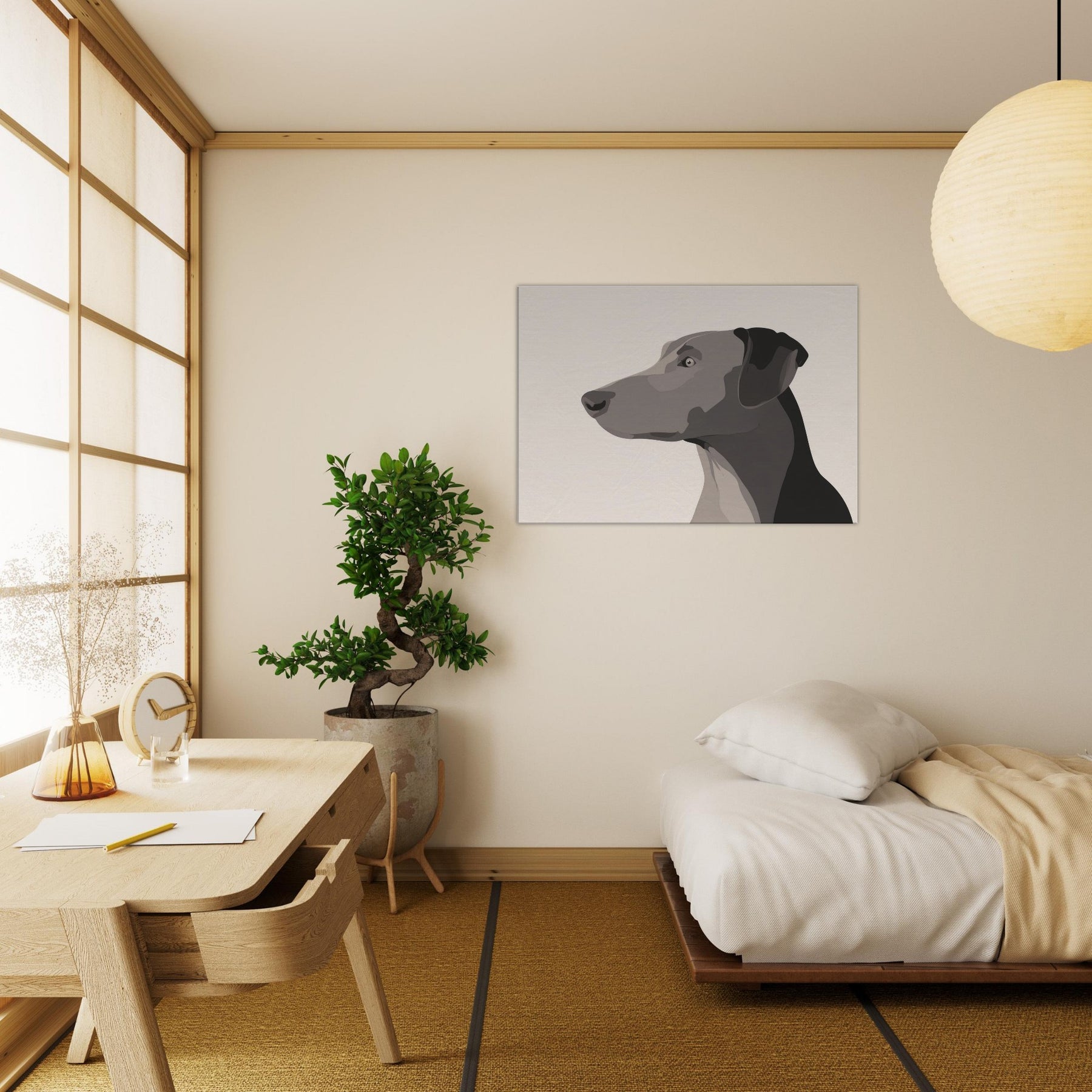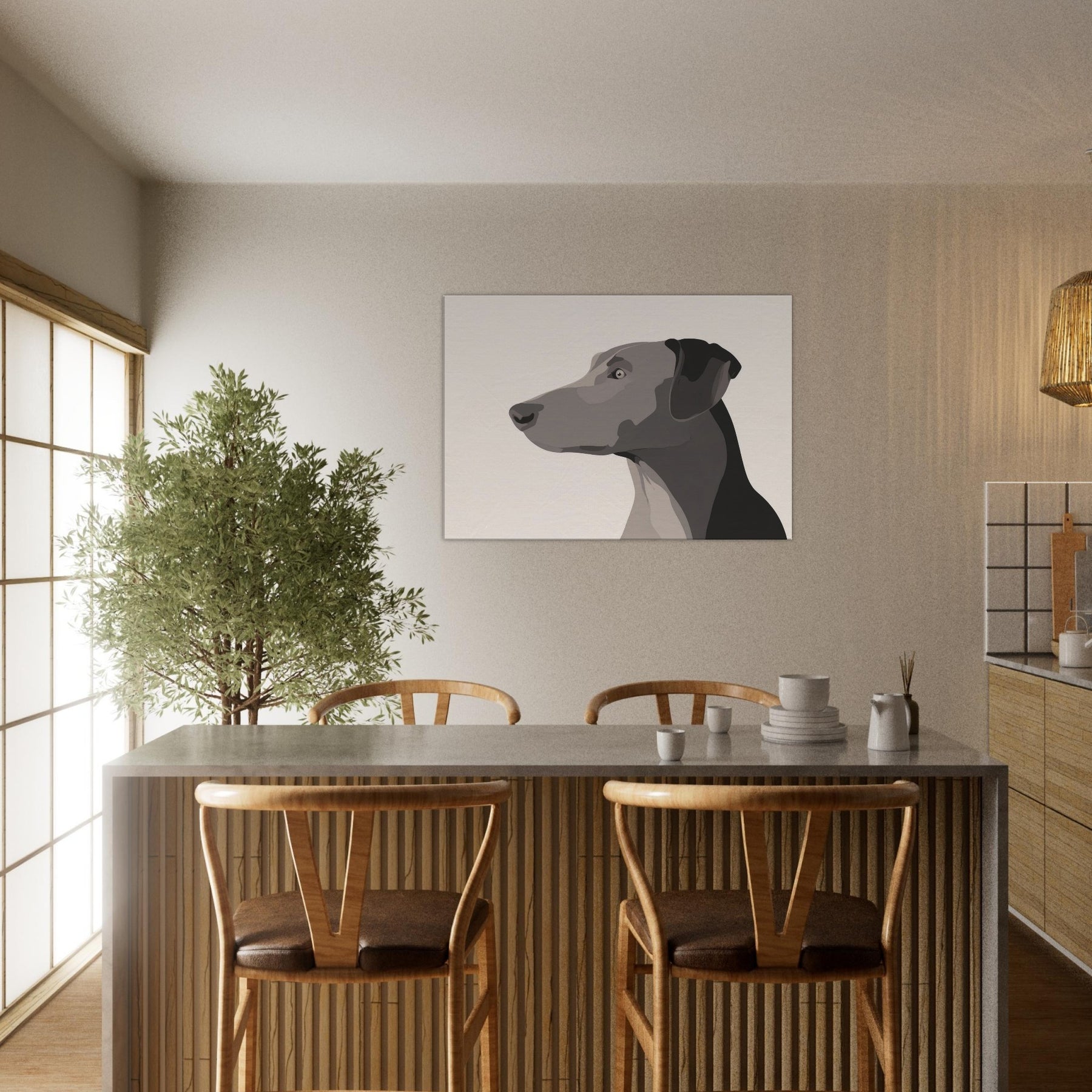 In the hush of a well lit room, this Dog gazes beyond the frame, a study in restraint and grace. The minimalist form uses layered, tonal blocks to suggest depth without clutter, inviting the eye to rest on the animal's quiet presence. It breathes warmth into a neutral wall, catching light at different angles and turning a simple space into a sanctuary. Perfect for a living area or hallway, it pairs with natural textures and soft textiles, offering companionship without words.