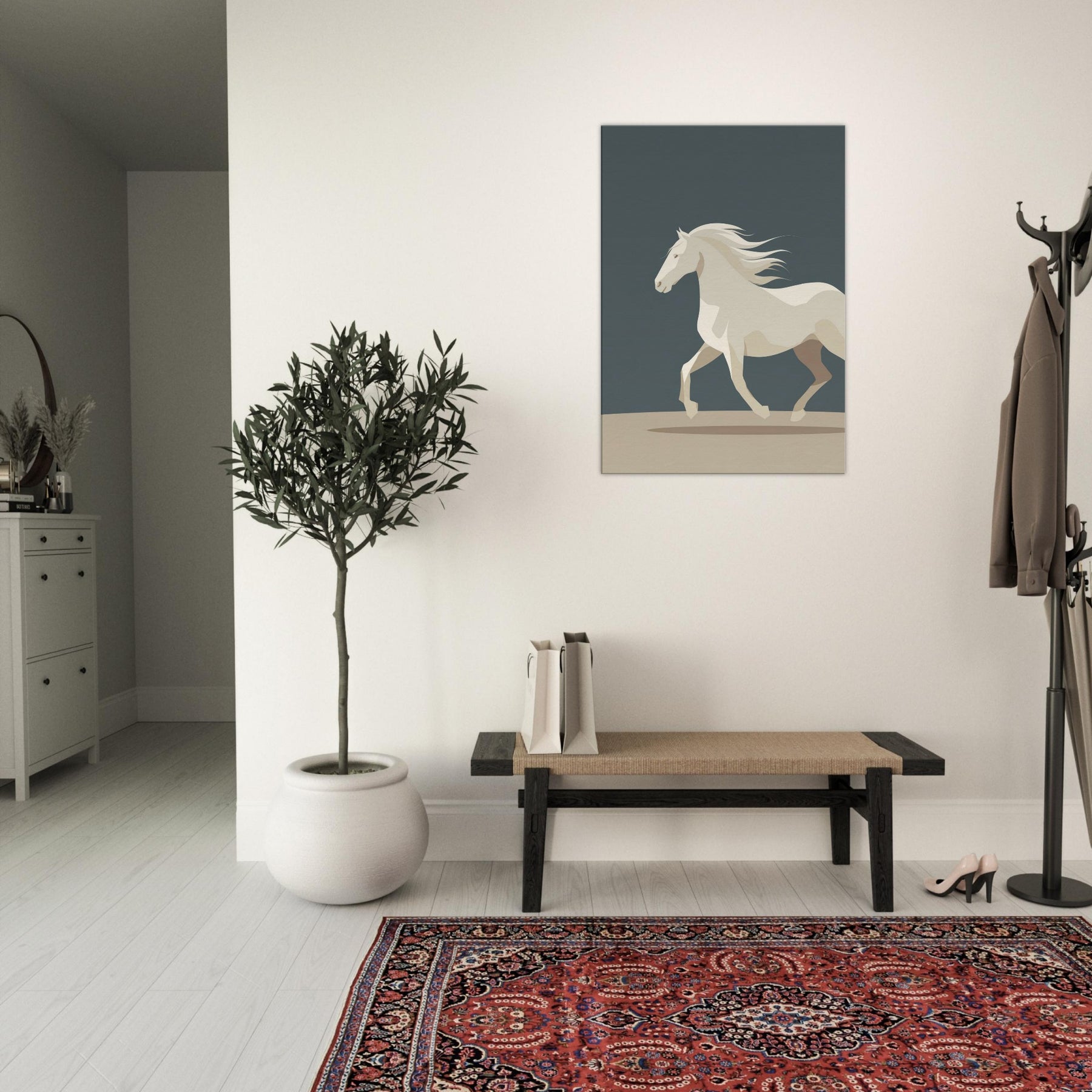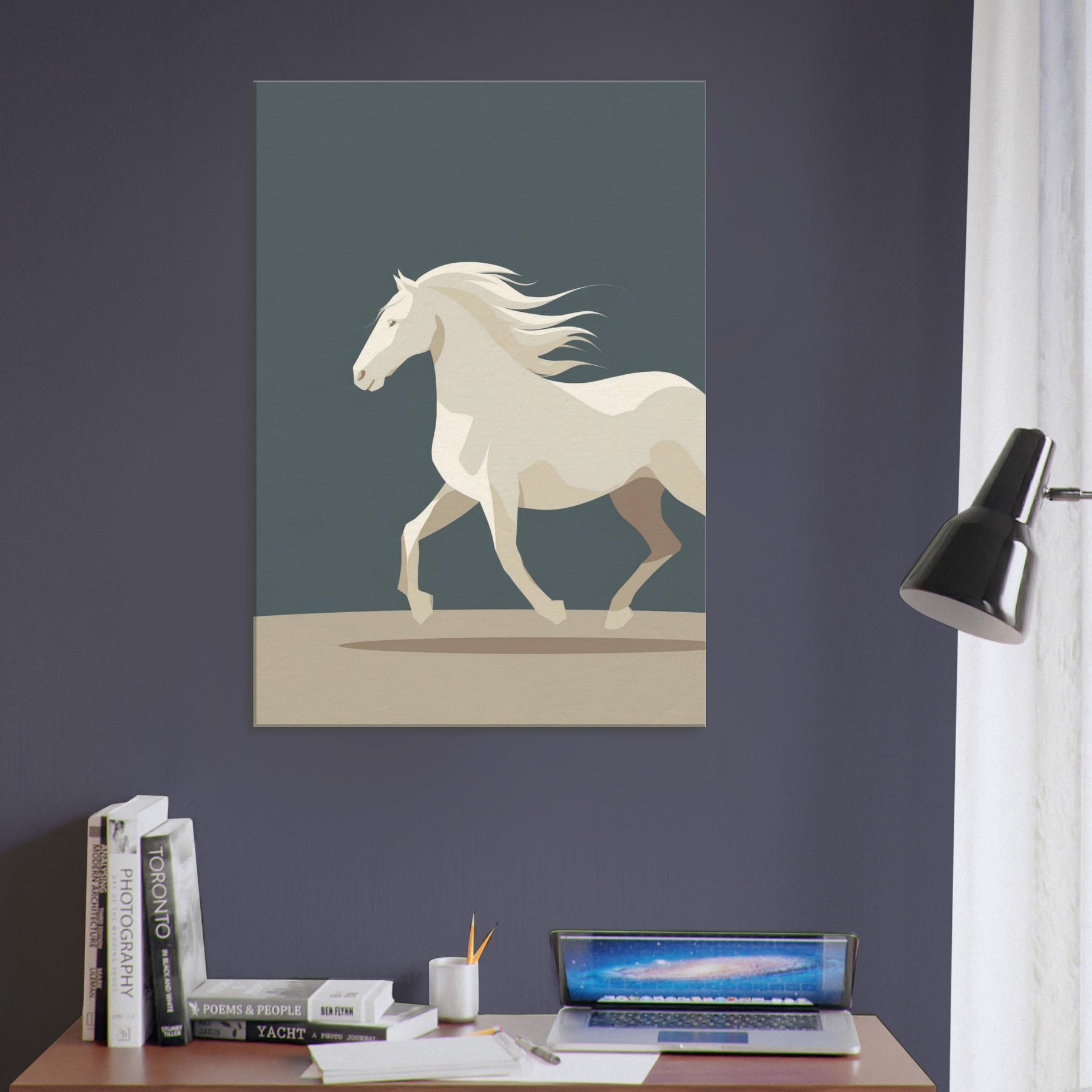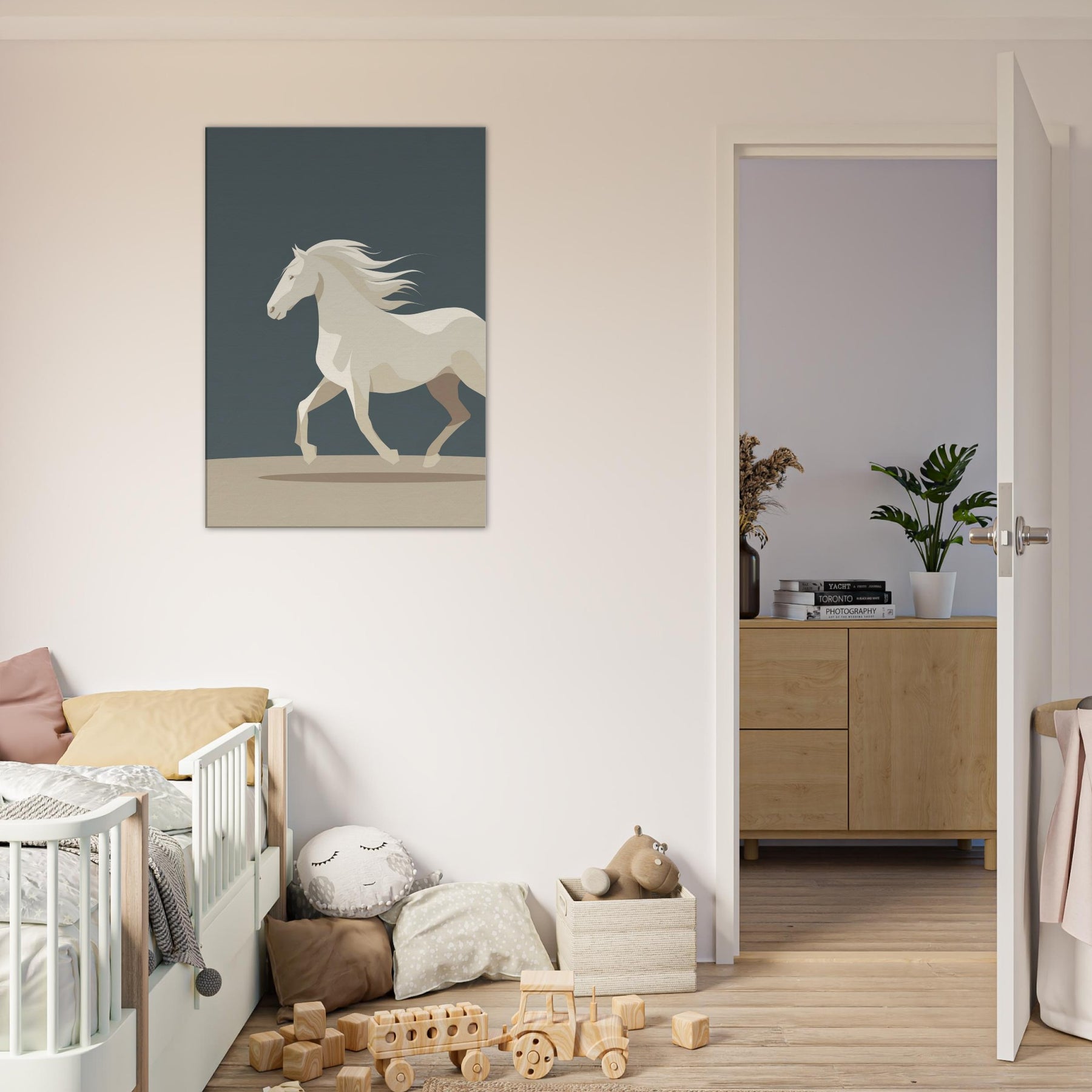 An elegant study of a horse in motion, reduced to soft planes and clean silhouettes. Against a muted backdrop, the form breathes with quiet energy, a gentle arc of mane catching the breeze. This minimalist composition invites calm into a room, its tonal harmony and sculptural lines echoing in the glow of morning light. Place it above a sofa or in a corridor to conjure motion, grace, and a sense of open space in your living area.
