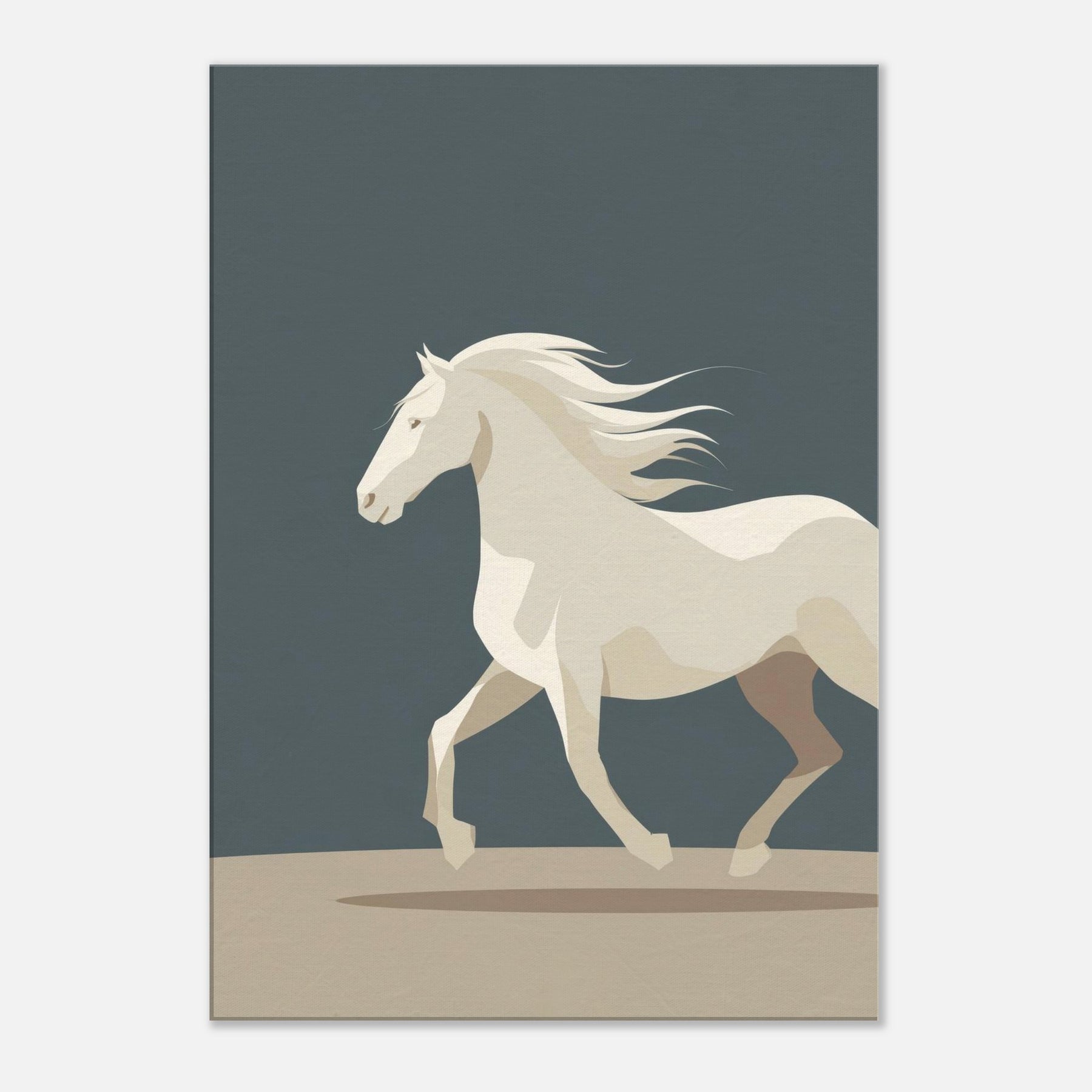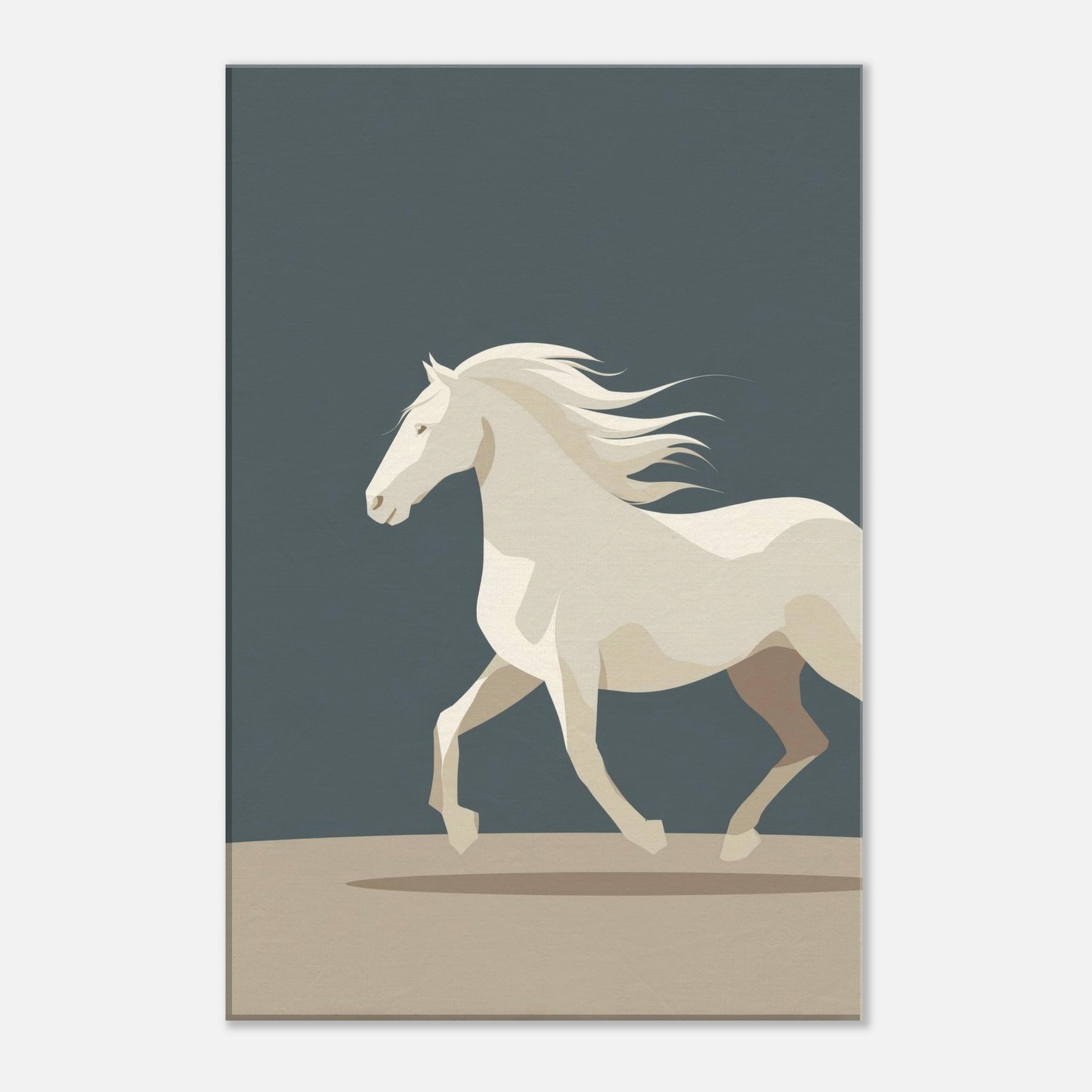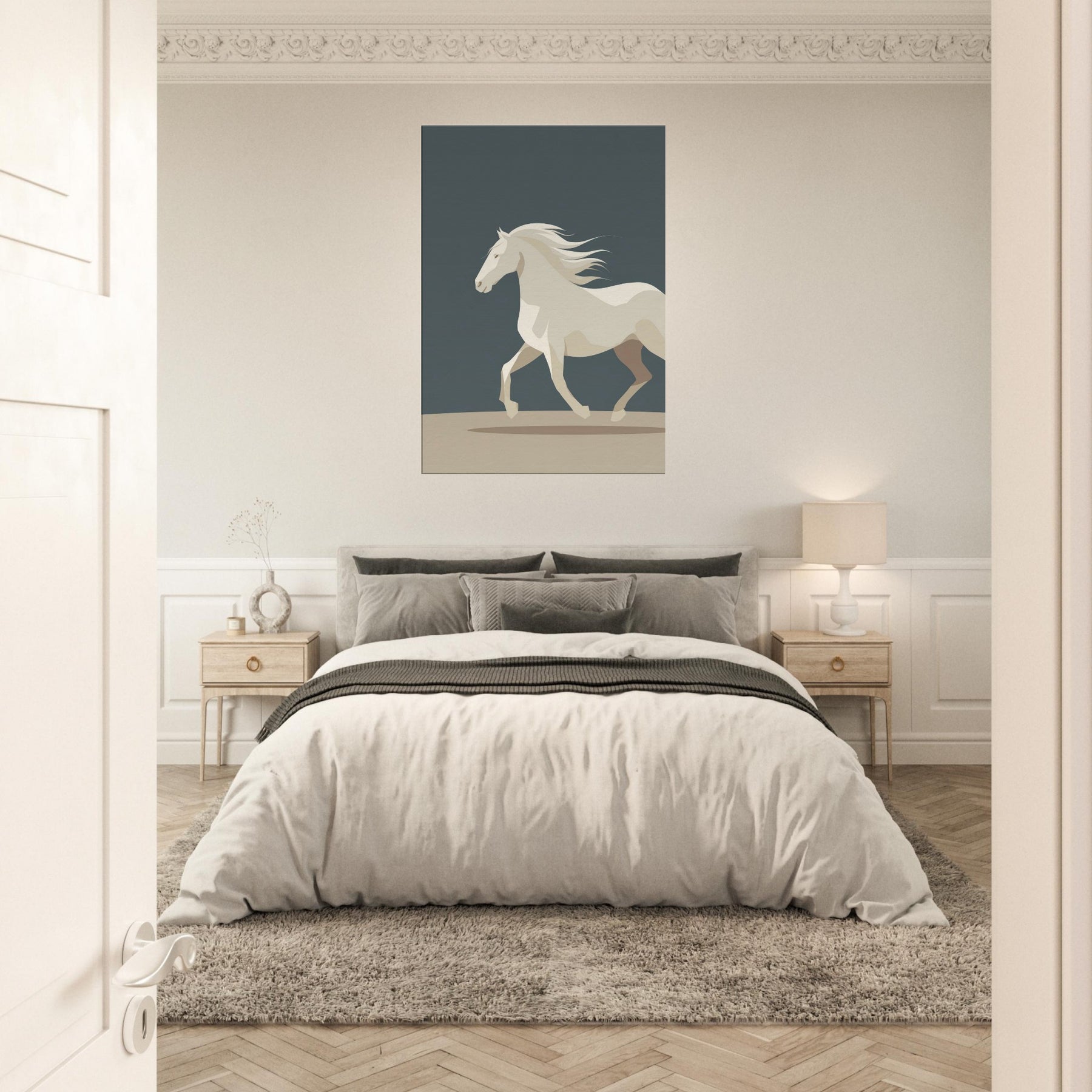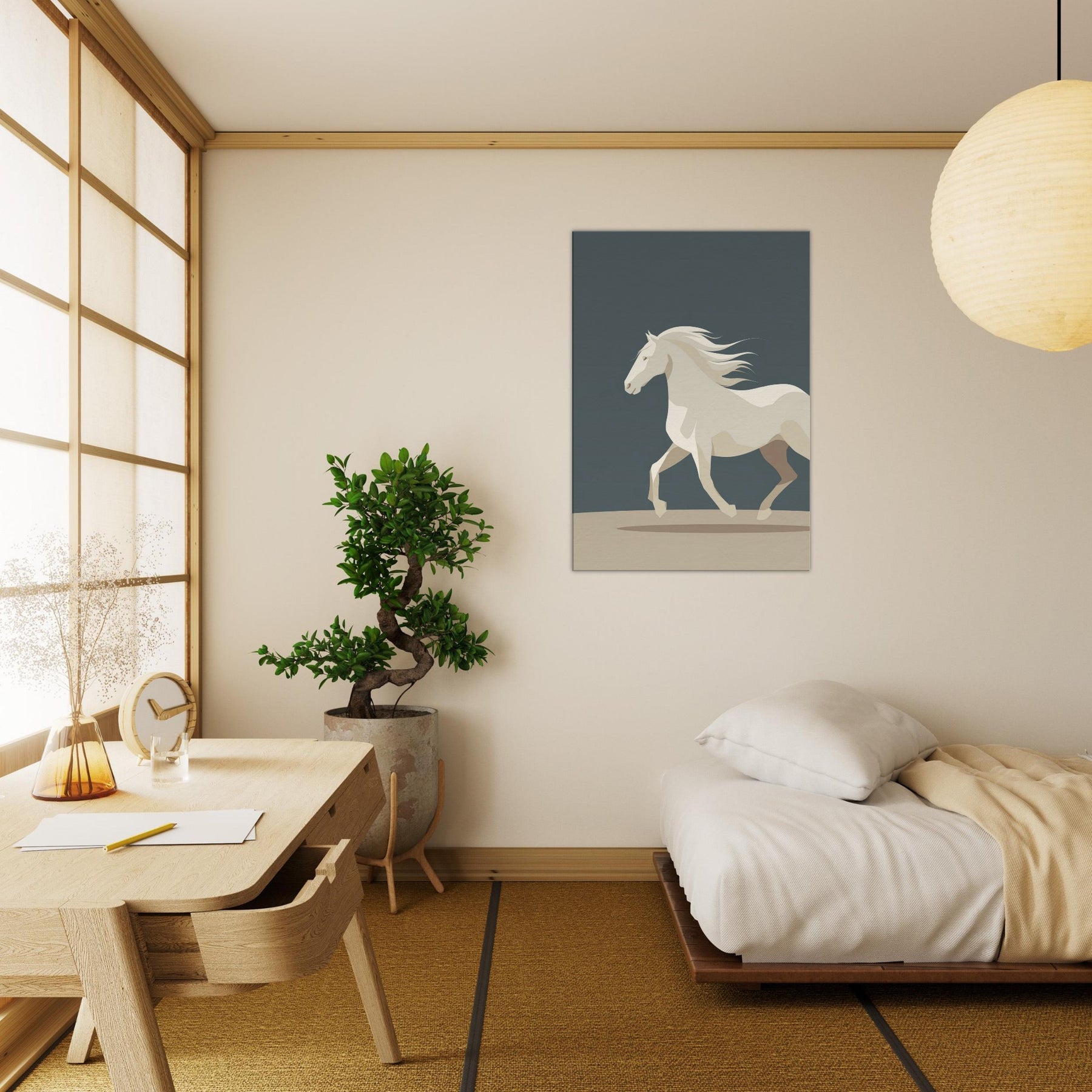 An elegant study of a horse in motion, reduced to soft planes and clean silhouettes. Against a muted backdrop, the form breathes with quiet energy, a gentle arc of mane catching the breeze. This minimalist composition invites calm into a room, its tonal harmony and sculptural lines echoing in the glow of morning light. Place it above a sofa or in a corridor to conjure motion, grace, and a sense of open space in your living area.