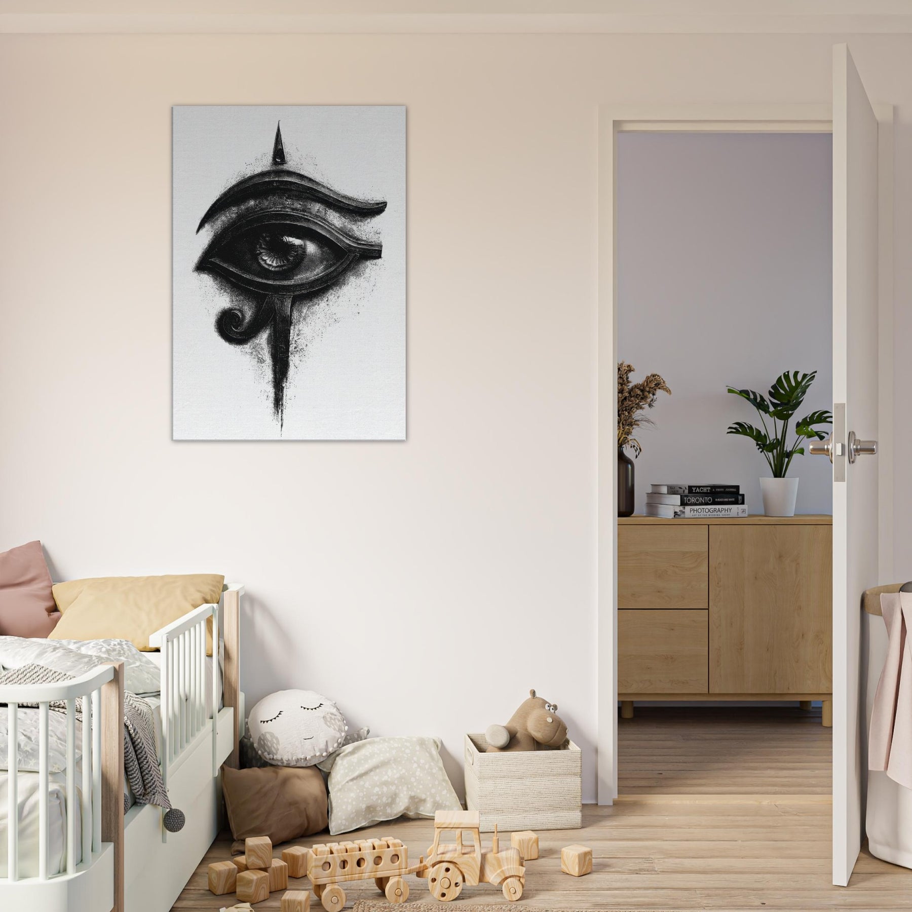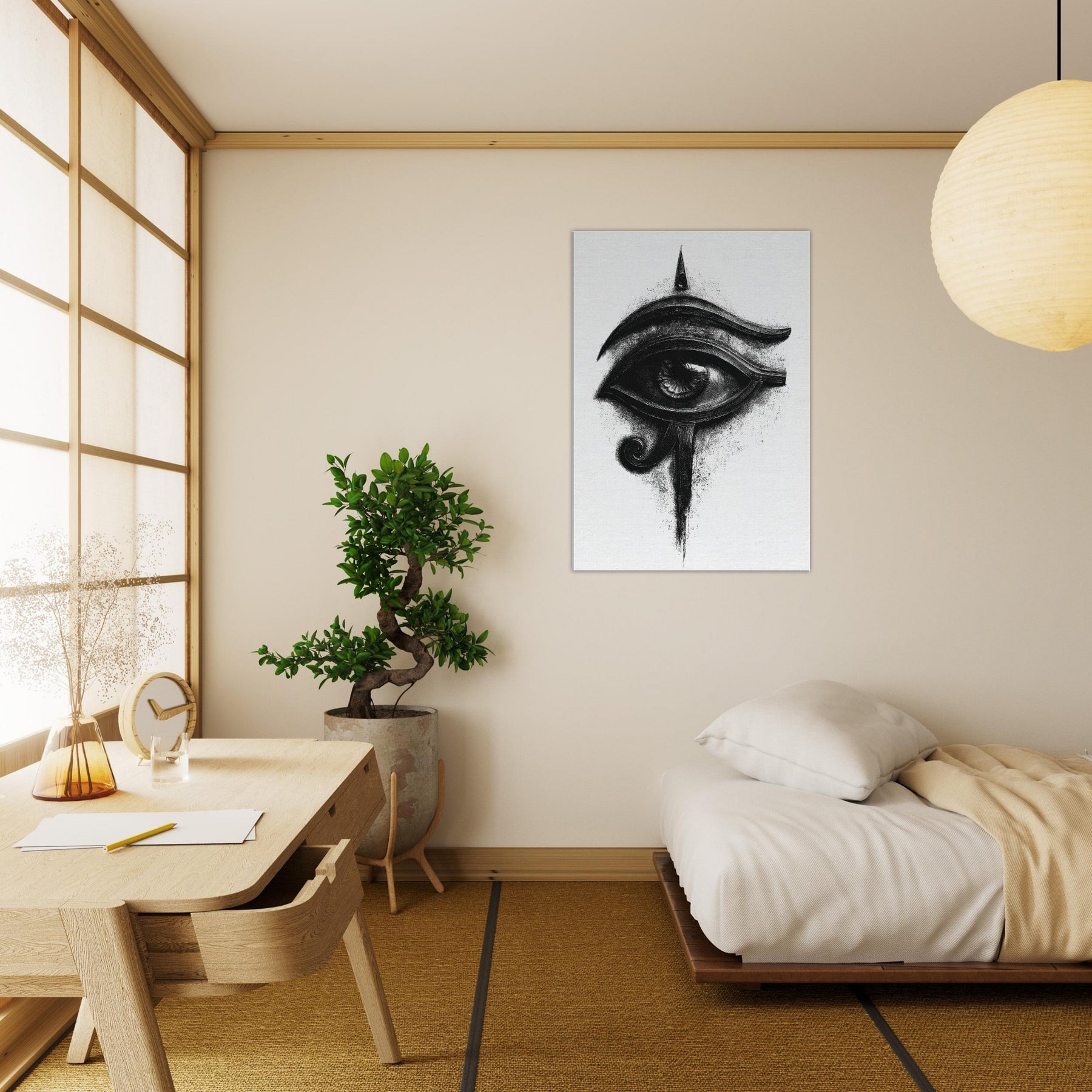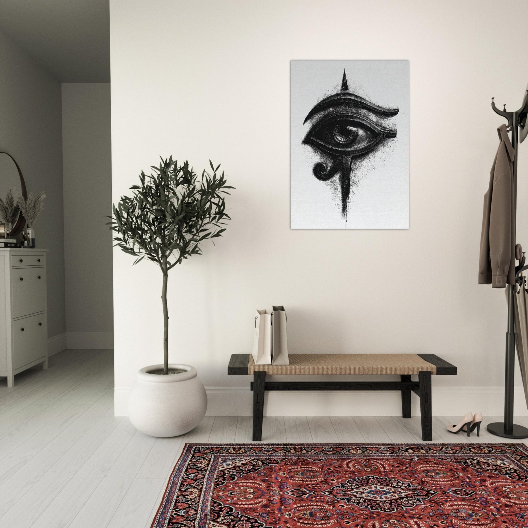 Let the Eye of Horus watch over your living space, a black and white talisman rendered with kinetic grain and restrained grace.