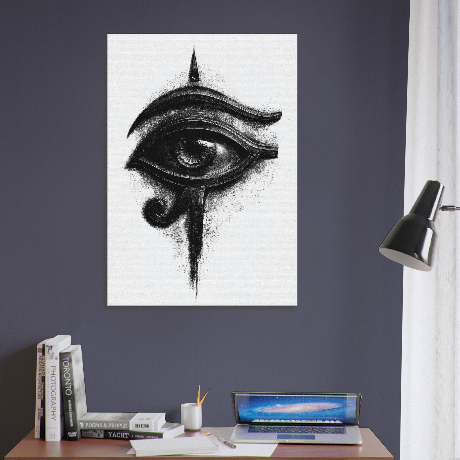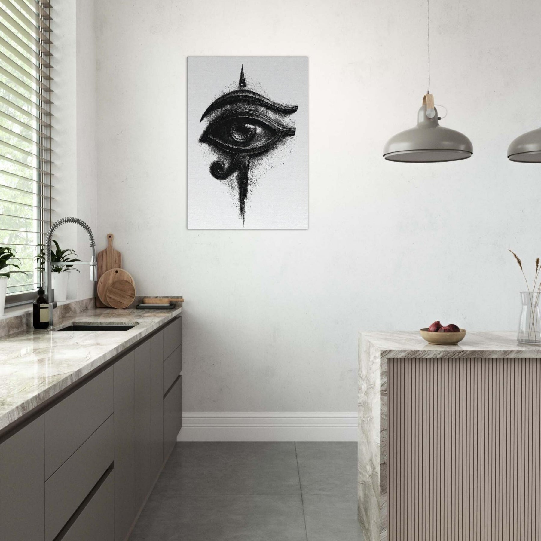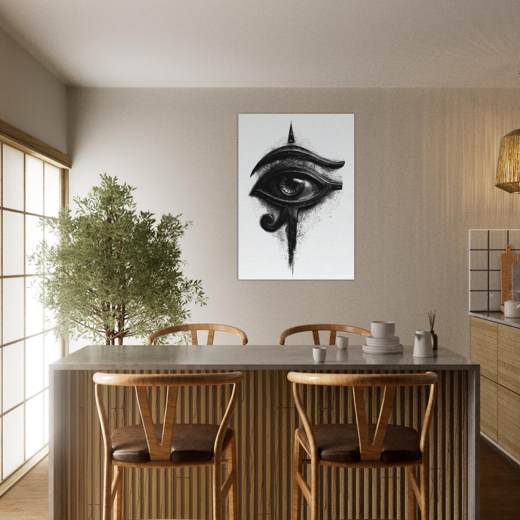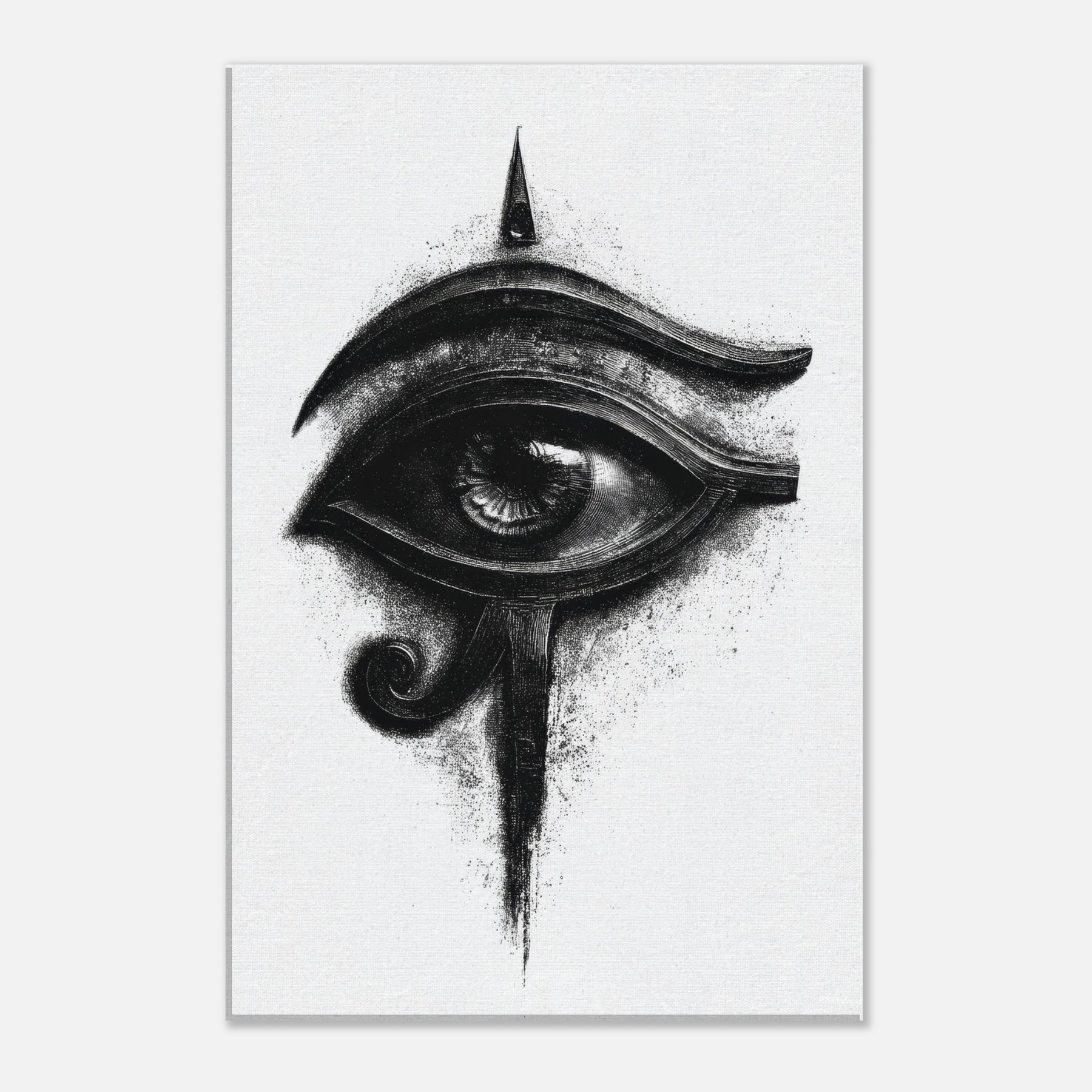 Let the Eye of Horus watch over your living space, a black and white talisman rendered with kinetic grain and restrained grace.