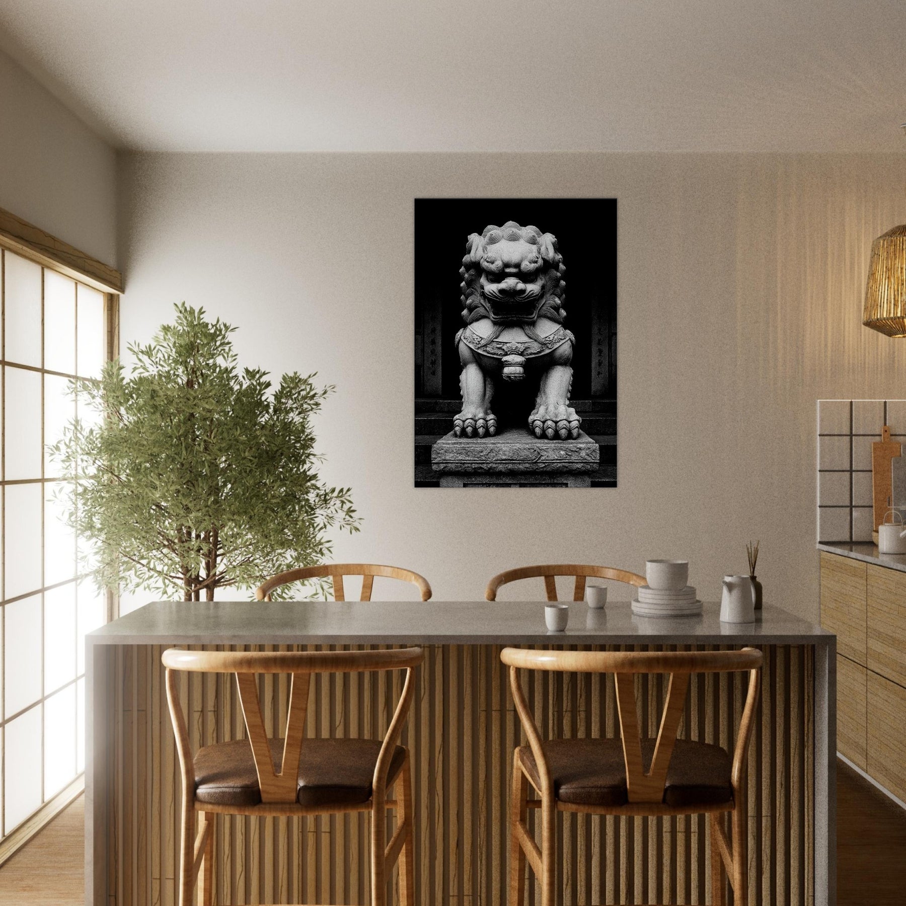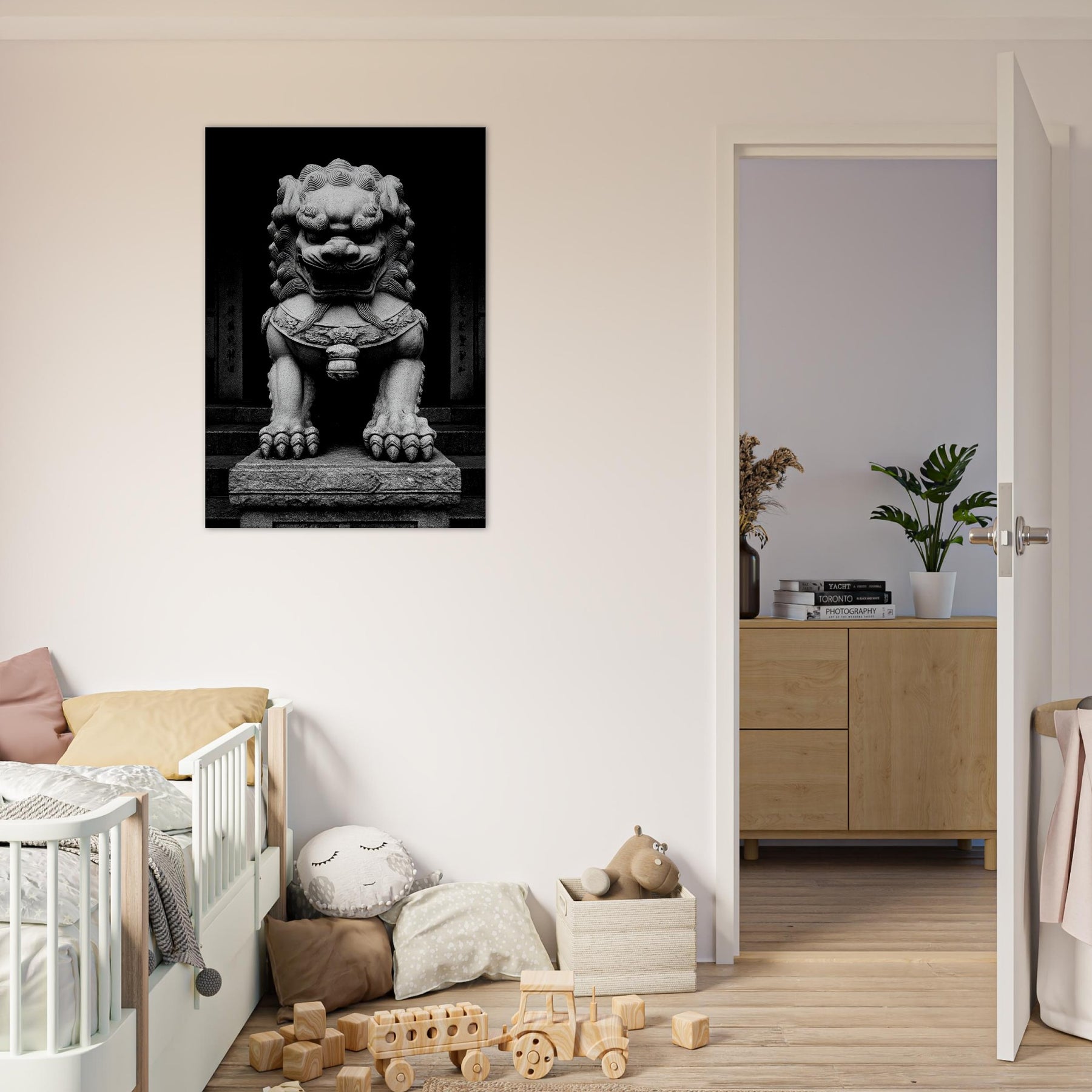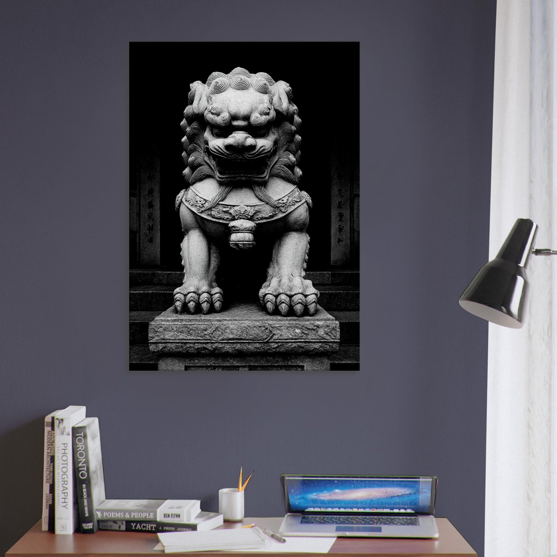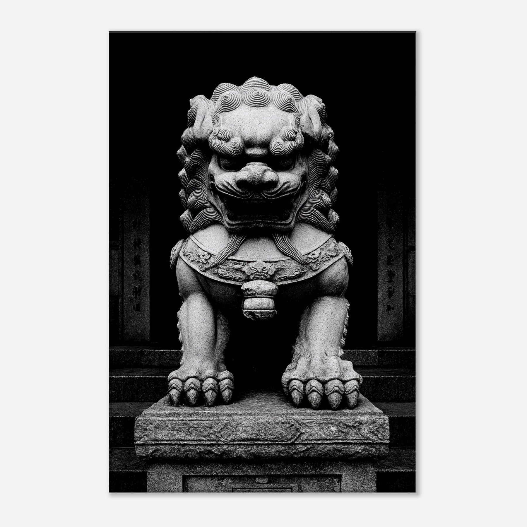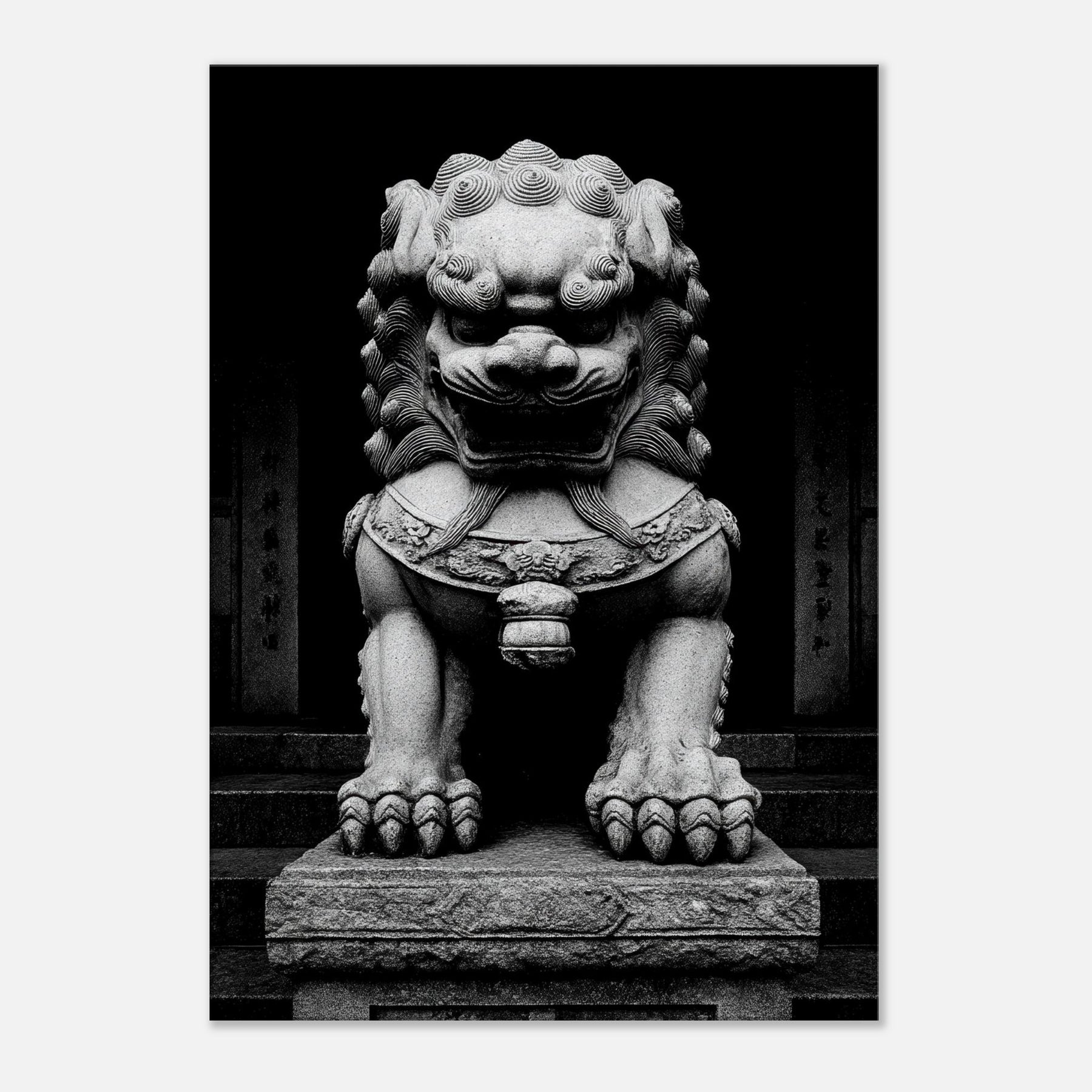 Standing before a temple gate, the Asian Guardian Lion is rendered in stark black and white, a vigilant silhouette of stone and myth. Every carved curl and weighty paw radiates centuries of protection, inviting quiet contemplation in a living room or study.