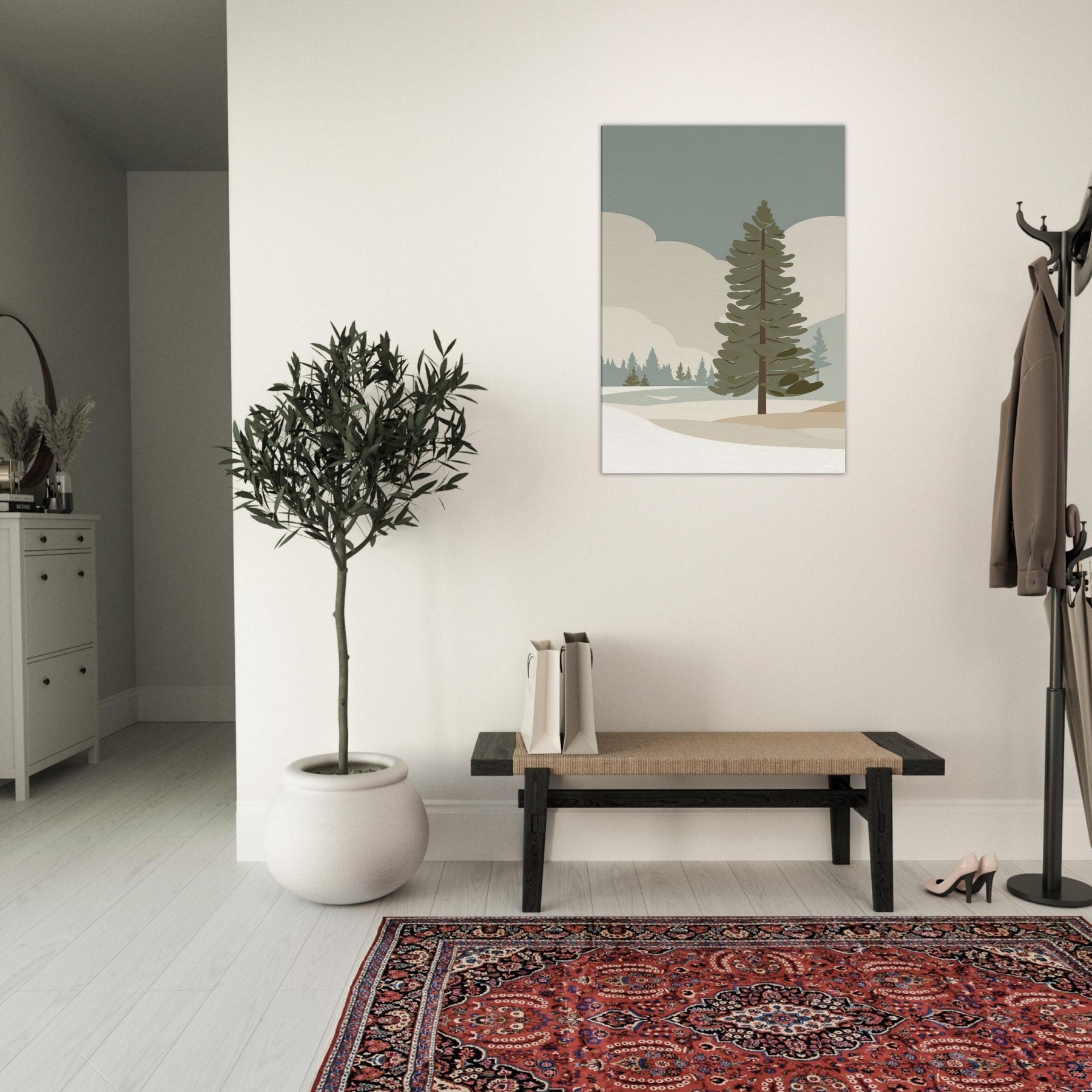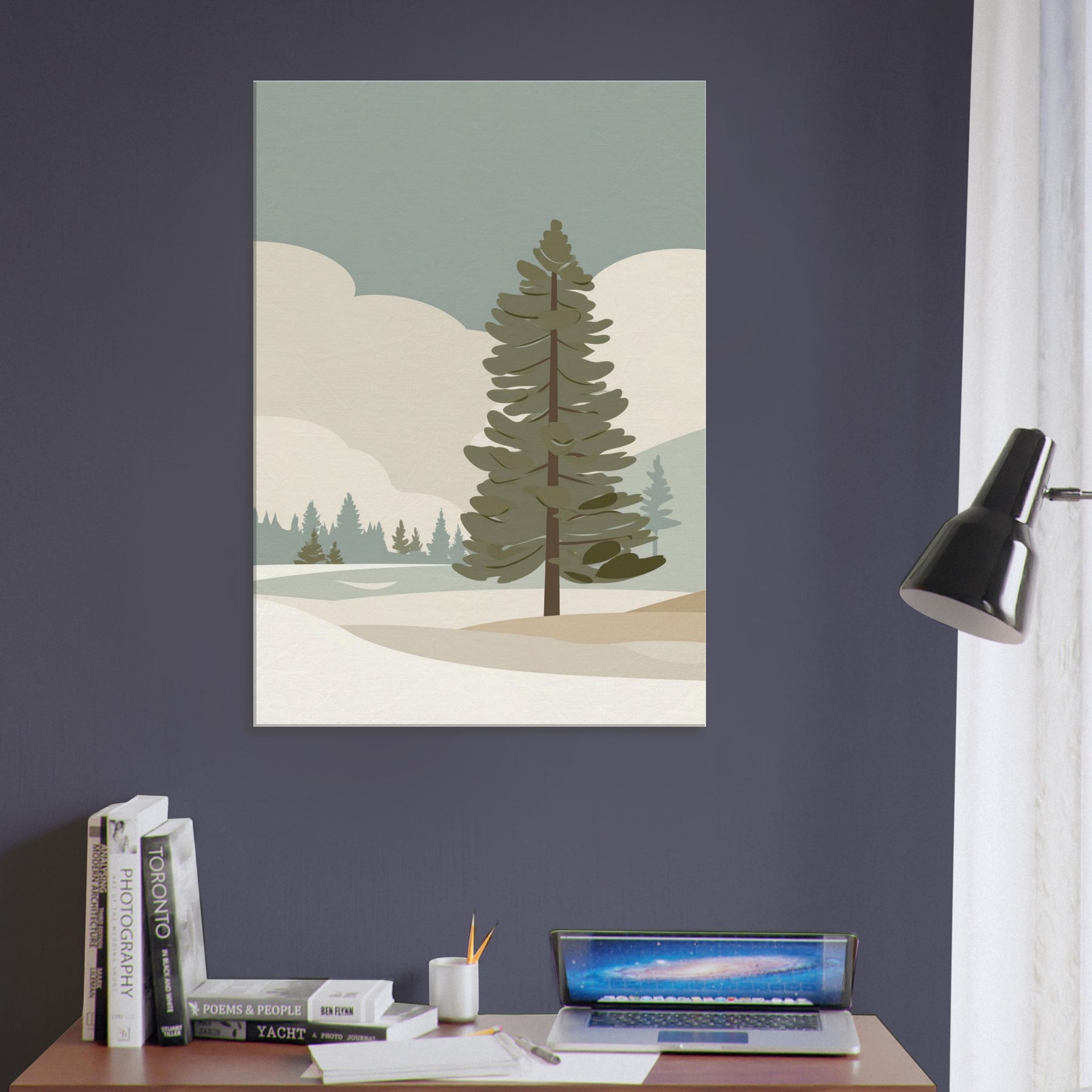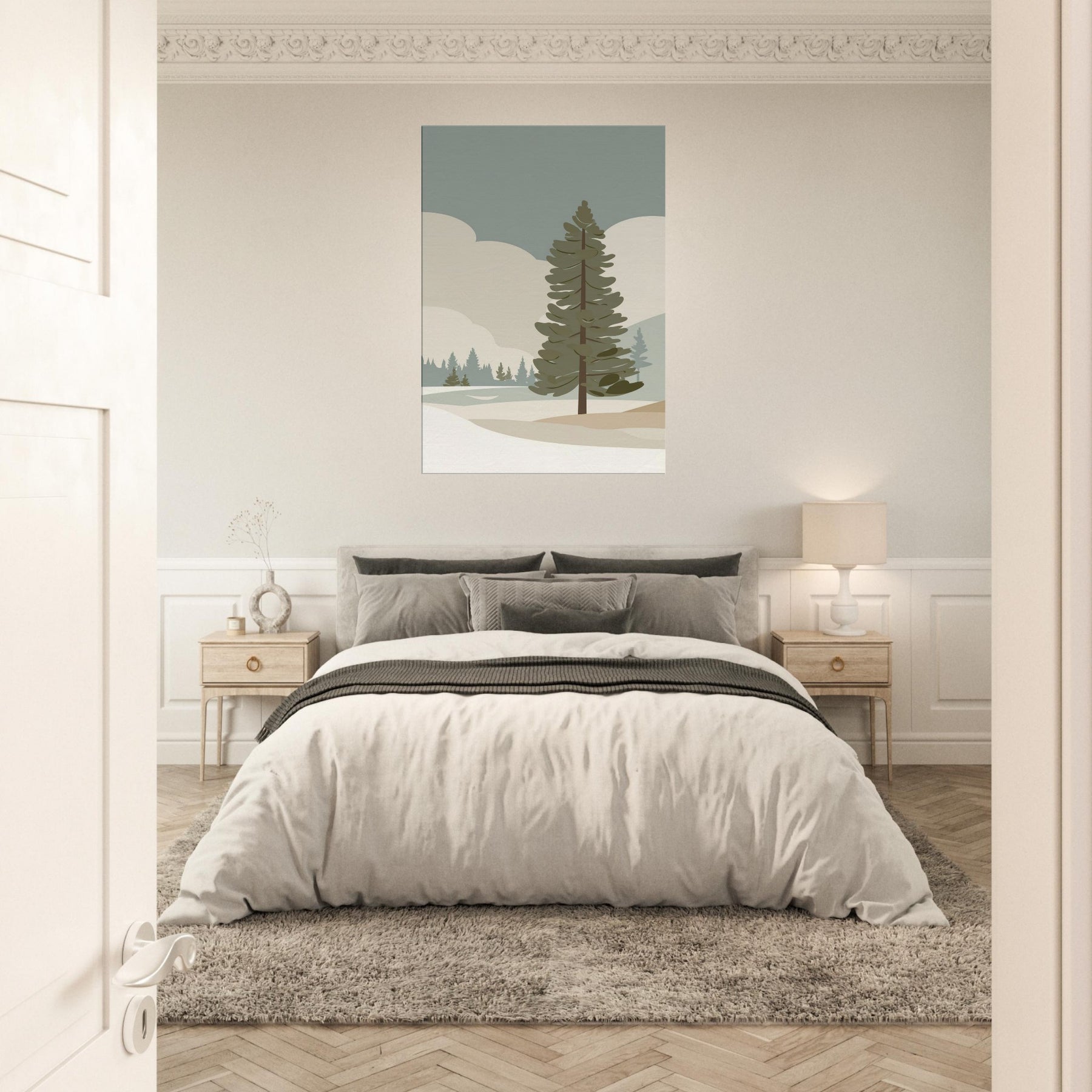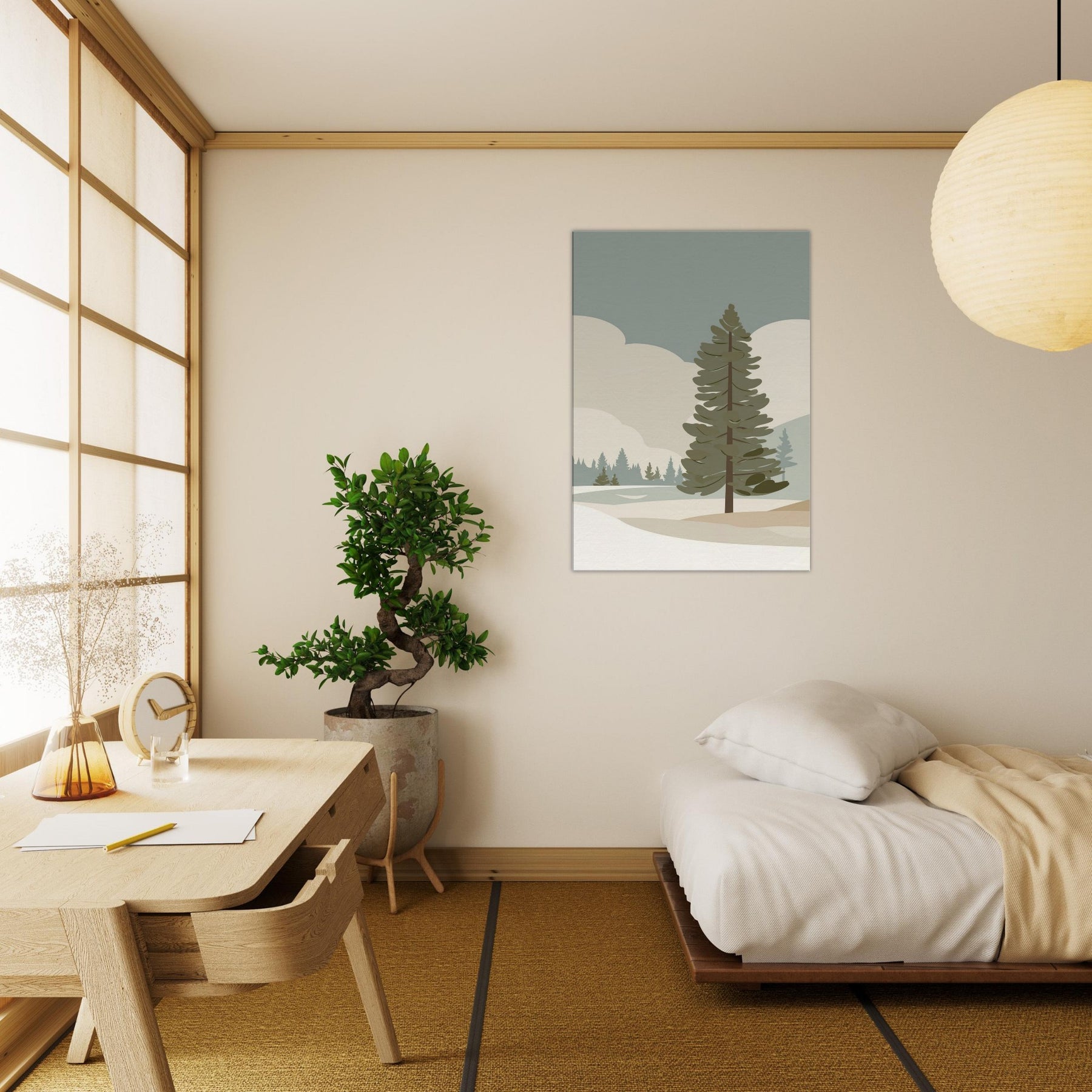 Snowy Forest invites stillness into your space, where a lone pine stands against a pale winter sky and soft hills recede into the distance. This minimalist scene uses quiet, tonal shapes and a muted palette to evoke hush, breath, and the subtle crackle of fresh snow. Hang it in a living room or bedroom to slow the day's pace, to frame conversation with a calm focal point, and to feel the outdoors' quiet presence every day.