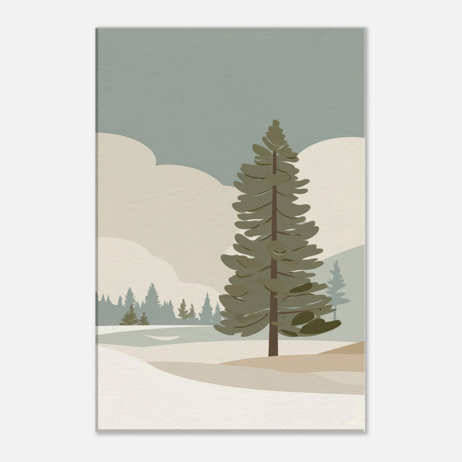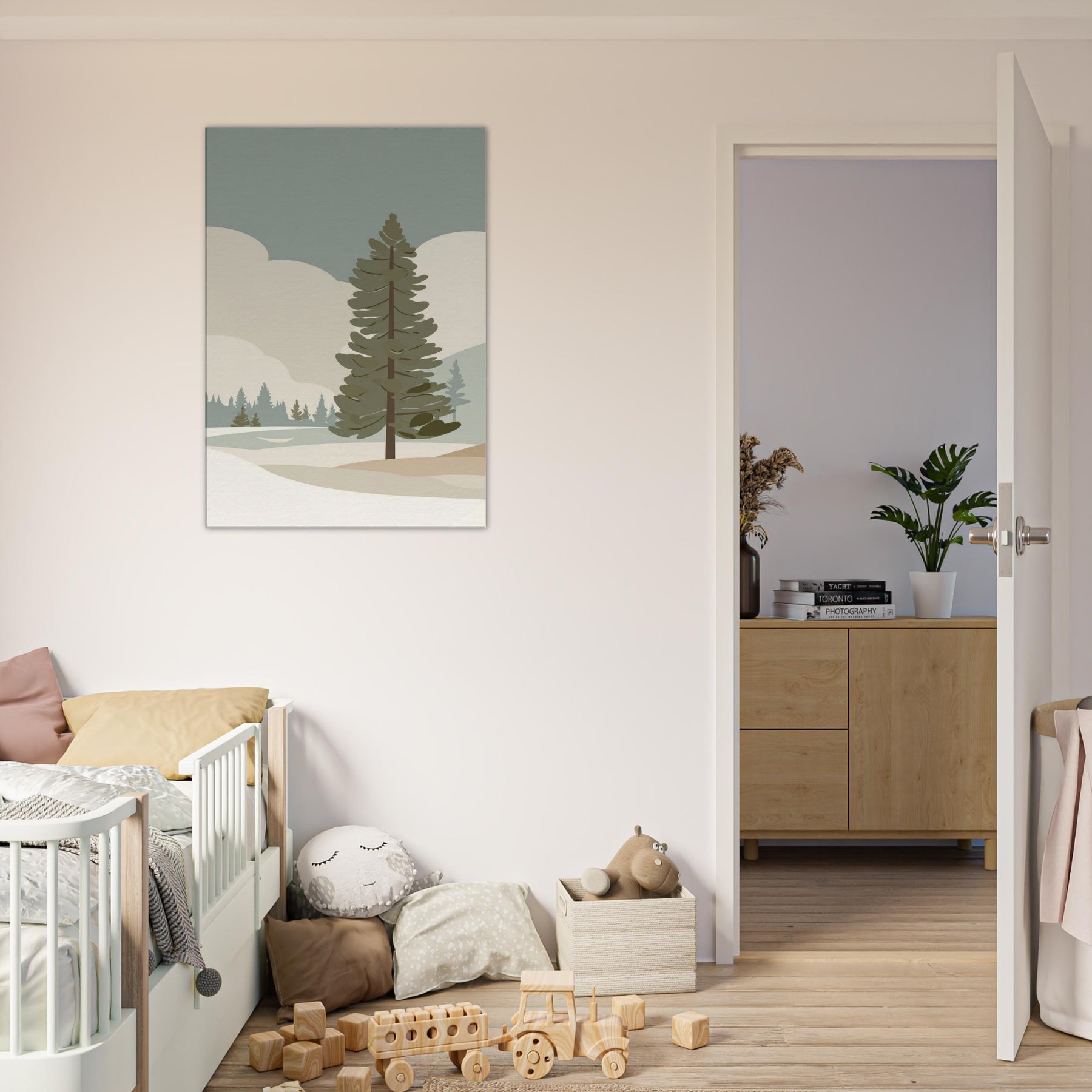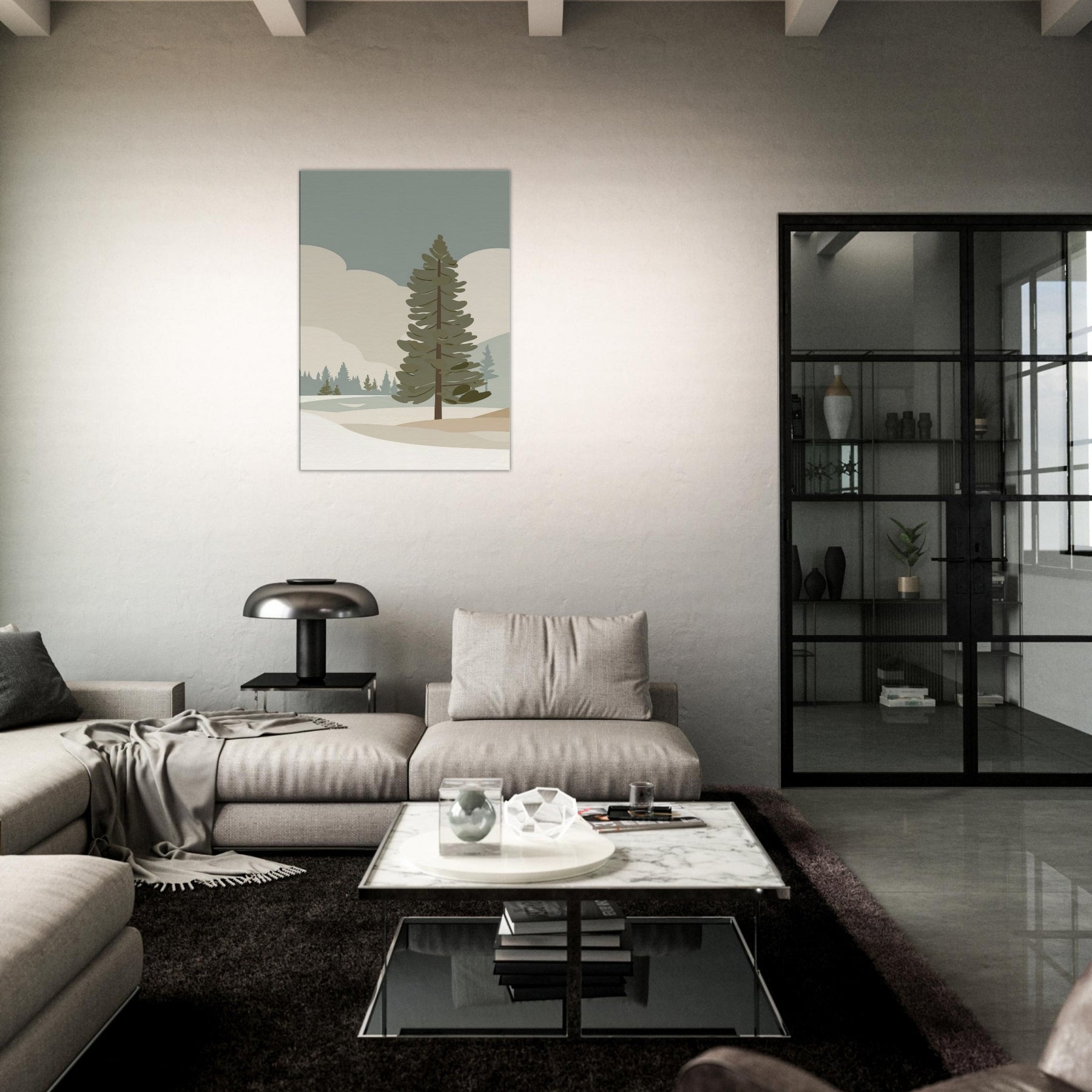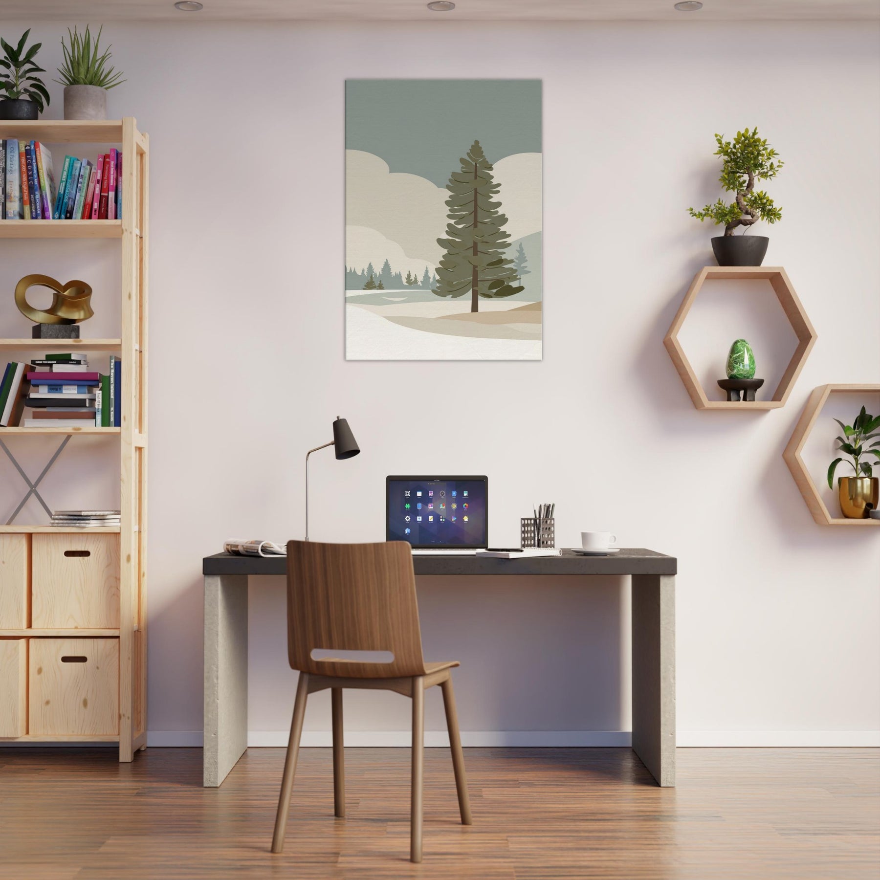 Snowy Forest invites stillness into your space, where a lone pine stands against a pale winter sky and soft hills recede into the distance. This minimalist scene uses quiet, tonal shapes and a muted palette to evoke hush, breath, and the subtle crackle of fresh snow. Hang it in a living room or bedroom to slow the day's pace, to frame conversation with a calm focal point, and to feel the outdoors' quiet presence every day.