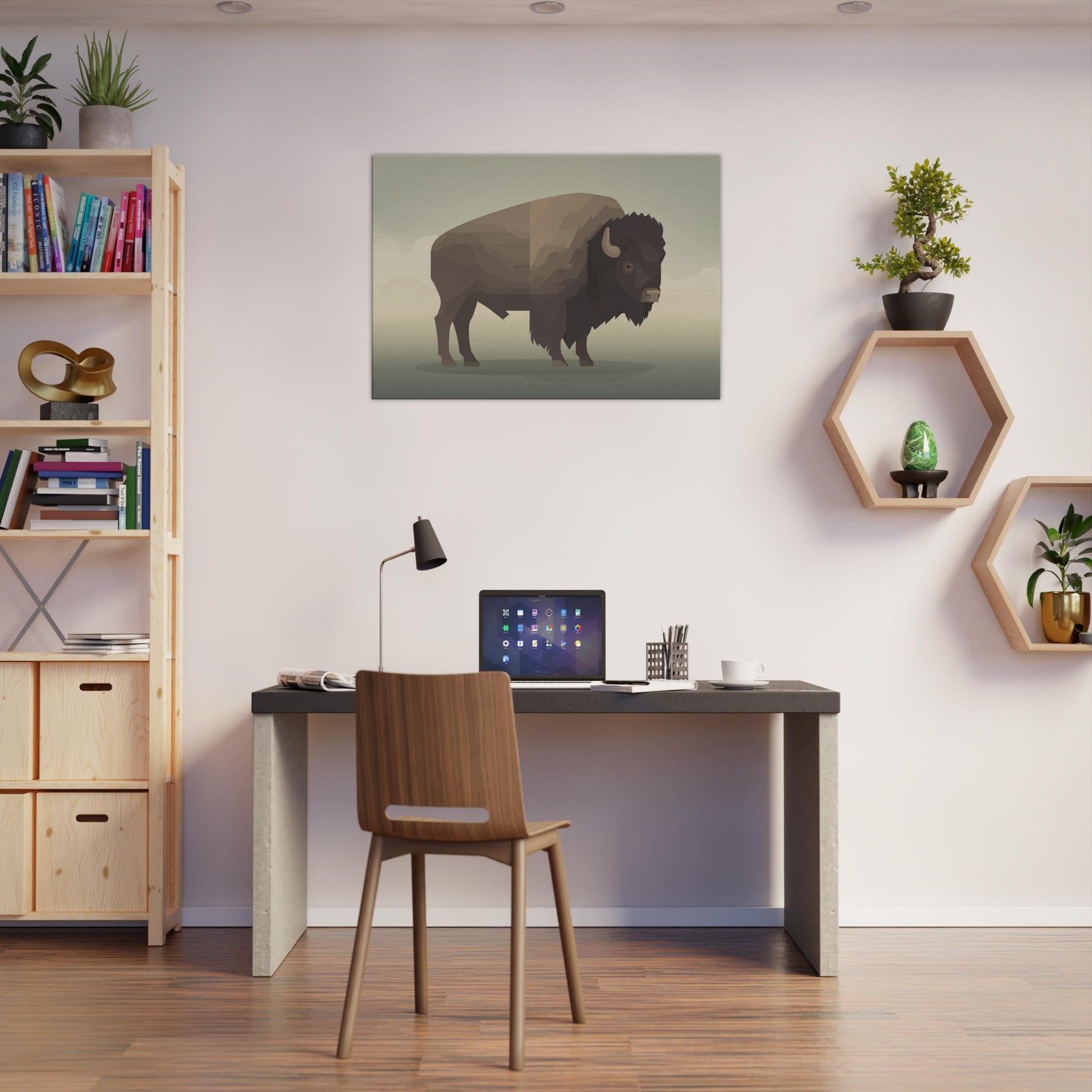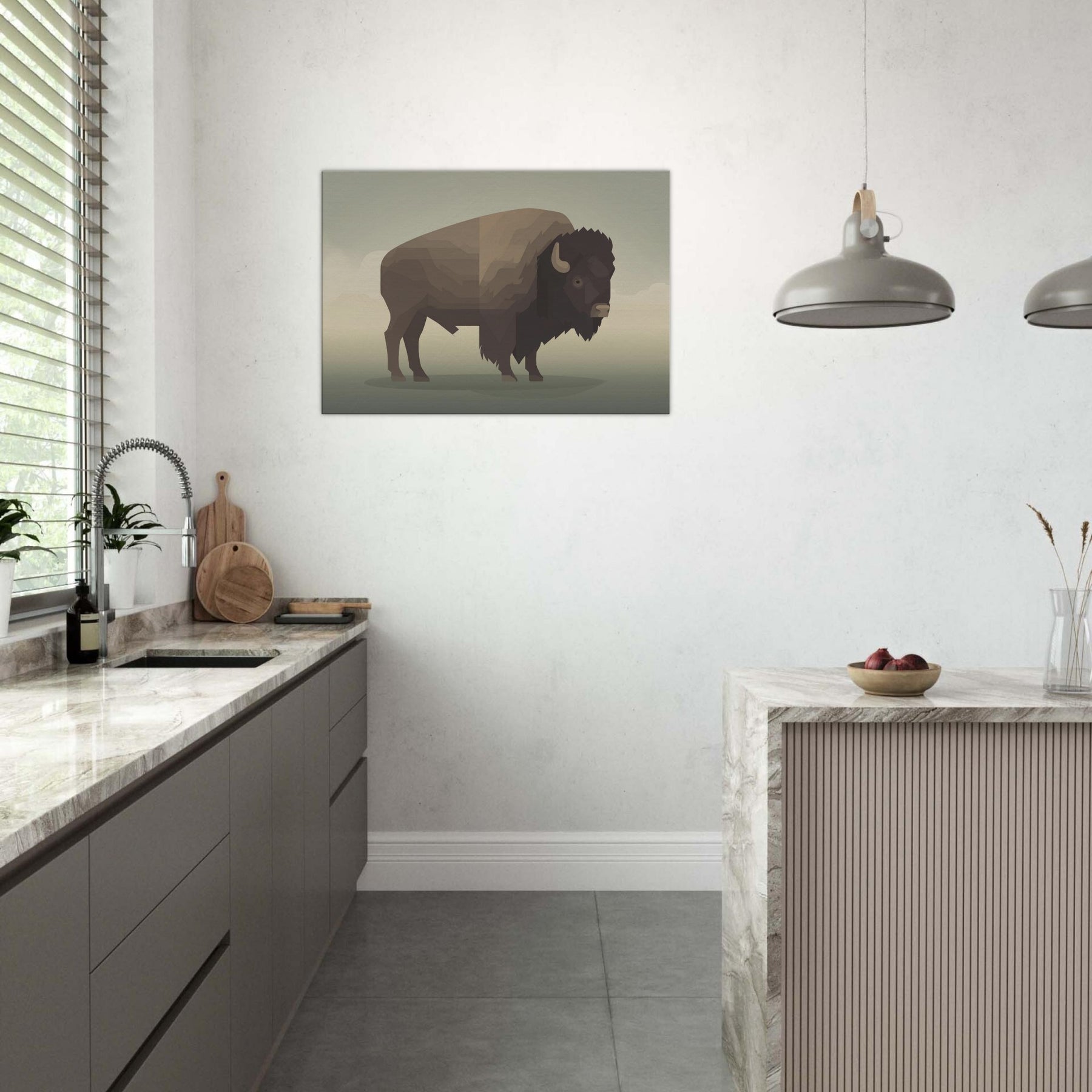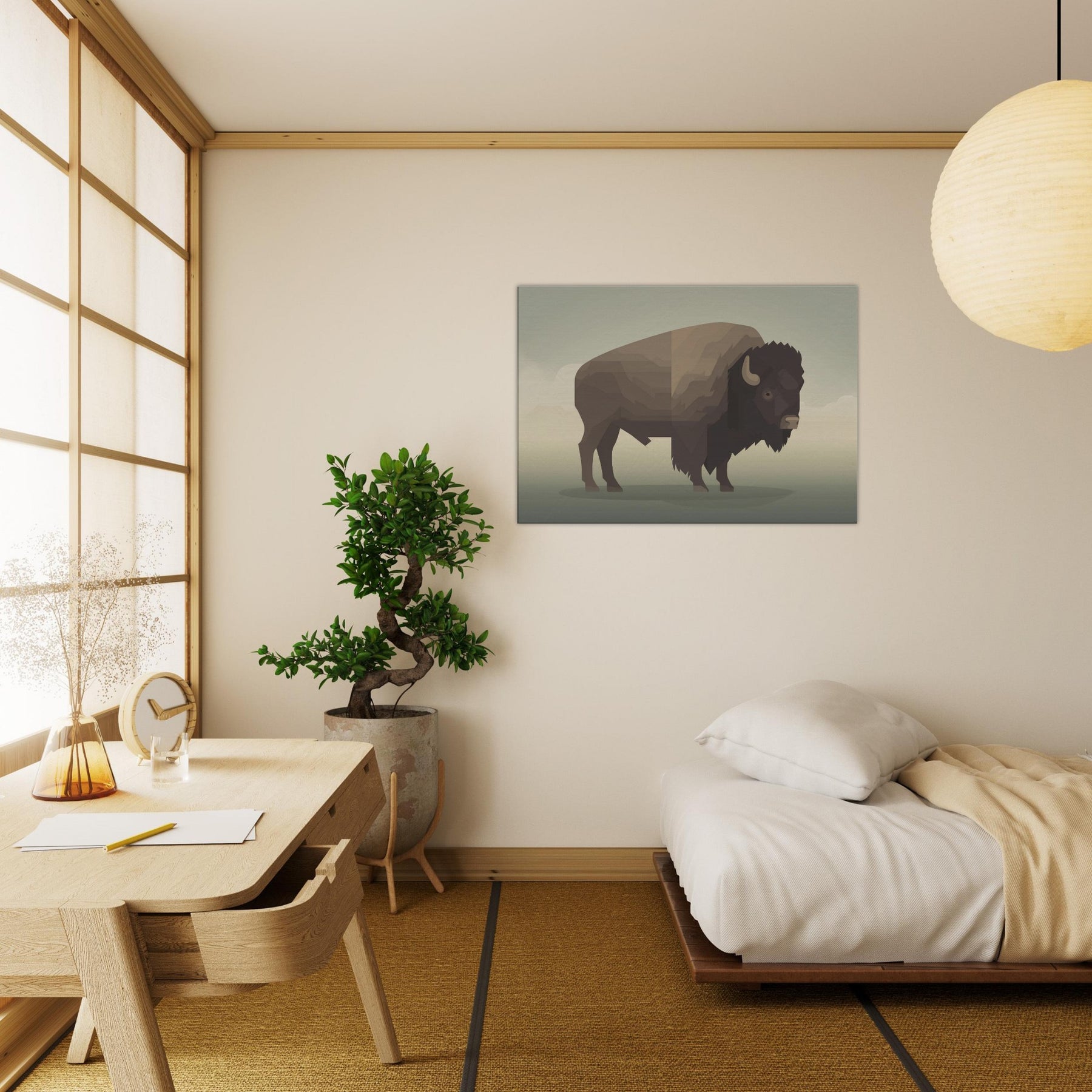 An atmosphere of quiet strength unfolds in this minimalist Bison wall art. The carefully layered geometric planes evoke a horizon at dusk, inviting stillness into any room. Its warm, earthy browns and soft shadows glow against neutral walls, turning a corner into a sanctuary. Perfect for living rooms, bedrooms, or hallways, this piece pairs with natural textures and subdued lighting to create a subtle, cinematic mood that enhances everyday moments.