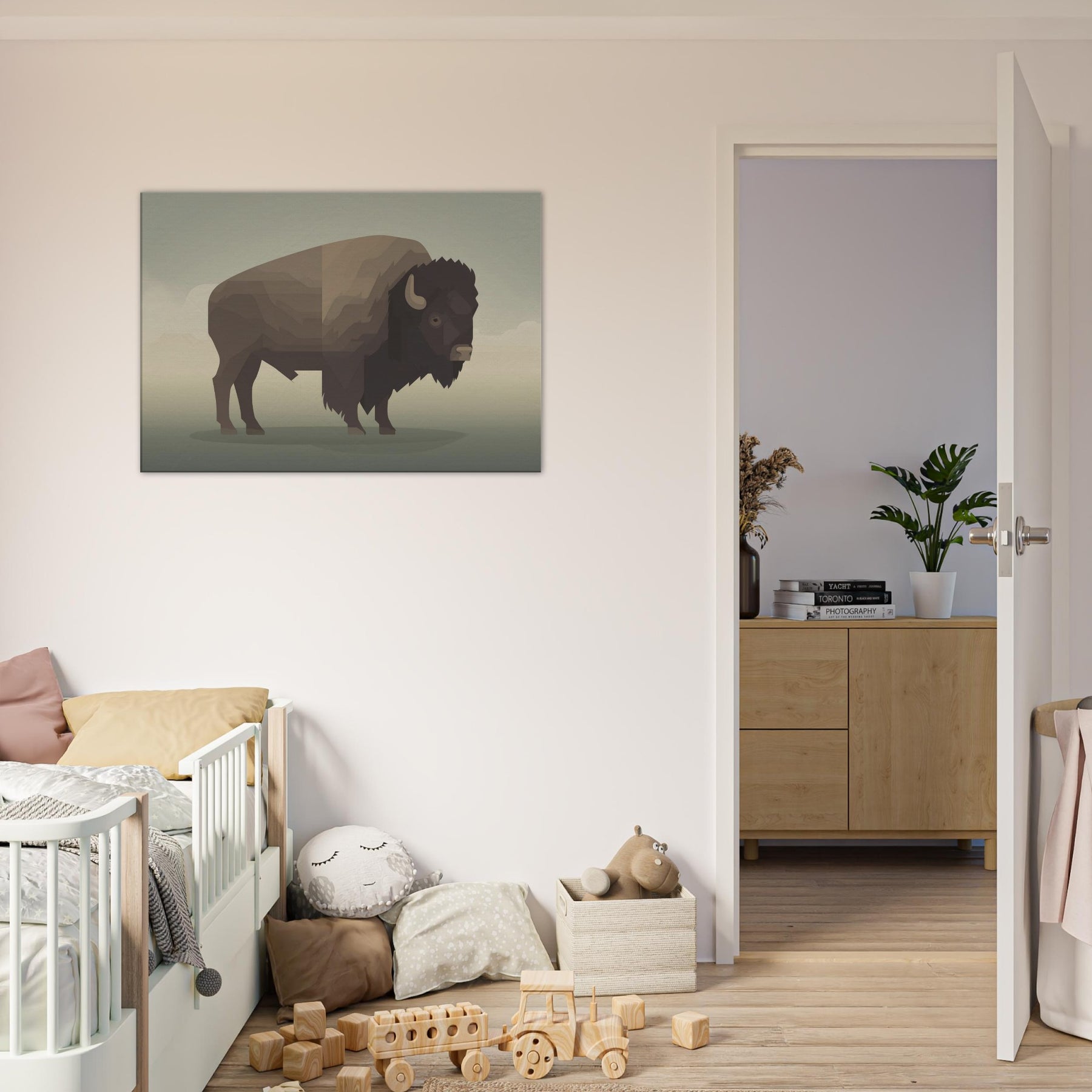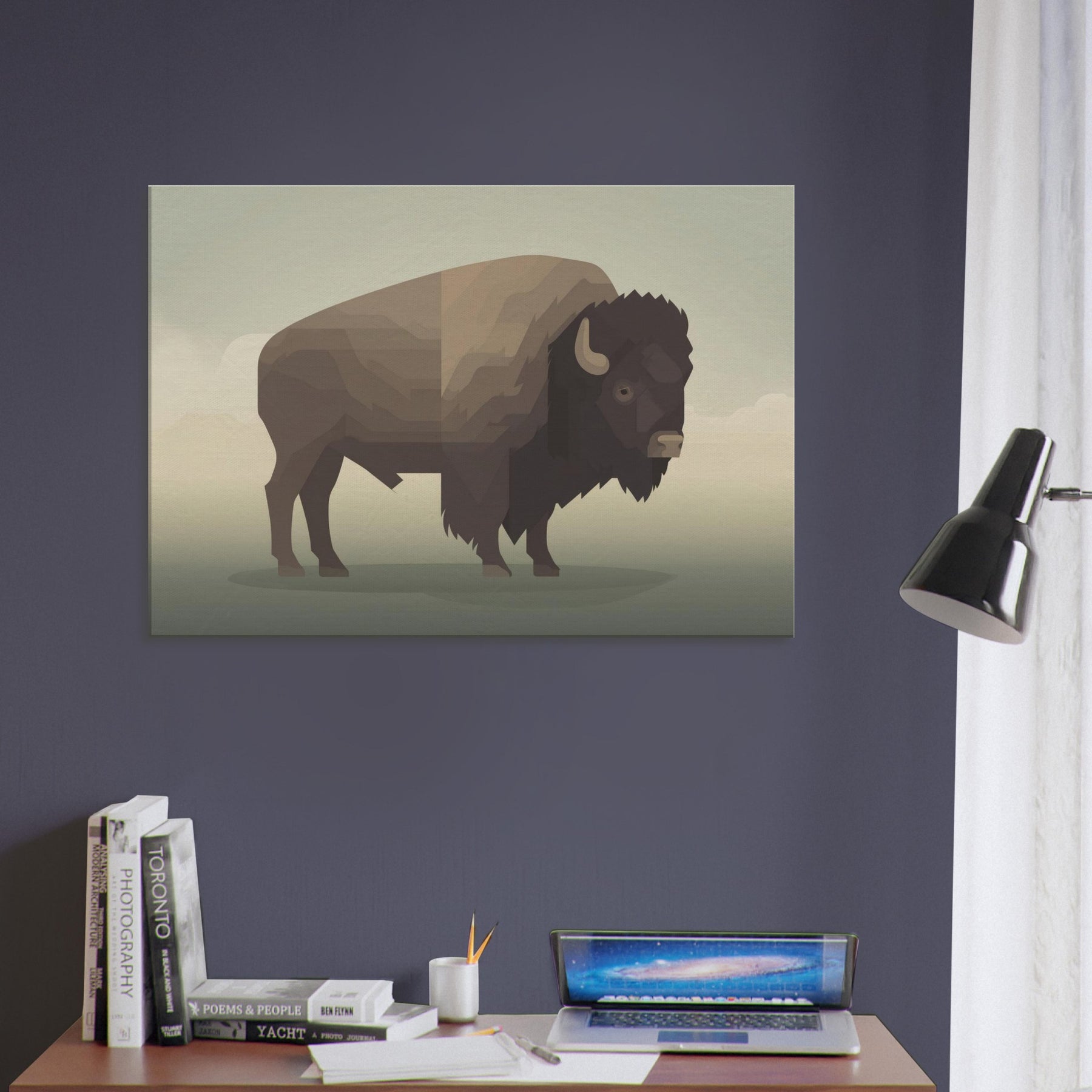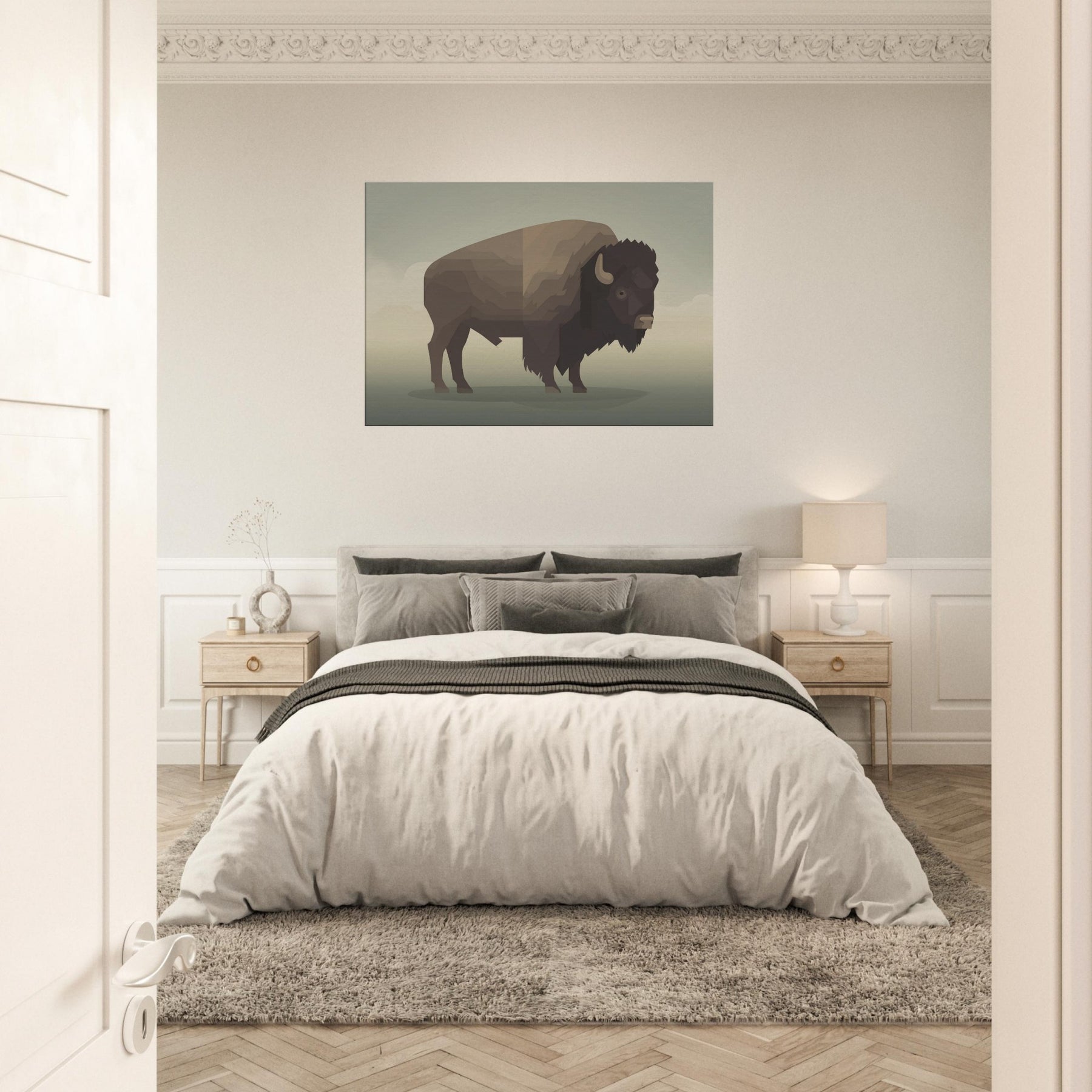 An atmosphere of quiet strength unfolds in this minimalist Bison wall art. The carefully layered geometric planes evoke a horizon at dusk, inviting stillness into any room. Its warm, earthy browns and soft shadows glow against neutral walls, turning a corner into a sanctuary. Perfect for living rooms, bedrooms, or hallways, this piece pairs with natural textures and subdued lighting to create a subtle, cinematic mood that enhances everyday moments.